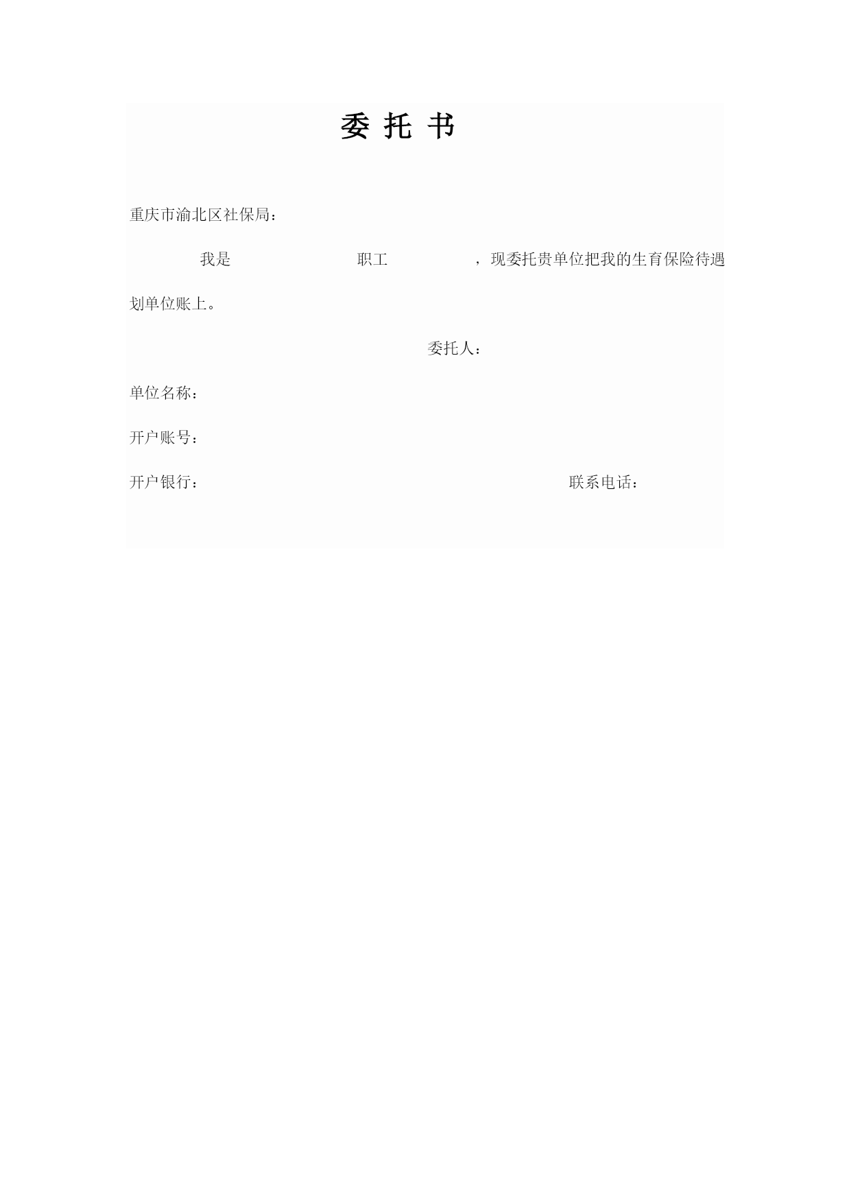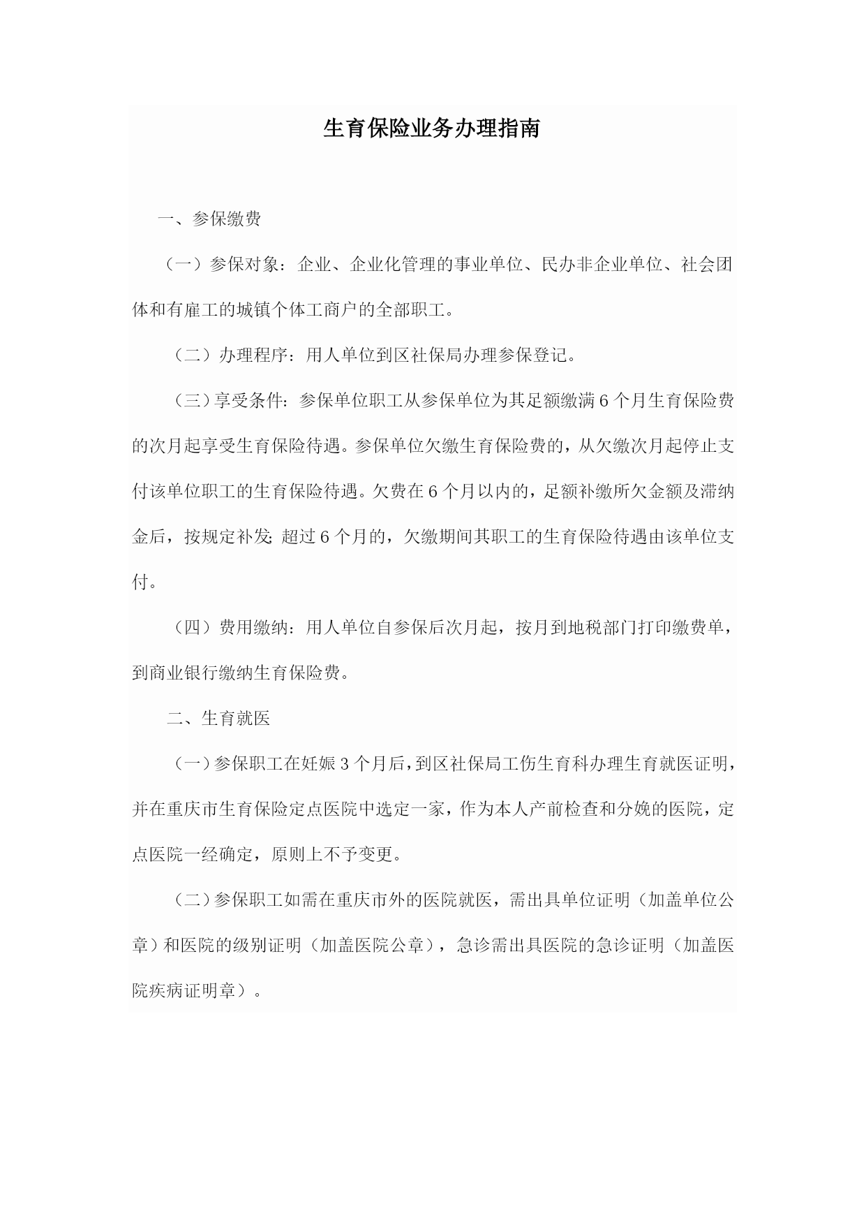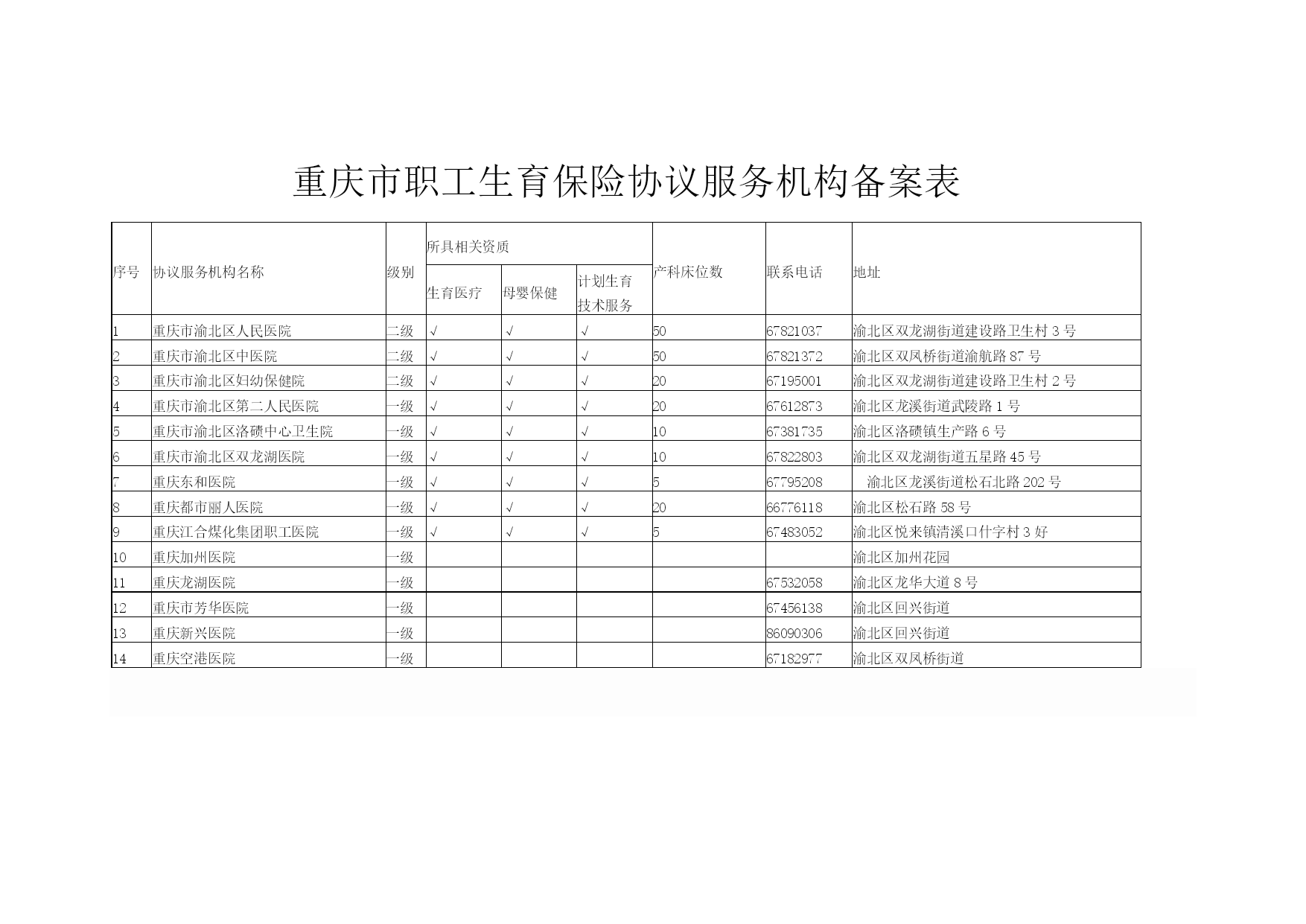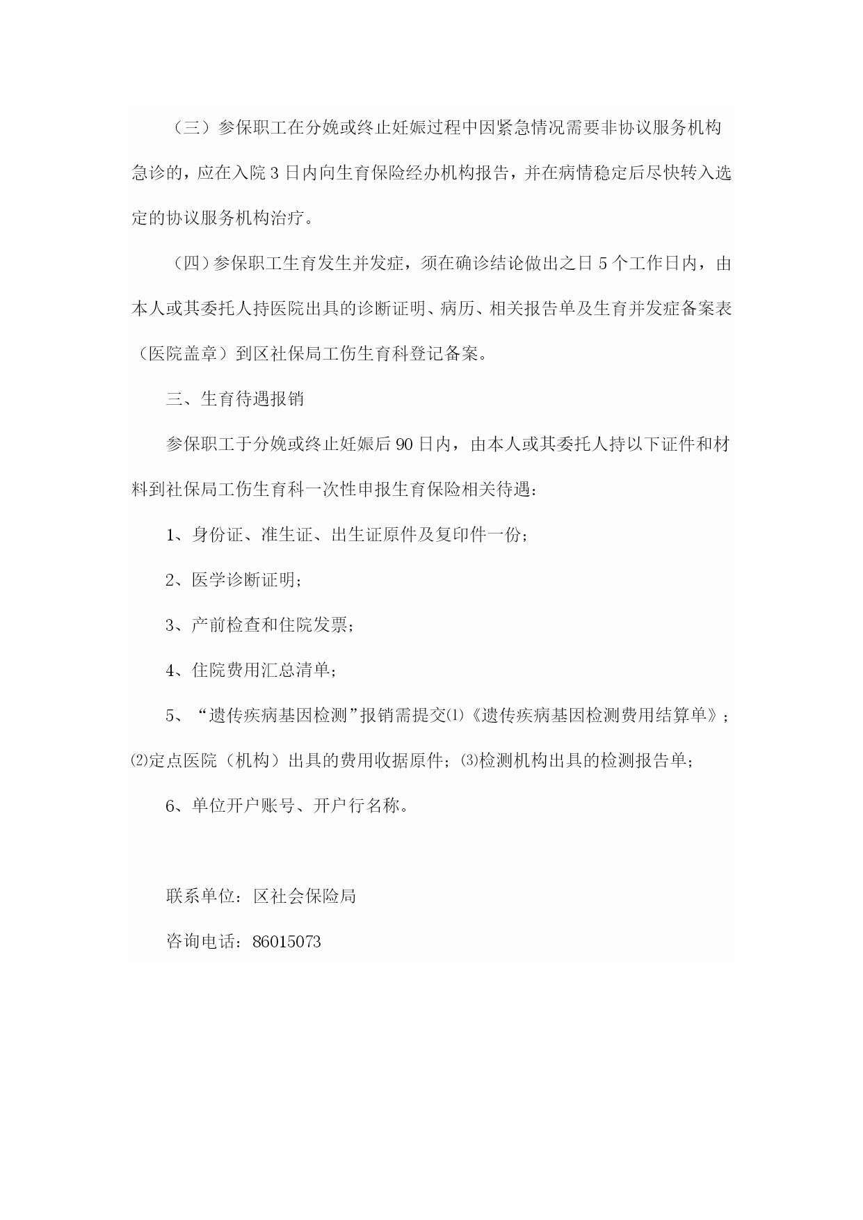 渝北区职工生育保险报账须知生育职工必须在重庆市生育定点医疗机构内选定一家医院进行产前检查和生育,一经确定,原则上不予变更,治疗结束后90日内持以下材料到渝北区工伤生育管理中心办理待遇申领手续:1、身份证、准生证、出生证这三证的(原件)及复印件一份。2、医学诊断证明。3、产前检查和住院发票。4、出院时用住院发票打一个总的费用清单。5、“遗传疾病基因检测”报销需提交⑴《遗传疾病基因检测费用结算单》;⑵定点医院(机构)出具的费用收据原件;⑶检测机构出具的检测报告单;6、提供单位开户账号、开户行名称以便把待遇划单位。7、若生育发生并发症,须在确诊之日起5个工作日之内,由职工本人或其书面委托人诊断证明及《重庆市职工生育保险并发症备案表》到本中心备案,不及时备案或不办理备案手续的并发症费用不予支付。联系电话:86015073注:用医保卡支付不予报销。委托书重庆市渝北区社保局:我是职工,现委托贵单位把我的生育保险待遇划单位账上。委托人:单位名称:开户账号:开户银行:联系电话:生育保险业务办理指南一、参保缴费(一)参保对象:企业、企业化管理的事业单位、民办非企业单位、社会团体和有雇工的城镇个体工商户的全部职工。(二)办理程序:用人单位到区社保局办理参保登记。(三)享受条件:参保单位职工从参保单位为其足额缴满6个月生育保险费的次月起享受生育保险待遇。参保单位欠缴生育保险费的,从欠缴次月起停止支付该单位职工的生育保险待遇。欠费在6个月以内的,足额补缴所欠金额及滞纳金后,按规定补发;超过6个月的,欠缴期间其职工的生育保险待遇由该单位支付。(四)费用缴纳:用人单位自参保后次月起,按月到地税部门打印缴费单,到商业银行缴纳生育保险费。二、生育就医(一)参保职工在妊娠3个月后,到区社保局工伤生育科办理生育就医证明,并在重庆市生育保险定点医院中选定一家,作为本人产前检查和分娩的医院,定点医院一经确定,原则上不予变更。(二)参保职工如需在重庆市外的医院就医,需出具单位证明(加盖单位公章)和医院的级别证明(加盖医院公章),急诊需出具医院的急诊证明(加盖医院疾病证明章)。(三)参保职工在分娩或终止妊娠过程中因紧急情况需要非协议服务机构急诊的,应在入院3日内向生育保险经办机构报告,并在病情稳定后尽快转入选定的协议服务机构治疗。(四)参保职工生育发生并发症,须在确诊结论做出之日5个工作日内,由本人或其委托人持医院出具的诊断证明、病历、相关报告单及生育并发症备案表(医院盖章)到区社保局工伤生育科登记备案。三、生育待遇报销参保职工于分娩或终止妊娠后90日内,由本人或其委托人持以下证件和材料到社保局工伤生育科一次性申报生育保险相关待遇:1、身份证、准生证、出生证原件及复印件一份;2、医学诊断证明;3、产前检查和住院发票;4、住院费用汇总清单;5、“遗传疾病基因检测”报销需提交⑴《遗传疾病基因检测费用结算单》;⑵定点医院(机构)出具的费用收据原件;⑶检测机构出具的检测报告单;6、单位开户账号、开户行名称。联系单位:区社会保险局咨询电话:86015073重庆市职工生育保险协议服务机构备案表序号协议服务机构名称级别所具相关资质产科床位数联系电话地址生育医疗母婴保健计划生育技术服务1重庆市渝北区人民医院二级√√√5067821037渝北区双龙湖街道建设路卫生村3号2重庆市渝北区中医院二级√√√5067821372渝北区双凤桥街道渝航路87号3重庆市渝北区妇幼保健院二级√√√2067195001渝北区双龙湖街道建设路卫生村2号4重庆市渝北区第二人民医院一级√√√2067612873渝北区龙溪街道武陵路1号5重庆市渝北区洛碛中心卫生院一级√√√1067381735渝北区洛碛镇生产路6号6重庆市渝北区双龙湖医院一级√√√1067822803渝北区双龙湖街道五星路45号7重庆东和医院一级√√√567795208渝北区龙溪街道松石北路202号8重庆都市丽人医院一级√√√2066776118渝北区松石路58号9重庆江合煤化集团职工医院一级√√√567483052渝北区悦来镇清溪口什字村3好10重庆加州医院一级渝北区加州花园11重庆龙湖医院一级67532058渝北区龙华大道8号12重庆市芳华医院一级67456138渝北区回兴街道13重庆新兴医院一级86090306渝北区回兴街道14重庆空港医院一级67182977渝北区双凤桥街道