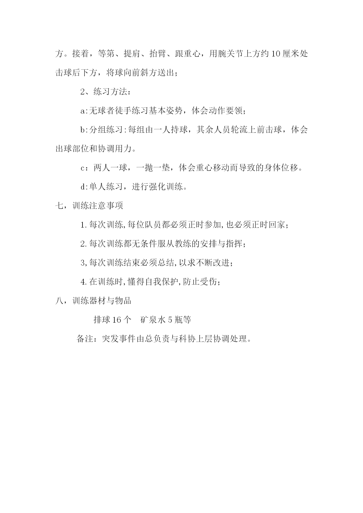 排球训练计划一,指导思想:为了在学校运动会排球方面取得优异的成绩,确保每个队员坚持到底,科学训练,保证效率,特制定此方案.二,训练目标:1使队员能坚持训练,认真刻苦,服从指挥.2熟练掌握排球垫球技巧3提高排球队员的身体素质三,训练时间:工作日每天下午7:00—8:30;非工作日每天下午3:00—5:30;十一期间根据放假情况进行特定安排。注:每人保证有1—2小时的训练时间,具体时间可以根据现场情况进行调整。四,训练场地:东区操场外乒乓球场边空地五,人员安排:1总负责:戴凯阳,王永吉,李丽;2临时负责:从参加的人中选出有排球基础的队员,将其与其他队员分组,并指导其他队员训练;3每次训练前由临时负责人点名考勤,并登记迟到或未到的原因,然后做完准备活动,进入到训练中。六,训练具体措施:1、动作要领:以正面双手垫球为例,从半蹲准备姿势开始,两手手指重叠合掌互握,两拇指并拢,压腕;两臂外翻,前伸至球下方。接着,等第、提肩、抬臂、跟重心,用腕关节上方约10厘米处击球后下方,将球向前斜方送出;2、练习方法:a:无球者徒手练习基本姿势,体会动作要领;b:分组练习:每组由一人持球,其余人员轮流上前击球,体会出球部位和协调用力。c:两人一球,一抛一垫,体会重心移动而导致的身体位移。d:单人练习,进行强化训练。七,训练注意事项1.每次训练,每位队员都必须正时参加,也必须正时回家;2.每次训练都无条件服从教练的安排与指挥;3,每次训练结束必须总结,以求不断改进;4.在训练时,懂得自我保护,防止受伤;八,训练器材与物品排球16个矿泉水5瓶等备注:突发事件由总负责与科协上层协调处理。