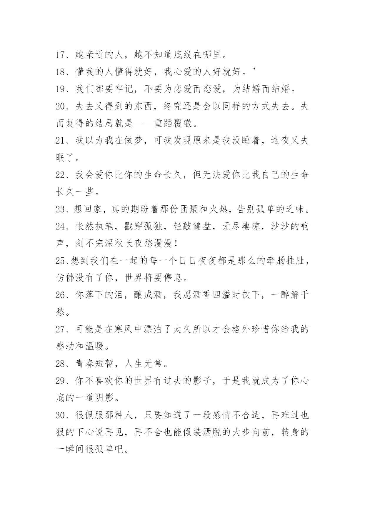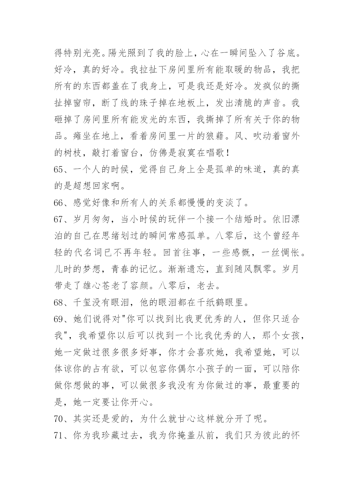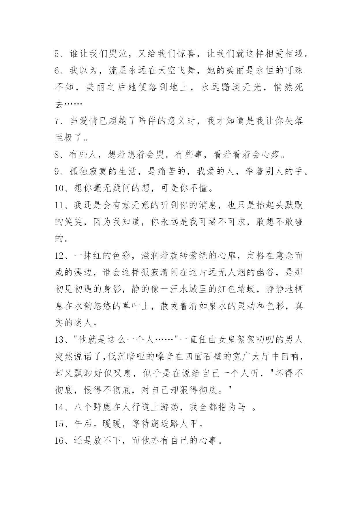 简洁的生活伤感句子2023年简洁的生活伤感句子集锦79句听说家乡下雪了,而秋收还没有结束。我虽在千里之外却也有点触不及防。经世几年,他乡无故交。默默叮嘱自己要多添一件衣服。冬天好像真的来了。下面是小编为大家整理推荐的生活伤感句子79句,仅供参考,希望能够帮助到大家。1、不要随意发脾气,谁都不欠你的。2、如果我的问候打搅了你我很无奈;如果心的间隔已经阔别我很遗憾;如果所有已经从前请你昭示。3、人间有太多痛苦,且不说生老病死,即使是看似快乐的东西,或者被我们孜孜追求的各种享受,其本质依旧是痛苦。这就是人间的无奈,也是我们要远离轮回的根本原因。以前的高僧大德因为修行的缘故,能够坦然面对所有的无常,完全了知生死。这就是修行带来的智慧。4、站在岁月的路途上,孤单溢满了忧伤的神情。遥望着那无次数曾经迷失的方向,恍惚间,内心似乎有东西破碎了一般,纠结着心疼的缠绵,迷离在荒芜的世界。一直喜欢沉溺于动人的故事,于深夜隐藏在文字的背后,回味如风的往事,笑叹狂舞年华,聚万千思绪于一身,等喧嚣沉寂之后,再邀一方清风醉于笔尖,挥洒出一段如梦似幻的经历,将回忆搁浅在停顿的瞬间,独守这份缱绻的感受。5、谁让我们哭泣,又给我们惊喜,让我们就这样相爱相遇。6、我以为,流星永远在天空飞舞,她的美丽是永恒的可殊不知,美丽之后她便落到地上,永远黯淡无光,悄然死去……7、当爱情已超越了陪伴的意义时,我才知道是我让你失落至极了。8、有些人,想着想着会哭。有些事,看着看着会心疼。9、孤独寂寞的生活,是痛苦的,我爱的人,牵着别人的手。10、想你毫无疑问的想,可是你不懂。11、我还是会有意无意的听到你的消息,也只是抬起头默默的笑笑,因为我知道,你永远是我可遇不可求,敢想不敢碰的。12、一抹红的色彩,滋润着旋转萦绕的心扉,定格在意念而成的溪边,谁会这样孤寂清闲在这片远无人烟的幽谷,是那初见初遇的身影,静的像一汪水域里的红色蜻蜓,静静地栖息在水韵悠悠的草叶上,散发着清如泉水的灵动和色彩,真实的迷人。13、"他就是这么一个人……"一直任由女鬼絮絮叨叨的男人突然说话了,低沉暗哑的嗓音在四面石壁的宽广大厅中回响,却又飘渺好似叹息,似乎是在说给自己一个人听,"坏得不彻底,恨得不彻底,对自己却狠得彻底。"14、八个野鹿在人行道上游荡,我全都指为马。15、午后。暖暖,等待邂逅路人甲。16、还是放不下,而他亦有自己的心事。17、越亲近的人,越不知道底线在哪里。18、懂我的人懂得就好,我心爱的人好就好。"19、我们都要牢记,不要为恋爱而恋爱,为结婚而结婚。20、失去又得到的东西,终究还是会以同样的方式失去。失而复得的结局就是——重蹈覆辙。21、我以为我在做梦,可我发现原来是我没睡着,这夜又失眠了。22、我会爱你比你的生命长久,但无法爱你比我自己的生命长久一些。23、想回家,真的期盼着那份团聚和火热,告别孤单的乏味。24、怅然执笔,戳穿孤独,轻敲健盘,无尽凄凉,沙沙的响声,刻不完深秋长夜愁漫漫!25、想到我们在一起的每一个日日夜夜都是那么的牵肠挂肚,仿佛没有了你,世界将要停息。26、你落下的泪,酿成酒,我愿酒香四溢时饮下,一醉解千愁。27、可能是在寒风中漂泊了太久所以才会格外珍惜你给我的感动和温暖。28、青春短暂,人生无常。29、你不喜欢你的世界有过去的影子,于是我就成为了你心底的一道阴影。30、很佩服那种人,只要知道了一段感情不合适,再难过也狠的下心说再见,再不舍也能假装洒脱的大步向前,转身的一瞬间很孤单吧。31、我在别人的故事里,为你流我自己的泪。全世界都可以不懂,如果你也不懂,我还有什么话可说。32、你不轻易的一句话就能让我开心好久。33、不经意回头看一眼,才惊觉那一路都是你的碎片。34、从此不吵不闹不悲不喜不在为难自己,从此寻花问柳,闭口不谈一世厮守,从此灯红酒绿,再也不想牵谁的手,从此手中的酒,杯杯敬自由。35、分手以后,就做回自己:爱情是两个人的事,错过了大家都有责任。一个人总要有个新的开始,别让过去把你栓在悲哀的殿堂。别说你最爱的是谁,人生还很长,谁也无法预知明天。36、如果我知道我所要错的那么我将会珍惜我拥有的一切人生但是是得到后失去,然后失而复得的过程有一些,失去了,仿佛秋天枯萎的花瓣总会有新开放的机会:而有一些,错过了一时,就错过了生命。37、你可以把男人当作物质供给的一方,但别把男人当作填补空虚的对象。38、其实我一般不搭理人,我搭理的都不是一般人。39、在爱情的世界里,能作弊,不情愿的承认我是真的爱你。40、快乐时你不用分心想起我,难过请你一定记得联络我。41、就让时光死掉,就让泪水焚烧,就让幸福不停歇的来往天荒地老。42、真抱歉我文采不够好,想不出怎么形容你这等生物。43、离开一个再也回不去的城市,像传闻里所有陈词滥调的故事。你不见了我才这般想念你。44、良多我们认为