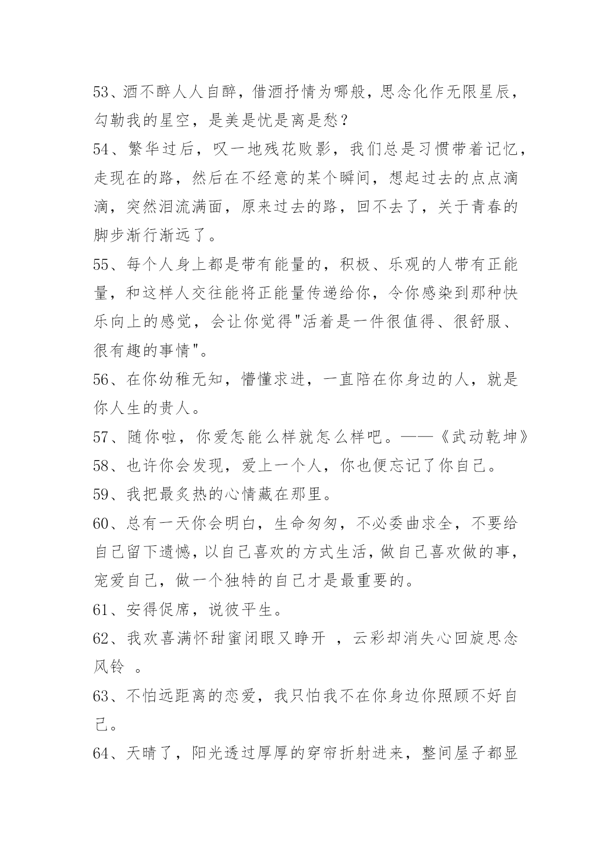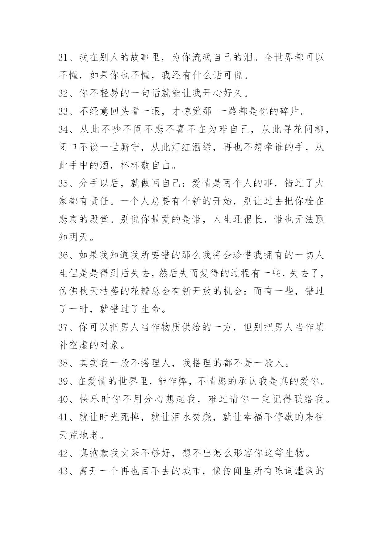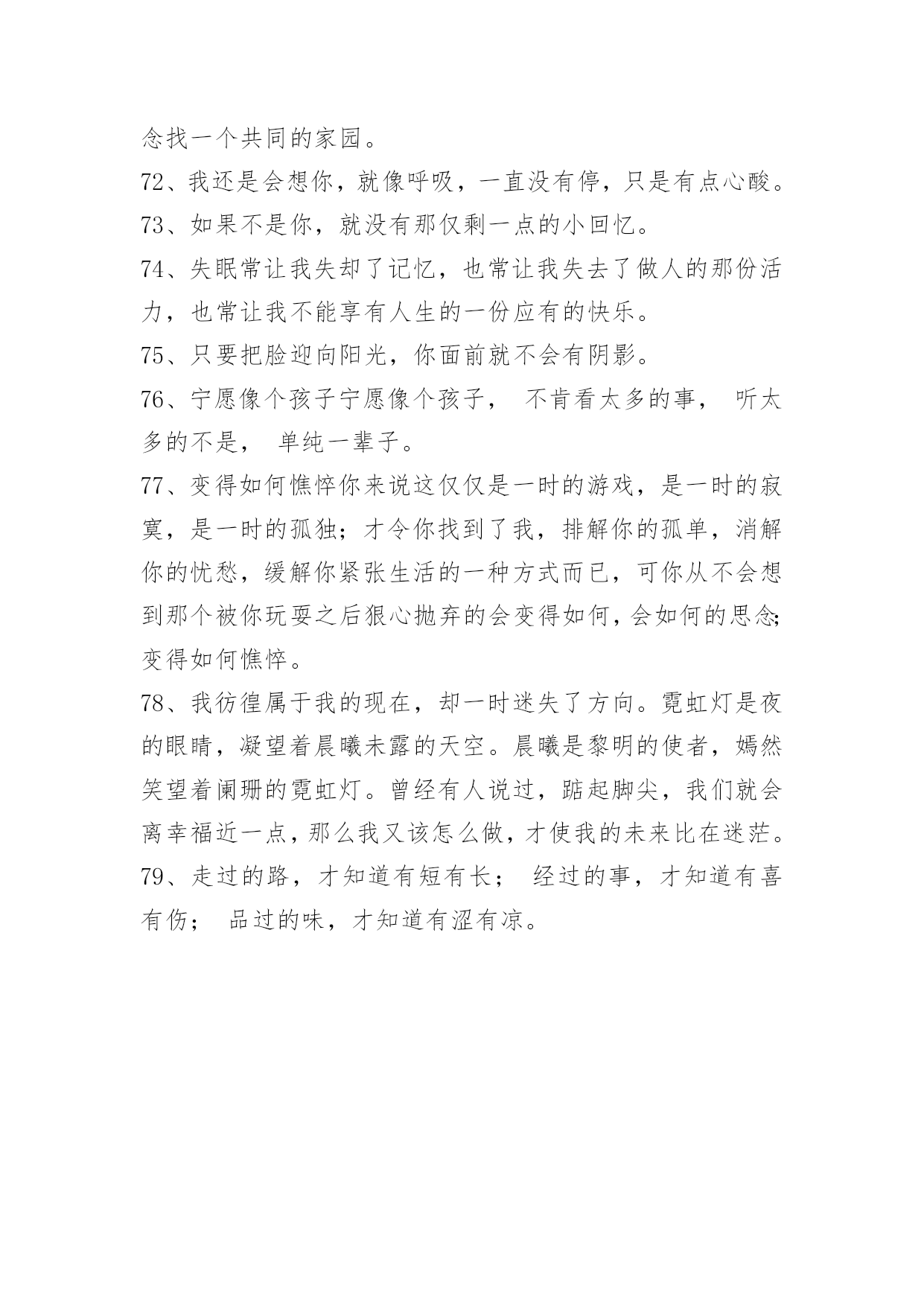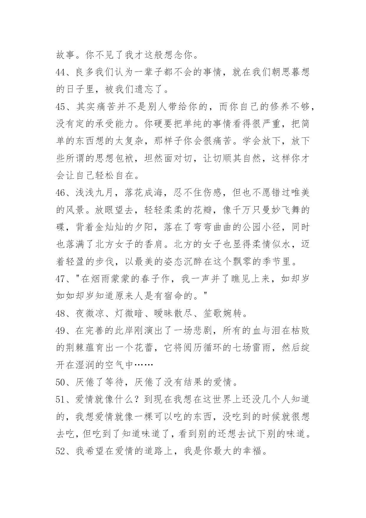简洁的生活伤感句子2023年简洁的生活伤感句子集锦79句听说家乡下雪了,而秋收还没有结束。我虽在千里之外却也有点触不及防。经世几年,他乡无故交。默默叮嘱自己要多添一件衣服。冬天好像真的来了。下面是小编为大家整理推荐的生活伤感句子79句,仅供参考,希望能够帮助到大家。1、不要随意发脾气,谁都不欠你的。2、如果我的问候打搅了你我很无奈;如果心的间隔已经阔别我很遗憾;如果所有已经从前请你昭示。3、人间有太多痛苦,且不说生老病死,即使是看似快乐的东西,或者被我们孜孜追求的各种享受,其本质依旧是痛苦。这就是人间的无奈,也是我们要远离轮回的根本原因。以前的高僧大德因为修行的缘故,能够坦然面对所有的无常,完全了知生死。这就是修行带来的智慧。4、站在岁月的路途上,孤单溢满了忧伤的神情。遥望着那无次数曾经迷失的方向,恍惚间,内心似乎有东西破碎了一般,纠结着心疼的缠绵,迷离在荒芜的世界。一直喜欢沉溺于动人的故事,于深夜隐藏在文字的背后,回味如风的往事,笑叹狂舞年华,聚万千思绪于一身,等喧嚣沉寂之后,再邀一方清风醉于笔尖,挥洒出一段如梦似幻的经历,将回忆搁浅在停顿的瞬间,独守这份缱绻的感受。5、谁让我们哭泣,又给我们惊喜,让我们就这样相爱相遇。6、我以为,流星永远在天空飞舞,她的美丽是永恒的可殊不知,美丽之后她便落到地上,永远黯淡无光,悄然死去……7、当爱情已超越了陪伴的意义时,我才知道是我让你失落至极了。8、有些人,想着想着会哭。有些事,看着看着会心疼。9、孤独寂寞的生活,是痛苦的,我爱的人,牵着别人的手。10、想你毫无疑问的想,可是你不懂。11、我还是会有意无意的听到你的消息,也只是抬起头默默的笑笑,因为我知道,你永远是我可遇不可求,敢想不敢碰的。12、一抹红的色彩,滋润着旋转萦绕的心扉,定格在意念而成的溪边,谁会这样孤寂清闲在这片远无人烟的幽谷,是那初见初遇的身影,静的像一汪水域里的红色蜻蜓,静静地栖息在水韵悠悠的草叶上,散发着清如泉水的灵动和色彩,真实的迷人。13、"他就是这么一个人……"一直任由女鬼絮絮叨叨的男人突然说话了,低沉暗哑的嗓音在四面石壁的宽广大厅中回响,却又飘渺好似叹息,似乎是在说给自己一个人听,"坏得不彻底,恨得不彻底,对自己却狠得彻底。"14、八个野鹿在人行道上游荡,我全都指为马。15、午后。暖暖,等待邂逅路人甲。16、还是放不下,而他亦有自己的心事。17、越亲近的人,越不知道底线在哪里。18、懂我的人懂得就好,我心爱的人好就好。"19、我们都要牢记,不要为恋爱而恋爱,为结婚而结婚。20、失去又得到的东西,终究还是会以同样的方式失去。失而复得的结局就是——重蹈覆辙。21、我以为我在做梦,可我发现原来是我没睡着,这夜又失眠了。22、我会爱你比你的生命长久,但无法爱你比我自己的生命长久一些。23、想回家,真的期盼着那份团聚和火热,告别孤单的乏味。24、怅然执笔,戳穿孤独,轻敲健盘,无尽凄凉,沙沙的响声,刻不完深秋长夜愁漫漫!25、想到我们在一起的每一个日日夜夜都是那么的牵肠挂肚,仿佛没有了你,世界将要停息。26、你落下的泪,酿成酒,我愿酒香四溢时饮下,一醉解千愁。27、可能是在寒风中漂泊了太久所以才会格外珍惜你给我的感动和温暖。28、青春短暂,人生无常。29、你不喜欢你的世界有过去的影子,于是我就成为了你心底的一道阴影。30、很佩服那种人,只要知道了一段感情不合适,再难过也狠的下心说再见,再不舍也能假装洒脱的大步向前,转身的一瞬间很孤单吧。31、我在别人的故事里,为你流我自己的泪。全世界都可以不懂,如果你也不懂,我还有什么话可说。32、你不轻易的一句话就能让我开心好久。33、不经意回头看一眼,才惊觉那一路都是你的碎片。34、从此不吵不闹不悲不喜不在为难自己,从此寻花问柳,闭口不谈一世厮守,从此灯红酒绿,再也不想牵谁的手,从此手中的酒,杯杯敬自由。35、分手以后,就做回自己:爱情是两个人的事,错过了大家都有责任。一个人总要有个新的开始,别让过去把你栓在悲哀的殿堂。别说你最爱的是谁,人生还很长,谁也无法预知明天。36、如果我知道我所要错的那么我将会珍惜我拥有的一切人生但是是得到后失去,然后失而复得的过程有一些,失去了,仿佛秋天枯萎的花瓣总会有新开放的机会:而有一些,错过了一时,就错过了生命。37、你可以把男人当作物质供给的一方,但别把男人当作填补空虚的对象。38、其实我一般不搭理人,我搭理的都不是一般人。39、在爱情的世界里,能作弊,不情愿的承认我是真的爱你。40、快乐时你不用分心想起我,难过请你一定记得联络我。41、就让时光死掉,就让泪水焚烧,就让幸福不停歇的来往天荒地老。42、真抱歉我文采不够好,想不出怎么形容你这等生物。43、离开一个再也回不去的城市,像传闻里所有陈词滥调的故事。你不见了我才这般想念你。44、良多我们认为