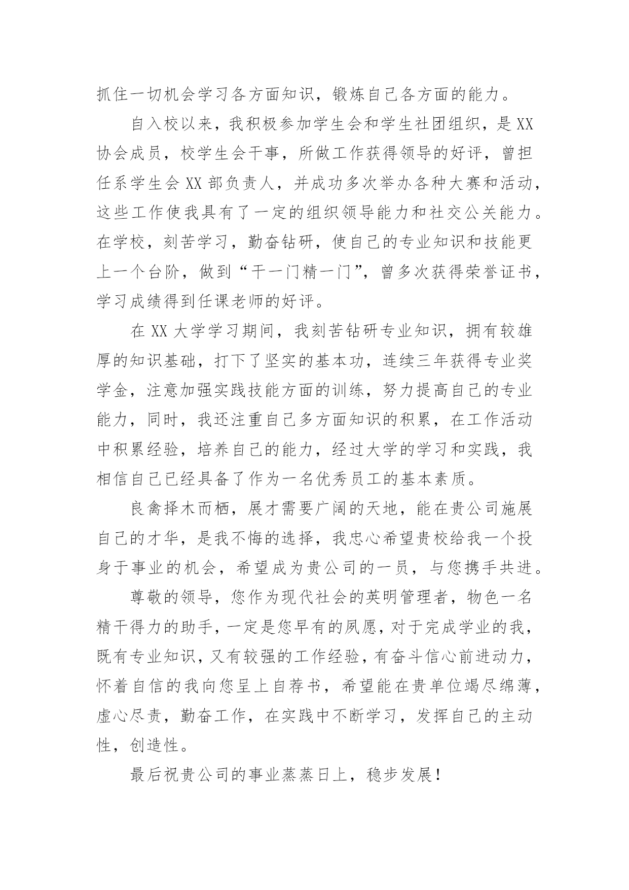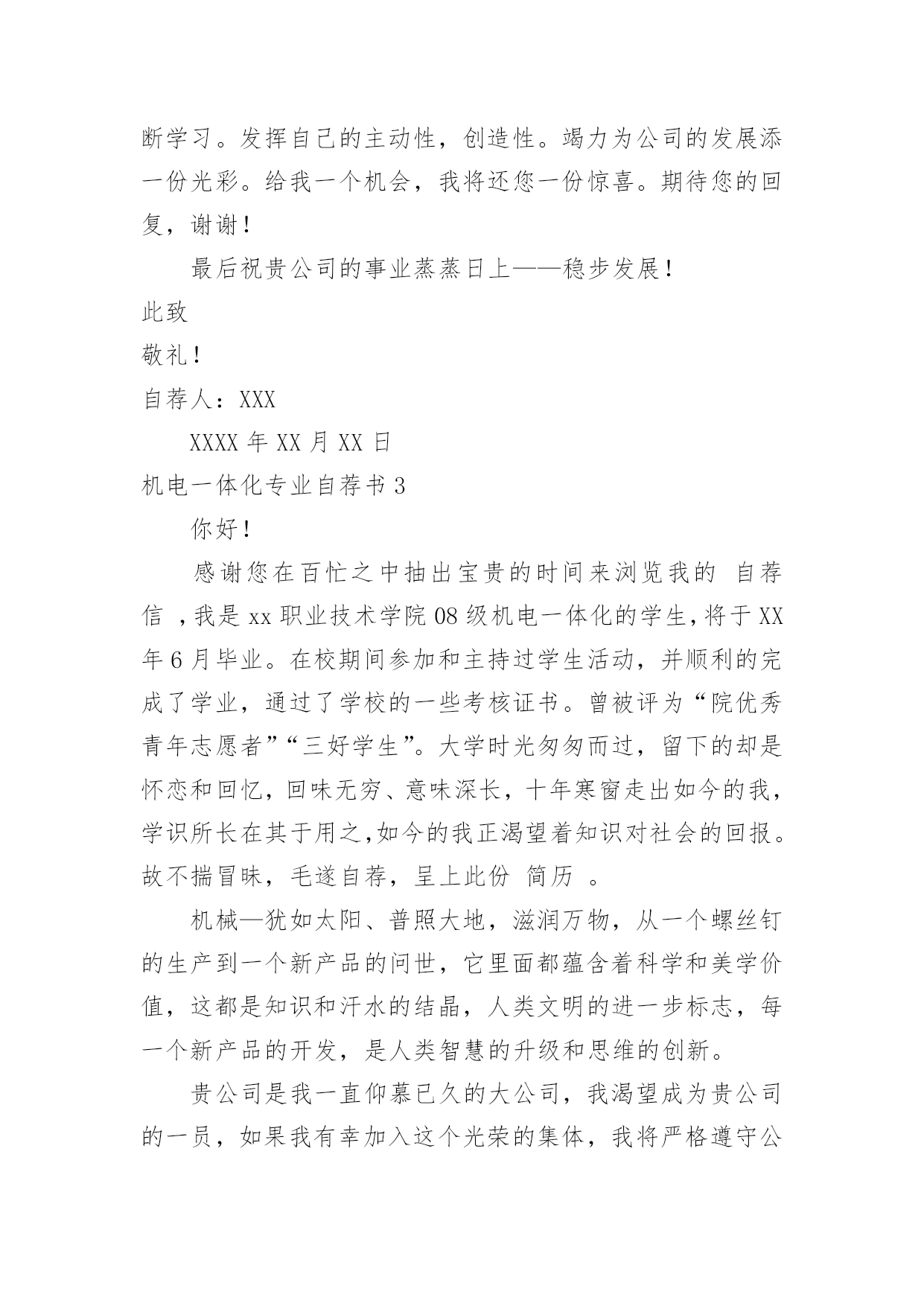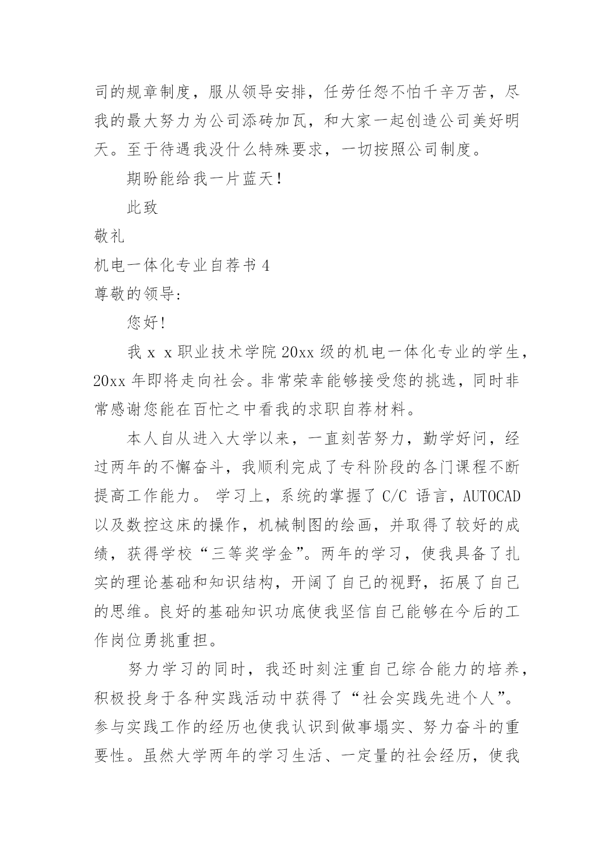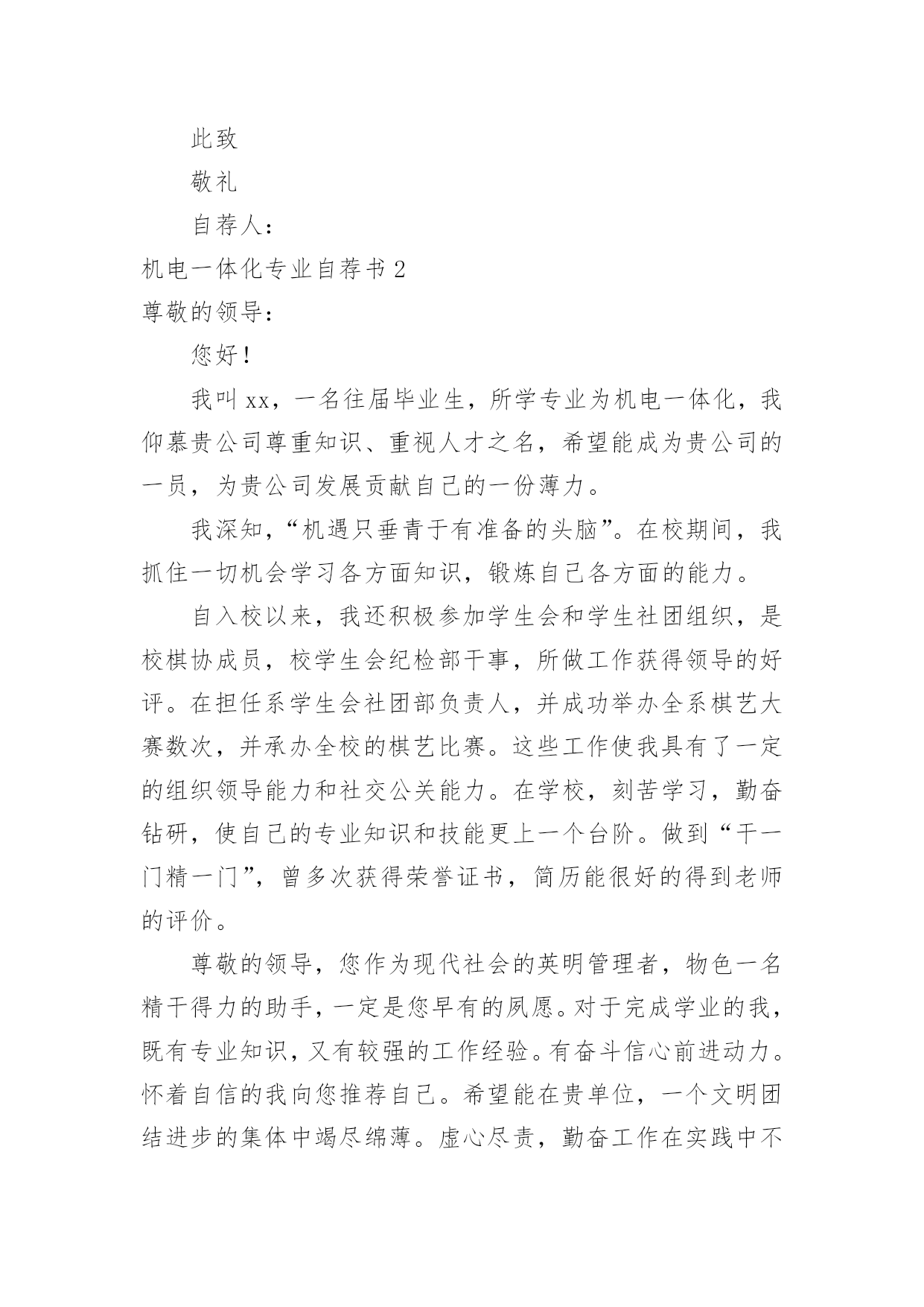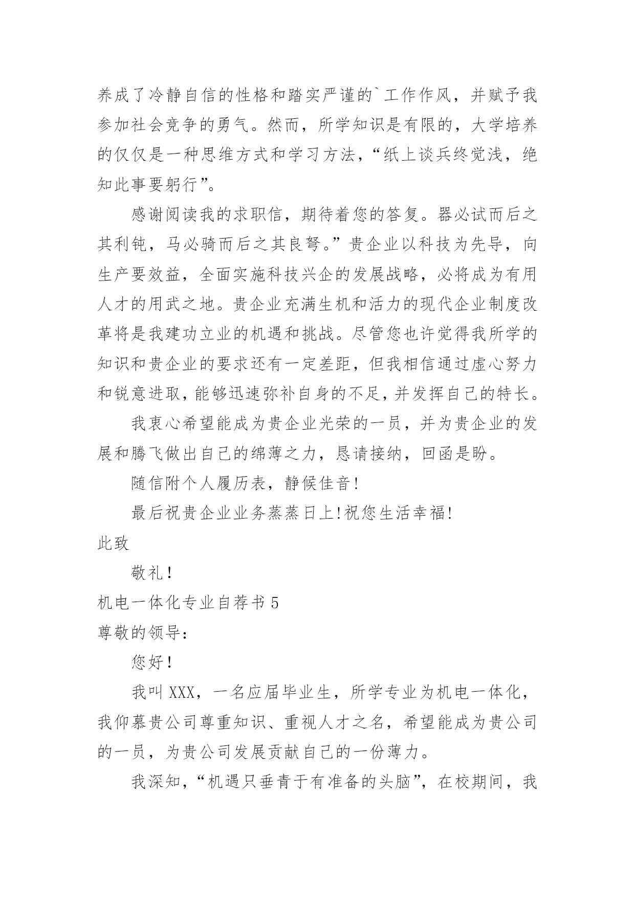 机电一体化专业自荐书机电一体化专业自荐书在发展不断提速的社会中,我们使用上自荐书的情况与日俱增,通过自荐书,可以达到自我推荐的目的。你知道自荐书怎样写才规范吗?以下是小编为大家整理的机电一体化专业自荐书,欢迎阅读与收藏。机电一体化专业自荐书1尊敬的领导:首先感谢您在百忙之中看阅的自荐资料,我叫,是西安现代工程技术学院机电一体化专业的学生。作为一名机电一体化专业的学生,我真诚的热爱我的专业,真诚的热爱我将来所从事的工作。在我学习三年来,我认真的学习并掌握所学的相关的专业课程,使我对机电设备有了更深的认识和了解并对它产生了浓厚的兴趣。在以后工作的时间里我将更加认真的学习专业知识,锻炼自己吃苦耐劳的品质和雷厉风行的作风,时刻严厉要求自己做一名合格的毕业生。尊敬的领导,我怀着绝对的信心带着艰苦奋斗的精神和在挫折和曲折道路上时刻准备和不舍不弃的斗志——需要得到您的认可和信任,我将倾尽所能为贵单位贡献自己的力量并提高自己。感谢您在百忙之中垂阅我的自荐书,我真诚的希望能成为贵单位的一员,为单位的事业开拓创新,争创佳绩。此致敬礼自荐人:机电一体化专业自荐书2尊敬的领导:您好!我叫xx,一名往届毕业生,所学专业为机电一体化,我仰慕贵公司尊重知识、重视人才之名,希望能成为贵公司的一员,为贵公司发展贡献自己的一份薄力。我深知,“机遇只垂青于有准备的头脑”。在校期间,我抓住一切机会学习各方面知识,锻炼自己各方面的能力。自入校以来,我还积极参加学生会和学生社团组织,是校棋协成员,校学生会纪检部干事,所做工作获得领导的好评。在担任系学生会社团部负责人,并成功举办全系棋艺大赛数次,并承办全校的棋艺比赛。这些工作使我具有了一定的组织领导能力和社交公关能力。在学校,刻苦学习,勤奋钻研,使自己的专业知识和技能更上一个台阶。做到“干一门精一门”,曾多次获得荣誉证书,简历能很好的得到老师的评价。尊敬的领导,您作为现代社会的英明管理者,物色一名精干得力的助手,一定是您早有的夙愿。对于完成学业的我,既有专业知识,又有较强的工作经验。有奋斗信心前进动力。怀着自信的我向您推荐自己。希望能在贵单位,一个文明团结进步的集体中竭尽绵薄。虚心尽责,勤奋工作在实践中不断学习。发挥自己的主动性,创造性。竭力为公司的发展添一份光彩。给我一个机会,我将还您一份惊喜。期待您的回复,谢谢!最后祝贵公司的事业蒸蒸日上——稳步发展!此致敬礼!自荐人:XXXXXXX年XX月XX日机电一体化专业自荐书3你好!感谢您在百忙之中抽出宝贵的时间来浏览我的自荐信,我是xx职业技术学院08级机电一体化的学生,将于XX年6月毕业。在校期间参加和主持过学生活动,并顺利的完成了学业,通过了学校的一些考核证书。曾被评为“院优秀青年志愿者”“三好学生”。大学时光匆匆而过,留下的却是怀恋和回忆,回味无穷、意味深长,十年寒窗走出如今的我,学识所长在其于用之,如今的我正渴望着知识对社会的回报。故不揣冒昧,毛遂自荐,呈上此份简历。机械—犹如太阳、普照大地,滋润万物,从一个螺丝钉的生产到一个新产品的问世,它里面都蕴含着科学和美学价值,这都是知识和汗水的结晶,人类文明的进一步标志,每一个新产品的开发,是人类智慧的升级和思维的创新。贵公司是我一直仰慕已久的大公司,我渴望成为贵公司的一员,如果我有幸加入这个光荣的集体,我将严格遵守公司的规章制度,服从领导安排,任劳任怨不怕千辛万苦,尽我的最大努力为公司添砖加瓦,和大家一起创造公司美好明天。至于待遇我没什么特殊要求,一切按照公司制度。期盼能给我一片蓝天!此致敬礼机电一体化专业自荐书4尊敬的领导:您好!我xx职业技术学院20xx级的机电一体化专业的学生,20xx年即将走向社会。非常荣幸能够接受您的挑选,同时非常感谢您能在百忙之中看我的求职自荐材料。本人自从进入大学以来,一直刻苦努力,勤学好问,经过两年的不懈奋斗,我顺利完成了专科阶段的各门课程不断提高工作能力。学习上,系统的掌握了C/C语言,AUTOCAD以及数控这床的操作,机械制图的绘画,并取得了较好的成绩,获得学校“三等奖学金”。两年的学习,使我具备了扎实的理论基础和知识结构,开阔了自己的视野,拓展了自己的思维。良好的基础知识功底使我坚信自己能够在今后的工作岗位勇挑重担。努力学习的同时,我还时刻注重自己综合能力的培养,积极投身于各种实践活动中获得了“社会实践先进个人”。参与实践工作的经历也使我认识到做事塌实、努力奋斗的重要性。虽然大学两年的学习生活、一定量的社会经历,使我养成了冷静自信的性格和踏实严谨的`工作作风,并赋予我参加社会竞争的勇气。然而,所学知识是有限的,大学培养的仅仅是一种思维方式和学习方法,“纸上谈兵终觉浅,绝知此事要躬行”。感谢阅读我的求职信,期待着您的答复。器必试而后之其利钝,马必骑而后之其良弩。”贵企业以科技为先导