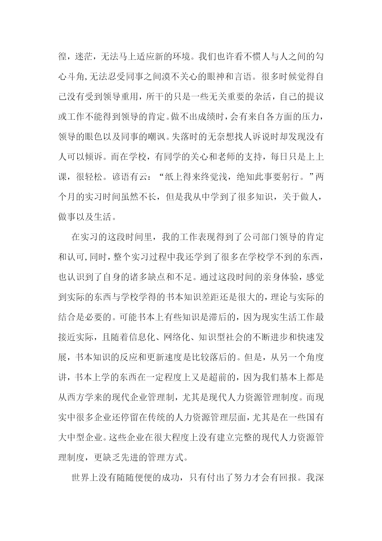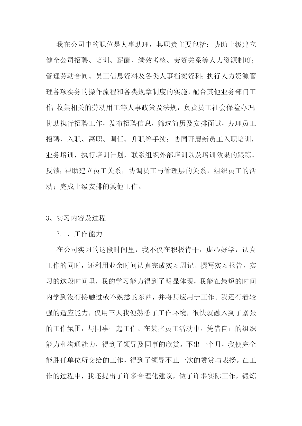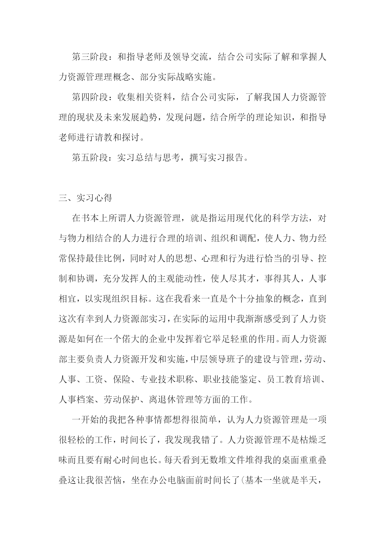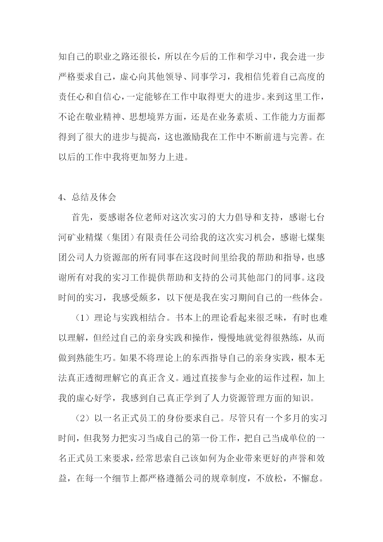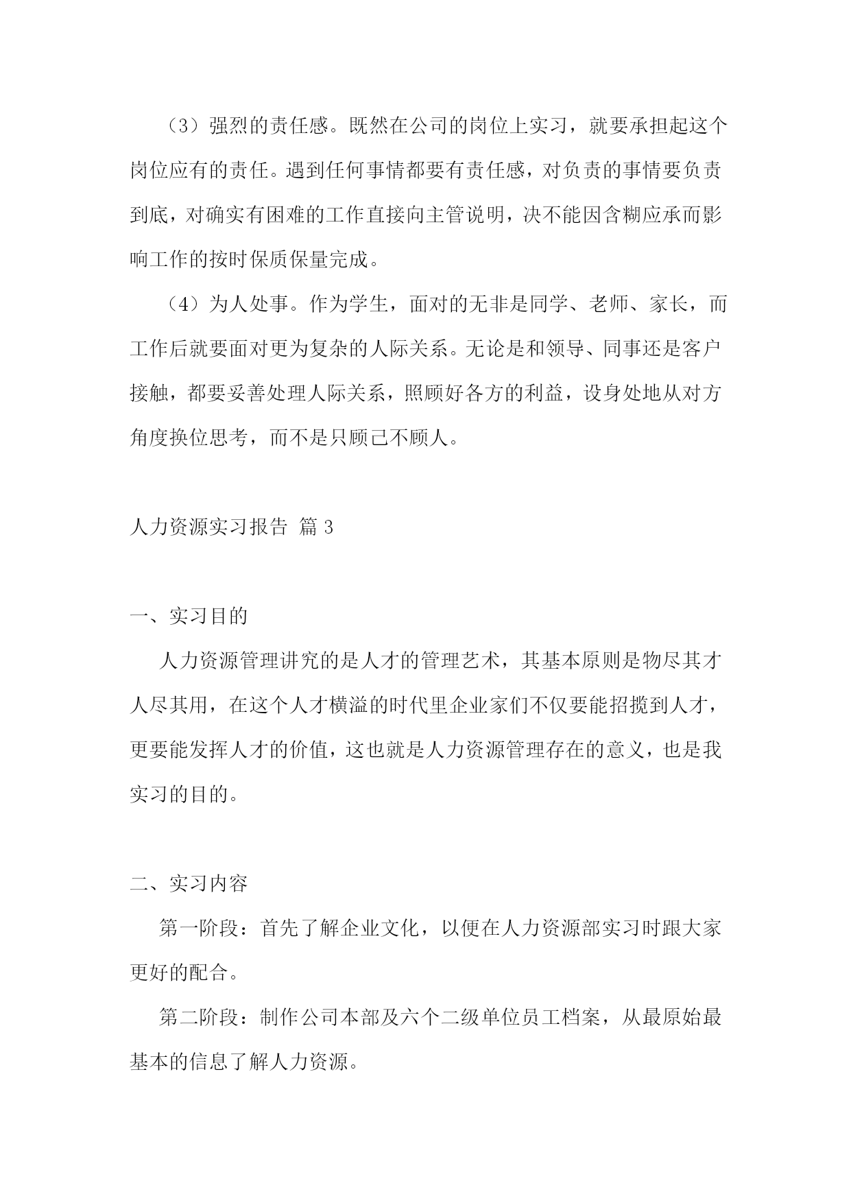 人力资源实习报告14篇人力资源实习报告篇21、实习目的熟悉现实企业中人力资源管理的运作体系和管理流程,把所学理论知识应用于实际,锻炼社会实践能力,并在工作中学习新知识,对所学的知识进行总结提升,以指导未来的工作重点和职业发展方向。学习人力资源管理的实践经验,向从事人力资源管理工作的人员学习具体的人事操作。结合所学的理论知识,领会掌握,融会贯通,并培养实际操作能力,从而了解人力资源管理的基本方法。了解当代大中型国有企业整体管理现状,深入理解人力资源管理工作在企业中的重要性与发展状况,调查企业人力资源管理工作中存在的问题以及其模式,发现和发掘企业现实的管理方式。2、实习单位及岗位介绍七台河矿业精煤(集团)有限责任公司{以下简称七煤(集团)公司}位于黑龙江省东部,1958年9月成立勃利煤矿筹备处,矿区开始开发建设。1961年1月成立勃利矿务局,1965年5月改称七台河矿务局,1998年2月企业改制为七台河矿业精煤(集团)有限责任公司。1986年七台河矿务局行政隶属东北内蒙古煤炭联合公司,1994年东北内蒙古煤炭联合公司撤销,七台河矿务局行政隶属于中国煤炭工业部。1998年3月,第九届全国人民代表大会第一次会议批准国务院机构改革方案,决定不再保留煤炭工业部,在国家经济贸易委员会下设主管煤炭行业的国家煤炭工业局,全国94个国家重点煤炭企业下放到省级地方政府,经黑龙江省政府授权七煤(集团)公司由省煤炭管理局管理。20xx年6月,组建了股份制企业七台河矿业(集团)有限公司,20xx年末,省政府成立国有资产监督管理委员会,七煤(集团)公司划归省国资委管理。20xx年2月,黑龙江龙煤矿业集团有限责任公司成立,七煤(集团)公司所属新建煤矿、龙湖煤矿、新兴煤矿、桃山煤矿、新立煤矿、七台河洗煤厂、桃山选煤厂、新兴选煤厂、龙湖选煤厂、铁东选煤厂、富强选煤厂、热电厂、煤气公司、运输部、物资供应公司、救护大队、电力总公司、设备租赁公司、汽车管理处19个单位组成七台河分公司。龙煤集团七台河分公司与七煤(集团)公司为一套班子,一套管理机构,实行同步工作运行机制。七台河矿区煤田面积1115平方公里,远景储量40亿吨,保有储量11亿吨。其中,七煤(集团)公司开采范围内的井田远景储量为294999万吨。煤层平均厚度为0.86米,是全国煤层最薄的矿区之一。主要煤种为焦煤、1/3焦煤、贫煤、瘦煤、肥煤,煤质低硫、低磷、中灰份、高发热量,产品主要供应东北三省的冶金、电力、化工、建材等行业并打入上海宝钢、上海焦化、江苏国电、广西柳钢等南方市场,洗选精煤打入国际市场,远销到巴西、阿根廷、日本、韩国等国家。我在公司中的职位是人事助理,其职责主要包括:协助上级建立健全公司招聘、培训、薪酬、绩效考核、劳资关系等人力资源制度;管理劳动合同、员工信息资料及各类人事档案资料;执行人力资源管理各项实务的操作流程和各类规章制度的实施,配合其他业务部门工作;收集相关的劳动用工等人事政策及法规,负责员工社会保险办理;协助执行招聘工作,发布招聘信息,筛选简历及安排面试,办理员工招聘、入职、离职、调任、升职等手续;协同开展新员工入职培训,业务培训,执行培训计划,联系组织外部培训以及培训效果的跟踪、反馈;帮助建立员工关系,协调员工与管理层的关系,组织员工的活动;完成上级安排的其他工作。3、实习内容及过程3.1、工作能力在公司实习的这段时间里,我不仅在积极肯干,虚心好学,认真工作的同时,还利用业余时间认真完成实习周记、撰写实习报告。实习的这段时间里,我的学习能力得到了明显体现,我能在最短的时间内学到没有接触过或不熟悉的东西,并将其应用于工作。我还有着较强的适应能力,仅用三天我便熟悉了工作环境,很快就融入到了紧张的工作氛围,与同事一起工作。在某些员工活动中,凭借自己的组织能力和沟通能力,得到了领导及同事的欣赏。不出一个月,我便完全能胜任单位所交给的工作,得到了领导不止一次的赞赏与表扬。在工作的过程中,我还提出了许多合理化建议,做了许多实际工作,锻炼了发现问题和解决问题的能力,为企业的效益和发展做出了贡献。3.2、实习方式我们是以学生的身份进入到该实习单位。在实习的过程中,我积极协助上级建立健全公司各项人事规章制度,并且在业余时间抓紧学习劳动合同及其相关内容,对工作中的劳动合同管理起到了重要作用。同时,利用互联网关注和收集最新的劳动用工等人事政策及法律法规,熟练运用办公软件对员工信息进行整理归档,各类人事档案资料也整理得井井有条。我充分运用大学所学的人力资源管理专业知识,将理论与实践相结合,熟练地掌握了公司人力资源管理各项实务的操作流程和各类规章制度的实施,密切配合了其他业务部门的工作;和其他同事协同开展新员工入职培训,业务培训,执行培训计划,联系组织外部培训以及对培