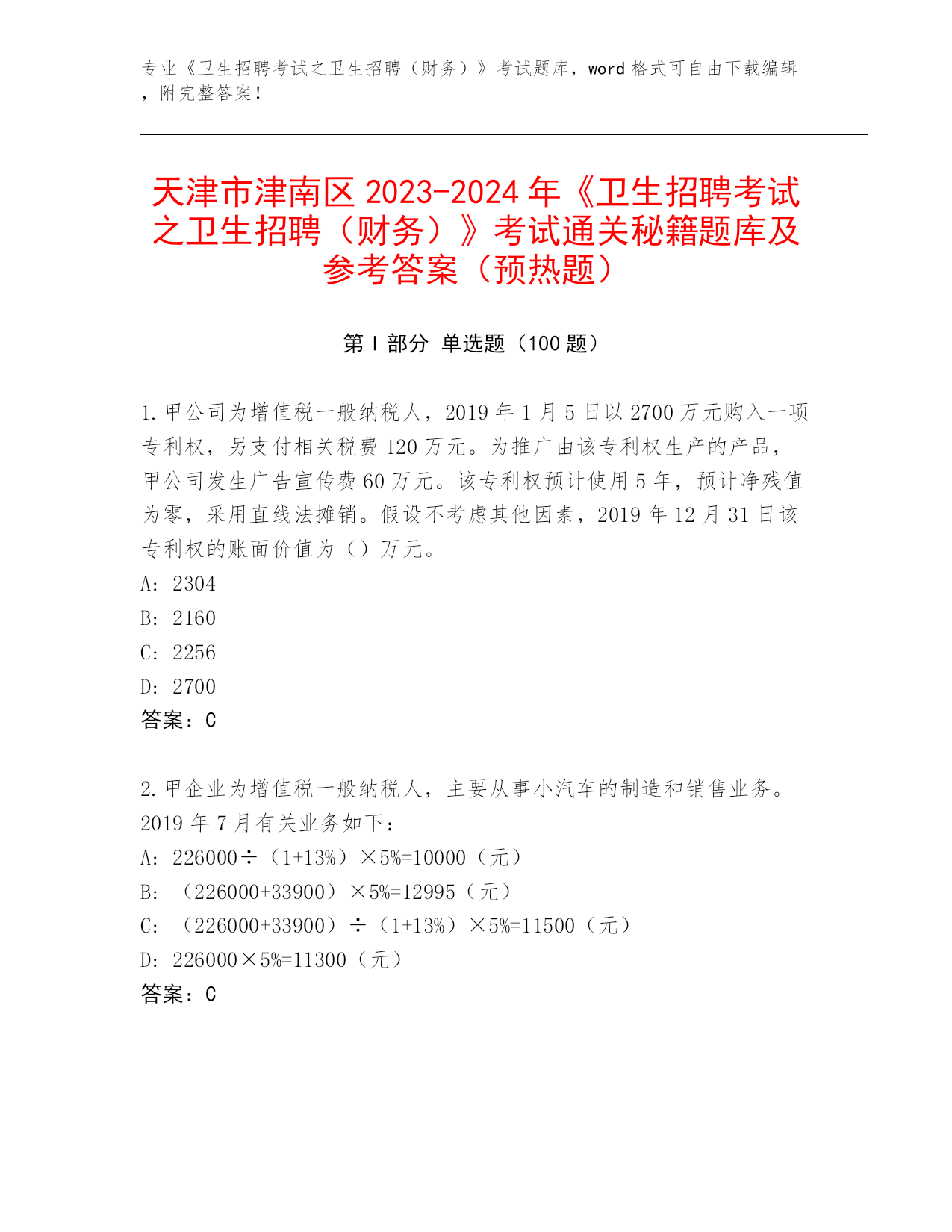 天津市津南区2024年《卫生招聘考试之卫生招聘(财务)》考试必背200题通关秘籍题库答案