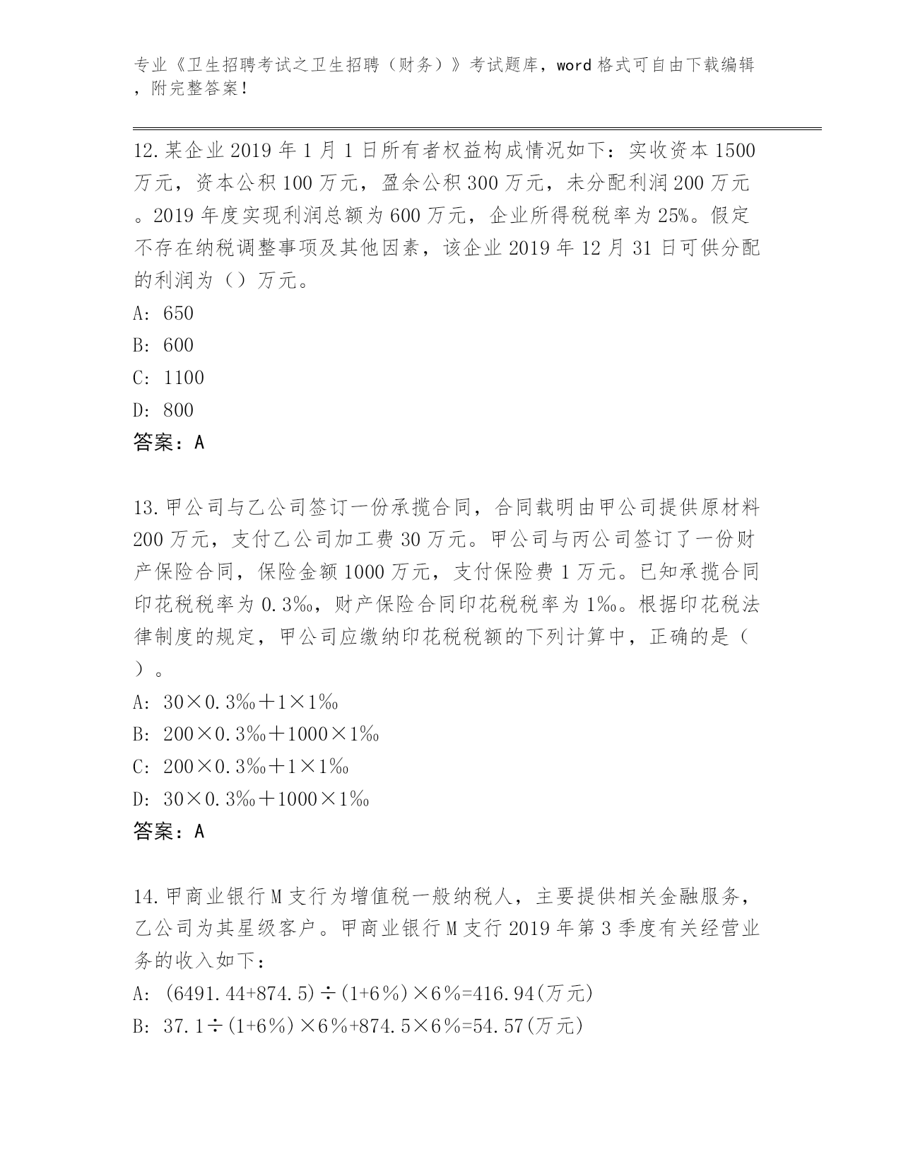 历年天津市静海区《卫生招聘考试之卫生招聘(财务)》考试必刷200题通关秘籍题库附答案(预热题)