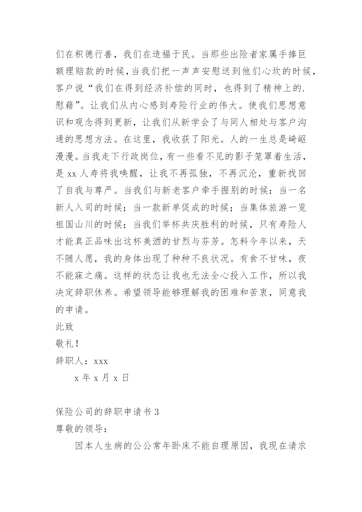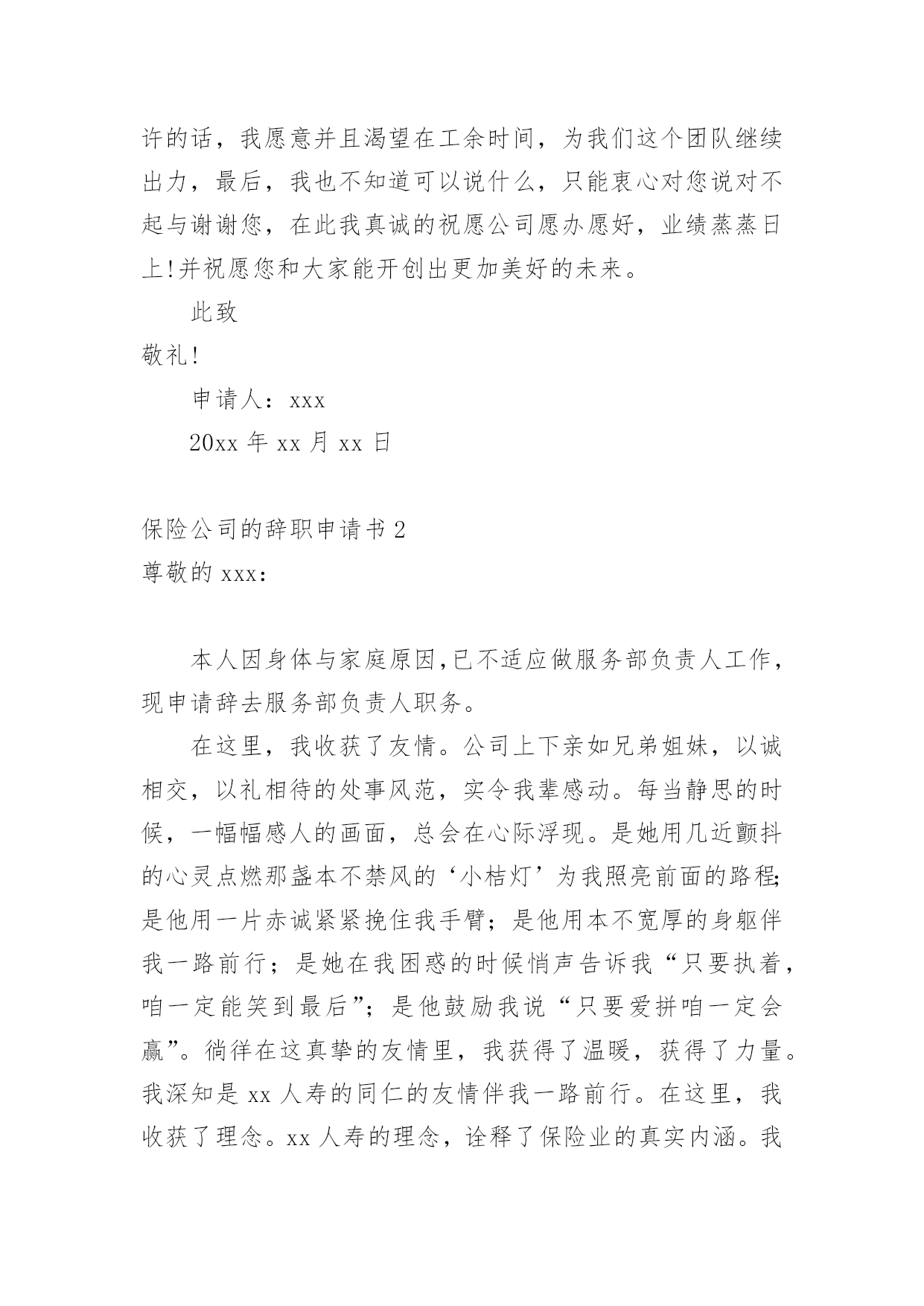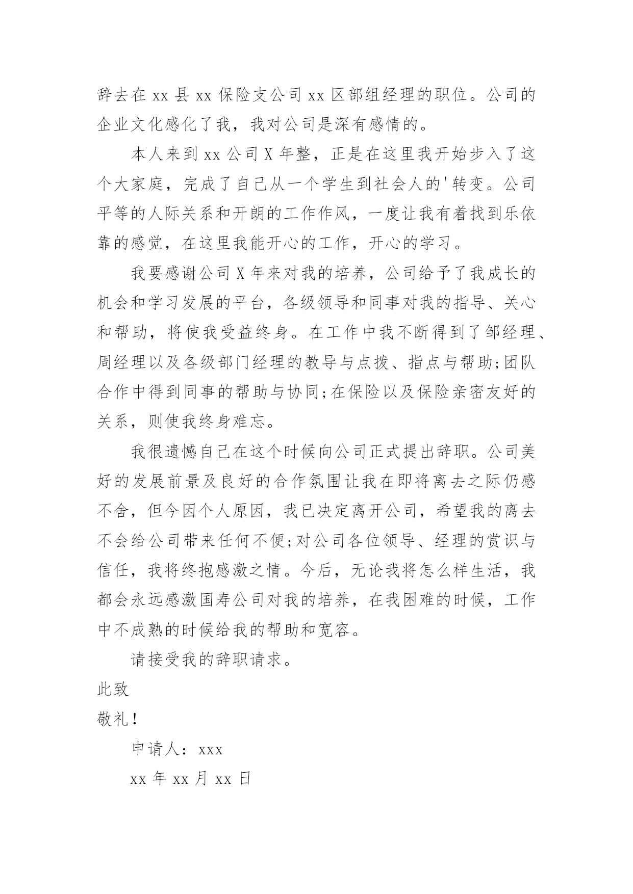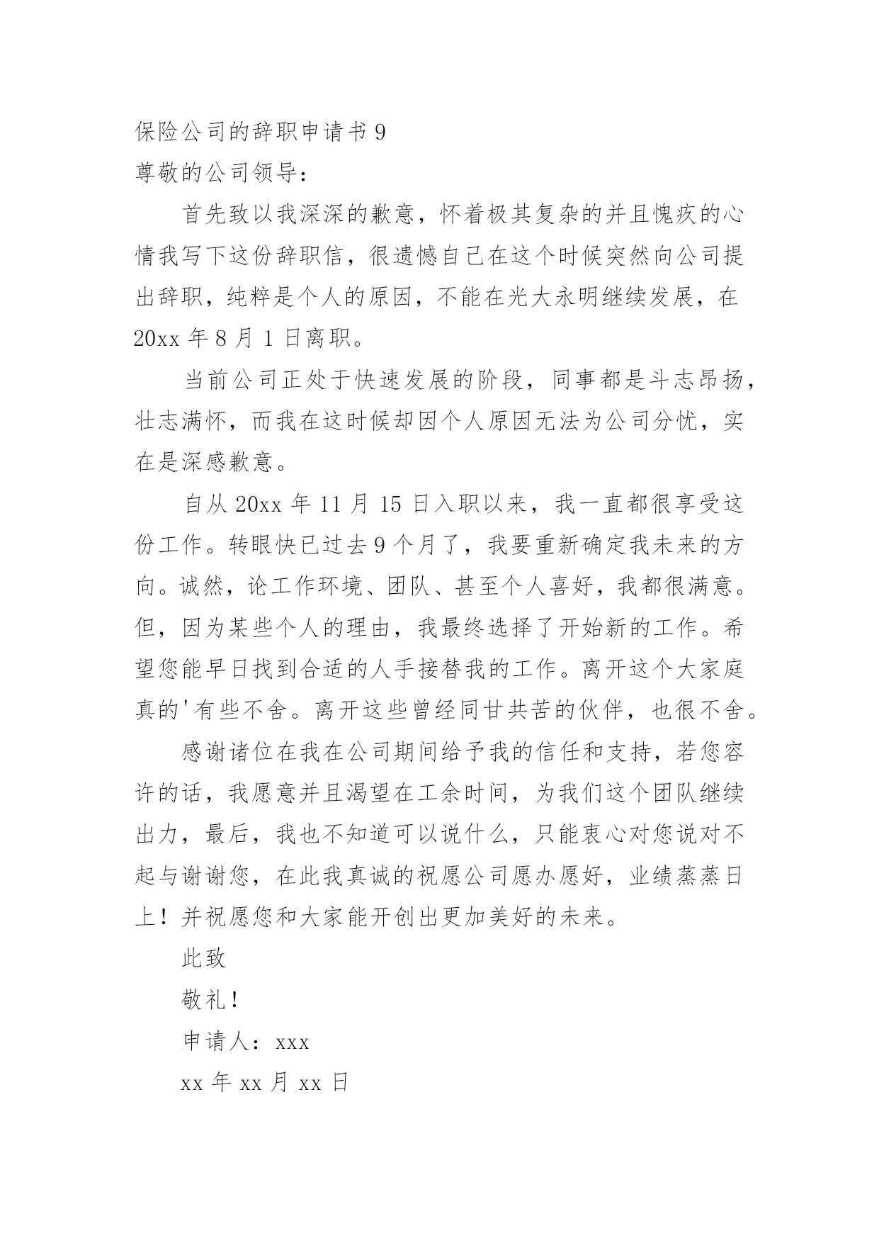 保险公司的辞职申请书保险公司的辞职申请书15篇在眼下市场经济活跃的社会,申请书与我们的生活息息相关,申请书是我们提出请求时使用的一种文书。写申请书需要注意哪些问题呢?以下是小编帮大家整理的保险公司的辞职申请书,仅供参考,大家一起来看看吧。保险公司的辞职申请书1尊敬的公司领导:首先致以我深深的歉意,怀着极其复杂的并且愧疚的`心情我写下这份辞职信,很遗憾自己在这个时候突然向公司提出辞职,纯粹是个人的原因,不能在光大永明继续发展,在20xx年xx月xx日离职。当前公司正处于快速发展的阶段,同事都是斗志昂扬,壮志满怀,而我在这时候却因个人原因无法为公司分忧,实在是深感歉意。自从20xx年xx月xx日入职以来,我一直都很享受这份工作。转眼快已过去xx个月了,我要重新确定我未来的方向。诚然,论工作环境、团队、甚至个人喜好,我都很满意。但,因为某些个人的理由,我最终选择了开始新的工作。希望您能早日找到合适的人手接替我的工作。离开这个大家庭真的有些不舍。离开这些曾经同甘共苦的伙伴,也很不舍。感谢诸位在我在公司期间给予我的信任和支持,若您容许的话,我愿意并且渴望在工余时间,为我们这个团队继续出力,最后,我也不知道可以说什么,只能衷心对您说对不起与谢谢您,在此我真诚的祝愿公司愿办愿好,业绩蒸蒸日上!并祝愿您和大家能开创出更加美好的未来。此致敬礼!申请人:xxx20xx年xx月xx日保险公司的辞职申请书2尊敬的xxx:本人因身体与家庭原因,已不适应做服务部负责人工作,现申请辞去服务部负责人职务。在这里,我收获了友情。公司上下亲如兄弟姐妹,以诚相交,以礼相待的处事风范,实令我辈感动。每当静思的时候,一幅幅感人的画面,总会在心际浮现。是她用几近颤抖的心灵点燃那盏本不禁风的‘小桔灯’为我照亮前面的路程;是他用一片赤诚紧紧挽住我手臂;是他用本不宽厚的身躯伴我一路前行;是她在我困惑的时候悄声告诉我“只要执着,咱一定能笑到最后”;是他鼓励我说“只要爱拼咱一定会赢”。徜徉在这真挚的友情里,我获得了温暖,获得了力量。我深知是xx人寿的同仁的友情伴我一路前行。在这里,我收获了理念。xx人寿的理念,诠释了保险业的真实内涵。我们在积德行善,我们在造福于民。当那些出险者家属手捧巨额理赔款的时候,当我们把一声声安慰送到他们心坎的时候,客户说“我们在得到经济补偿的同时,也得到了精神上的.慰藉”。让我们从内心感到寿险行业的伟大。使我们思想意识和观念得到更新,让我们从新学会了与同人相处与客户沟通的思想方法。在这里,我收获了阳光。人的一生总是崎岖漫漫。当我走下行政岗位,有一些看不见的影子笼罩着生活,是xx人寿将我唤醒,让我不再孤独,不再沉沦,重新找回了自我与尊严。当我们与新老客户牵手握别的时候;当一名新人入司的时候;当一款新单促成的时候;当集体旅游一览祖国山川的时候;当我们举杯共庆胜利的时候,只有寿险人才能真正品味出这杯美酒的甘烈与芬芳。怎料今年以来,天不随人愿,我的身体出现了种种不良状况。有食不甘味,夜不能寐之痛。这样的状态让我也无法全心投入工作,所以我决定辞职休养。希望领导能够理解我的困难和苦衷,同意我的申请。此致敬礼!辞职人:xxxx年x月x日保险公司的辞职申请书3尊敬的领导:因本人生病的公公常年卧床不能自理原因,我现在请求辞去在xx县xx保险支公司xx区部组经理的职位。公司的企业文化感化了我,我对公司是深有感情的。本人来到xx公司X年整,正是在这里我开始步入了这个大家庭,完成了自己从一个学生到社会人的'转变。公司平等的人际关系和开朗的工作作风,一度让我有着找到乐依靠的感觉,在这里我能开心的工作,开心的学习。我要感谢公司X年来对我的培养,公司给予了我成长的机会和学习发展的平台,各级领导和同事对我的指导、关心和帮助,将使我受益终身。在工作中我不断得到了邹经理、周经理以及各级部门经理的教导与点拨、指点与帮助;团队合作中得到同事的帮助与协同;在保险以及保险亲密友好的关系,则使我终身难忘。我很遗憾自己在这个时候向公司正式提出辞职。公司美好的发展前景及良好的合作氛围让我在即将离去之际仍感不舍,但今因个人原因,我已决定离开公司,希望我的离去不会给公司带来任何不便;对公司各位领导、经理的赏识与信任,我将终抱感激之情。今后,无论我将怎么样生活,我都会永远感激国寿公司对我的培养,在我困难的时候,工作中不成熟的时候给我的帮助和宽容。请接受我的辞职请求。此致敬礼!申请人:xxxxx年xx月xx日保险公司的辞职申请书4尊敬的公司领导:首先致以我深深的歉意,怀着极其复杂的并且愧疚的心情我写下这份辞职信,很遗憾自己在这个时候突然向公司提出辞职,纯粹是个人的原因,不能在光大永明继续发展,在20xx年x月x日离职。当前公司正处于快速发展的阶段,同事都是斗志昂扬,壮志满怀,而我在这时候却因个人原因无法为公