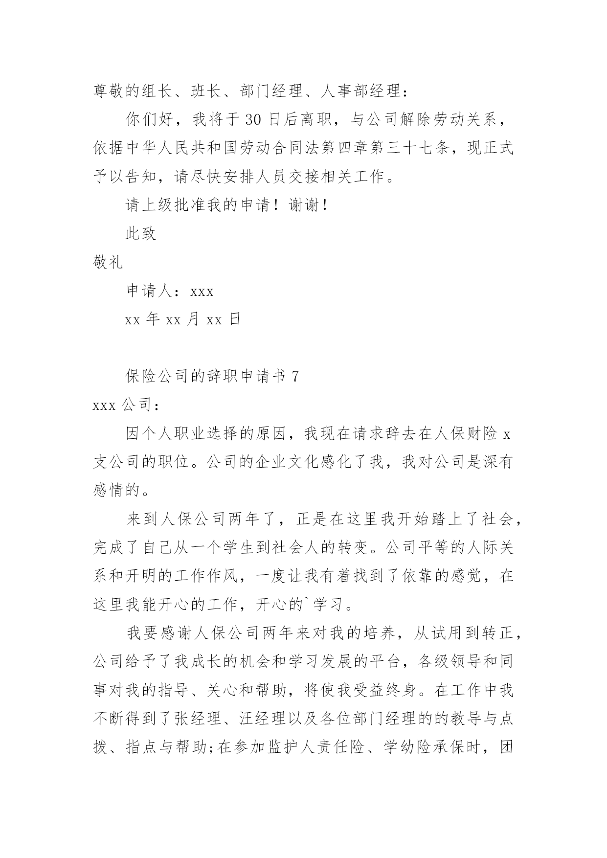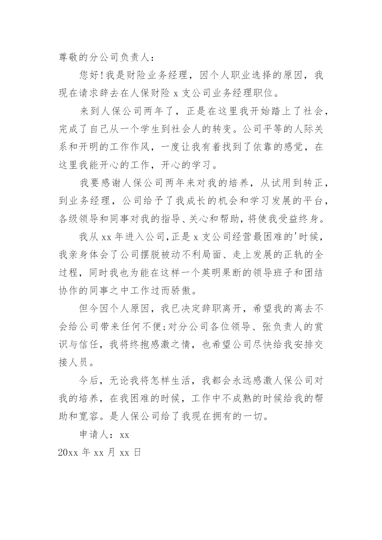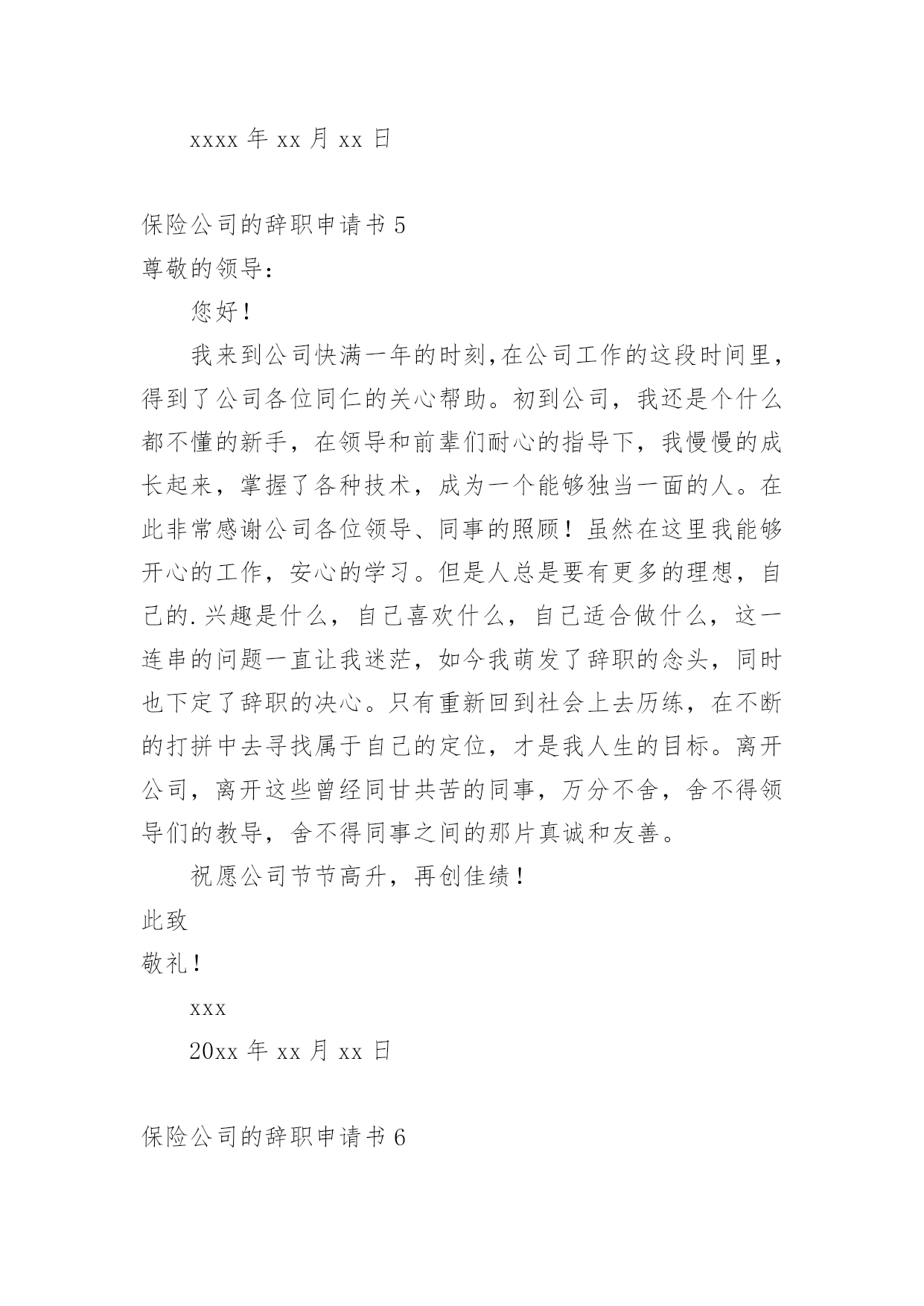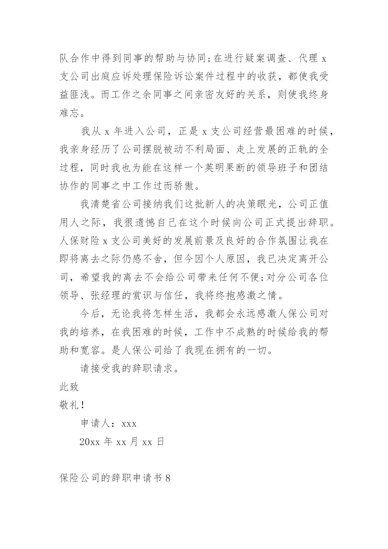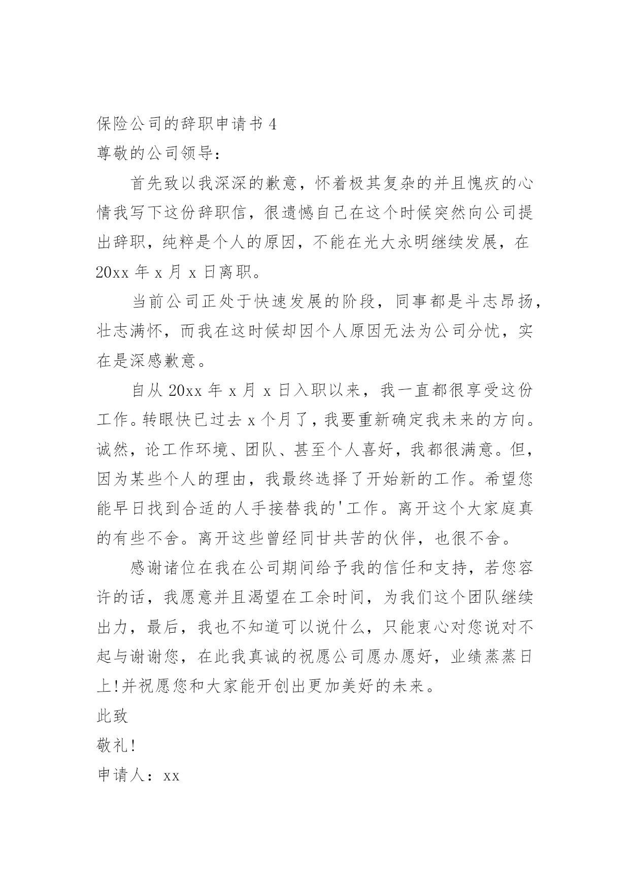 保险公司的辞职申请书保险公司的辞职申请书15篇在眼下市场经济活跃的社会,申请书与我们的生活息息相关,申请书是我们提出请求时使用的一种文书。写申请书需要注意哪些问题呢?以下是小编帮大家整理的保险公司的辞职申请书,仅供参考,大家一起来看看吧。保险公司的辞职申请书1尊敬的公司领导:首先致以我深深的歉意,怀着极其复杂的并且愧疚的`心情我写下这份辞职信,很遗憾自己在这个时候突然向公司提出辞职,纯粹是个人的原因,不能在光大永明继续发展,在20xx年xx月xx日离职。当前公司正处于快速发展的阶段,同事都是斗志昂扬,壮志满怀,而我在这时候却因个人原因无法为公司分忧,实在是深感歉意。自从20xx年xx月xx日入职以来,我一直都很享受这份工作。转眼快已过去xx个月了,我要重新确定我未来的方向。诚然,论工作环境、团队、甚至个人喜好,我都很满意。但,因为某些个人的理由,我最终选择了开始新的工作。希望您能早日找到合适的人手接替我的工作。离开这个大家庭真的有些不舍。离开这些曾经同甘共苦的伙伴,也很不舍。感谢诸位在我在公司期间给予我的信任和支持,若您容许的话,我愿意并且渴望在工余时间,为我们这个团队继续出力,最后,我也不知道可以说什么,只能衷心对您说对不起与谢谢您,在此我真诚的祝愿公司愿办愿好,业绩蒸蒸日上!并祝愿您和大家能开创出更加美好的未来。此致敬礼!申请人:xxx20xx年xx月xx日保险公司的辞职申请书2尊敬的xxx:本人因身体与家庭原因,已不适应做服务部负责人工作,现申请辞去服务部负责人职务。在这里,我收获了友情。公司上下亲如兄弟姐妹,以诚相交,以礼相待的处事风范,实令我辈感动。每当静思的时候,一幅幅感人的画面,总会在心际浮现。是她用几近颤抖的心灵点燃那盏本不禁风的‘小桔灯’为我照亮前面的路程;是他用一片赤诚紧紧挽住我手臂;是他用本不宽厚的身躯伴我一路前行;是她在我困惑的时候悄声告诉我“只要执着,咱一定能笑到最后”;是他鼓励我说“只要爱拼咱一定会赢”。徜徉在这真挚的友情里,我获得了温暖,获得了力量。我深知是xx人寿的同仁的友情伴我一路前行。在这里,我收获了理念。xx人寿的理念,诠释了保险业的真实内涵。我们在积德行善,我们在造福于民。当那些出险者家属手捧巨额理赔款的时候,当我们把一声声安慰送到他们心坎的时候,客户说“我们在得到经济补偿的同时,也得到了精神上的.慰藉”。让我们从内心感到寿险行业的伟大。使我们思想意识和观念得到更新,让我们从新学会了与同人相处与客户沟通的思想方法。在这里,我收获了阳光。人的一生总是崎岖漫漫。当我走下行政岗位,有一些看不见的影子笼罩着生活,是xx人寿将我唤醒,让我不再孤独,不再沉沦,重新找回了自我与尊严。当我们与新老客户牵手握别的时候;当一名新人入司的时候;当一款新单促成的时候;当集体旅游一览祖国山川的时候;当我们举杯共庆胜利的时候,只有寿险人才能真正品味出这杯美酒的甘烈与芬芳。怎料今年以来,天不随人愿,我的身体出现了种种不良状况。有食不甘味,夜不能寐之痛。这样的状态让我也无法全心投入工作,所以我决定辞职休养。希望领导能够理解我的困难和苦衷,同意我的申请。此致敬礼!辞职人:xxxx年x月x日保险公司的辞职申请书3尊敬的领导:因本人生病的公公常年卧床不能自理原因,我现在请求辞去在xx县xx保险支公司xx区部组经理的职位。公司的企业文化感化了我,我对公司是深有感情的。本人来到xx公司X年整,正是在这里我开始步入了这个大家庭,完成了自己从一个学生到社会人的'转变。公司平等的人际关系和开朗的工作作风,一度让我有着找到乐依靠的感觉,在这里我能开心的工作,开心的学习。我要感谢公司X年来对我的培养,公司给予了我成长的机会和学习发展的平台,各级领导和同事对我的指导、关心和帮助,将使我受益终身。在工作中我不断得到了邹经理、周经理以及各级部门经理的教导与点拨、指点与帮助;团队合作中得到同事的帮助与协同;在保险以及保险亲密友好的关系,则使我终身难忘。我很遗憾自己在这个时候向公司正式提出辞职。公司美好的发展前景及良好的合作氛围让我在即将离去之际仍感不舍,但今因个人原因,我已决定离开公司,希望我的离去不会给公司带来任何不便;对公司各位领导、经理的赏识与信任,我将终抱感激之情。今后,无论我将怎么样生活,我都会永远感激国寿公司对我的培养,在我困难的时候,工作中不成熟的时候给我的帮助和宽容。请接受我的辞职请求。此致敬礼!申请人:xxxxx年xx月xx日保险公司的辞职申请书4尊敬的公司领导:首先致以我深深的歉意,怀着极其复杂的并且愧疚的心情我写下这份辞职信,很遗憾自己在这个时候突然向公司提出辞职,纯粹是个人的原因,不能在光大永明继续发展,在20xx年x月x日离职。当前公司正处于快速发展的阶段,同事都是斗志昂扬,壮志满怀,而我在这时候却因个人原因无法为公