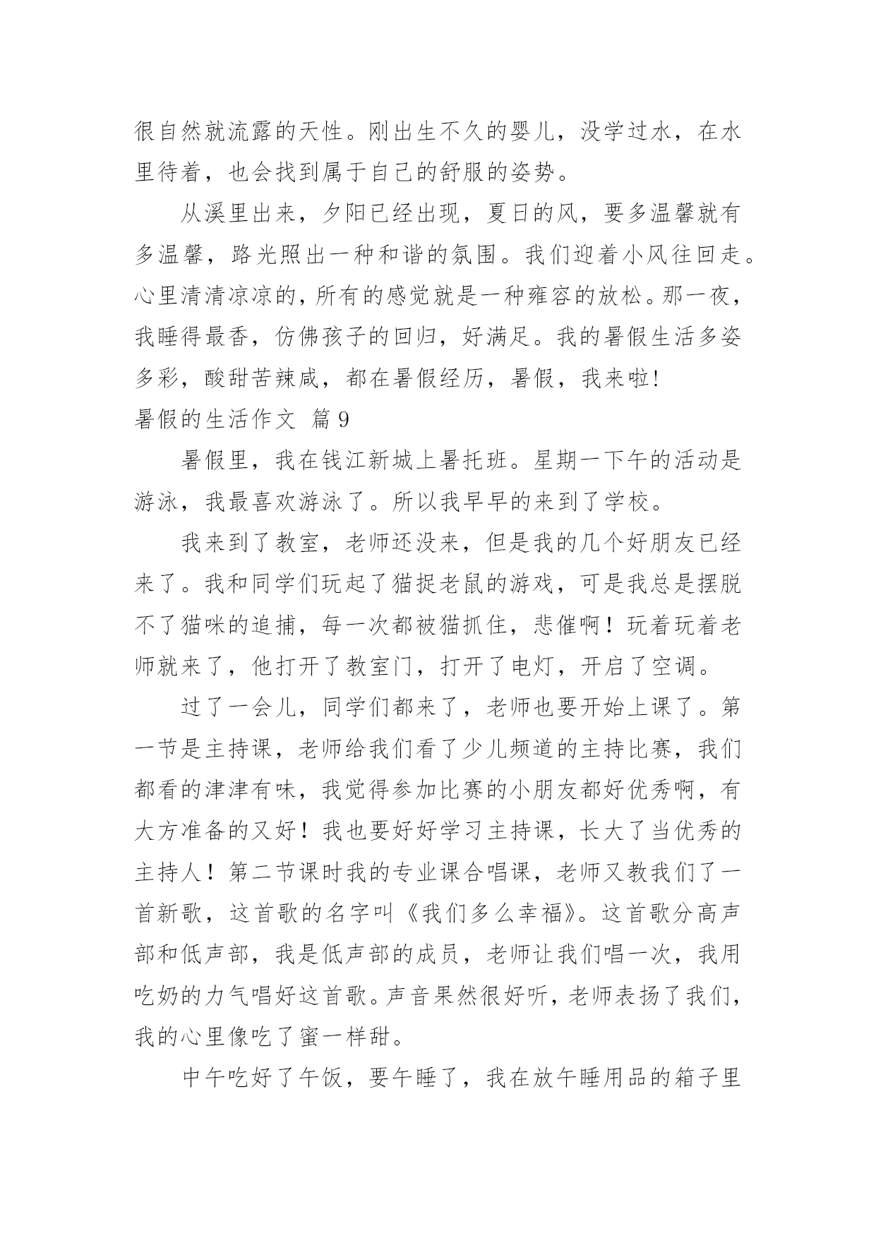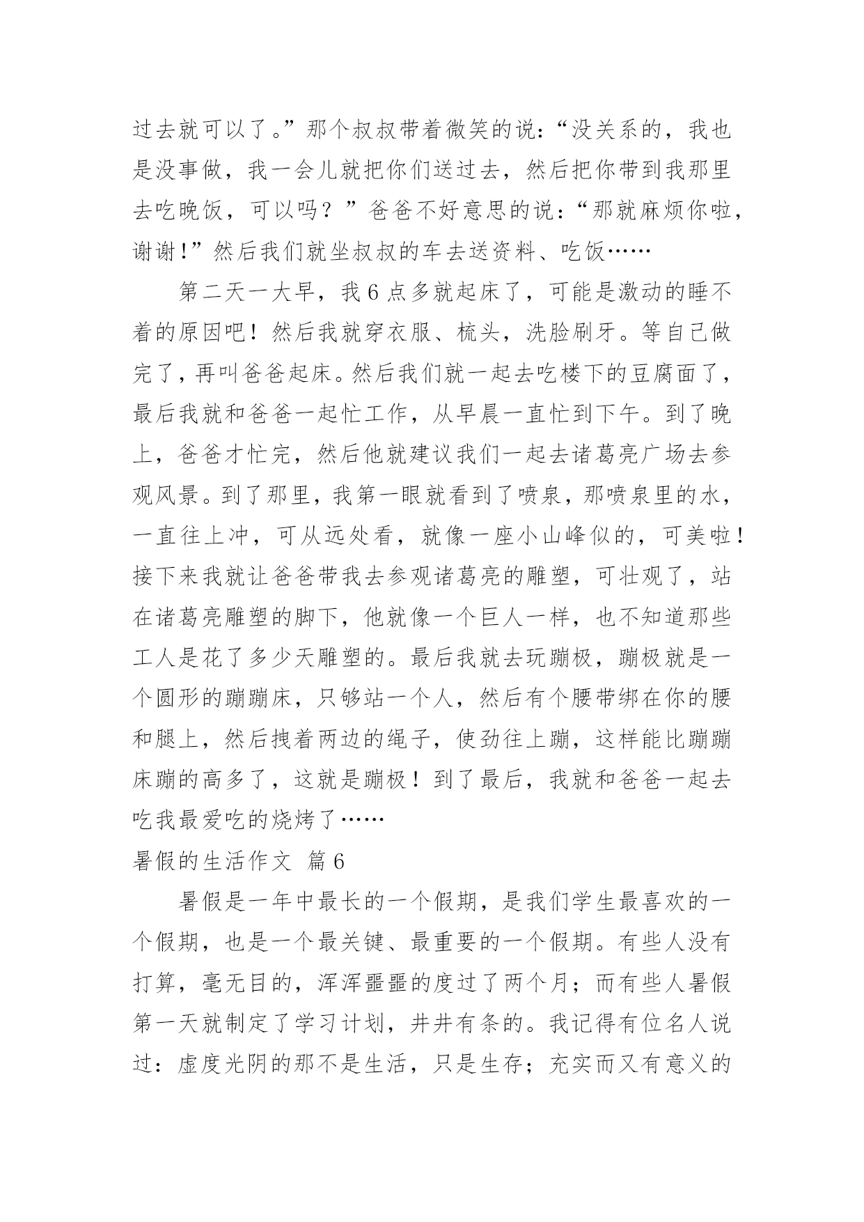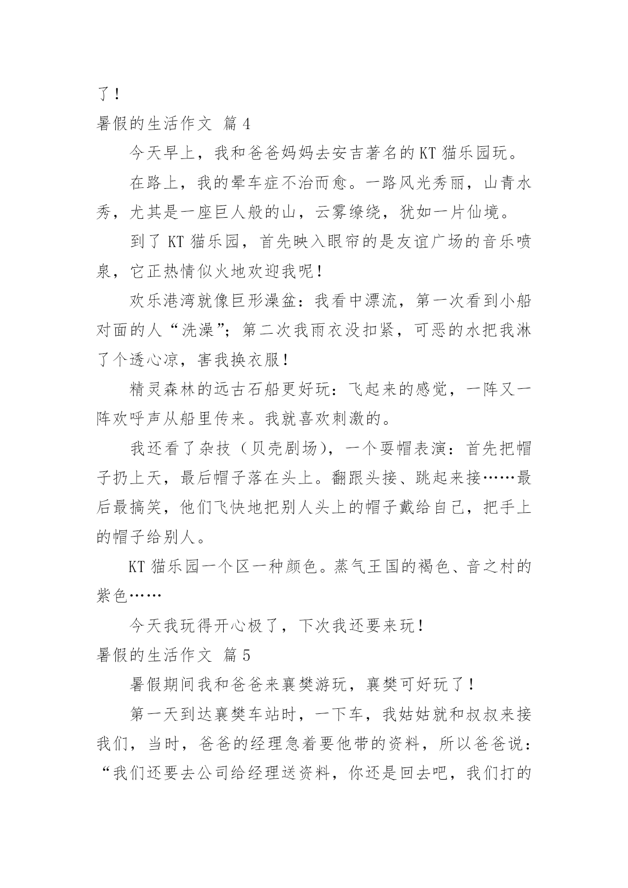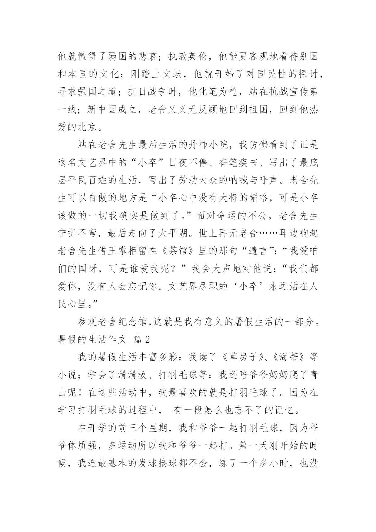 暑假的生活作文【精选】暑假的生活作文10篇在日常学习、工作抑或是生活中,大家都经常接触到作文吧,通过作文可以把我们那些零零散散的思想,聚集在一块。你知道作文怎样才能写的好吗?下面是小编收集整理的暑假的生活作文10篇,仅供参考,大家一起来看看吧。暑假的生活作文篇1在人艺舞台上,《四世同堂》、《茶馆》、《骆驼祥子》……老舍这些脍炙人口的经典名著被一次次搬上舞台,成为经久不衰的保留剧目。在小学课本里,《林海》、《草原》、《猫》……老舍的这些作品陪伴我们度过了整个小学时代。今年暑假,我终于有机会走进老舍纪念馆,近距离地瞻仰和拜访“老舍先生”。老舍纪念馆位于北京市东城区灯市口西街丰富胡同19号。在纪念馆门外的墙上,老舍给自己做出了高度的概括:我是文艺界中的一名小卒,十几年来日日操练在书桌与小凳之间;笔是枪,把热血洒在纸上……看到这些文字,我对老舍先生的敬佩之情油然而生。漫步在老舍纪念馆,通过一张张图片和实物展览,我看到了老舍结交的朋友既有大政治家、名教授,也有老艺人、洋车夫。他会卖衣服为朋友接风,“真”是他的待友之道。展览介绍了老舍先生短暂而又辉煌的一生。咿呀学语时,他就懂得了弱国的悲哀;执教英伦,他能更客观地看待别国和本国的文化;刚踏上文坛,他就开始了对国民性的探讨,寻求强国之道;抗日战争时,他化笔为枪,站在抗战宣传第一线;新中国成立,老舍又义无反顾地回到祖国,回到他热爱的北京。站在老舍先生最后生活的丹柿小院,我仿佛看到了正是这名文艺界中的“小卒”日夜不停、奋笔疾书、写出了最底层平民百姓的生活,写出了劳动大众的呐喊与呼声。老舍先生可以自傲的地方是“小卒心中没有大将的韬略,可是小卒该做的一切我确实是做到了。”面对命运的不公,老舍先生宁折不弯,最后走向了太平湖。世上再无老舍……耳边响起老舍先生借王掌柜留在《茶馆》里的那句“遗言”:“我爱咱们的国呀,可是谁爱我呢?”我会大声地对他说:“我们都爱你,没有人会忘记你。文艺界尽职的‘小卒’永远活在人民心里。”参观老舍纪念馆,这就是我有意义的暑假生活的一部分。暑假的生活作文篇2我的暑假生活丰富多彩:我读了《草房子》、《海蒂》等小说;学会了滑滑板、打羽毛球等:我还陪爷爷奶奶爬了青山呢!在这些活动中,我最喜欢的就是打羽毛球了。因为在学习打羽毛球的过程中,有一段怎么也忘不了的记忆。在开学的前三个星期,我和爷爷一起打羽毛球,因为爷爷体质强,多运动所以我和爷爷一起打。第一天刚开始的时候,我连最基本的发球接球都不会,练了一个多小时,也没有一点进步,而且还大汗淋漓,胳膊很酸疼,很累,浑身没有一点力气,就垂头丧气的回家了,回家后还气喘吁吁。但我看见爷爷那么大岁数都能比我强,我不服气,所以我对爷爷说:“我们明天还要练!”“好!只要你愿意,我一定奉陪到底。”第二天仍是这个样子,但明显比第一天的接球、发球好了许多,接下来的几天是一天比一天有进步。就这样,我练了半个月。虽然现在还有些小毛病,但我会努力去改正的!我从这件事体会到了成功的喜悦,也印证了一句话:世上没有做不到的事,只有不努力做的事。暑假的生活作文篇3这个暑假我做了不少有意义的、有趣的事情,比如读书啦、写作业啦、看电影啦、玩电脑啦、出去跑啦、做手工啦、出去旅游啦、雏鹰假日小队啦、上辅导班啦、锻炼身体啦等等。这些活动中我印象最深的还是奥体中心的“奥体之星”夏令营。我们在夏令营,上午可以打羽毛球、打篮球、打乒乓球,或者可以打网球、踢足球。下午可以写作业,也可以读课外书,之后就是课间十五分钟,课间十五分钟完毕就可以去做我最喜欢的事情——游泳了。夏令营还有一个星期就要结束了,我对这一个星期是超期待的,我对乒乓球是超期待的!虽然愉快的暑假生活就要结束了,但是快乐的五年级生涯马上就要开始了,我马上就要见到亲爱的老师和同学们了!暑假的生活作文篇4今天早上,我和爸爸妈妈去安吉著名的KT猫乐园玩。在路上,我的晕车症不治而愈。一路风光秀丽,山青水秀,尤其是一座巨人般的山,云雾缭绕,犹如一片仙境。到了KT猫乐园,首先映入眼帘的是友谊广场的音乐喷泉,它正热情似火地欢迎我呢!欢乐港湾就像巨形澡盆:我看中漂流,第一次看到小船对面的人“洗澡”;第二次我雨衣没扣紧,可恶的水把我淋了个透心凉,害我换衣服!精灵森林的远古石船更好玩:飞起来的感觉,一阵又一阵欢呼声从船里传来。我就喜欢刺激的。我还看了杂技(贝壳剧场),一个耍帽表演:首先把帽子扔上天,最后帽子落在头上。翻跟头接、跳起来接……最后最搞笑,他们飞快地把别人头上的帽子戴给自己,把手上的帽子给别人。KT猫乐园一个区一种颜色。蒸气王国的褐色、音之村的紫色……今天我玩得开心极了,下次我还要来玩!暑假的生活作文篇5暑假期间我和爸爸来襄樊游玩,襄樊可好玩了!第一天到达襄樊车站时,一下车,我姑姑就和叔叔来接我们,当时,爸爸的经理急着要他带的资料,所以爸