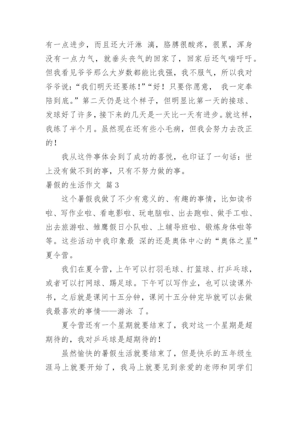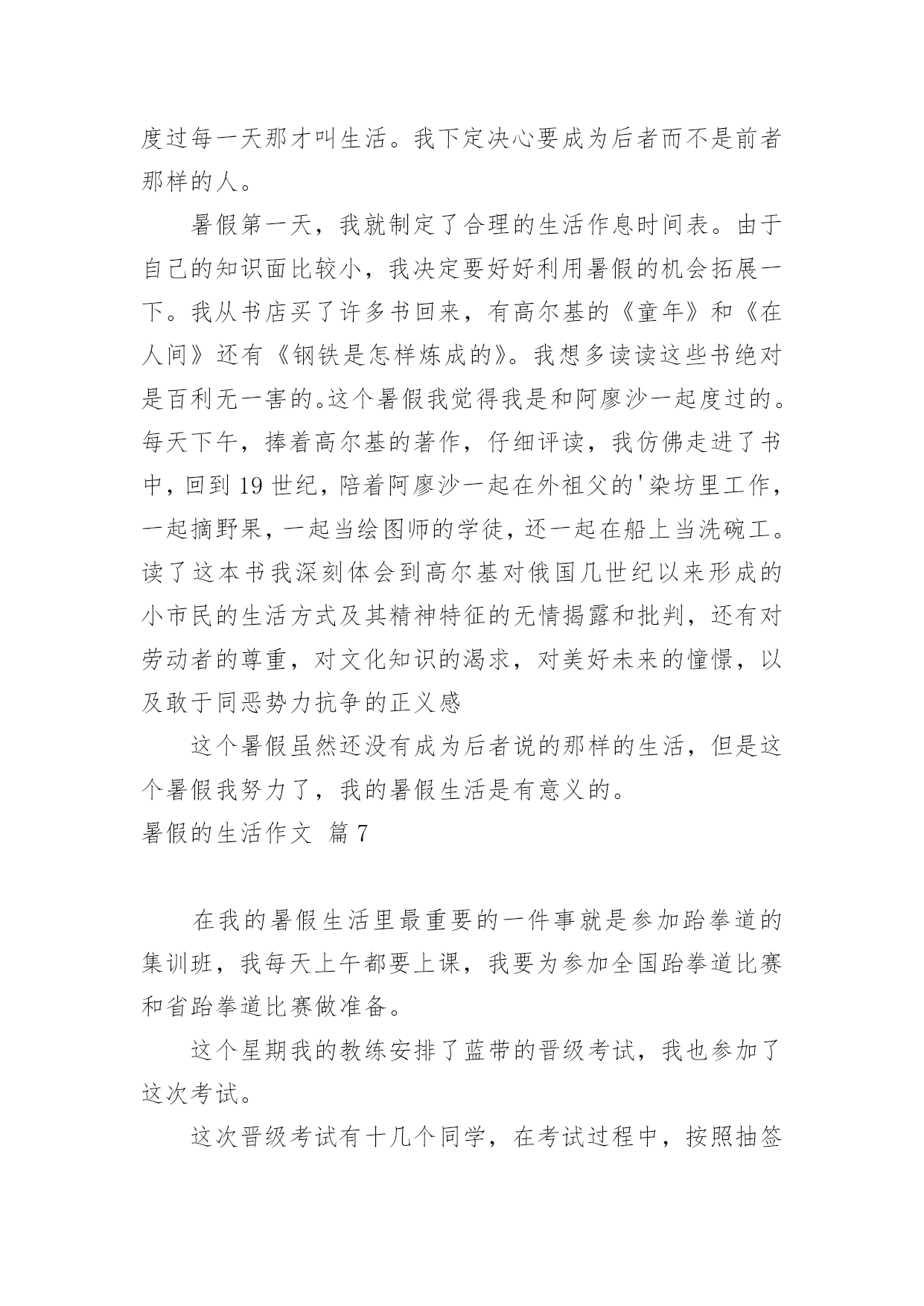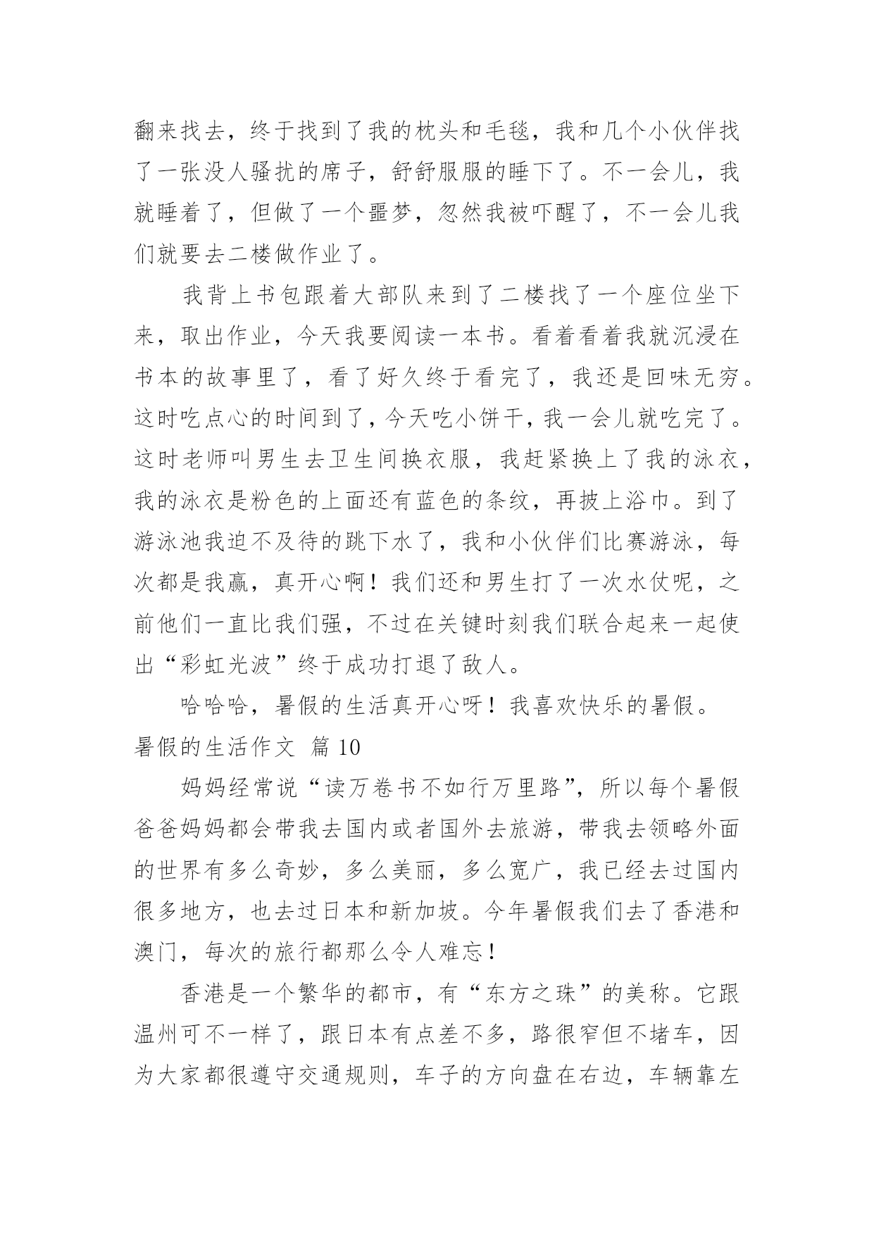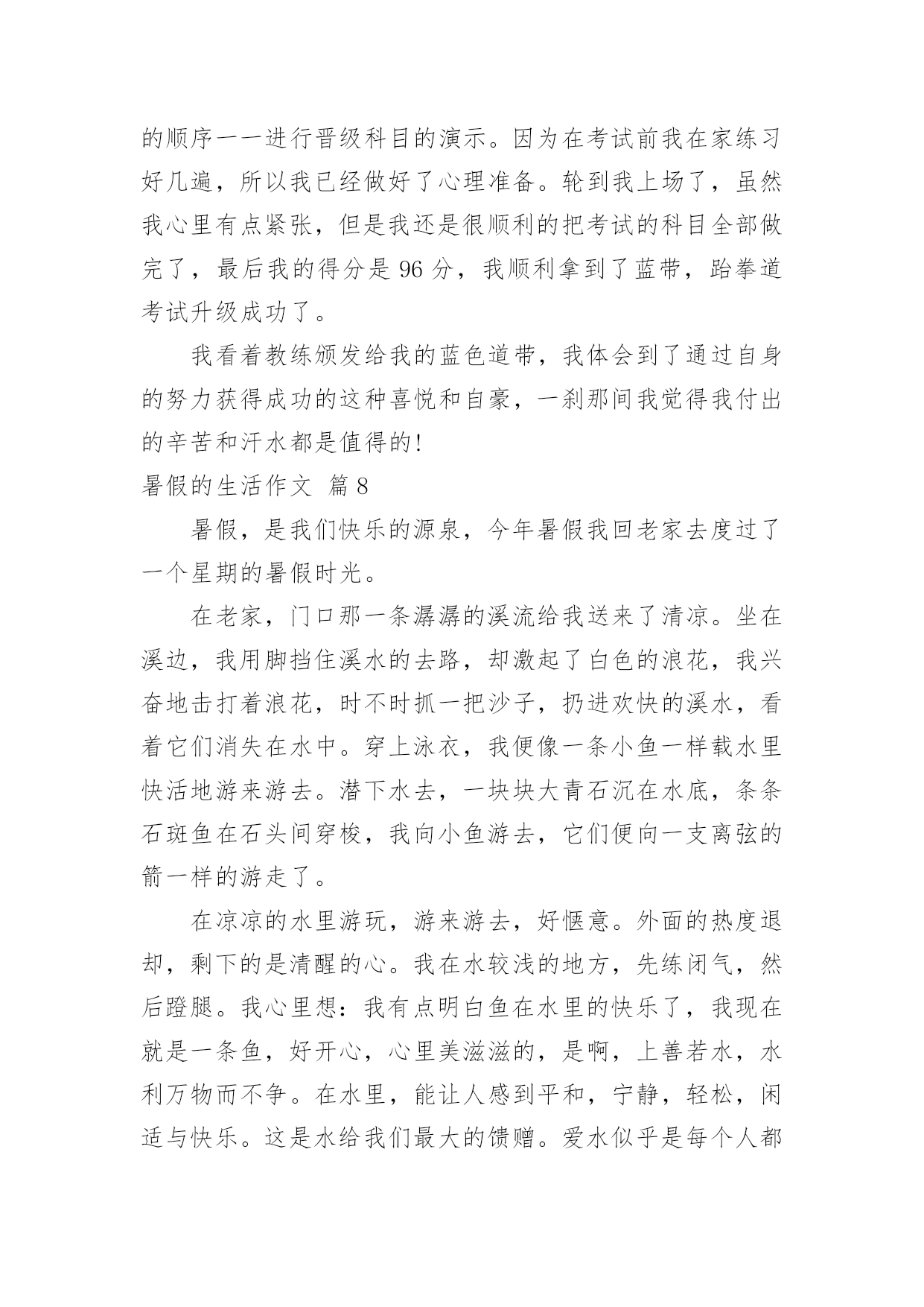 暑假的生活作文【精选】暑假的生活作文10篇在日常学习、工作抑或是生活中,大家都经常接触到作文吧,通过作文可以把我们那些零零散散的思想,聚集在一块。你知道作文怎样才能写的好吗?下面是小编收集整理的暑假的生活作文10篇,仅供参考,大家一起来看看吧。暑假的生活作文篇1在人艺舞台上,《四世同堂》、《茶馆》、《骆驼祥子》……老舍这些脍炙人口的经典名著被一次次搬上舞台,成为经久不衰的保留剧目。在小学课本里,《林海》、《草原》、《猫》……老舍的这些作品陪伴我们度过了整个小学时代。今年暑假,我终于有机会走进老舍纪念馆,近距离地瞻仰和拜访“老舍先生”。老舍纪念馆位于北京市东城区灯市口西街丰富胡同19号。在纪念馆门外的墙上,老舍给自己做出了高度的概括:我是文艺界中的一名小卒,十几年来日日操练在书桌与小凳之间;笔是枪,把热血洒在纸上……看到这些文字,我对老舍先生的敬佩之情油然而生。漫步在老舍纪念馆,通过一张张图片和实物展览,我看到了老舍结交的朋友既有大政治家、名教授,也有老艺人、洋车夫。他会卖衣服为朋友接风,“真”是他的待友之道。展览介绍了老舍先生短暂而又辉煌的一生。咿呀学语时,他就懂得了弱国的悲哀;执教英伦,他能更客观地看待别国和本国的文化;刚踏上文坛,他就开始了对国民性的探讨,寻求强国之道;抗日战争时,他化笔为枪,站在抗战宣传第一线;新中国成立,老舍又义无反顾地回到祖国,回到他热爱的北京。站在老舍先生最后生活的丹柿小院,我仿佛看到了正是这名文艺界中的“小卒”日夜不停、奋笔疾书、写出了最底层平民百姓的生活,写出了劳动大众的呐喊与呼声。老舍先生可以自傲的地方是“小卒心中没有大将的韬略,可是小卒该做的一切我确实是做到了。”面对命运的不公,老舍先生宁折不弯,最后走向了太平湖。世上再无老舍……耳边响起老舍先生借王掌柜留在《茶馆》里的那句“遗言”:“我爱咱们的国呀,可是谁爱我呢?”我会大声地对他说:“我们都爱你,没有人会忘记你。文艺界尽职的‘小卒’永远活在人民心里。”参观老舍纪念馆,这就是我有意义的暑假生活的一部分。暑假的生活作文篇2我的暑假生活丰富多彩:我读了《草房子》、《海蒂》等小说;学会了滑滑板、打羽毛球等:我还陪爷爷奶奶爬了青山呢!在这些活动中,我最喜欢的就是打羽毛球了。因为在学习打羽毛球的过程中,有一段怎么也忘不了的记忆。在开学的前三个星期,我和爷爷一起打羽毛球,因为爷爷体质强,多运动所以我和爷爷一起打。第一天刚开始的时候,我连最基本的发球接球都不会,练了一个多小时,也没有一点进步,而且还大汗淋漓,胳膊很酸疼,很累,浑身没有一点力气,就垂头丧气的回家了,回家后还气喘吁吁。但我看见爷爷那么大岁数都能比我强,我不服气,所以我对爷爷说:“我们明天还要练!”“好!只要你愿意,我一定奉陪到底。”第二天仍是这个样子,但明显比第一天的接球、发球好了许多,接下来的几天是一天比一天有进步。就这样,我练了半个月。虽然现在还有些小毛病,但我会努力去改正的!我从这件事体会到了成功的喜悦,也印证了一句话:世上没有做不到的事,只有不努力做的事。暑假的生活作文篇3这个暑假我做了不少有意义的、有趣的事情,比如读书啦、写作业啦、看电影啦、玩电脑啦、出去跑啦、做手工啦、出去旅游啦、雏鹰假日小队啦、上辅导班啦、锻炼身体啦等等。这些活动中我印象最深的还是奥体中心的“奥体之星”夏令营。我们在夏令营,上午可以打羽毛球、打篮球、打乒乓球,或者可以打网球、踢足球。下午可以写作业,也可以读课外书,之后就是课间十五分钟,课间十五分钟完毕就可以去做我最喜欢的事情——游泳了。夏令营还有一个星期就要结束了,我对这一个星期是超期待的,我对乒乓球是超期待的!虽然愉快的暑假生活就要结束了,但是快乐的五年级生涯马上就要开始了,我马上就要见到亲爱的老师和同学们了!暑假的生活作文篇4今天早上,我和爸爸妈妈去安吉著名的KT猫乐园玩。在路上,我的晕车症不治而愈。一路风光秀丽,山青水秀,尤其是一座巨人般的山,云雾缭绕,犹如一片仙境。到了KT猫乐园,首先映入眼帘的是友谊广场的音乐喷泉,它正热情似火地欢迎我呢!欢乐港湾就像巨形澡盆:我看中漂流,第一次看到小船对面的人“洗澡”;第二次我雨衣没扣紧,可恶的水把我淋了个透心凉,害我换衣服!精灵森林的远古石船更好玩:飞起来的感觉,一阵又一阵欢呼声从船里传来。我就喜欢刺激的。我还看了杂技(贝壳剧场),一个耍帽表演:首先把帽子扔上天,最后帽子落在头上。翻跟头接、跳起来接……最后最搞笑,他们飞快地把别人头上的帽子戴给自己,把手上的帽子给别人。KT猫乐园一个区一种颜色。蒸气王国的褐色、音之村的紫色……今天我玩得开心极了,下次我还要来玩!暑假的生活作文篇5暑假期间我和爸爸来襄樊游玩,襄樊可好玩了!第一天到达襄樊车站时,一下车,我姑姑就和叔叔来接我们,当时,爸爸的经理急着要他带的资料,所以爸