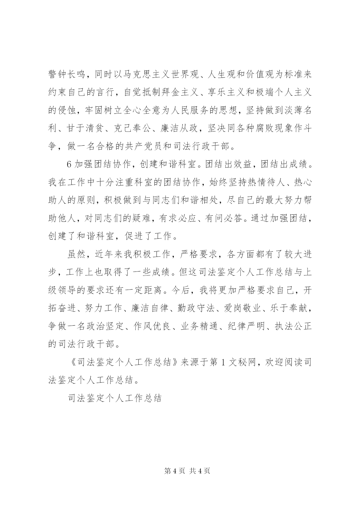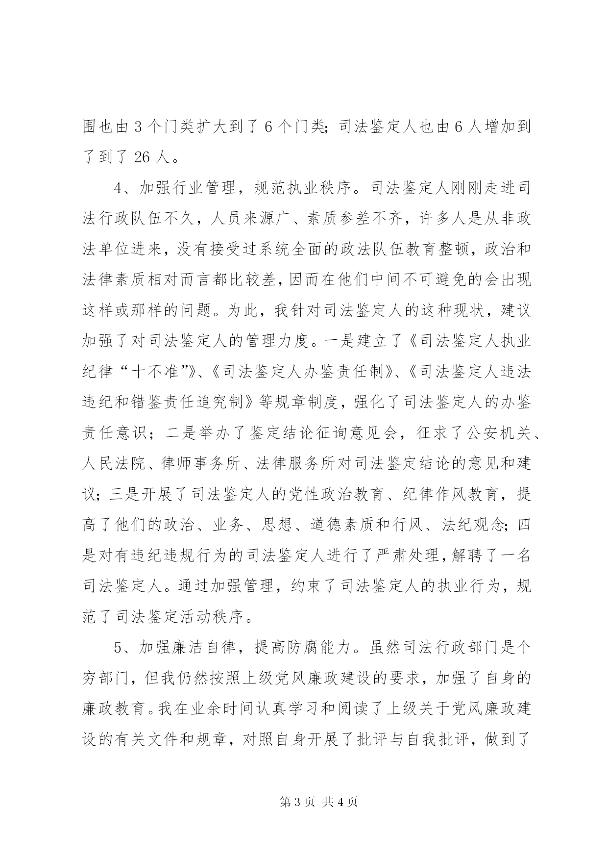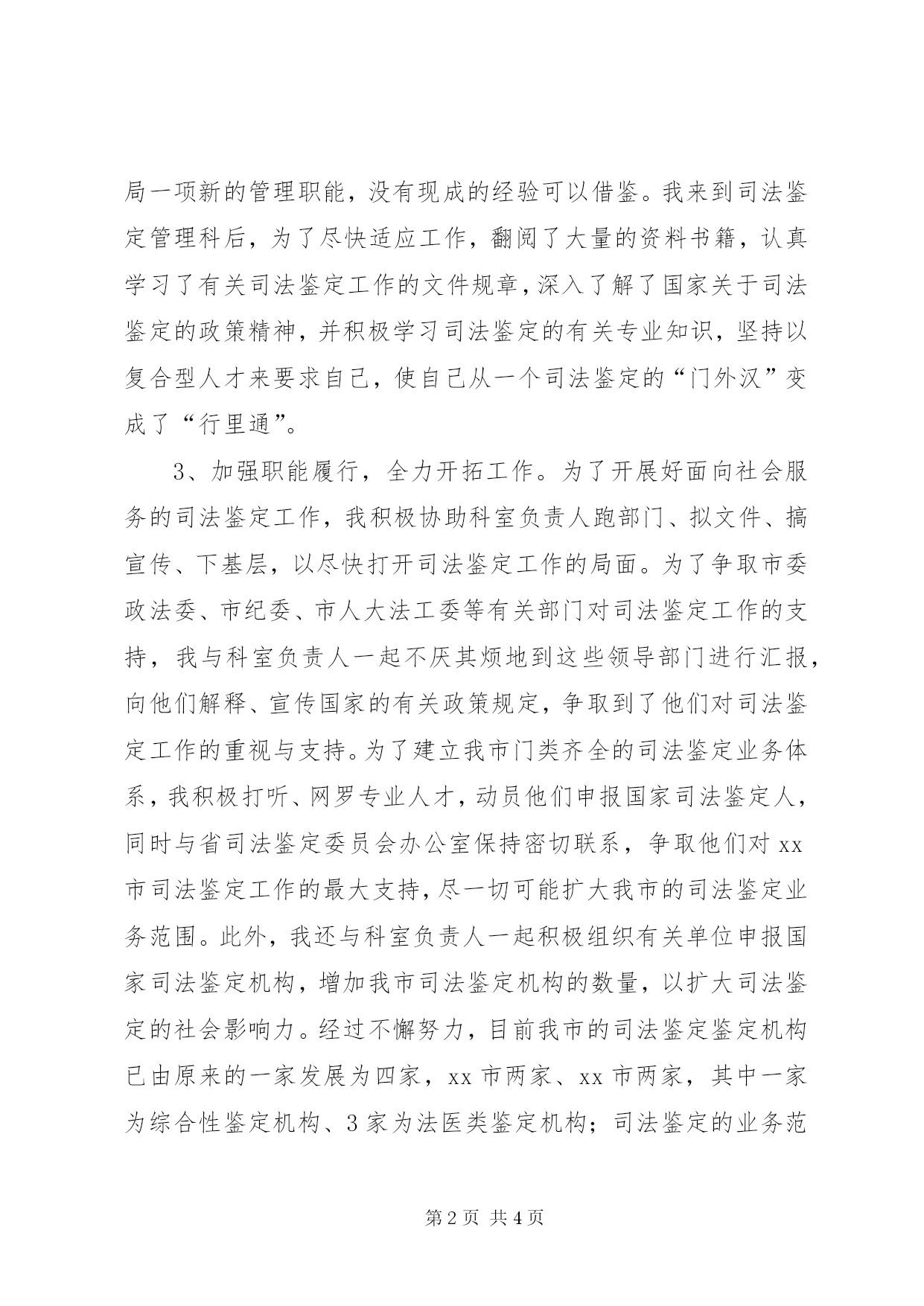第PAGE\*Arabic\*MERGEFORMAT4页共NUMPAGES\*MERGEFORMAT4页司法鉴定个人工作总结个人工作总结近年来,我在各级领导的关心和指导下,坚持以马列主义、毛泽东思想、邓小平理论和“三个代表”重要思想为指导,深入贯彻落实党的路线、方针、政策,以全面建设小康社会、建设社会主义和谐社会和维护社会主义法制为己任,树立科学的发展观、健康的人生观、正确的价值观,力求做到与时俱进、求实创新、开拓奋进,为司法行政工作作出自己应有的职责。具体来说,主要做到了以下几个方面:1、加强理论学习,提高政治素养。近年来,我按照上级的安排部署,积极参加了“三个代表”重要思想学习教育、党员先进性教育、社会主义荣辱观教育、社会主义法治理念教育等学习教育活动。在学习中,我认真阅读理论著作,细心做好学习笔记,深入体会上级精神要求。一年多来,共记学习笔记2万余字,撰写学习心得和体会4篇,同时还参加了全市政法系统举行的社会主义法治理念知识竞赛并获得了三等奖。通过理论学习,进一步提高了自身的政治素质,增强了大局观念和政治责任感、政治敏锐感,坚定了正确的政治方向和政治立场,树立了公平正义、服务大局、执法为民的社会主义法治理念。2、加强业务学习,提升业务水平。2004年10月,我调到司法鉴定管理科工作。管理面向社会服务的司法鉴定工作是司法局一项新的管理职能,没有现成的经验可以借鉴。我来到司法鉴定管理科后,为了尽快适应工作,翻阅了大量的资料书籍,认真学习了有关司法鉴定工作的文件规章,深入了解了国家关于司法鉴定的政策精神,并积极学习司法鉴定的有关专业知识,坚持以复合型人才来要求自己,使自己从一个司法鉴定的“门外汉”变成了“行里通”。3、加强职能履行,全力开拓工作。为了开展好面向社会服务的司法鉴定工作,我积极协助科室负责人跑部门、拟文件、搞宣传、下基层,以尽快打开司法鉴定工作的局面。为了争取市委政法委、市纪委、市人大法工委等有关部门对司法鉴定工作的支持,我与科室负责人一起不厌其烦地到这些领导部门进行汇报,向他们解释、宣传国家的有关政策规定,争取到了他们对司法鉴定工作的重视与支持。为了建立我市门类齐全的司法鉴定业务体系,我积极打听、网罗专业人才,动员他们申报国家司法鉴定人,同时与省司法鉴定委员会办公室保持密切联系,争取他们对xx市司法鉴定工作的最大支持,尽一切可能扩大我市的司法鉴定业务范围。此外,我还与科室负责人一起积极组织有关单位申报国家司法鉴定机构,增加我市司法鉴定机构的数量,以扩大司法鉴定的社会影响力。经过不懈努力,目前我市的司法鉴定鉴定机构已由原来的一家发展为四家,xx市两家、xx市两家,其中一家为综合性鉴定机构、3家为法医类鉴定机构;司法鉴定的业务范围也由3个门类扩大到了6个门类;司法鉴定人也由6人增加到了到了26人。4、加强行业管理,规范执业秩序。司法鉴定人刚刚走进司法行政队伍不久,人员来源广、素质参差不齐,许多人是从非政法单位进来,没有接受过系统全面的政法队伍教育整顿,政治和法律素质相对而言都比较差,因而在他们中间不可避免的会出现这样或那样的问题。为此,我针对司法鉴定人的这种现状,建议加强了对司法鉴定人的管理力度。一是建立了《司法鉴定人执业纪律“十不准”》、《司法鉴定人办鉴责任制》、《司法鉴定人违法违纪和错鉴责任追究制》等规章制度,强化了司法鉴定人的办鉴责任意识;二是举办了鉴定结论征询意见会,征求了公安机关、人民法院、律师事务所、法律服务所对司法鉴定结论的意见和建议;三是开展了司法鉴定人的党性政治教育、纪律作风教育,提高了他们的政治、业务、思想、道德素质和行风、法纪观念;四是对有违纪违规行为的司法鉴定人进行了严肃处理,解聘了一名司法鉴定人。通过加强管理,约束了司法鉴定人的执业行为,规范了司法鉴定活动秩序。5、加强廉洁自律,提高防腐能力。虽然司法行政部门是个穷部门,但我仍然按照上级党风廉政建设的要求,加强了自身的廉政教育。我在业余时间认真学习和阅读了上级关于党风廉政建设的有关文件和规章,对照自身开展了批评与自我批评,做到了警钟长鸣,同时以马克思主义世界观、人生观和价值观为标准来约束自己的言行,自觉抵制拜金主义、享乐主义和极端个人主义的侵蚀,牢固树立全心全意为人民服务的思想,坚持做到淡薄名利、甘于清贫、克己奉公、廉洁从政,坚决同各种腐败现象作斗争,做一名合格的共产党员和司法行政干部。6加强团结协作,创建和谐科室。团结出效益,团结出成绩。我在工作中十分注重科室的团结协作,始终坚持热情待人、热心助人的原则,积极做到与同志们和谐相处,尽自己的最大努力帮助他人,对同志们的疑难,有求必应、有问必答。通过加强团结,创建了和谐科室,促进了工作。虽然,近年来我积极工作,严格要求,各方面都有了较大进步,工作上也取得了一些成绩。但这