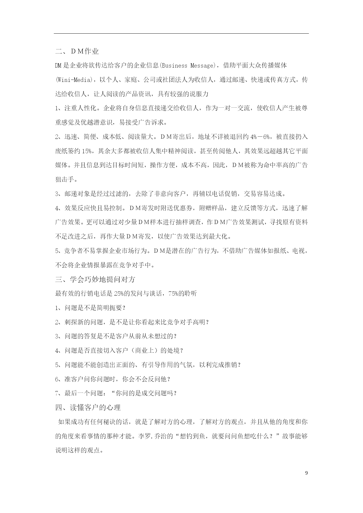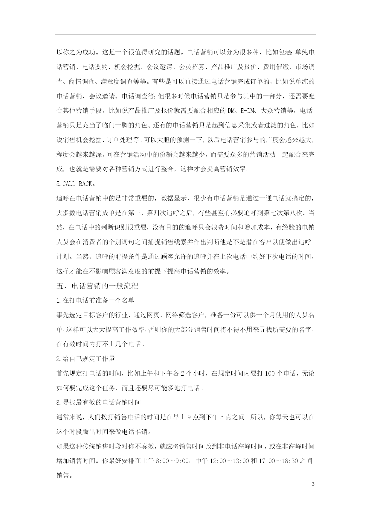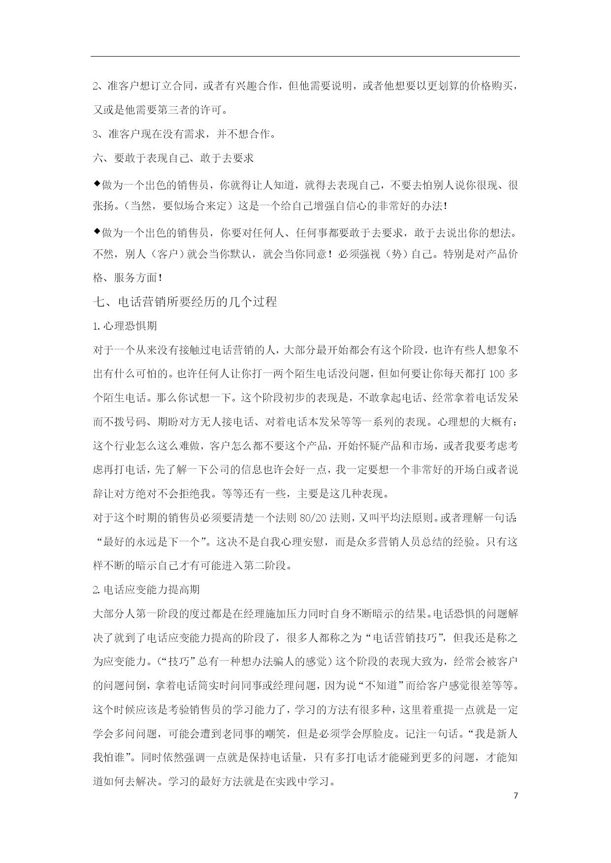 PAGE\*MERGEFORMAT24第一章电话营销概述一、电话营销的定义电话营销(TelemarketingTMK)是一个较新的概念,有的专家认为出现于20世纪80年代的HYPERLINK"http://baike.baidu.com/view/2398.htm"\t"_blank"美国。随着电话营销流程消费者为主导的市场的形成,以及电话、传真等通信手段的普及,很多企业开始尝试这种新型的市场手法。电话营销的定义为:通过使用HYPERLINK"http://baike.baidu.com/view/3248.htm"\t"_blank"电话,来实现有计划、有组织并且高效率地扩大顾客群、提高顾客满意度、维护老顾客等市场行为的手法。成功的电话营销应该使电话双方都能体会到电话营销的价值。电话营销是营销的一种方式,电话是一个沟通交流的一个平台跟工具。与电话HYPERLINK"http://baike.baidu.com/view/3905.htm"\t"_blank"营销相关的词汇很多,HYPERLINK"http://baike.baidu.com/view/1365634.htm"\t"_blank"直接销售(DirectMarketing)、HYPERLINK"http://baike.baidu.com/view/24338.htm"\t"_blank"数据库营销(DatabaseMarketing)、HYPERLINK"http://baike.baidu.com/view/710697.htm"\t"_blank"一对一营销(OnetooneMarketing)、HYPERLINK"http://baike.baidu.com/view/121668.htm"\t"_blank"呼叫中心(CallCenter)、HYPERLINK"http://baike.baidu.com/view/388939.htm"\t"_blank"客户服务HYPERLINK"http://baike.baidu.com/view/189170.htm"\t"_blank"中心(CustomServiceCenter)等等都是其涵盖的内容。这些技术侧重的方面各有不同,但目的都是一样的,即充分利用当今先进的通信计算机技术,为企业创造商机,增加收益。二、电话营销的相关理论电话营销是有计划、有组织的活动,决不等于随机的打出大量电话,靠碰运气去推销出几样产品。1.电话营销的三个阶段第一个阶段就是引发兴趣。引发电话线另一端潜在客户的足够兴趣,是销售成功的基础阶段。在没有兴趣的情况下是没有任何HYPERLINK"http://baike.baidu.com/view/54544.htm"\t"_blank"机会,也是没有任何意义来介绍要销售的产品的。这个阶段需要的技能是对话题的掌握和运用。第二个阶段就是获得信任。在最短时间内获得一个陌生人的信任是需要高超的技能,以及比较成熟的个性的,只有在这个信任的基础上开始销售,才有可能达到销售的最后目的——签约。这个阶段需要的技能就是获得信任的具体方法和有效起到顾问作用争取待业权威的位置来有效地赢得潜在客户的信任。第三个阶段就是有利润的合约。只有在有效地获得潜在客户对自己问题的清醒的认识前提下的销售才是有利润的销售,也才是企业真正要追求的目标。这个阶段需要的技能则是异议防范和预测、有效谈判技巧、预见潜在问题的能力等。2.电话营销中的4C定义电话营销中的4C也是必须要了解的,4C本身不是实施技巧,4C是实施技巧的一个标准流程,经验不足的电话HYPERLINK"http://baike.baidu.com/view/3483744.htm"\t"_blank"销售人员可以在初期的时候按照这个HYPERLINK"http://baike.baidu.com/view/3488096.htm"\t"_blank"销售流程执行,熟练以后一般就忘记了这个流程,但是销售实力却不知不觉地明显提高了。4C的流程是这样的,迷茫客户(CONFUSE),唤醒客户(CLEAR)、安抚客户(COMFORT)、签约客户(CONTRACT)。第一个C是应用在第一阶段的,第二、第三个C是应用在第二阶段的,第四个C是应用在第三阶段的。3.电话营销中的FABE法则FABE法则:F-特征A-优点B-利益E-数据证明三、电话营销的种类按照电话营销的目的来分,分为主动类型的电话营销(Outbound),如销售类型、市场调查类型等和被动类型的电话营销(Inbound),如售后服务类型。按照电话营销的系统来分,分为呼叫中心平台类型的电话营销和企