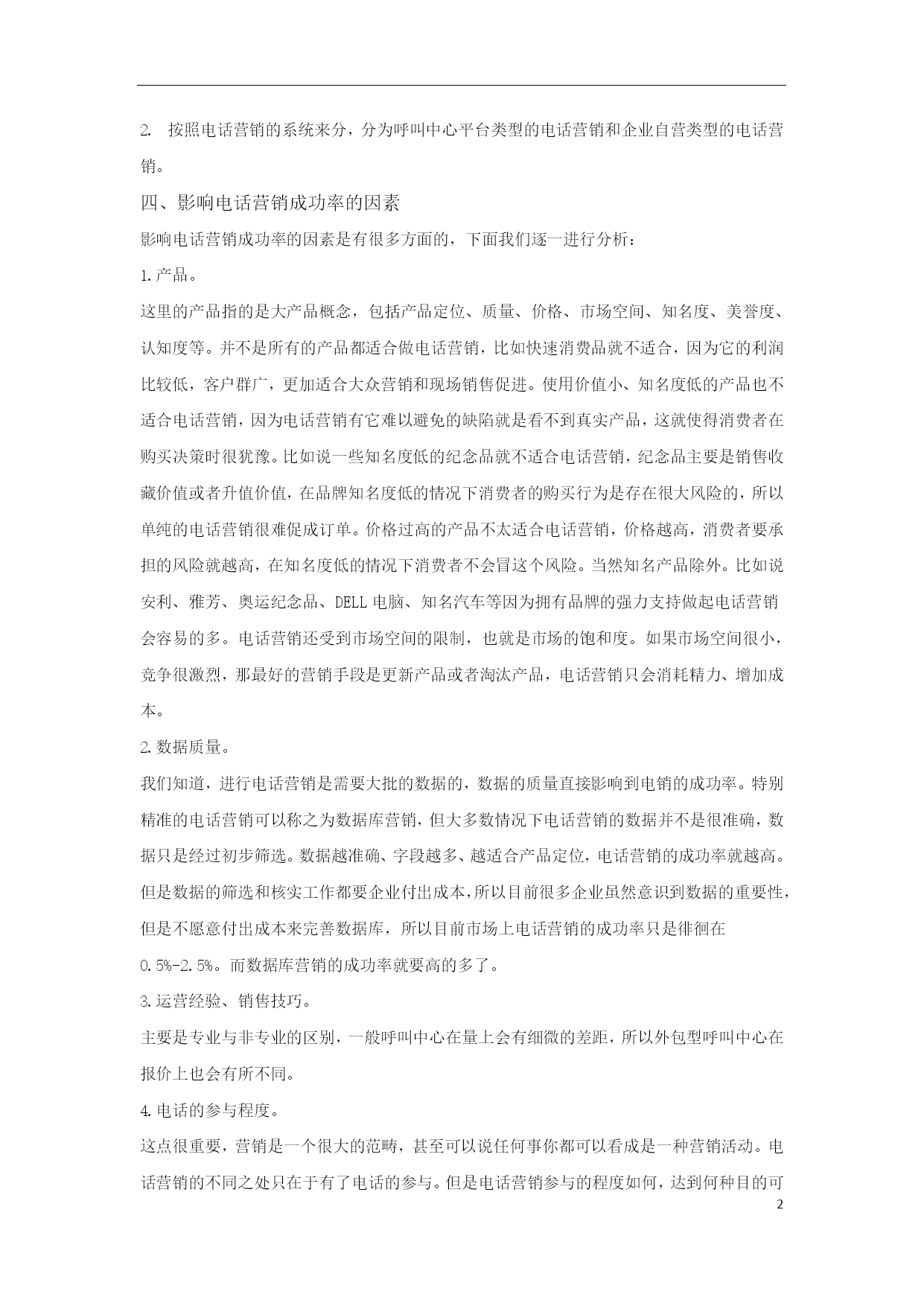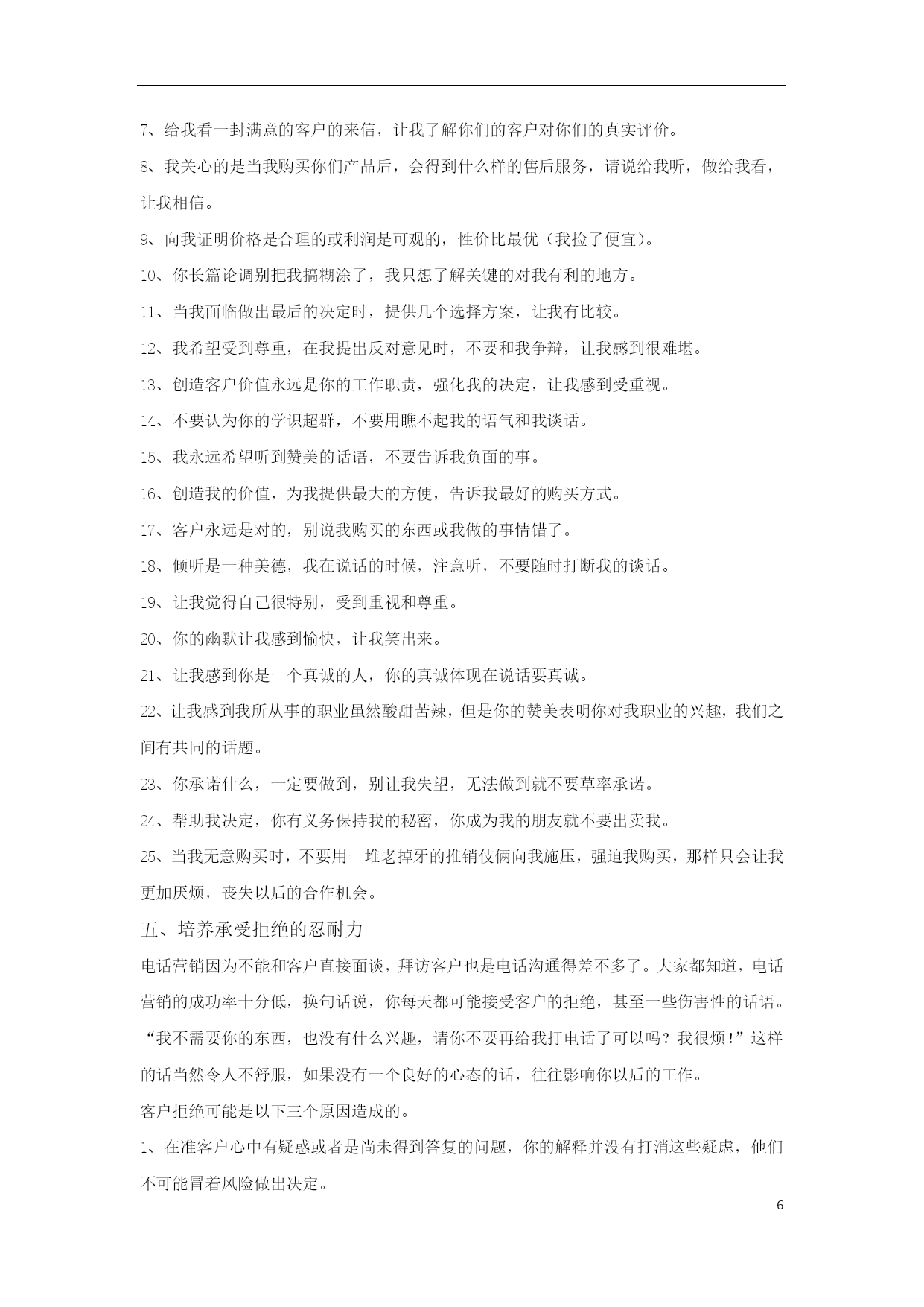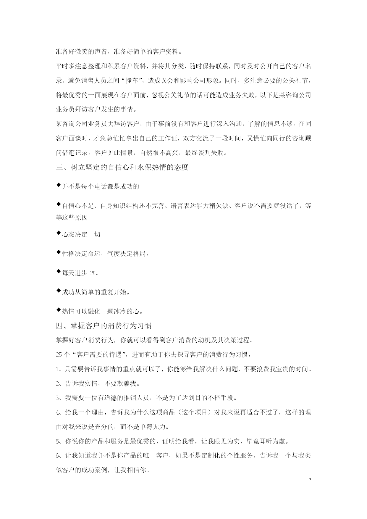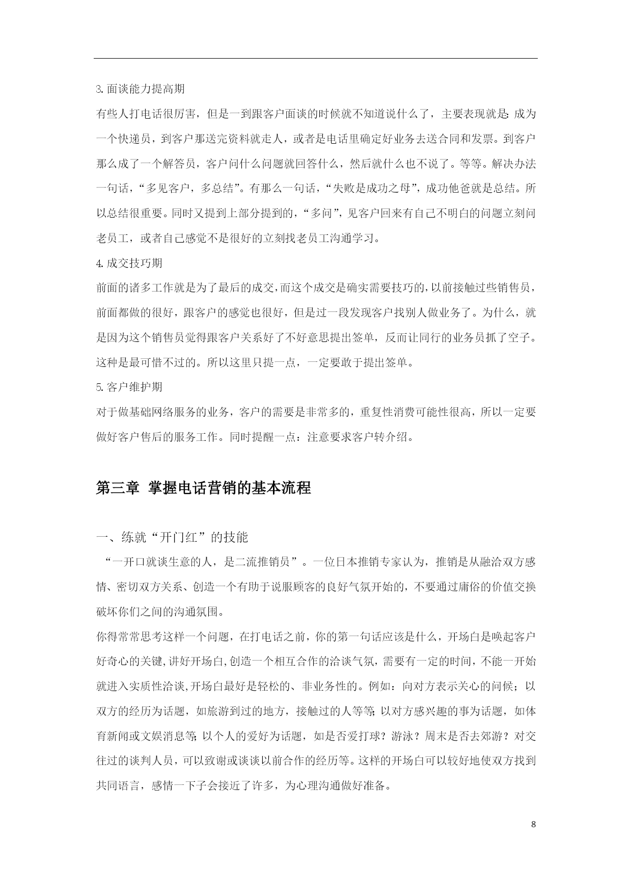 PAGE\*MERGEFORMAT24第一章电话营销概述一、电话营销的定义电话营销(TelemarketingTMK)是一个较新的概念,有的专家认为出现于20世纪80年代的HYPERLINK"http://baike.baidu.com/view/2398.htm"\t"_blank"美国。随着电话营销流程消费者为主导的市场的形成,以及电话、传真等通信手段的普及,很多企业开始尝试这种新型的市场手法。电话营销的定义为:通过使用HYPERLINK"http://baike.baidu.com/view/3248.htm"\t"_blank"电话,来实现有计划、有组织并且高效率地扩大顾客群、提高顾客满意度、维护老顾客等市场行为的手法。成功的电话营销应该使电话双方都能体会到电话营销的价值。电话营销是营销的一种方式,电话是一个沟通交流的一个平台跟工具。与电话HYPERLINK"http://baike.baidu.com/view/3905.htm"\t"_blank"营销相关的词汇很多,HYPERLINK"http://baike.baidu.com/view/1365634.htm"\t"_blank"直接销售(DirectMarketing)、HYPERLINK"http://baike.baidu.com/view/24338.htm"\t"_blank"数据库营销(DatabaseMarketing)、HYPERLINK"http://baike.baidu.com/view/710697.htm"\t"_blank"一对一营销(OnetooneMarketing)、HYPERLINK"http://baike.baidu.com/view/121668.htm"\t"_blank"呼叫中心(CallCenter)、HYPERLINK"http://baike.baidu.com/view/388939.htm"\t"_blank"客户服务HYPERLINK"http://baike.baidu.com/view/189170.htm"\t"_blank"中心(CustomServiceCenter)等等都是其涵盖的内容。这些技术侧重的方面各有不同,但目的都是一样的,即充分利用当今先进的通信计算机技术,为企业创造商机,增加收益。二、电话营销的相关理论电话营销是有计划、有组织的活动,决不等于随机的打出大量电话,靠碰运气去推销出几样产品。1.电话营销的三个阶段第一个阶段就是引发兴趣。引发电话线另一端潜在客户的足够兴趣,是销售成功的基础阶段。在没有兴趣的情况下是没有任何HYPERLINK"http://baike.baidu.com/view/54544.htm"\t"_blank"机会,也是没有任何意义来介绍要销售的产品的。这个阶段需要的技能是对话题的掌握和运用。第二个阶段就是获得信任。在最短时间内获得一个陌生人的信任是需要高超的技能,以及比较成熟的个性的,只有在这个信任的基础上开始销售,才有可能达到销售的最后目的——签约。这个阶段需要的技能就是获得信任的具体方法和有效起到顾问作用争取待业权威的位置来有效地赢得潜在客户的信任。第三个阶段就是有利润的合约。只有在有效地获得潜在客户对自己问题的清醒的认识前提下的销售才是有利润的销售,也才是企业真正要追求的目标。这个阶段需要的技能则是异议防范和预测、有效谈判技巧、预见潜在问题的能力等。2.电话营销中的4C定义电话营销中的4C也是必须要了解的,4C本身不是实施技巧,4C是实施技巧的一个标准流程,经验不足的电话HYPERLINK"http://baike.baidu.com/view/3483744.htm"\t"_blank"销售人员可以在初期的时候按照这个HYPERLINK"http://baike.baidu.com/view/3488096.htm"\t"_blank"销售流程执行,熟练以后一般就忘记了这个流程,但是销售实力却不知不觉地明显提高了。4C的流程是这样的,迷茫客户(CONFUSE),唤醒客户(CLEAR)、安抚客户(COMFORT)、签约客户(CONTRACT)。第一个C是应用在第一阶段的,第二、第三个C是应用在第二阶段的,第四个C是应用在第三阶段的。3.电话营销中的FABE法则FABE法则:F-特征A-优点B-利益E-数据证明三、电话营销的种类按照电话营销的目的来分,分为主动类型的电话营销(Outbound),如销售类型、市场调查类型等和被动类型的电话营销(Inbound),如售后服务类型。按照电话营销的系统来分,分为呼叫中心平台类型的电话营销和企