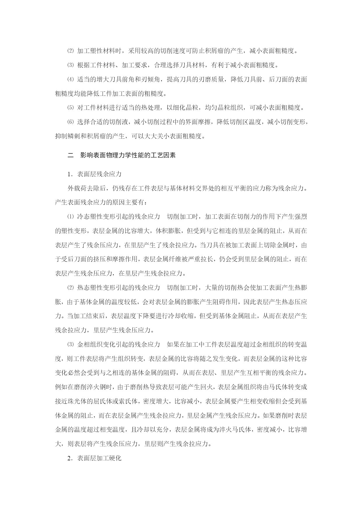 影响机械加工表面质量的工艺因素一影响机械加工表面粗糙度的因素及降低表面粗糙度的工艺措施⒈影响切削加工表面粗糙度的因素在切削加工中,影响已加工表面粗糙度的因素主要包括几何因素、物理因素和加工中工艺系统的振动。下面以车削为例来说明。=1\*GB2⑴几何因素切削加工时表面粗糙度的值主要取决于切削面积的残留高度。下面两式为车削时残留面积高度的计算公式:当刀尖圆弧半径rε=0时,残留面积高度H为(3—1)当刀尖圆弧rε>0时,残留面积高度H为(3—2)从上面两式可知,进给量f、主偏角kr、副偏角kr’和刀尖圆弧半径rε对切削加工表面粗糙度的影响较大。减小进给量f、减小主偏角kr和副偏角kr’、增大刀尖圆弧半径rε,都能减小残留面积的高度H,也就减小了零件的表面粗糙度。=2\*GB2⑵物理因素在切削加工过程中,刀具对工件的挤压和摩擦使金属材料发生塑性变形,引起原有的残留面积扭曲或沟纹加深,增大表面粗糙度。当采用中等或中等偏低的切削速度切削塑性材料时,在前刀面上容易形成硬度很高的积屑瘤,它可以代替刀具进行切削,但状态极不稳定,积屑瘤生成、长大和脱落将严重影响加工表面的表面粗糙度值。另外,在切削过程中由于切屑和前刀面的强烈摩擦作用以及撕裂现象,还可能在加工表面上产生鳞刺,使加工表面的粗糙度增加。⑶动态因素——振动的影响在加工过程中,工艺系统有时会发生振动,即在刀具与工件间出现的除切削运动之外的另一种周期性的相对运动。振动的出现会使加工表面出现波纹,增大加工表面的粗糙度,强烈的振动还会使切削无法继续下去。除上述因素外,造成已加工表面粗糙不平的原因还有被切屑拉毛和划伤等。2.减小表面粗糙度的工艺措施=1\*GB2⑴在精加工时,应选择较小的进给量f、较小的主偏角kr和副偏角kr’、较大的刀尖圆弧半径rε,以得到较小的表面粗糙度。=2\*GB2⑵加工塑性材料时,采用较高的切削速度可防止积屑瘤的产生,减小表面粗糙度。=3\*GB2⑶根据工件材料、加工要求,合理选择刀具材料,有利于减小表面粗糙度。⑷适当的增大刀具前角和刃倾角,提高刀具的刃磨质量,降低刀具前、后刀面的表面粗糙度均能降低工件加工表面的粗糙度。⑸对工件材料进行适当的热处理,以细化晶粒,均匀晶粒组织,可减小表面粗糙度。=6\*GB2⑹选择合适的切削液,减小切削过程中的界面摩擦,降低切削区温度,减小切削变形,抑制鳞刺和积屑瘤的产生,可以大大关小表面粗糙度。二影响表面物理力学性能的工艺因素1.表面层残余应力外载荷去除后,仍残存在工件表层与基体材料交界处的相互平衡的应力称为残余应力。产生表面残余应力的原因主要有:=1\*GB2⑴冷态塑性变形引起的残余应力切削加工时,加工表面在切削力的作用下产生强烈的塑性变形,表层金属的比容增大,体积膨胀,但受到与它相连的里层金属的阻止,从而在表层产生了残余压应力,在里层产生了残余拉应力。当刀具在被加工表面上切除金属时,由于受后刀面的挤压和摩擦作用,表层金属纤维被严重拉长,仍会受到里层金属的阻止,而在表层产生残余压应力,在里层产生残余拉应力。=2\*GB2⑵热态塑性变形引起的残余应力切削加工时,大量的切削热会使加工表面产生热膨胀,由于基体金属的温度较低,会对表层金属的膨胀产生阻碍作用,因此表层产生热态压应力。当加工结束后,表层温度下降要进行冷却收缩,但受到基体金属阻止,从而在表层产生残余拉应力,里层产生残余压应力。=3\*GB2⑶金相组织变化引起的残余应力如果在加工中工件表层温度超过金相组织的转变温度,则工件表层将产生组织转变,表层金属的比容将随之发生变化,而表层金属的这种比容变化必然会受到与之相连的基体金属的阻碍,从而在表层、里层产生互相平衡的残余应力。例如在磨削淬火钢时,由于磨削热导致表层可能产生回火,表层金属组织将由马氏体转变成接近珠光体的屈氏体或索氏体,密度增大,比容减小,表层金属要产生相变收缩但会受到基体金属的阻止,而在表层金属产生残余拉应力,里层金属产生残余压应力。如果磨削时表层金属的温度超过相变温度,且冷却以充分,表层金属将成为淬火马氏体,密度减小,比容增大,则表层将产生残余压应力,里层则产生残余拉应力。2.表面层加工硬化=1\*GB2⑴加工硬化的产生及衡量指标机械加工过程中,工件表层金属在切削力的作用下产生强烈的塑性变形,金属的晶格扭曲,晶粒被拉长、纤维化甚至破碎而引起表层金属的强度和硬度增加,塑性降低,这种现象称为加工硬化(或冷作硬化)。另外,加工过程中产生的切削热会使得工件表层金属温度升高,当升高到一定程度时,会使得已强化的金属回复到正常状态,失去其在加工硬化中得到的物理力学性能,这种现象称为软化。因此,金属的加工硬化实际取决于硬化速度