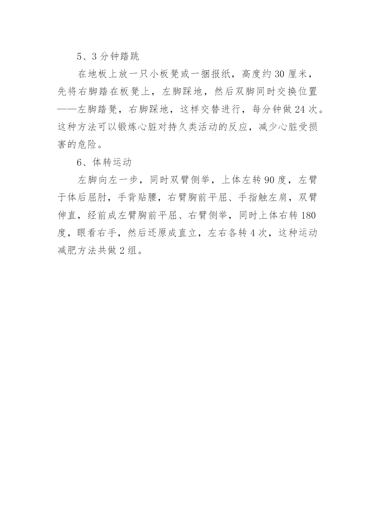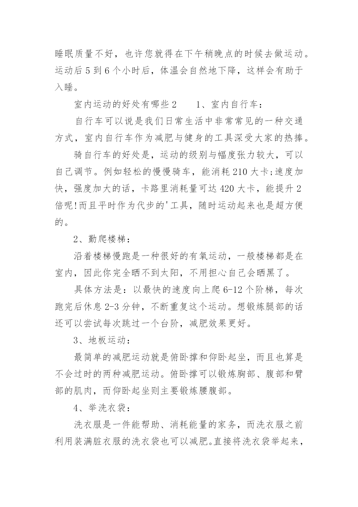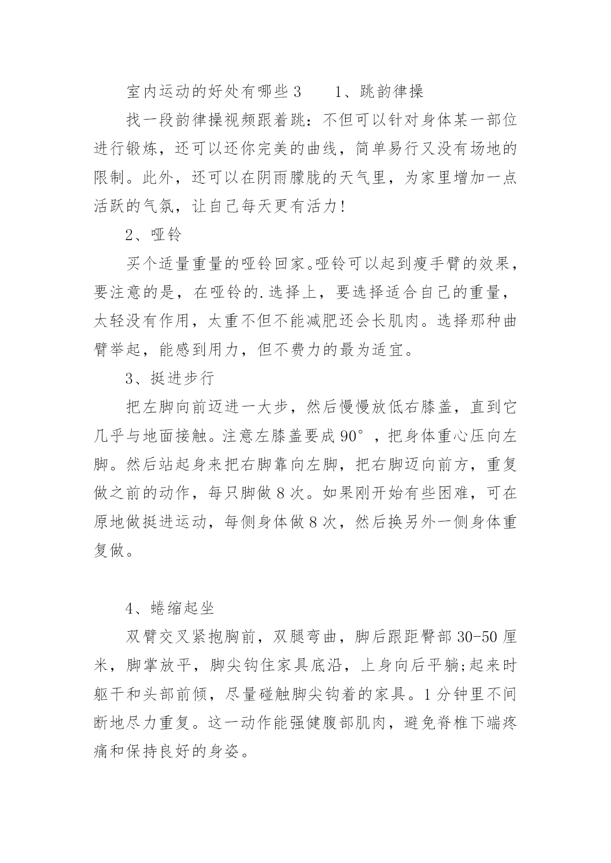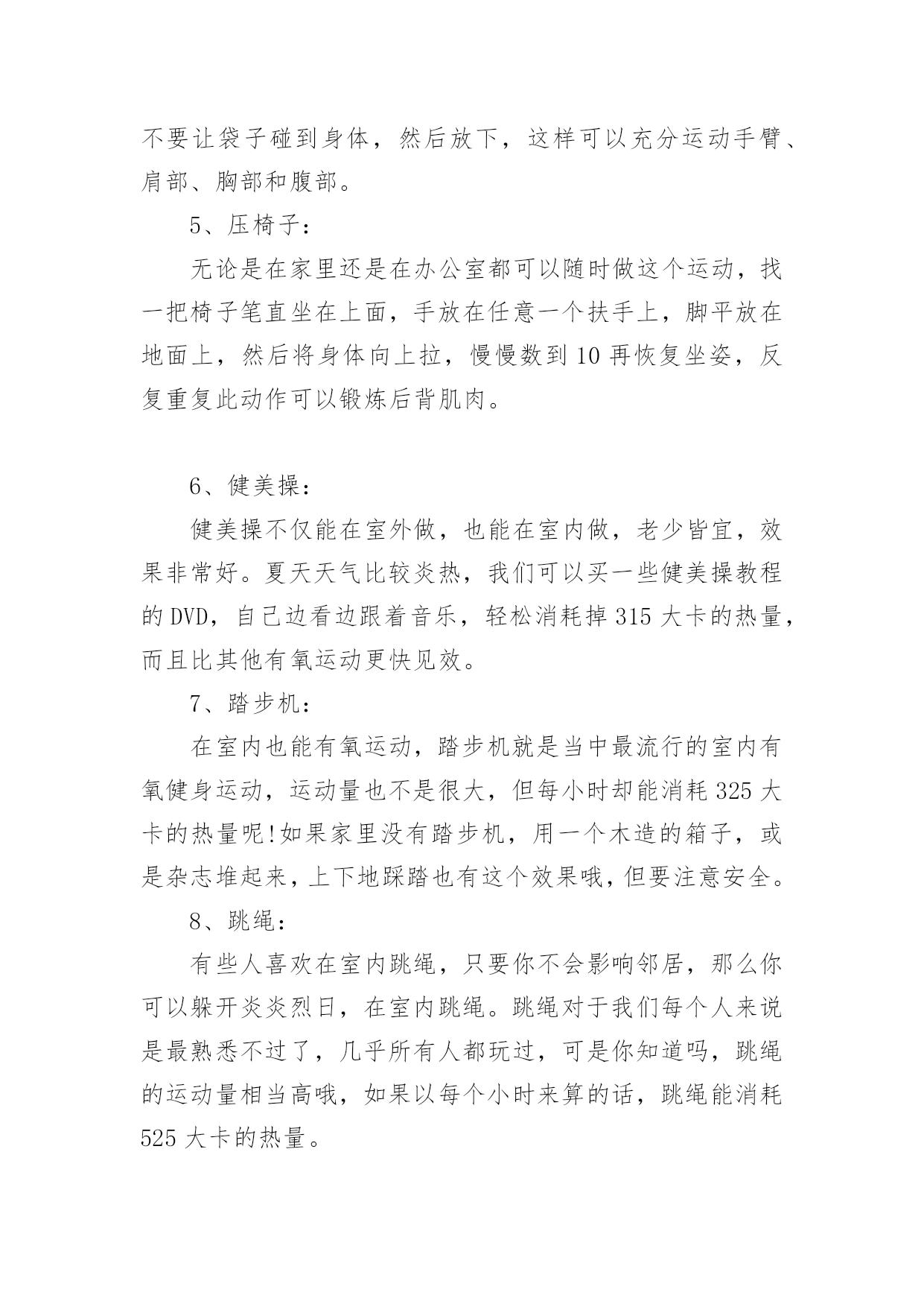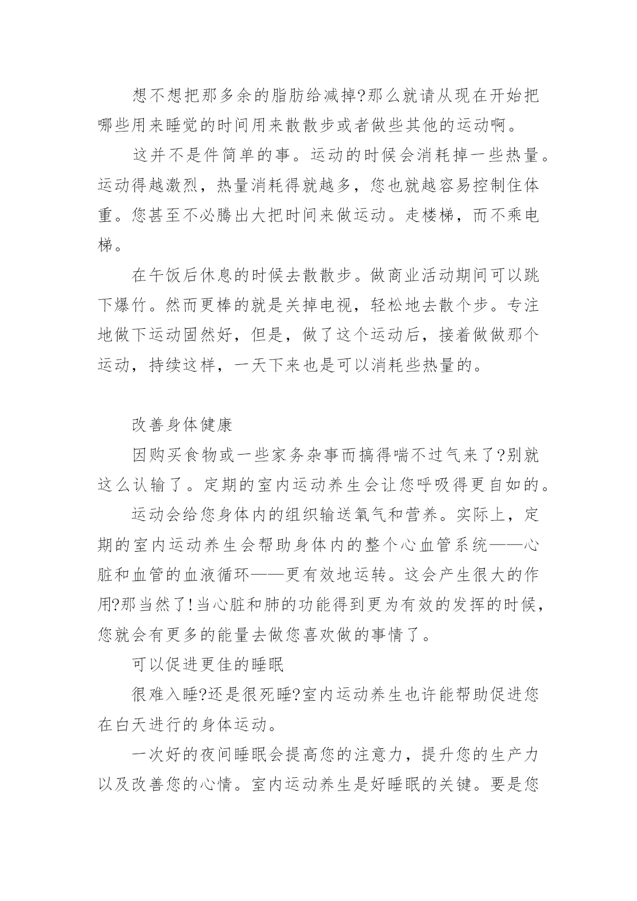 室内运动的好处有哪些抗击慢性疾病、制住体重、改善身体健康等。室内运动的好处有哪些1室内运动的好处改善您的心情度过了紧张的一天,您想消耗掉多余的能量吗?来个室内运动养生,去体育馆做下练习或悠闲地散个30分钟的步会有助于您冷静下来。室内运动养生可以刺激多种大脑化学物质的产生,这些化学物质会让您感到比室内运动养生前要快乐得多也轻松得多。要是您定期地进行室内运动养生,您也会变得好看点,感觉也舒服点,定期室内运动养生可以增强您的自信心和自尊心。室内运动养生甚至会减少您身上的压力和焦虑的感觉。抗击慢性疾病你还在担心心脏病吗?是不是希望能够避免骨质疏松的.出现?那么室内运动或许真的能够帮助到您哦。定期运动可以帮助您防止——或控制——高血压的出现。您的胆固醇水平也会因此而受益。经常运动,高密度脂蛋白(HDL)或“有益”胆固醇会增高,而低密度脂蛋白(LDL)或“有害”胆固醇则会减少。通过减少动脉内斑块的集结,这一“组合拳出击”会血液流动得更为顺利。还有,定期室内运动养生也可以帮助防止2型糖尿病、骨质疏松症和某些种类癌症的出现。制住体重想不想把那多余的脂肪给减掉?那么就请从现在开始把哪些用来睡觉的时间用来散散步或者做些其他的运动啊。这并不是件简单的事。运动的时候会消耗掉一些热量。运动得越激烈,热量消耗得就越多,您也就越容易控制住体重。您甚至不必腾出大把时间来做运动。走楼梯,而不乘电梯。在午饭后休息的时候去散散步。做商业活动期间可以跳下爆竹。然而更棒的就是关掉电视,轻松地去散个步。专注地做下运动固然好,但是,做了这个运动后,接着做做那个运动,持续这样,一天下来也是可以消耗些热量的。改善身体健康因购买食物或一些家务杂事而搞得喘不过气来了?别就这么认输了。定期的室内运动养生会让您呼吸得更自如的。运动会给您身体内的组织输送氧气和营养。实际上,定期的室内运动养生会帮助身体内的整个心血管系统——心脏和血管的血液循环——更有效地运转。这会产生很大的作用?那当然了!当心脏和肺的功能得到更为有效的发挥的时候,您就会有更多的能量去做您喜欢做的事情了。可以促进更佳的睡眠很难入睡?还是很死睡?室内运动养生也许能帮助促进您在白天进行的身体运动。一次好的夜间睡眠会提高您的注意力,提升您的生产力以及改善您的心情。室内运动养生是好睡眠的关键。要是您睡眠质量不好,也许您就得在下午稍晚点的时候去做运动。运动后5到6个小时后,体温会自然地下降,这样会有助于入睡。室内运动的好处有哪些21、室内自行车:自行车可以说是我们日常生活中非常常见的一种交通方式,室内自行车作为减肥与健身的工具深受大家的热捧。骑自行车的好处是,运动的级别与幅度张力较大,可以自己调节。例如轻松的慢慢骑车,能消耗210大卡;速度加快,强度加大的话,卡路里消耗量可达420大卡,能提升2倍呢!而且平时作为代步的'工具,随时运动起来也是超方便的。2、勤爬楼梯:沿着楼梯慢跑是一种很好的有氧运动,一般楼梯都是在室内,因此你完全晒不到太阳,不用担心自己会晒黑了。具体方法是:以最快的速度向上爬6-12个阶梯,每次跑完后休息2-3分钟,不断重复这个运动。想锻炼腿部的话还可以尝试每次跳过一个台阶,减肥效果更好。3、地板运动:最简单的减肥运动就是俯卧撑和仰卧起坐,而且也算是不会过时的两种减肥运动。俯卧撑可以锻炼胸部、腹部和臂部的肌肉,而仰卧起坐则主要锻炼腰腹部。4、举洗衣袋:洗衣服是一件能帮助、消耗能量的家务,而洗衣服之前利用装满脏衣服的洗衣袋也可以减肥。直接将洗衣袋举起来,不要让袋子碰到身体,然后放下,这样可以充分运动手臂、肩部、胸部和腹部。5、压椅子:无论是在家里还是在办公室都可以随时做这个运动,找一把椅子笔直坐在上面,手放在任意一个扶手上,脚平放在地面上,然后将身体向上拉,慢慢数到10再恢复坐姿,反复重复此动作可以锻炼后背肌肉。6、健美操:健美操不仅能在室外做,也能在室内做,老少皆宜,效果非常好。夏天天气比较炎热,我们可以买一些健美操教程的DVD,自己边看边跟着音乐,轻松消耗掉315大卡的热量,而且比其他有氧运动更快见效。7、踏步机:在室内也能有氧运动,踏步机就是当中最流行的室内有氧健身运动,运动量也不是很大,但每小时却能消耗325大卡的热量呢!如果家里没有踏步机,用一个木造的箱子,或是杂志堆起来,上下地踩踏也有这个效果哦,但要注意安全。8、跳绳:有些人喜欢在室内跳绳,只要你不会影响邻居,那么你可以躲开炎炎烈日,在室内跳绳。跳绳对于我们每个人来说是最熟悉不过了,几乎所有人都玩过,可是你知道吗,跳绳的运动量相当高哦,如果以每个小时来算的话,跳绳能消耗525大卡的热量。室内运动的好处有哪些31、跳韵律操找一段韵律操视频跟着跳:不但可以针对身体某一部位进行锻炼,还可以还你完美的曲线,简单易行又没有场地的限制。此外,还可以在阴雨朦胧的天