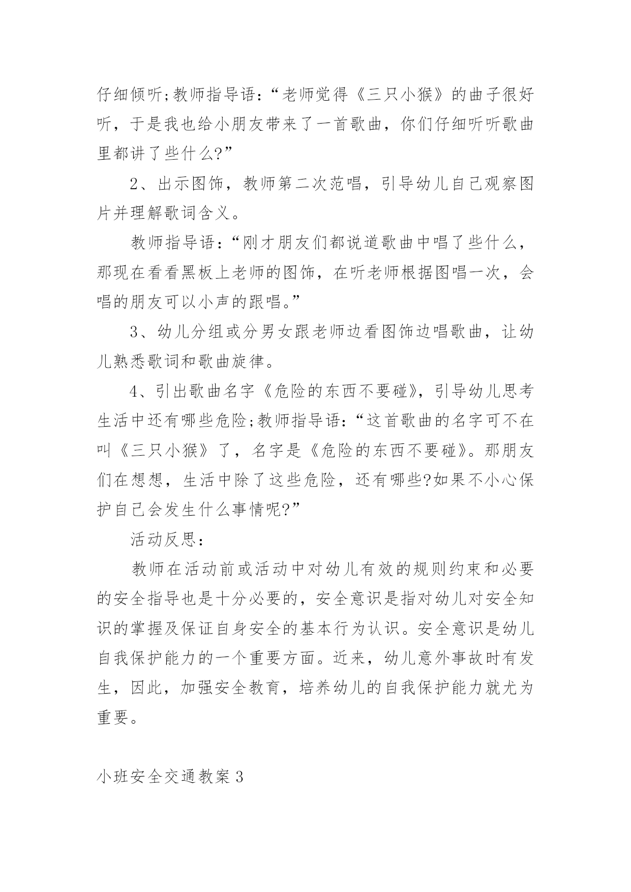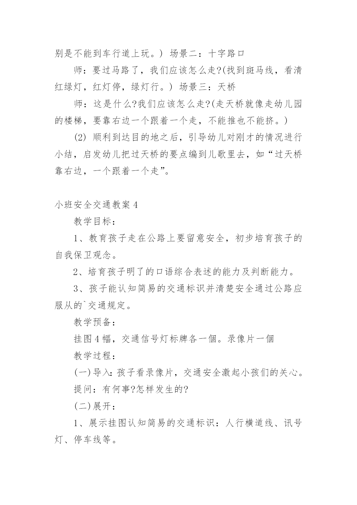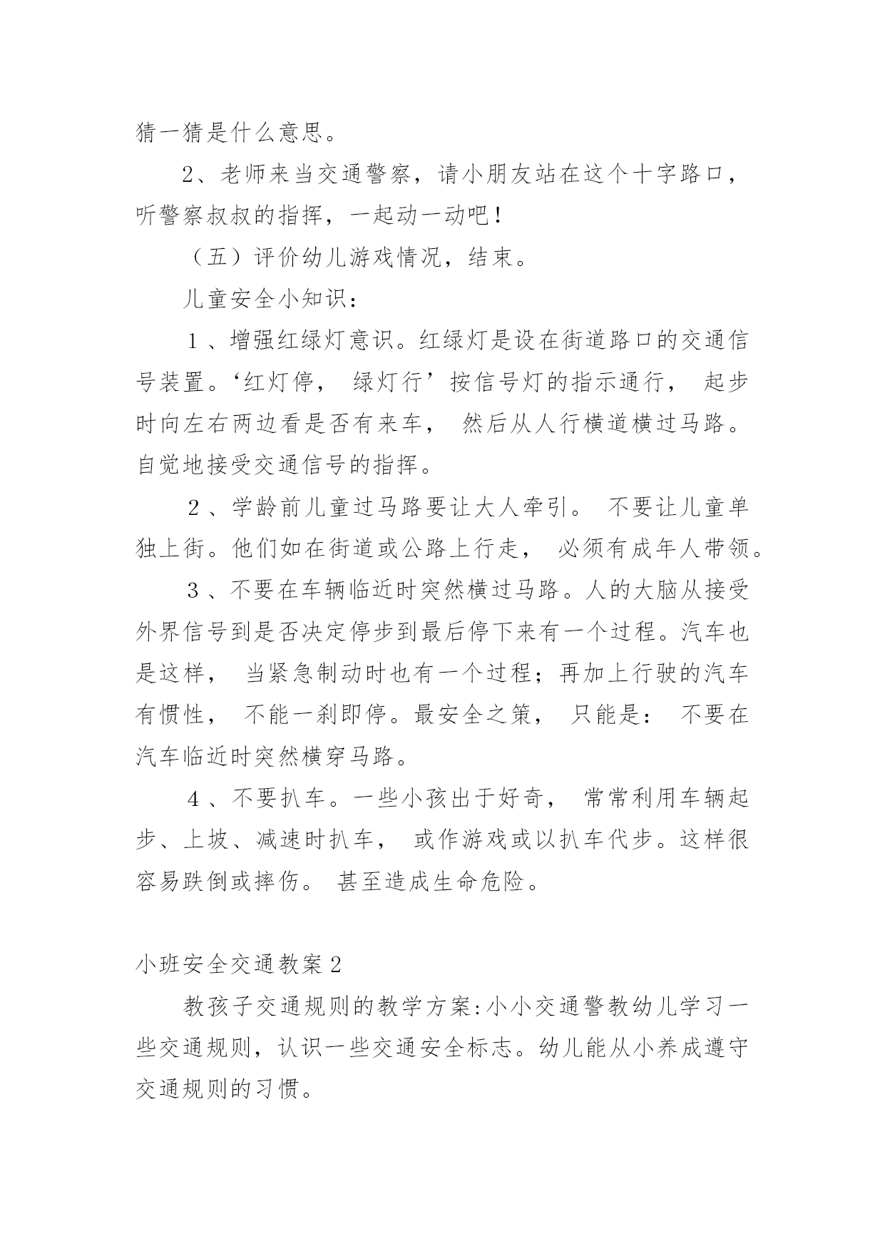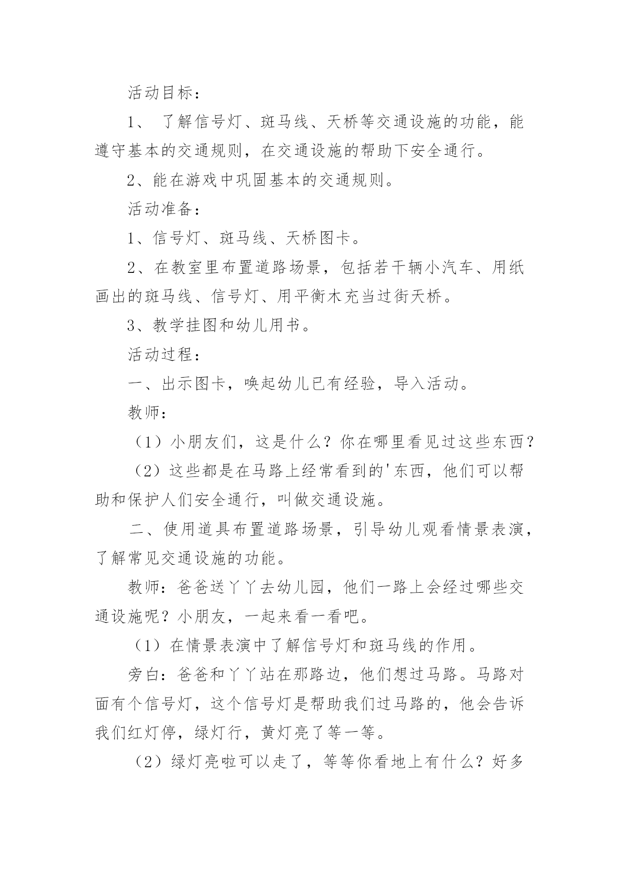 小班安全交通教案作为一位优秀的人民教师,很有必要精心设计一份教案,借助教案可以恰当地选择和运用教学方法,调动学生学习的积极性。那么优秀的教案是什么样的呢?以下是小编整理的小班安全交通教案,欢迎阅读,希望大家能够喜欢。小班安全交通教案1一、活动目标:1、让幼儿在交流活动中认识一些常见的交通标志。2、让幼儿在游戏活动中体验交通规则的重要性,从而自觉地遵守交通规则。3、让幼儿在合作学习中学得一些基本的学习方法。二、活动准备:1、精心布置活动场景。2、收集各种交通标志(照片或图片)。3、字卡:交通安全、红灯停,绿灯行、人行道、非机动车道、汽车道。三、活动过程:(一)展开联想,揭示活动主题1、出示交通事故图片,请幼儿仔细观察。提问:孩子们,刚才你们看到了什么?想到了什么?2、多么可怕的车祸,为了不让这样的事情再发生,我们一定要注意交通安全。(出示字卡“交通安全”)(二)在活动中体会交通规则的重要性1、孩子们,看看我们坐的队形像什么?十字路口的学问可多了,现在我们就在十字路口做个游戏。老师请出三个司机,三个骑车的'以及五个行人。参加游戏活动的孩子听到老师说完“开始”之后,立即向自己的对面出发。其他孩子仔细观察,看看会发生什么事情?(1)孩子们,刚才你们看到了什么?你们想说什么?(2)如果生活中也是这样可不行啊!为什么会发生这种情况呢?(3)(教师拿出信号灯标志)这是什么?谁能编句儿歌来说说信号灯的作用。(将标志贴在黑板上)幼儿回答后出示字卡“红灯停,绿灯行”。2、认识了红绿灯,我们还要知道自己应该走哪条路,这就要知道每条路的名称。孩子们,看看这个十字路口,你认识这些道路吗?(人行道、非机动车道、汽车道)(三)初步了解常见交通标志的作用(出示交通标志)在车辆穿梭的马路上,除了信号灯这个交通标志外,还有很多交通标志,这些交通标志都有什么用呢?(四)现场指挥1、刚才我们认识的交通标志对维护交通安全起着重要的作用。车辆的顺畅,人们的生命安全,更离不开交通警察。老师向交警叔叔学了一些指挥交通的本领,请小朋友仔细看,猜一猜是什么意思。2、老师来当交通警察,请小朋友站在这个十字路口,听警察叔叔的指挥,一起动一动吧!(五)评价幼儿游戏情况,结束。儿童安全小知识:1、增强红绿灯意识。红绿灯是设在街道路口的交通信号装置。‘红灯停,绿灯行’按信号灯的指示通行,起步时向左右两边看是否有来车,然后从人行横道横过马路。自觉地接受交通信号的指挥。2、学龄前儿童过马路要让大人牵引。不要让儿童单独上街。他们如在街道或公路上行走,必须有成年人带领。3、不要在车辆临近时突然横过马路。人的大脑从接受外界信号到是否决定停步到最后停下来有一个过程。汽车也是这样,当紧急制动时也有一个过程;再加上行驶的汽车有惯性,不能一刹即停。最安全之策,只能是:不要在汽车临近时突然横穿马路。4、不要扒车。一些小孩出于好奇,常常利用车辆起步、上坡、减速时扒车,或作游戏或以扒车代步。这样很容易跌倒或摔伤。甚至造成生命危险。小班安全交通教案2教孩子交通规则的教学方案:小小交通警教幼儿学习一些交通规则,认识一些交通安全标志。幼儿能从小养成遵守交通规则的习惯。小小交通警中国儿童教育网致力于提供给广大幼儿教师一个资源共享的平台,每天将会整理当天由我们的老师团队提供的当天参考教案和各种教育相关资源,让广大老师轻松备课。教学内容:交通安全常识教学目的:1.教幼儿学习一些交通规则,认识一些交通安全标志。2.幼儿能从小养成遵守交通规则的习惯。教学准备:情景图片五张。红绿灯标志各一张,交通标志图五张。教学过程:一.猜谜语,导入新课。红绿灯和斑马线,可结合班内墙上的斑马线图案介绍斑马线的作用。二.结合情景图片,学习交通规则。1.幼儿自由举手回答,自己还知道哪些交通规则?2.幼儿说出来的可结合图片讲解,没想到的出示图片,说说图片上的幼儿做的对不对,应该怎样做才是遵守交通规则。三.认识交通安全标志。出示图片,请幼儿猜猜它表示什么?四.学儿歌记交通规则儿歌:交通安全歌红灯停,绿灯行,黄灯请你准备好。天桥地道人行道,横穿马路离不了。头手不出车窗外,不在路上玩游戏。交通规则很重要,我们把它记得牢。五.红绿灯和小司机请两名小朋友,一人扮演红灯,一人扮演绿灯,其他小朋友为小司机,看哪位小司机遵守交通规则。教孩子学会危险的东西不要碰在《我找到的危险》活动中,孩子找到了许多危险,观察到幼儿的兴趣很浓,于是我同孩子一起生成了这样一节教学活动。让孩子通过歌曲创编的形式加深幼儿自我保护意识。危险的.东西不要碰中国儿童教育网致力于提供给广大幼儿教师一个资源共享的平台,每天将会整理当天由我们的老师团队提供的当天参考教案和各种教育相关资源,让广大老师轻松备课。设计意图:在《我找到的危险》活动中,孩子找到了许多危险,观察到幼儿的兴趣很浓,于是我同孩子