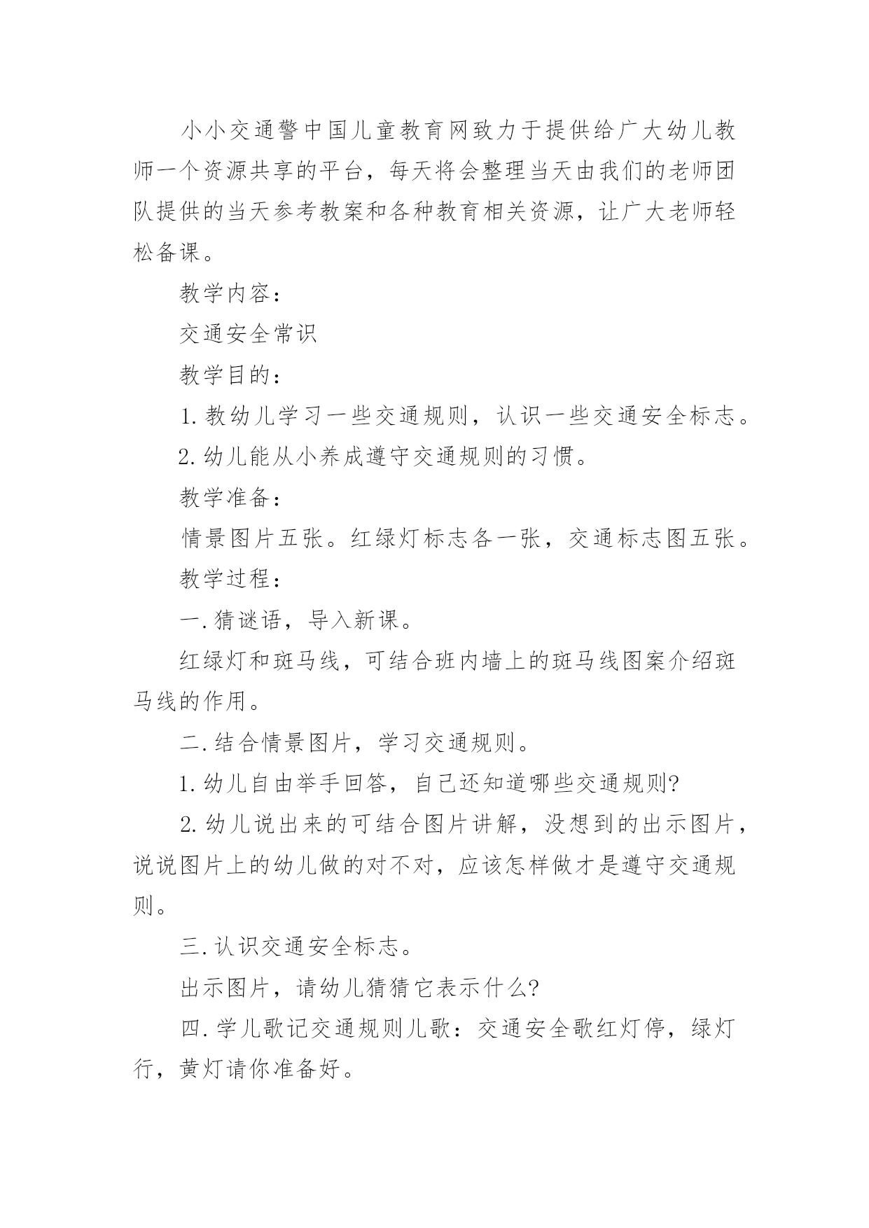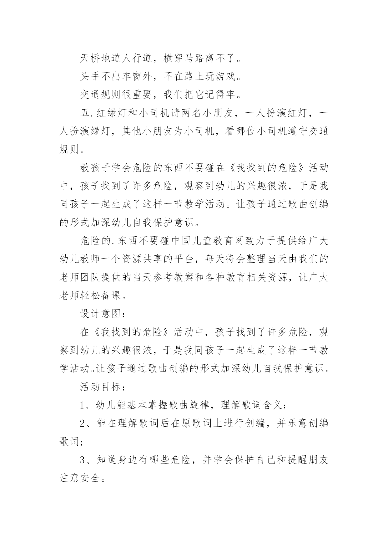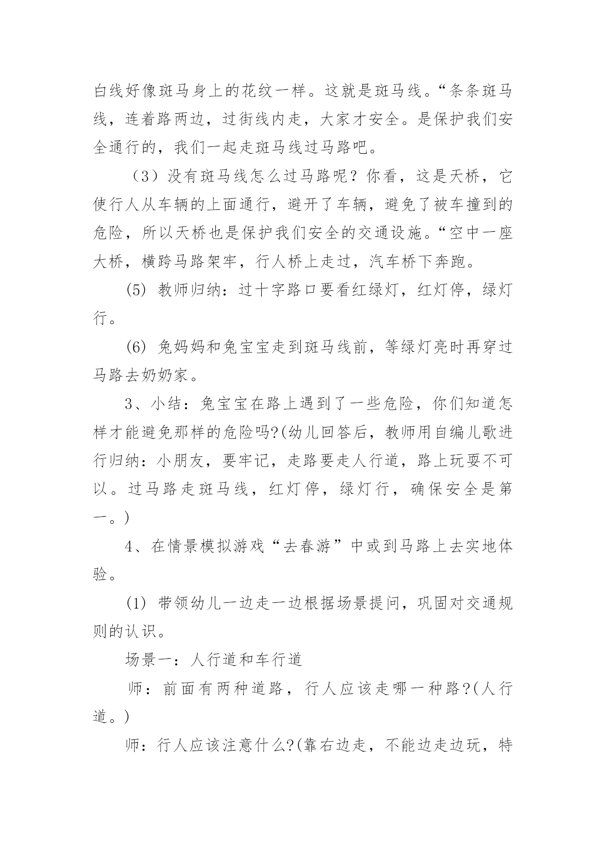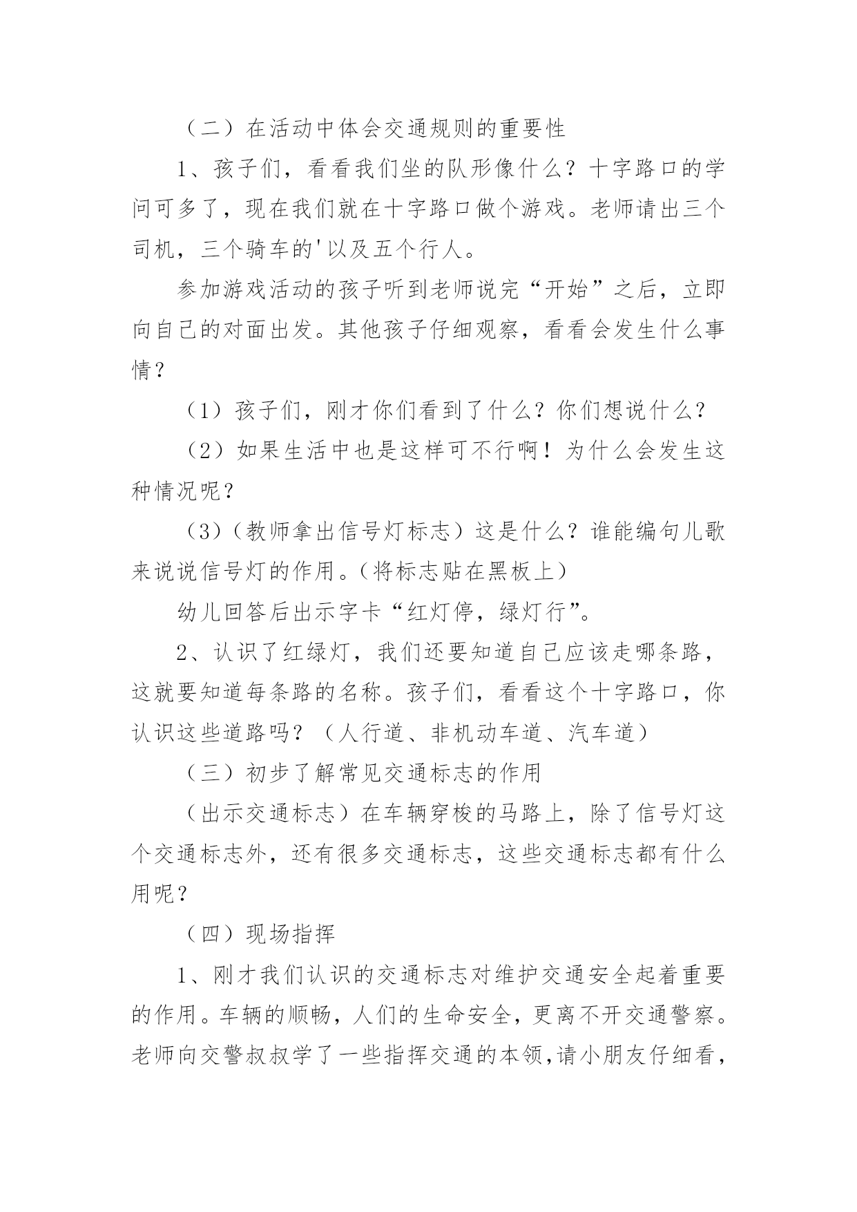 小班安全交通教案作为一位优秀的人民教师,很有必要精心设计一份教案,借助教案可以恰当地选择和运用教学方法,调动学生学习的积极性。那么优秀的教案是什么样的呢?以下是小编整理的小班安全交通教案,欢迎阅读,希望大家能够喜欢。小班安全交通教案1一、活动目标:1、让幼儿在交流活动中认识一些常见的交通标志。2、让幼儿在游戏活动中体验交通规则的重要性,从而自觉地遵守交通规则。3、让幼儿在合作学习中学得一些基本的学习方法。二、活动准备:1、精心布置活动场景。2、收集各种交通标志(照片或图片)。3、字卡:交通安全、红灯停,绿灯行、人行道、非机动车道、汽车道。三、活动过程:(一)展开联想,揭示活动主题1、出示交通事故图片,请幼儿仔细观察。提问:孩子们,刚才你们看到了什么?想到了什么?2、多么可怕的车祸,为了不让这样的事情再发生,我们一定要注意交通安全。(出示字卡“交通安全”)(二)在活动中体会交通规则的重要性1、孩子们,看看我们坐的队形像什么?十字路口的学问可多了,现在我们就在十字路口做个游戏。老师请出三个司机,三个骑车的'以及五个行人。参加游戏活动的孩子听到老师说完“开始”之后,立即向自己的对面出发。其他孩子仔细观察,看看会发生什么事情?(1)孩子们,刚才你们看到了什么?你们想说什么?(2)如果生活中也是这样可不行啊!为什么会发生这种情况呢?(3)(教师拿出信号灯标志)这是什么?谁能编句儿歌来说说信号灯的作用。(将标志贴在黑板上)幼儿回答后出示字卡“红灯停,绿灯行”。2、认识了红绿灯,我们还要知道自己应该走哪条路,这就要知道每条路的名称。孩子们,看看这个十字路口,你认识这些道路吗?(人行道、非机动车道、汽车道)(三)初步了解常见交通标志的作用(出示交通标志)在车辆穿梭的马路上,除了信号灯这个交通标志外,还有很多交通标志,这些交通标志都有什么用呢?(四)现场指挥1、刚才我们认识的交通标志对维护交通安全起着重要的作用。车辆的顺畅,人们的生命安全,更离不开交通警察。老师向交警叔叔学了一些指挥交通的本领,请小朋友仔细看,猜一猜是什么意思。2、老师来当交通警察,请小朋友站在这个十字路口,听警察叔叔的指挥,一起动一动吧!(五)评价幼儿游戏情况,结束。儿童安全小知识:1、增强红绿灯意识。红绿灯是设在街道路口的交通信号装置。‘红灯停,绿灯行’按信号灯的指示通行,起步时向左右两边看是否有来车,然后从人行横道横过马路。自觉地接受交通信号的指挥。2、学龄前儿童过马路要让大人牵引。不要让儿童单独上街。他们如在街道或公路上行走,必须有成年人带领。3、不要在车辆临近时突然横过马路。人的大脑从接受外界信号到是否决定停步到最后停下来有一个过程。汽车也是这样,当紧急制动时也有一个过程;再加上行驶的汽车有惯性,不能一刹即停。最安全之策,只能是:不要在汽车临近时突然横穿马路。4、不要扒车。一些小孩出于好奇,常常利用车辆起步、上坡、减速时扒车,或作游戏或以扒车代步。这样很容易跌倒或摔伤。甚至造成生命危险。小班安全交通教案2教孩子交通规则的教学方案:小小交通警教幼儿学习一些交通规则,认识一些交通安全标志。幼儿能从小养成遵守交通规则的习惯。小小交通警中国儿童教育网致力于提供给广大幼儿教师一个资源共享的平台,每天将会整理当天由我们的老师团队提供的当天参考教案和各种教育相关资源,让广大老师轻松备课。教学内容:交通安全常识教学目的:1.教幼儿学习一些交通规则,认识一些交通安全标志。2.幼儿能从小养成遵守交通规则的习惯。教学准备:情景图片五张。红绿灯标志各一张,交通标志图五张。教学过程:一.猜谜语,导入新课。红绿灯和斑马线,可结合班内墙上的斑马线图案介绍斑马线的作用。二.结合情景图片,学习交通规则。1.幼儿自由举手回答,自己还知道哪些交通规则?2.幼儿说出来的可结合图片讲解,没想到的出示图片,说说图片上的幼儿做的对不对,应该怎样做才是遵守交通规则。三.认识交通安全标志。出示图片,请幼儿猜猜它表示什么?四.学儿歌记交通规则儿歌:交通安全歌红灯停,绿灯行,黄灯请你准备好。天桥地道人行道,横穿马路离不了。头手不出车窗外,不在路上玩游戏。交通规则很重要,我们把它记得牢。五.红绿灯和小司机请两名小朋友,一人扮演红灯,一人扮演绿灯,其他小朋友为小司机,看哪位小司机遵守交通规则。教孩子学会危险的东西不要碰在《我找到的危险》活动中,孩子找到了许多危险,观察到幼儿的兴趣很浓,于是我同孩子一起生成了这样一节教学活动。让孩子通过歌曲创编的形式加深幼儿自我保护意识。危险的.东西不要碰中国儿童教育网致力于提供给广大幼儿教师一个资源共享的平台,每天将会整理当天由我们的老师团队提供的当天参考教案和各种教育相关资源,让广大老师轻松备课。设计意图:在《我找到的危险》活动中,孩子找到了许多危险,观察到幼儿的兴趣很浓,于是我同孩子