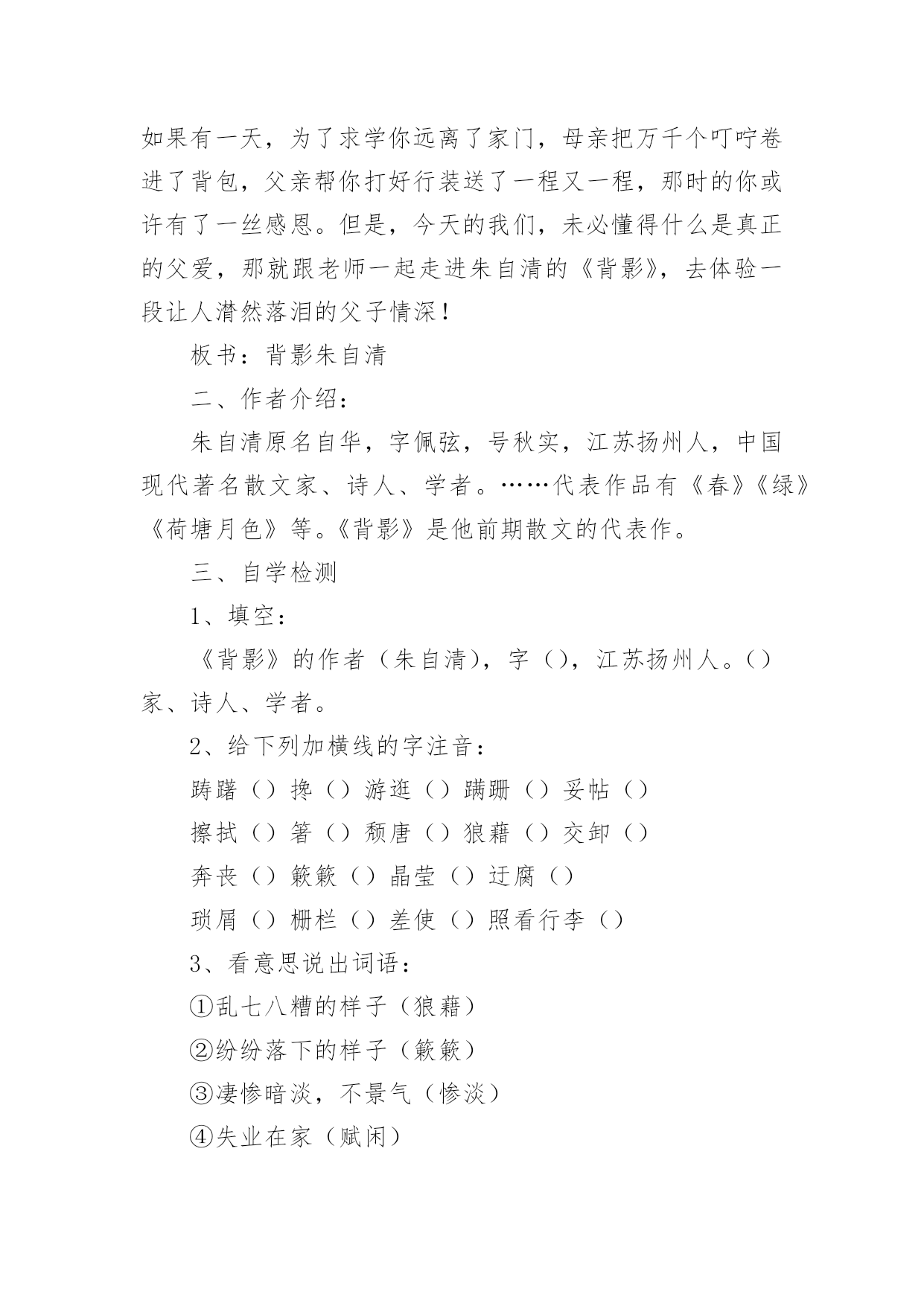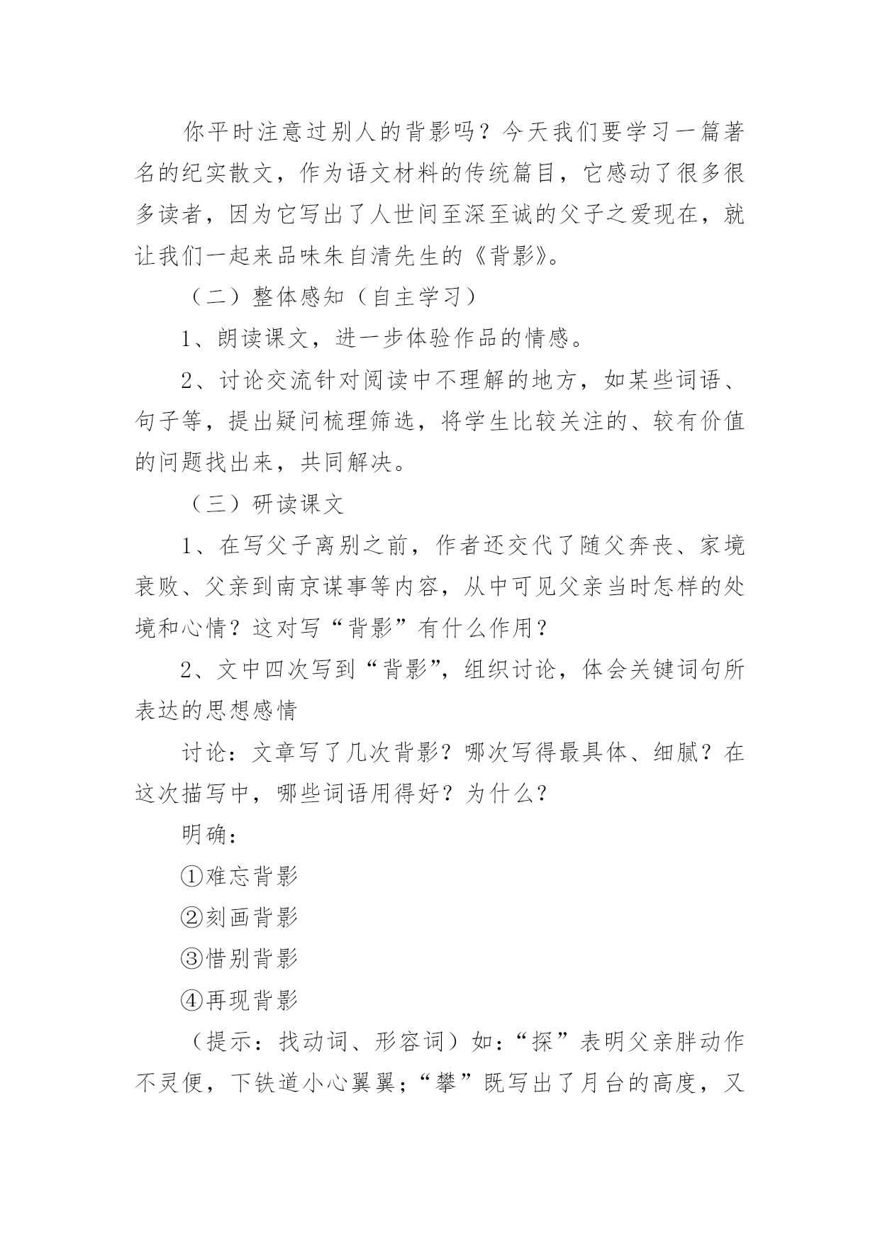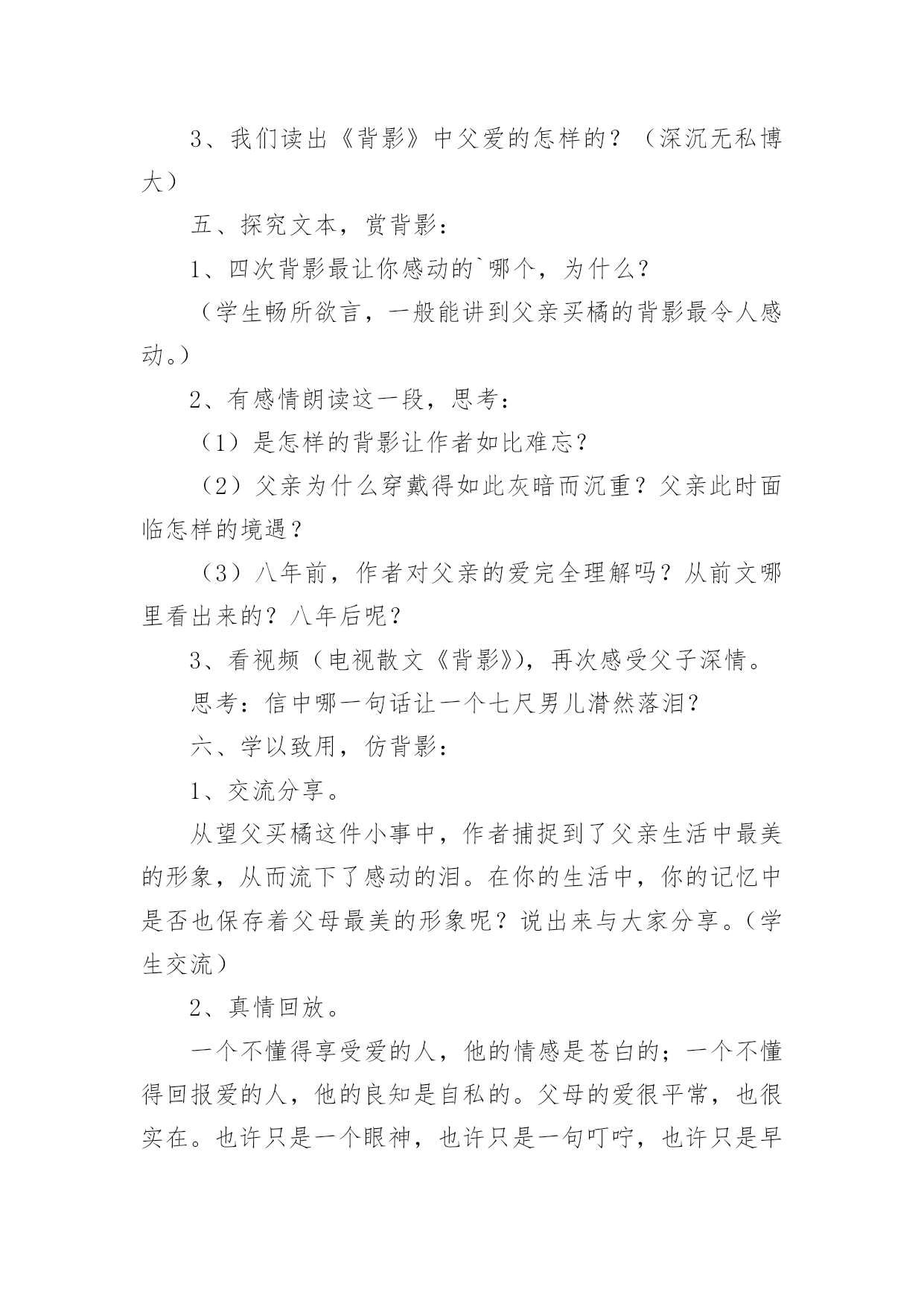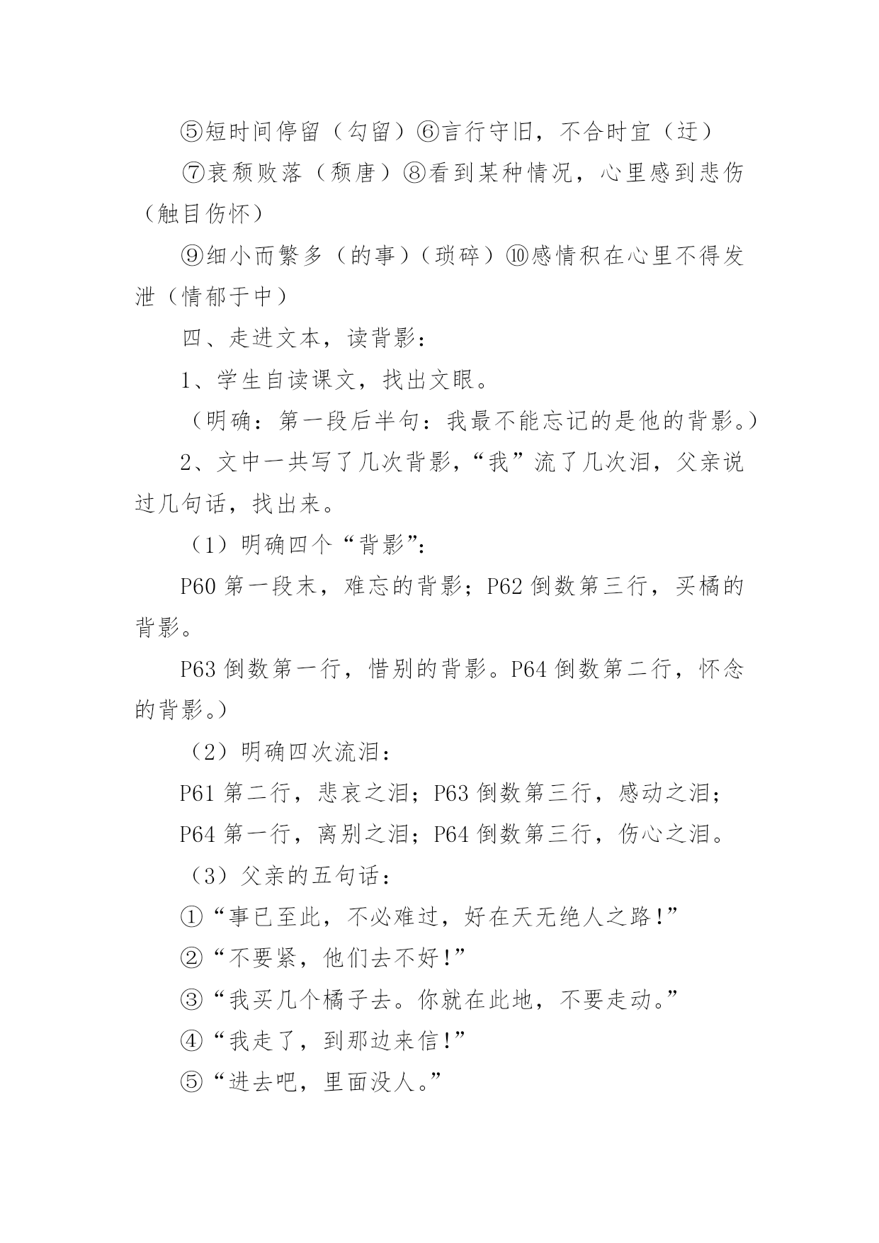 《背影》教学设计《背影》教学设计(通用14篇)作为一名默默奉献的教育工作者,总归要编写教学设计,借助教学设计可以提高教学质量,收到预期的教学效果。优秀的教学设计都具备一些什么特点呢?以下是小编为大家收集的《背影》教学设计,供大家参考借鉴,希望可以帮助到有需要的朋友。《背影》教学设计1【学习目标】(一)知识目标1、掌握课文中出现的重要词汇。2、抓住文中表达作者感情的重要语句。(二)能力目标:整体感知课文内容,体会散文的美。(三)情感目标1、感受父子情深,继承和发扬中华民族的传统美德。2、珍爱亲情,增进与父母的沟通与交流,培养中华民族传统美德。【学习重点】有感情地朗读课文,体味洋溢在字里行间的人间至情。【教学过程】一、情境导课:也许,我们没有走出家门,不知道父母爱你有多深!也许我们根本没有离开过父母,难以体会父母的恩情有多真!如果有一天,为了求学你远离了家门,母亲把万千个叮咛卷进了背包,父亲帮你打好行装送了一程又一程,那时的你或许有了一丝感恩。但是,今天的我们,未必懂得什么是真正的父爱,那就跟老师一起走进朱自清的《背影》,去体验一段让人潸然落泪的父子情深!板书:背影朱自清二、作者介绍:朱自清原名自华,字佩弦,号秋实,江苏扬州人,中国现代著名散文家、诗人、学者。……代表作品有《春》《绿》《荷塘月色》等。《背影》是他前期散文的代表作。三、自学检测1、填空:《背影》的作者(朱自清),字(),江苏扬州人。()家、诗人、学者。2、给下列加横线的字注音:踌躇()搀()游逛()蹒跚()妥帖()擦拭()箸()颓唐()狼藉()交卸()奔丧()簌簌()晶莹()迂腐()琐屑()栅栏()差使()照看行李()3、看意思说出词语:①乱七八糟的样子(狼藉)②纷纷落下的样子(簌簌)③凄惨暗淡,不景气(惨淡)④失业在家(赋闲)⑤短时间停留(勾留)⑥言行守旧,不合时宜(迂)⑦衰颓败落(颓唐)⑧看到某种情况,心里感到悲伤(触目伤怀)⑨细小而繁多(的事)(琐碎)⑩感情积在心里不得发泄(情郁于中)四、走进文本,读背影:1、学生自读课文,找出文眼。(明确:第一段后半句:我最不能忘记的是他的背影。)2、文中一共写了几次背影,“我”流了几次泪,父亲说过几句话,找出来。(1)明确四个“背影”:P60第一段末,难忘的背影;P62倒数第三行,买橘的背影。P63倒数第一行,惜别的背影。P64倒数第二行,怀念的背影。)(2)明确四次流泪:P61第二行,悲哀之泪;P63倒数第三行,感动之泪;P64第一行,离别之泪;P64倒数第三行,伤心之泪。(3)父亲的五句话:①“事已至此,不必难过,好在天无绝人之路!”②“不要紧,他们去不好!”③“我买几个橘子去。你就在此地,不要走动。”④“我走了,到那边来信!”⑤“进去吧,里面没人。”3、我们读出《背影》中父爱的怎样的?(深沉无私博大)五、探究文本,赏背影:1、四次背影最让你感动的`哪个,为什么?(学生畅所欲言,一般能讲到父亲买橘的背影最令人感动。)2、有感情朗读这一段,思考:(1)是怎样的背影让作者如比难忘?(2)父亲为什么穿戴得如此灰暗而沉重?父亲此时面临怎样的境遇?(3)八年前,作者对父亲的爱完全理解吗?从前文哪里看出来的?八年后呢?3、看视频(电视散文《背影》),再次感受父子深情。思考:信中哪一句话让一个七尺男儿潸然落泪?六、学以致用,仿背影:1、交流分享。从望父买橘这件小事中,作者捕捉到了父亲生活中最美的形象,从而流下了感动的泪。在你的生活中,你的记忆中是否也保存着父母最美的形象呢?说出来与大家分享。(学生交流)2、真情回放。一个不懂得享受爱的人,他的情感是苍白的;一个不懂得回报爱的人,他的良知是自私的。父母的爱很平常,也很实在。也许只是一个眼神,也许只是一句叮咛,也许只是早餐时装在你书包里的一盒牛奶……母爱如水,父爱如山,下面请你仔细品味记忆中的真爱,选择最动情的一件事,用你的笔写下这段真情,去感受亲情、回报亲情吧!200字左右。(多媒体播放背景音乐《父亲》,渲染气氛)《背影》教学设计2教学目的1、整体感知课文内容2、品味朴实而动情的语言,学习本文的人物描写3、深入理解作者情感,教育学生对父母怀有感恩心教学重点引导学生感受父子亲情,品味朴实而动情的语言教学难点引导学生在整体感悟的基础上深入理解作者情感并进行体验课时第一课时教学手段多媒体教学步骤:一、导入:由几组背影导入新课,最后一幅就是今天我们要学习的朱自清的《背影》二、初读:1、写作背景介绍2、范读课文,要求学生听清生字读音。三、再读1、寻找“背影”文章几次提到父亲的背影?分别出现在文章的哪些段落?2、哪一次是作者详细刻画的?请在文中找出具体描述的句子来,思考其中的原因。讨论、交流、明确:(四处背影,略)作者写得最为动情的是父亲过铁道买橘子时的背影,因为此时作者写得最详细———先写外