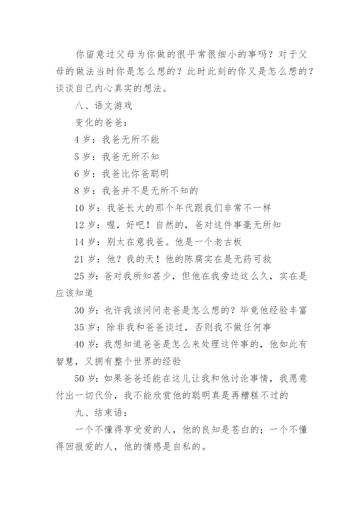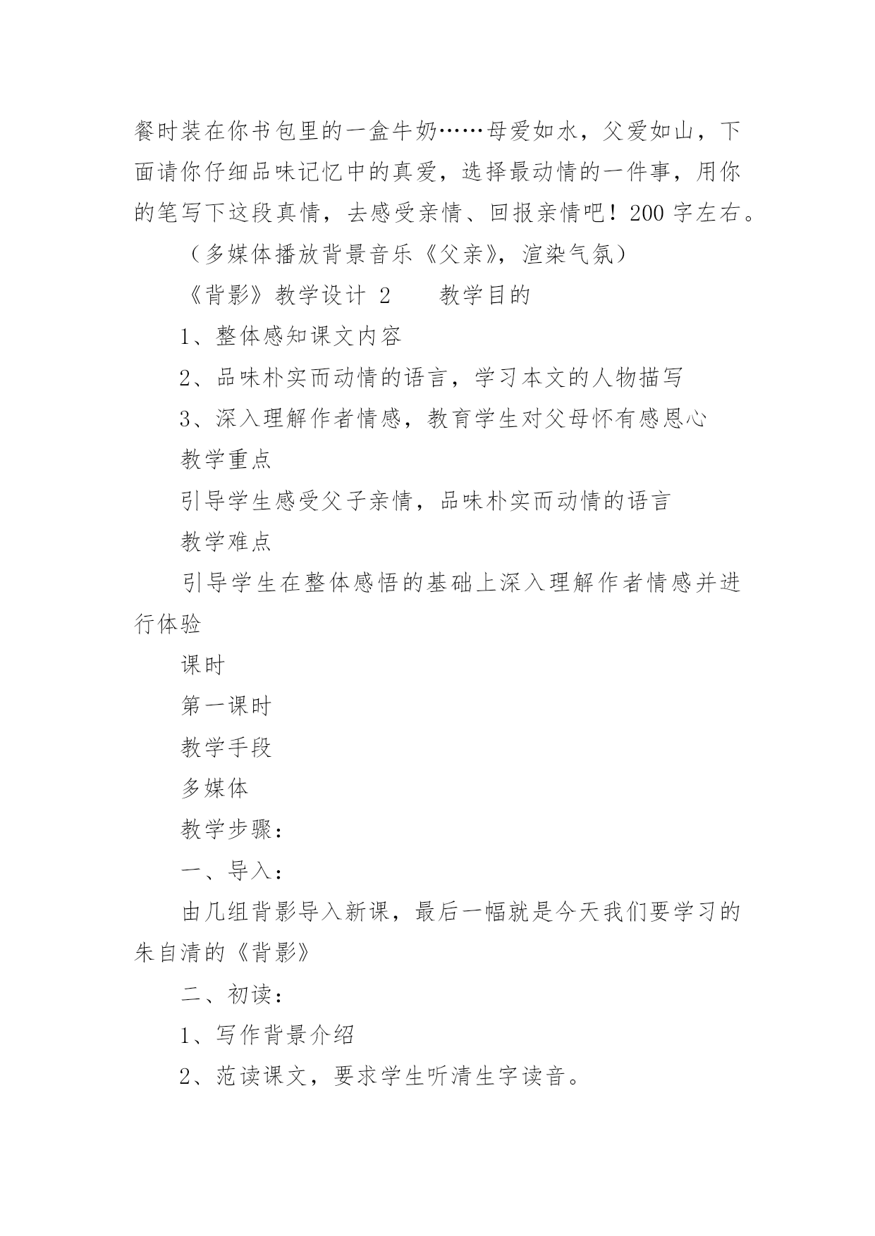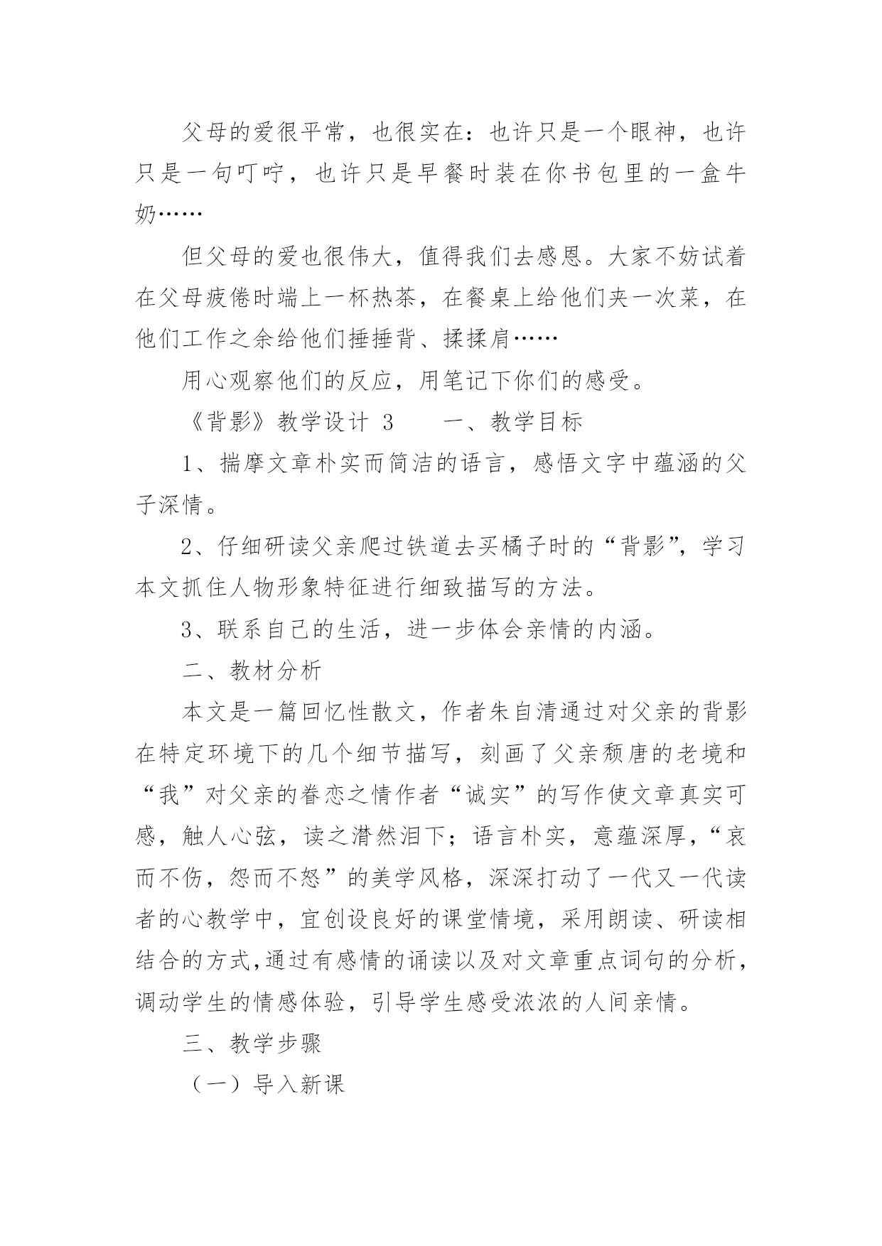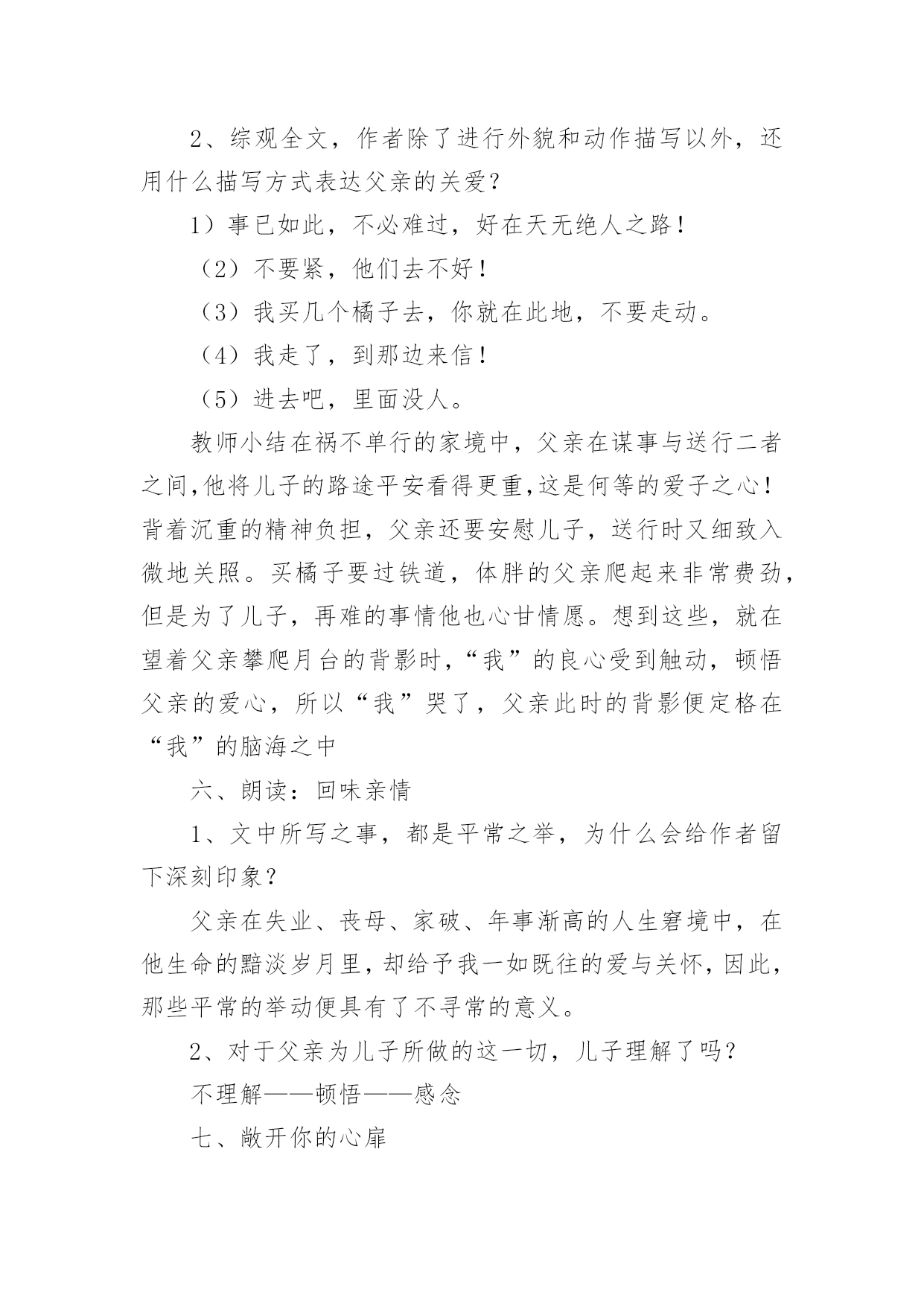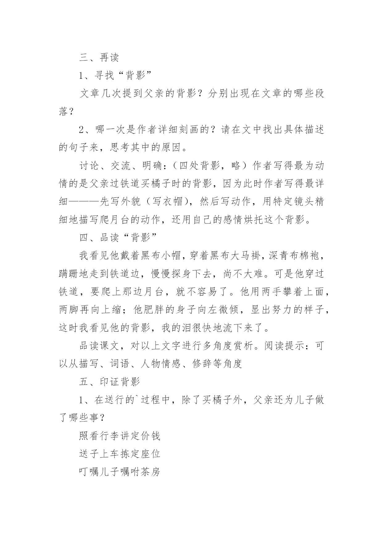 《背影》教学设计《背影》教学设计(通用14篇)作为一名默默奉献的教育工作者,总归要编写教学设计,借助教学设计可以提高教学质量,收到预期的教学效果。优秀的教学设计都具备一些什么特点呢?以下是小编为大家收集的《背影》教学设计,供大家参考借鉴,希望可以帮助到有需要的朋友。《背影》教学设计1【学习目标】(一)知识目标1、掌握课文中出现的重要词汇。2、抓住文中表达作者感情的重要语句。(二)能力目标:整体感知课文内容,体会散文的美。(三)情感目标1、感受父子情深,继承和发扬中华民族的传统美德。2、珍爱亲情,增进与父母的沟通与交流,培养中华民族传统美德。【学习重点】有感情地朗读课文,体味洋溢在字里行间的人间至情。【教学过程】一、情境导课:也许,我们没有走出家门,不知道父母爱你有多深!也许我们根本没有离开过父母,难以体会父母的恩情有多真!如果有一天,为了求学你远离了家门,母亲把万千个叮咛卷进了背包,父亲帮你打好行装送了一程又一程,那时的你或许有了一丝感恩。但是,今天的我们,未必懂得什么是真正的父爱,那就跟老师一起走进朱自清的《背影》,去体验一段让人潸然落泪的父子情深!板书:背影朱自清二、作者介绍:朱自清原名自华,字佩弦,号秋实,江苏扬州人,中国现代著名散文家、诗人、学者。……代表作品有《春》《绿》《荷塘月色》等。《背影》是他前期散文的代表作。三、自学检测1、填空:《背影》的作者(朱自清),字(),江苏扬州人。()家、诗人、学者。2、给下列加横线的字注音:踌躇()搀()游逛()蹒跚()妥帖()擦拭()箸()颓唐()狼藉()交卸()奔丧()簌簌()晶莹()迂腐()琐屑()栅栏()差使()照看行李()3、看意思说出词语:①乱七八糟的样子(狼藉)②纷纷落下的样子(簌簌)③凄惨暗淡,不景气(惨淡)④失业在家(赋闲)⑤短时间停留(勾留)⑥言行守旧,不合时宜(迂)⑦衰颓败落(颓唐)⑧看到某种情况,心里感到悲伤(触目伤怀)⑨细小而繁多(的事)(琐碎)⑩感情积在心里不得发泄(情郁于中)四、走进文本,读背影:1、学生自读课文,找出文眼。(明确:第一段后半句:我最不能忘记的是他的背影。)2、文中一共写了几次背影,“我”流了几次泪,父亲说过几句话,找出来。(1)明确四个“背影”:P60第一段末,难忘的背影;P62倒数第三行,买橘的背影。P63倒数第一行,惜别的背影。P64倒数第二行,怀念的背影。)(2)明确四次流泪:P61第二行,悲哀之泪;P63倒数第三行,感动之泪;P64第一行,离别之泪;P64倒数第三行,伤心之泪。(3)父亲的五句话:①“事已至此,不必难过,好在天无绝人之路!”②“不要紧,他们去不好!”③“我买几个橘子去。你就在此地,不要走动。”④“我走了,到那边来信!”⑤“进去吧,里面没人。”3、我们读出《背影》中父爱的怎样的?(深沉无私博大)五、探究文本,赏背影:1、四次背影最让你感动的`哪个,为什么?(学生畅所欲言,一般能讲到父亲买橘的背影最令人感动。)2、有感情朗读这一段,思考:(1)是怎样的背影让作者如比难忘?(2)父亲为什么穿戴得如此灰暗而沉重?父亲此时面临怎样的境遇?(3)八年前,作者对父亲的爱完全理解吗?从前文哪里看出来的?八年后呢?3、看视频(电视散文《背影》),再次感受父子深情。思考:信中哪一句话让一个七尺男儿潸然落泪?六、学以致用,仿背影:1、交流分享。从望父买橘这件小事中,作者捕捉到了父亲生活中最美的形象,从而流下了感动的泪。在你的生活中,你的记忆中是否也保存着父母最美的形象呢?说出来与大家分享。(学生交流)2、真情回放。一个不懂得享受爱的人,他的情感是苍白的;一个不懂得回报爱的人,他的良知是自私的。父母的爱很平常,也很实在。也许只是一个眼神,也许只是一句叮咛,也许只是早餐时装在你书包里的一盒牛奶……母爱如水,父爱如山,下面请你仔细品味记忆中的真爱,选择最动情的一件事,用你的笔写下这段真情,去感受亲情、回报亲情吧!200字左右。(多媒体播放背景音乐《父亲》,渲染气氛)《背影》教学设计2教学目的1、整体感知课文内容2、品味朴实而动情的语言,学习本文的人物描写3、深入理解作者情感,教育学生对父母怀有感恩心教学重点引导学生感受父子亲情,品味朴实而动情的语言教学难点引导学生在整体感悟的基础上深入理解作者情感并进行体验课时第一课时教学手段多媒体教学步骤:一、导入:由几组背影导入新课,最后一幅就是今天我们要学习的朱自清的《背影》二、初读:1、写作背景介绍2、范读课文,要求学生听清生字读音。三、再读1、寻找“背影”文章几次提到父亲的背影?分别出现在文章的哪些段落?2、哪一次是作者详细刻画的?请在文中找出具体描述的句子来,思考其中的原因。讨论、交流、明确:(四处背影,略)作者写得最为动情的是父亲过铁道买橘子时的背影,因为此时作者写得最详细———先写外