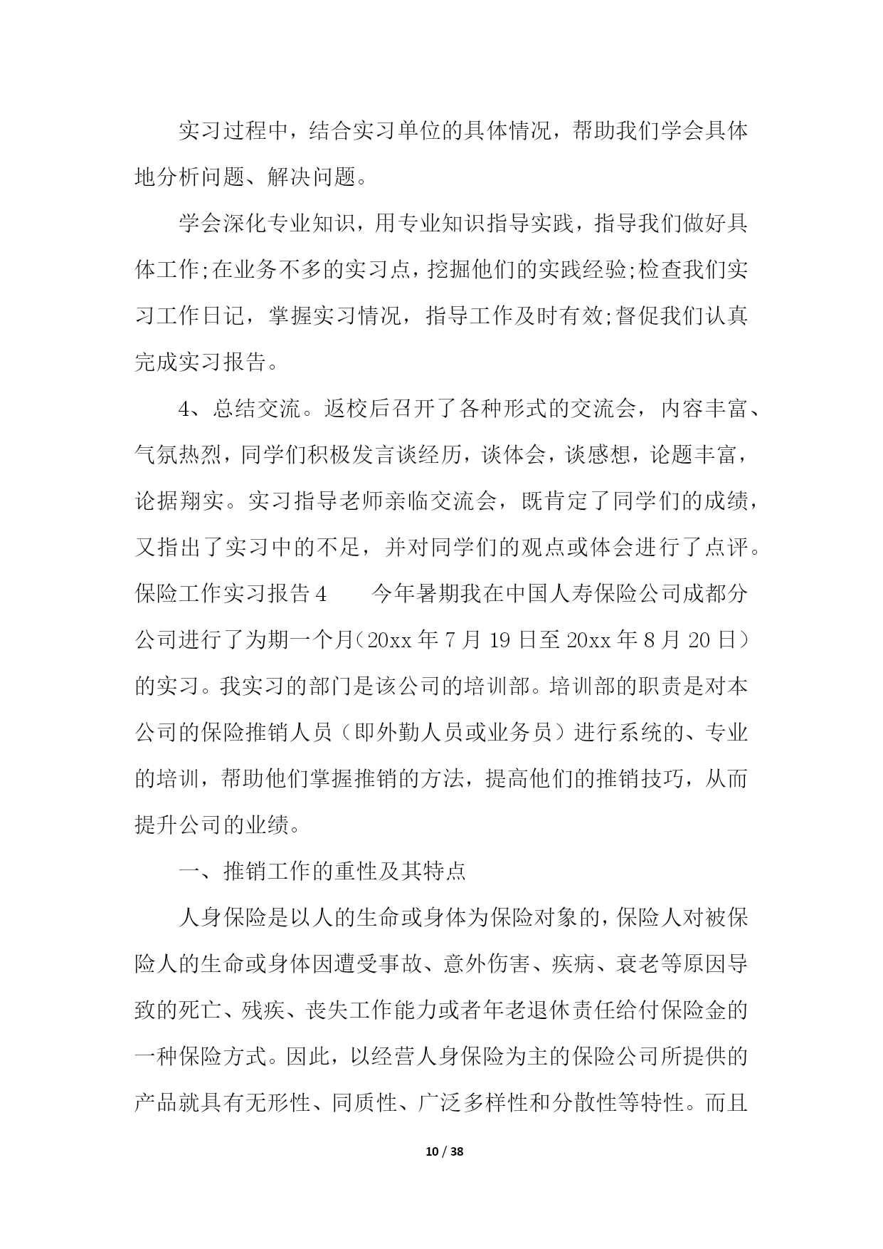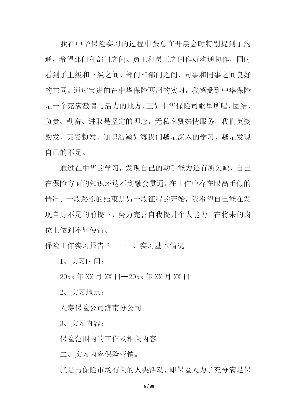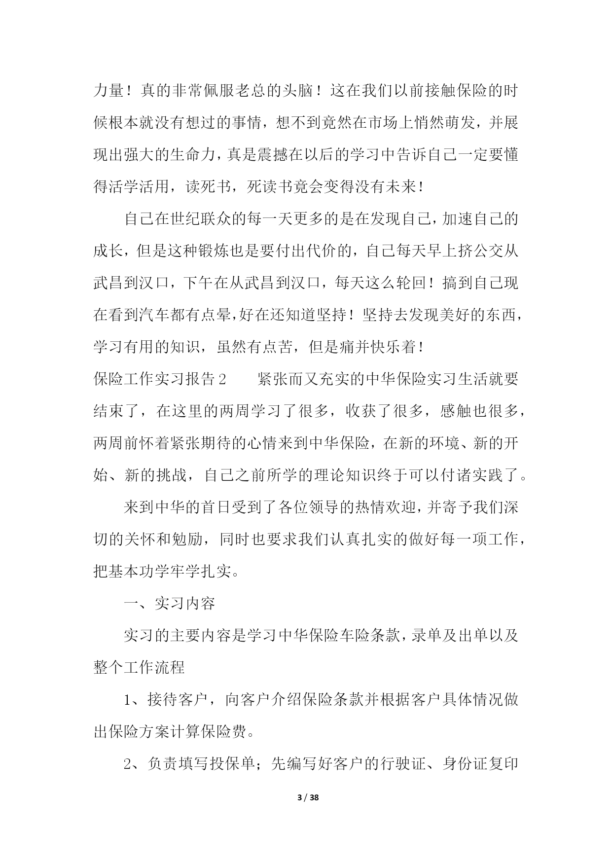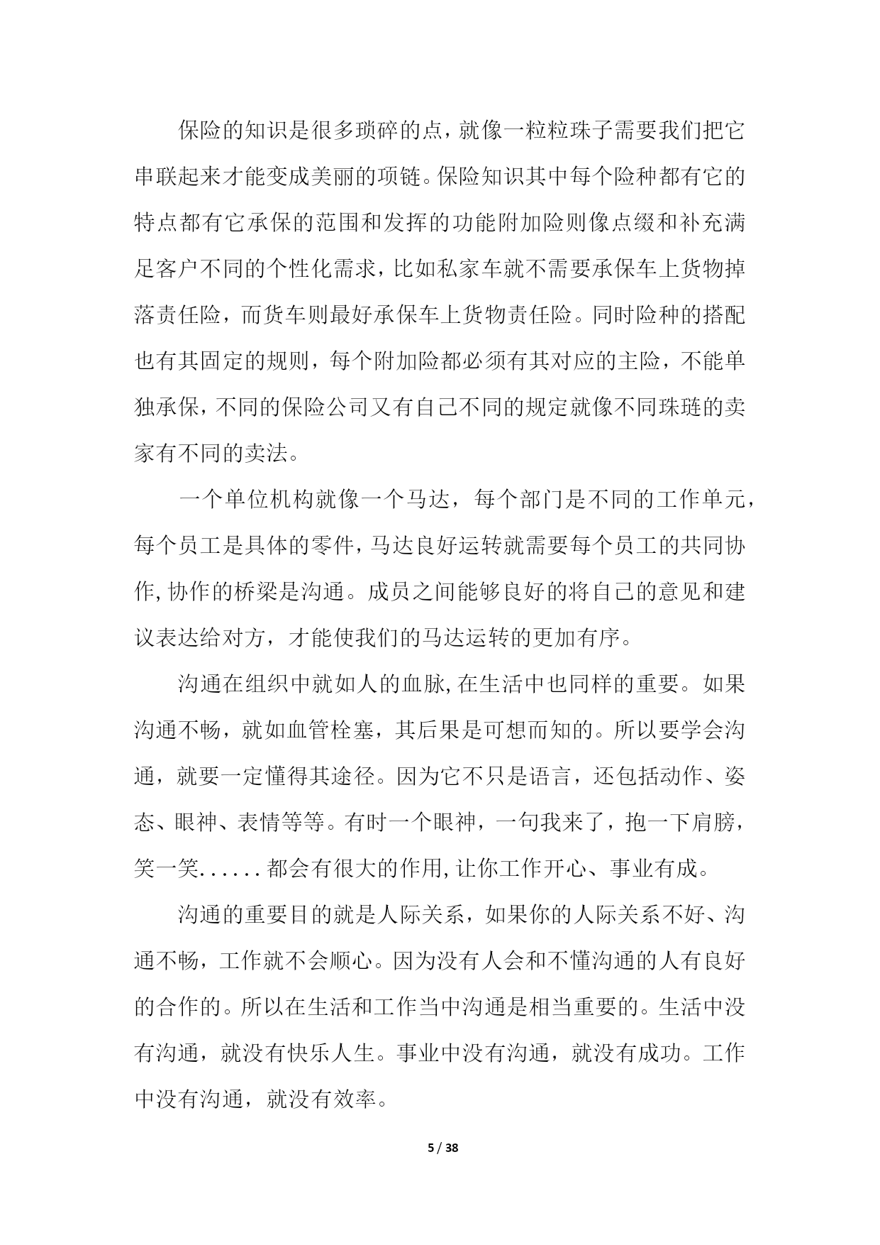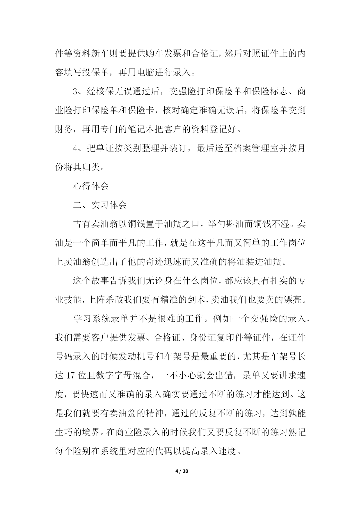 PAGE38/NUMPAGES38保险工作实习报告保险工作实习报告1暑假第一次留在武汉进行实习,有幸能够来到世纪联众保险代理公司接受了一个月的锻炼,直接深入到社会职场中,与客户面对面的接触与交流,一方面把自己所学知识与实践直接相结合,另一方面又学到了许多学校里所学不到的经验与教训,从而使自己对自己有了更加全面的了解,因为自己学的是金融进入保险有些不情愿,但是一个暑假的实习结束,自己觉得其实这样的经历才是自己最想要的!7月13号正式来到汉口世纪联众,老总热情的接待我们,然后我就被安排到了卡单部实习,”卡单”这个概念是第一次接触,其实就是短期意外险的另一种说法,这是最先让我觉得新鲜的东西。然后开始学习如何填写保单,第一天就填错了几张保单,发现自己原来是这么粗心,好在公司对我们都非常宽容,让我非常感动。这时明白了什么是宽容!接下来的几天我就一直在卡单部实习,每天每天要背卡单产品的信息,哪家保险公司有哪些产品,保障额度多少,适合哪些职业种类,适合那些人群,有哪些是拒保的职业……一下子记这么多东西,感觉头都有点大,但是要接待客户的话,必须要记住,所以每天都告诉自己要加油!这时明白了要永远对自己有信心!在卡单最紧张的一天是第一次坐到前台正式接待客户,登帐、填单子、收费每一步都要认真细致,但是当天客户来的非常多,对还不熟练的我来说,简直有点力不从心,虽然很认真的去做,还是出了好多错误,幸亏有师傅帮忙善后,才不致于有太大损失,这一天让我深刻的感觉到业务熟练的必要性和重要性!稳重的重要性从这里开始发掘!每一天都在接触着形形色色的客户,他们中的大多数都是热情而且宽容的,但是也有一些要求非常严格甚至是苛刻的客户,他们要求特别苛刻,一不小心就把他们的得罪了,这些人真是让人疲于应付,但是你还是要克制自己的情绪,继续为他们耐心服务,这种情况还是为我们上了实实在在的一堂余人交流课!交流真的是一门艺术,幸亏自己明白的不是太晚!再后来到车险部进行实习,幸运的是刚好赶上公司培训新的员工,我就跟他们一起学起了车险算费,这里的学习不像在学校里的学习一样理论性那么强,这里注重的是实际操作能力,这里面有很多都是公司的老员工通过长期工作总结下来的经验,在实际工作中非常有用,因此感觉特别宝贵!等我们“黄浦三期”学员毕业时,公司朱总专门给我们讲了一下午的保险市场的发展现状及公司准则和公司的未来发展等,为我们描绘了一个美好的愿景,让我们在以后的工作中既不至于太盲目,也不至于没有动力!公司现在与中国石化合作在很多加油站点开了一些车险的直销网点,这在全国乃至全世界都是一个创新,而且在公司良好的管理方式的运作下,正在有条不紊的开展,让人感觉到创新的力量!真的非常佩服老总的头脑!这在我们以前接触保险的时候根本就没有想过的事情,想不到竟然在市场上悄然萌发,并展现出强大的生命力,真是震撼在以后的学习中告诉自己一定要懂得活学活用,读死书,死读书竟会变得没有未来!自己在世纪联众的每一天更多的是在发现自己,加速自己的成长,但是这种锻炼也是要付出代价的,自己每天早上挤公交从武昌到汉口,下午在从武昌到汉口,每天这么轮回!搞到自己现在看到汽车都有点晕,好在还知道坚持!坚持去发现美好的东西,学习有用的知识,虽然有点苦,但是痛并快乐着!保险工作实习报告2紧张而又充实的中华保险实习生活就要结束了,在这里的两周学习了很多,收获了很多,感触也很多,两周前怀着紧张期待的心情来到中华保险,在新的环境、新的开始、新的挑战,自己之前所学的理论知识终于可以付诸实践了。来到中华的首日受到了各位领导的热情欢迎,并寄予我们深切的关怀和勉励,同时也要求我们认真扎实的做好每一项工作,把基本功学牢学扎实。一、实习内容实习的主要内容是学习中华保险车险条款,录单及出单以及整个工作流程1、接待客户,向客户介绍保险条款并根据客户具体情况做出保险方案计算保险费。2、负责填写投保单;先编写好客户的行驶证、身份证复印件等资料新车则要提供购车发票和合格证,然后对照证件上的内容填写投保单,再用电脑进行录入。3、经核保无误通过后,交强险打印保险单和保险标志、商业险打印保险单和保险卡,核对确定准确无误后,将保险单交到财务,再用专门的笔记本把客户的资料登记好。4、把单证按类别整理并装订,最后送至档案管理室并按月份将其归类。心得体会二、实习体会古有卖油翁以铜钱置于油瓶之口,举勺斟油而铜钱不湿。卖油是一个简单而平凡的工作,就是在这平凡而又简单的工作岗位上卖油翁创造出了他的奇迹迅速而又准确的将油装进油瓶。这个故事告诉我们无论身在什么岗位,都应该具有扎实的专业技能,上阵杀敌我们要有精准的剑术,卖油我们也要卖的漂亮。学习系统录单并不是很难的工作。例如一个交强险的录入,我们需要客户提供发票、合格证、身份证复印件等证件,在证件号码录入的时候发动机号和