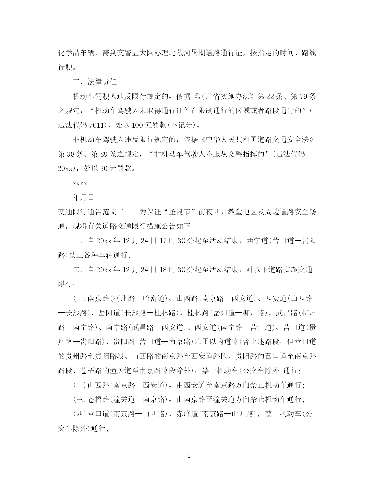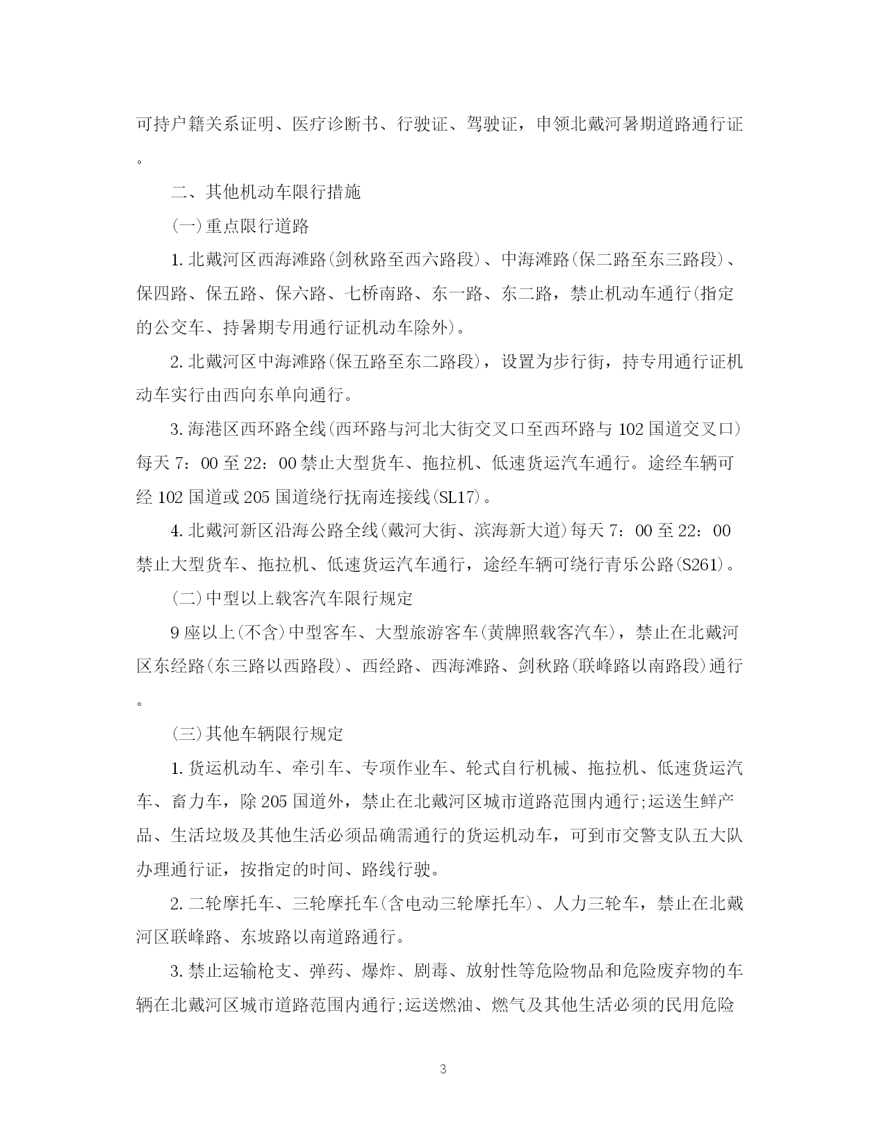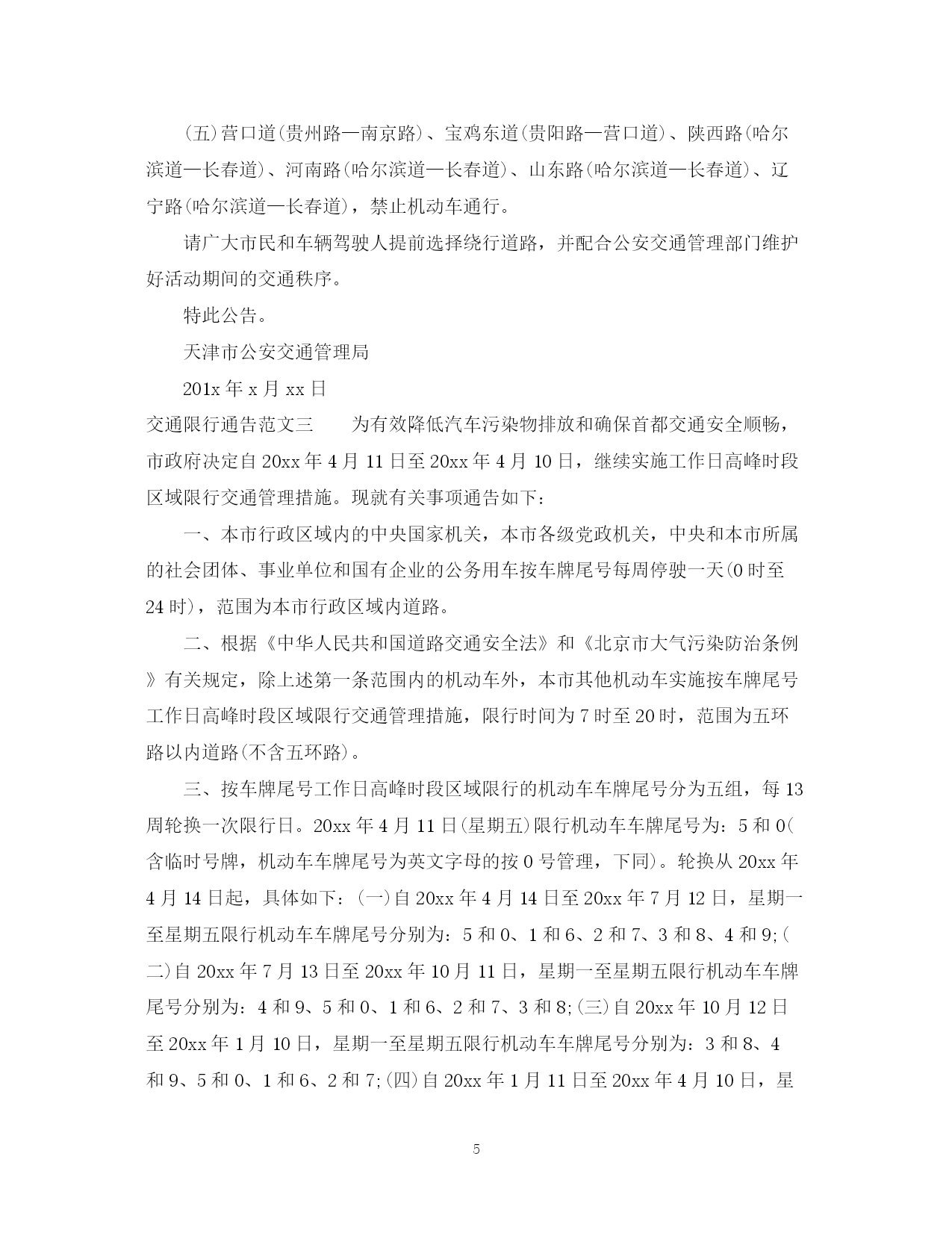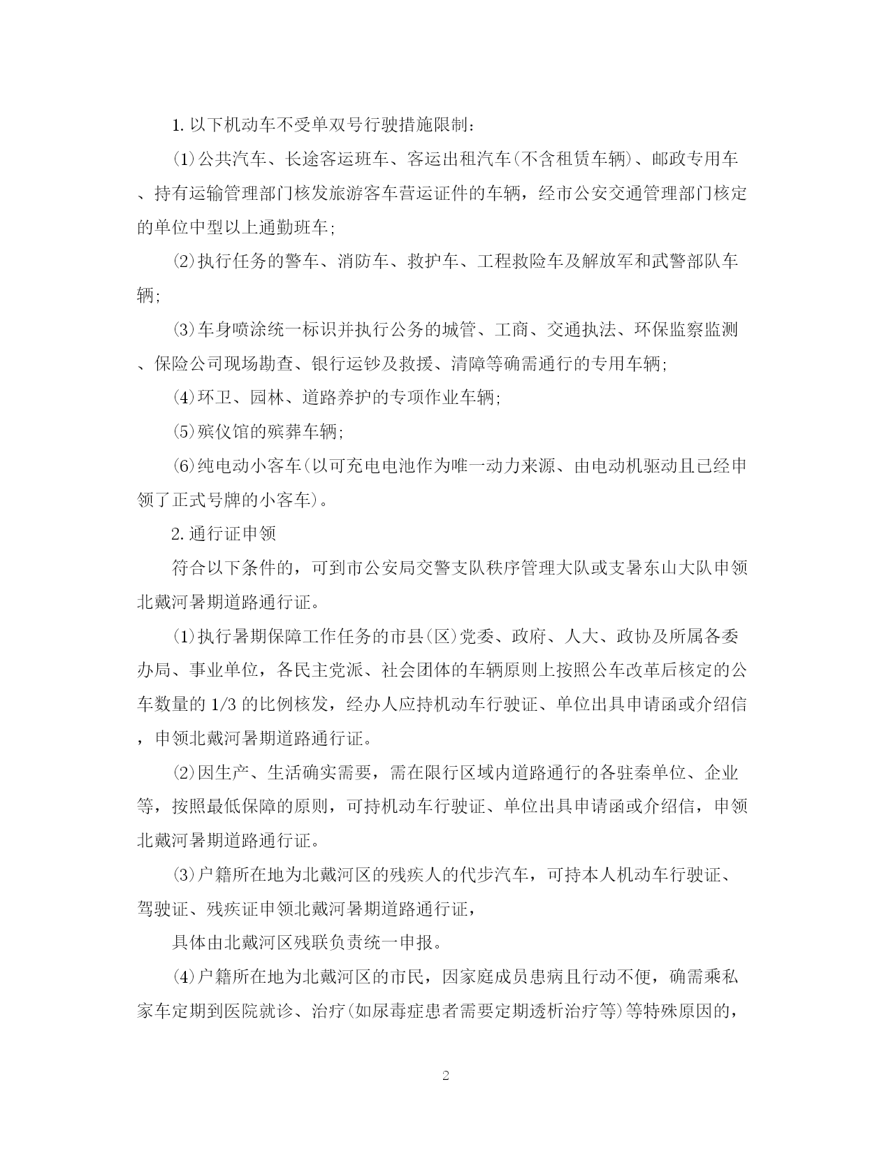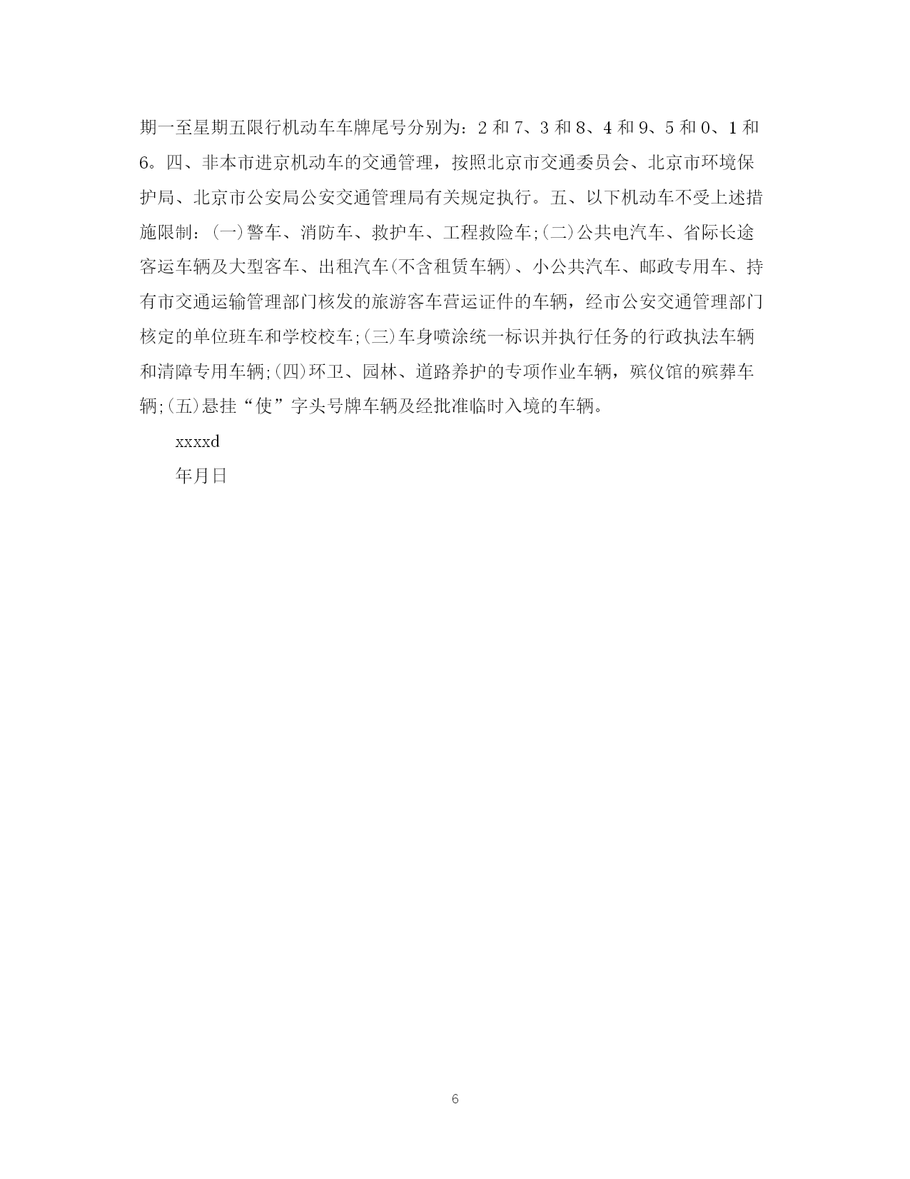 此资料由网络收集而来,如有侵权请告知上传者立即删除。资料共分享,我们负责传递知识。PAGEPAGE6交通限行通告为了加强交通的管制,确保交通的畅通,会对交通实行限行,下面范文网小编给大家带来交通限行通告范文,供大家参考!交通限行通告范文一为了加强我市暑期道路交通秩序管理,确保道路交通安全畅通。根据《中华人民共和国道路交通安全法》第三十九条规定,秦皇岛市公安局制定了《20xx年暑期道路交通限行通告》(征求意见稿),并于20xx年4月6日至5月8日,在省市各新闻媒体、互联网网站、微信、微博广泛征求了各界群众意见,并在此基础上进行了修改,经报请市政府批准,决定自20xx年7月1日起至8月31日,对我市城市区、旅游区道路,依法采取交通限行措施,具体措施通告如下:一、北戴河区单双号限行区域及措施(一)限行时间每周六、周日8:00至22:00。(二)限行区域和道路滨海大道山东堡立交桥以西、西部快速路(不含)以南,新驼峰路(不含)以东区域内全部道路,以及海北路(205国道以南路段)、京哈高速北戴河引道(太平庄立交桥以东路段)。注:京哈高速方向车辆可经太平庄立交桥——海北路(向北,此段出城方向不处罚)——205国道方向行驶。(三)限行原则每周六、周日8:00至22:00,上路行驶的本市号牌机动车(冀C号牌机动车)在上述限行区域内道路按车牌尾号实行单号单日行驶、双号双日行驶(车牌单号为1、3、5、7、9,双号为2、4、6、8、0),尾号为英文字母的以最后一位阿拉伯数字为准;已核发通行证的货运机动车,除按照公安交管部门指定的时间、路线行驶外,双休日执行单双号限行措施。(四)特殊通行需求1.以下机动车不受单双号行驶措施限制:(1)公共汽车、长途客运班车、客运出租汽车(不含租赁车辆)、邮政专用车、持有运输管理部门核发旅游客车营运证件的车辆,经市公安交通管理部门核定的单位中型以上通勤班车;(2)执行任务的警车、消防车、救护车、工程救险车及解放军和武警部队车辆;(3)车身喷涂统一标识并执行公务的城管、工商、交通执法、环保监察监测、保险公司现场勘查、银行运钞及救援、清障等确需通行的专用车辆;(4)环卫、园林、道路养护的专项作业车辆;(5)殡仪馆的殡葬车辆;(6)纯电动小客车(以可充电电池作为唯一动力来源、由电动机驱动且已经申领了正式号牌的小客车)。2.通行证申领符合以下条件的,可到市公安局交警支队秩序管理大队或支暑东山大队申领北戴河暑期道路通行证。(1)执行暑期保障工作任务的市县(区)党委、政府、人大、政协及所属各委办局、事业单位,各民主党派、社会团体的车辆原则上按照公车改革后核定的公车数量的1/3的比例核发,经办人应持机动车行驶证、单位出具申请函或介绍信,申领北戴河暑期道路通行证。(2)因生产、生活确实需要,需在限行区域内道路通行的各驻秦单位、企业等,按照最低保障的原则,可持机动车行驶证、单位出具申请函或介绍信,申领北戴河暑期道路通行证。(3)户籍所在地为北戴河区的残疾人的代步汽车,可持本人机动车行驶证、驾驶证、残疾证申领北戴河暑期道路通行证,具体由北戴河区残联负责统一申报。(4)户籍所在地为北戴河区的市民,因家庭成员患病且行动不便,确需乘私家车定期到医院就诊、治疗(如尿毒症患者需要定期透析治疗等)等特殊原因的,可持户籍关系证明、医疗诊断书、行驶证、驾驶证,申领北戴河暑期道路通行证。二、其他机动车限行措施(一)重点限行道路1.北戴河区西海滩路(剑秋路至西六路段)、中海滩路(保二路至东三路段)、保四路、保五路、保六路、七桥南路、东一路、东二路,禁止机动车通行(指定的公交车、持暑期专用通行证机动车除外)。2.北戴河区中海滩路(保五路至东二路段),设置为步行街,持专用通行证机动车实行由西向东单向通行。3.海港区西环路全线(西环路与河北大街交叉口至西环路与102国道交叉口)每天7:00至22:00禁止大型货车、拖拉机、低速货运汽车通行。途经车辆可经102国道或205国道绕行抚南连接线(SL17)。4.北戴河新区沿海公路全线(戴河大街、滨海新大道)每天7:00至22:00禁止大型货车、拖拉机、低速货运汽车通行,途经车辆可绕行青乐公路(S261)。(二)中型以上载客汽车限行规定9座以上(不含)中型客车、大型旅游客车(黄牌照载客汽车),禁止在北戴河区东经路(东三路以西路段)、西经路、西海滩路、剑秋路(联峰路以南路段)通行。(三)其他车辆限行规定1.货运机动车、牵引车、专项作业车、轮式自行机械、拖拉机、低速货运汽车、畜力车,除205国道外,禁止在北戴河区城市道路范围内通行;运送生鲜产品、生活垃圾及其他生活必须品确需通行的货运机动车,可到市交警支队五大队办理通行证,按指定的时间、