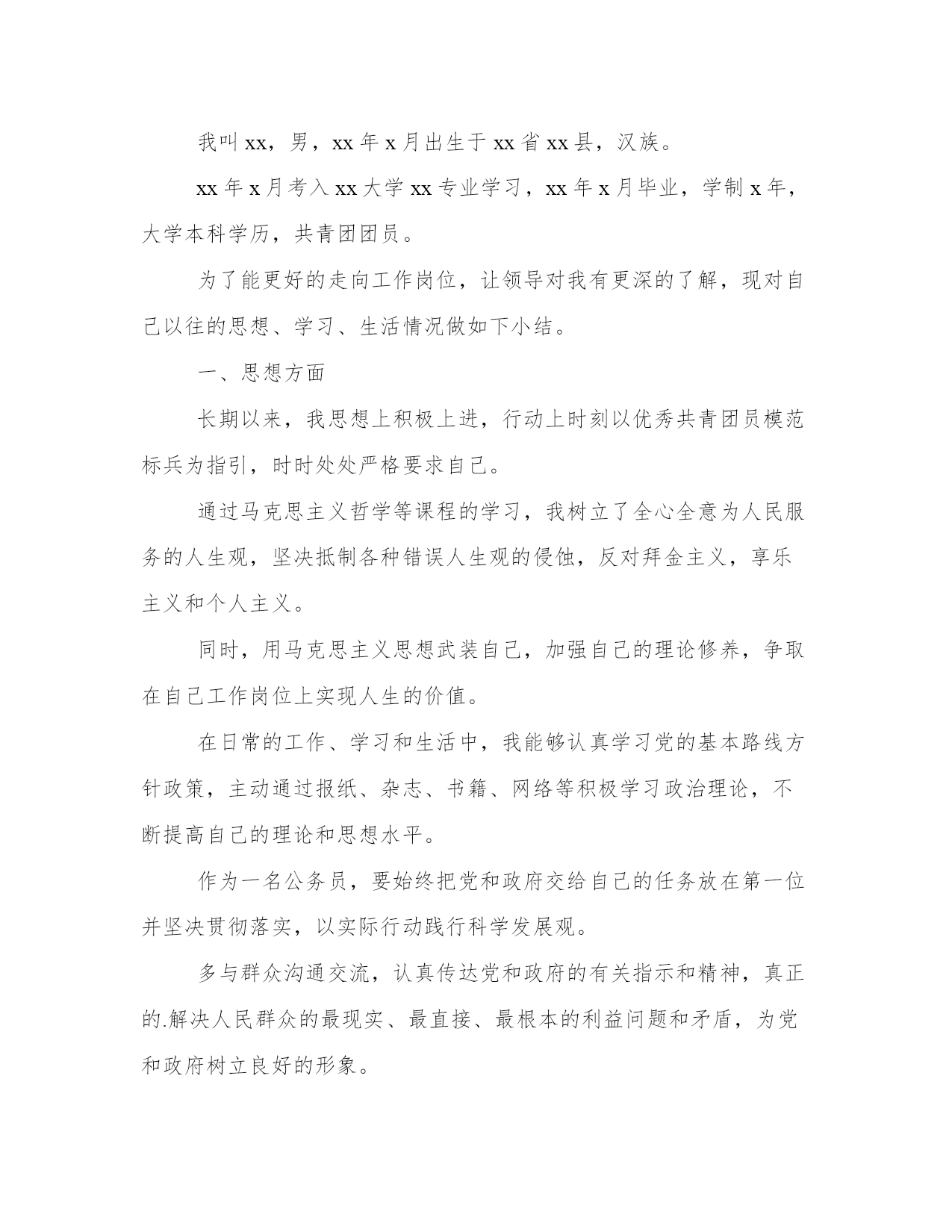 公务员个人总结格式(实用11篇)总结可以帮助我们反思,思考过去的经验和教训,以便在未来更好地应对类似的情况。在总结中可以适当加入一些案例和实例,丰富内容和论述。这些总结范文展示了一些独到的观点和触发了一些新的思考,值得我们去借鉴。公务员个人总结格式篇一小编为您整理了关于公务员政审个人总结的格式,希望对您有帮助,想了解更多请继续关注小编为您带来的整理。我叫xxx,女,于xxx年x月出生在重庆市渝中区,汉族。xxx年x月考入西南大学资源环境与城乡规划专业学习,20xx年7月毕业,学制四年,大学本科学历,共青团员,现在,开县事业单位公开、公平、公正的选拔机制让我有机会实现自己的社会价值。为了能更好地走向工作岗位,让组织对我有更深的了解,我把自己过去的学习、工作、生活和思想情况做一个小结。一、政治思想方面在思想上,我积极上进,从小我就受到外公这位老党员的熏陶,立志长大以后要成为一名合格的共产党员。我热爱祖国,热爱中国共产党,热爱社会主义,拥护中国共产党的领导,拥护改革开放,坚信社会主义最终必然战胜资本主义,对社会主义充满必胜的信心。我始终坚持运用马克思列宁主义的立场观点和方法论,运用辩证唯物主义与历史唯物主义去分析和观察事物,明辨是非,坚持真理,坚持正确的世界观、人生观、价值观,用正确的世界观、人生观、价值观指导自己的学习、工作和生活实践,在思想上积极构筑抵御资产阶级民主和自由化、拜金主义、自由主义等一切腐朽思想侵蚀的坚固防线。认真贯彻执行党的路线、方针、政策,为加快社会主义建设事业认真做好本职工作。二、道德品质方面大学期间,我接受到学校良好的思想政治教育,深知道德品质的形成与发展是内外因素相互作用的结果,所以我首先对自己严格自律,勤俭节约,大学期间获得国家助学金,在国家、在社会的帮助下我顺利完成了大学学业,我怀着一颗感恩的心努力学习并积极参加各种社会公益活动,用自己的表现来回报社会。作为一名社会建设的主人翁,我有着强烈的社会责任感,树立社会主义荣辱观,以“八荣八耻”为标尺衡量我的所作所为,坚持以热爱祖国为荣、以危害祖国为耻;以服务人民为荣、以背离人民为耻;以崇尚科学为荣,以愚昧无知为耻;以辛勤劳动为荣、以好逸恶劳为耻;以团结互助为荣、以损人利己为耻;以诚实守信为荣、以见利忘义为耻;以遵纪守法为荣、以违法乱纪为耻;以艰苦奋斗为荣、以骄奢淫逸为耻。“八荣八耻”坚持了以为人民服务为核心,以集体主义为原则,以爱祖国、爱人民、爱劳动、爱科学、爱社会主义为基本要求。“八荣八耻”引导我们摆正个人、集体、国家的关系,正确处理好个人与社会、竞争与协作、先富与共富、经济效益与社会效益等关系。三、能力素质方面首先,我在学习和工作中勇于实践,善于总结,乐于吃苦,注重理论联系实际,平时注意克服自满、懒惰和急躁的情绪,保持谦虚谨慎并持之以恒。其次,任何工作我都严格要求做精做细,防止差错。在集体工作中,注重团队协作性,发挥集体的智慧,也注意发挥个人主观能动性,大胆工作,积极肯干。在平凡的工作中自我加压,自我激励。第三,我在工作实践中不断反思和在思维锻炼中提升能力素质。总结、反思是我对工作实践进行回顾和思考,提炼升华的过程,从中吸取经验教训,避免今后再发生类似的错误。在大学和工作期间,我不断扩展自己的知识领域和能力,先后取得了人力资源管理助理,计算机和英语四级证书。希望对今后的工作能有所帮助。四、主要学习和工作表现自从进入大学以来,我一直团结同学,本着顾全大局、作风严谨、虚心好学、积极向上的原则,充分发挥自己吃苦耐劳、虚心请教、主动学习的优点,明确了学习的方向。在具体的学习过程中能形成一个较为清晰的思路,做到有组织、有目的、有计划,顺利的完成大学四年的学业。学习成绩和学习热情普遍得到了老师和同学的认可。基本做到了学前有计划,学后有总结,让我在学习中学到了很多知识,也锻炼了自己,经过不懈的努力,我的学习水平有了长足的进步,也为自己今后的工作打下了一个良好的基础。毕业时,由于我所学专业比较冷门,未能找到符合专业知识的工作,我一边在开县新世纪打工,一边坚持自学,2009年受聘于重庆君创劳务有限公司,随公司参与了北京京石客运专线的建设,担任综合办公室主任,并兼任人力资源科长,面对工程战线长、人员多、人员流动大等各种繁杂情况,我加班加点,顺利完成了公司交给我的各项任务,受到本公司领导及中铁六局京石项目部相关领导的高度赞扬。去年,在京石工程的工作顺利结束以后,我回到开县,积极备考,还取得了教师资格证。我深知,机会都是留给有准备的人,时代的发展,工作的需要,激励我不断通过学习充实自己,努力使自己成为适应各种工作需要的复合型人才。五、遵纪守法情况我从小就在良好的家庭环境中长大,外公是大学教授,外婆是小学美术教
