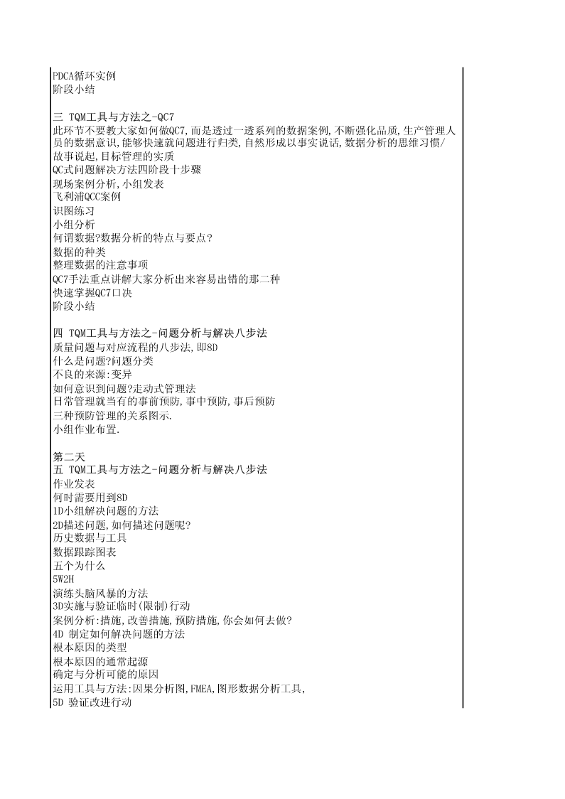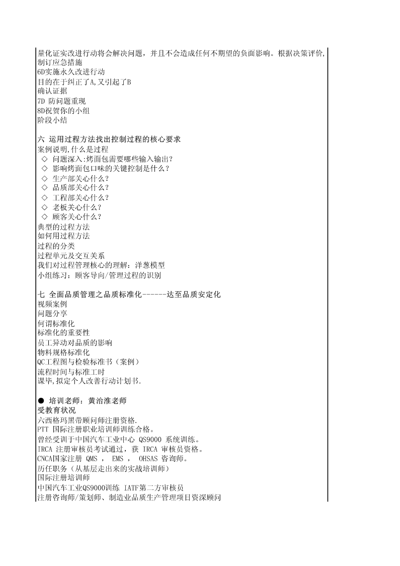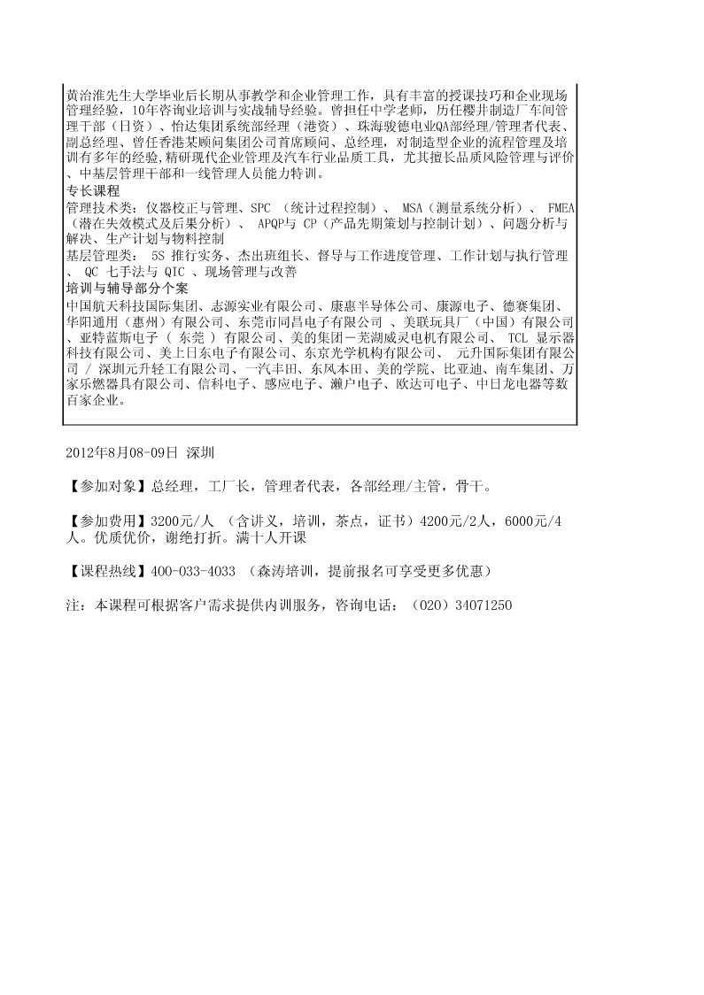 黄治淮:《TQM全面品质管理》2012年8月08-09日深圳全国统一报名咨询热线:4OO-O33-4O33(森涛培训)●课程背景:顾客第一,品质第一,走进企业的大门,99.9%的大门显眼处均有相关的字眼。摩托罗拉的承诺是达到“六星级”的质量标准--在每一百万件产品中,不合格品应少于三件。为此,六西格玛十年又十年。可我们更多工厂如此承诺,如何行动呢?企业到底如何进行质量管理工作?质量管理工作如何服务于企业的经营?如何通过高水平的质量管理提高企业的市场竞争力?如何对质量更有效的控制?如何提高全员的质量意识,把质量变成企业的竞争力?无数伤痛的事件告诉我们:质量事关重大,与人人有关。品质意识的提升不仅仅是理念引入,更需要成为一种习惯,做高质量的事,成为有品质有水准的人。●课程特点:通俗易懂易接受,强化意识,讲解案例,掌握工具,引导行动,具可操作性。建议高层携管理团队与骨干参加,把质量战略观纳入日常行动。●课程目标深化与激发品质意识,建立品质竞争的概念,深化对质量的理解认识质量管理对企业经营的重要性,建立品质链概念加深对TQM的理解,实现基础管理与前瞻性思维的有机结合通过练习体验质量管理、质量改善和管理创新的奥妙学习基础管理方法,掌握QC式业务改善工具和技巧学习问题分析与解决思路,具体问题解决能力建立正确的质量意识,使质量意识转化为以结果为导向的行动●课程设计一TQM全面品质管理基础说文解字,看”品质”了解其含义品质贯穿工作中的每个过程认识你的下一个工序,他就是你的客户品质责任是什么,如何担当你认为品质部或质量部如何定位?品质人员的质素要求视频案例TQM之人的品质,例,查检表TQM之事的品质,例,查检表TQM之物的品质,例,查检表TQM之环境的品质,例,查检表阶段小结二TQM工具与方法之-PDCA循环案例,我们对品质的错误理解如何实施戴明轮PDCA?PDCA的八个具体步骤量化证实改进行动将会解决问题,并且不会造成任何不期望的负面影响。根据决策评价,制订应急措施6D实施永久改进行动目的在于纠正了A,又引起了B确认证据7D防问题重现8D祝贺你的小组阶段小结六运用过程方法找出控制过程的核心要求案例说明,什么是过程◇问题深入:烤面包需要哪些输入输出?◇影响烤面包口味的关键控制是什么?◇生产部关心什么?◇品质部关心什么?◇工程部关心什么?◇老板关心什么?◇顾客关心什么?典型的过程方法如何用过程方法过程的分类过程单元及交互关系我们对过程管理核心的理解:洋葱模型小组练习:顾客导向/管理过程的识别七全面品质管理之品质标准化------达至品质安定化视频案例问题分享何谓标准化标准化的重要性员工异动对品质的影响物料规格标准化QC工程图与检验标准书(案例)流程时间与标准工时课毕,拟定个人改善行动计划书.●培训老师:黄治淮老师受教育状况六西格玛黑带顾问师注册资格.PTT国际注册职业培训师训练合格。曾经受训于中国汽车工业中心QS9000系统训练。IRCA注册审核员考试通过,获IRCA审核员资格。CNCA国家注册QMS,EMS,OHSAS咨询师。历任职务(从基层走出来的实战培训师)国际注册培训师中国汽车工业QS9000训练IATF第二方审核员注册咨询师/策划师、制造业品质生产管理项目资深顾问黄治淮先生大学毕业后长期从事教学和企业管理工作,具有丰富的授课技巧和企业现场管理经验,10年咨询业培训与实战辅导经验。曾担任中学老师,历任樱井制造厂车间管理干部(日资)、怡达集团系统部经理(港资)、珠海骏德电业QA部经理/管理者代表、副总经理、曾任香港某顾问集团公司首席顾问、总经理,对制造型企业的流程管理及培训有多年的经验,精研现代企业管理及汽车行业品质工具,尤其擅长品质风险管理与评价、中基层管理干部和一线管理人员能力特训。专长课程管理技术类:仪器校正与管理、SPC(统计过程控制)、MSA(测量系统分析)、FMEA(潜在失效模式及后果分析)、APQP与CP(产品先期策划与控制计划)、问题分析与解决、生产计划与物料控制基层管理类:5S推行实务、杰出班组长、督导与工作进度管理、工作计划与执行管理、QC七手法与QIC、现场管理与改善培训与辅导部分个案中国航天科技国际集团、志源实业有限公司、康惠半导体公司、康源电子、德赛集团、华阳通用(惠州)有限公司、东莞市同昌电子有限公司、美联玩具厂(中国)有限公司、亚特蓝斯电子(东莞)有限公司、美的集团-芜湖威灵电机有限公司、TCL显示器科技有限公司、美上日东电子有限公司、东京光学机构有限公司、元升国际集团有限公司/深圳元