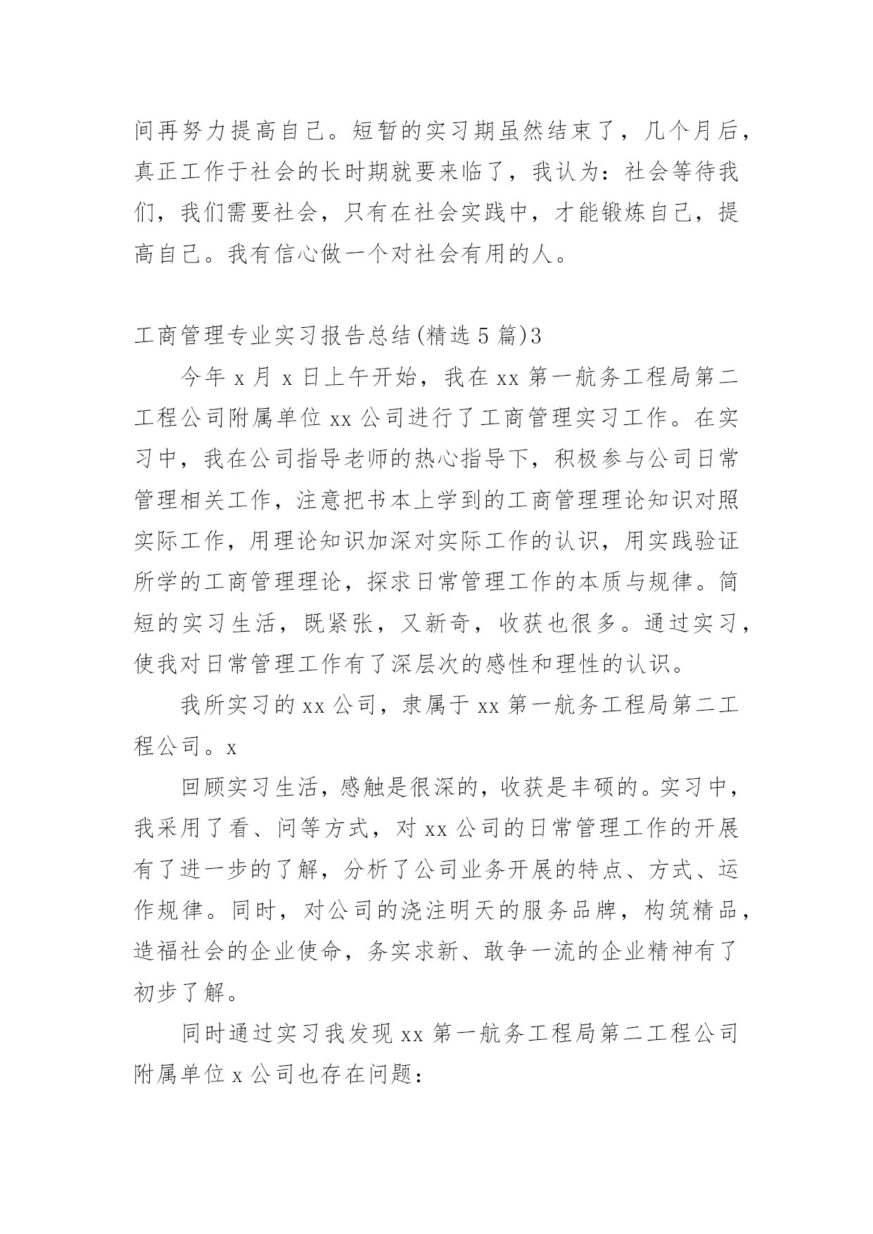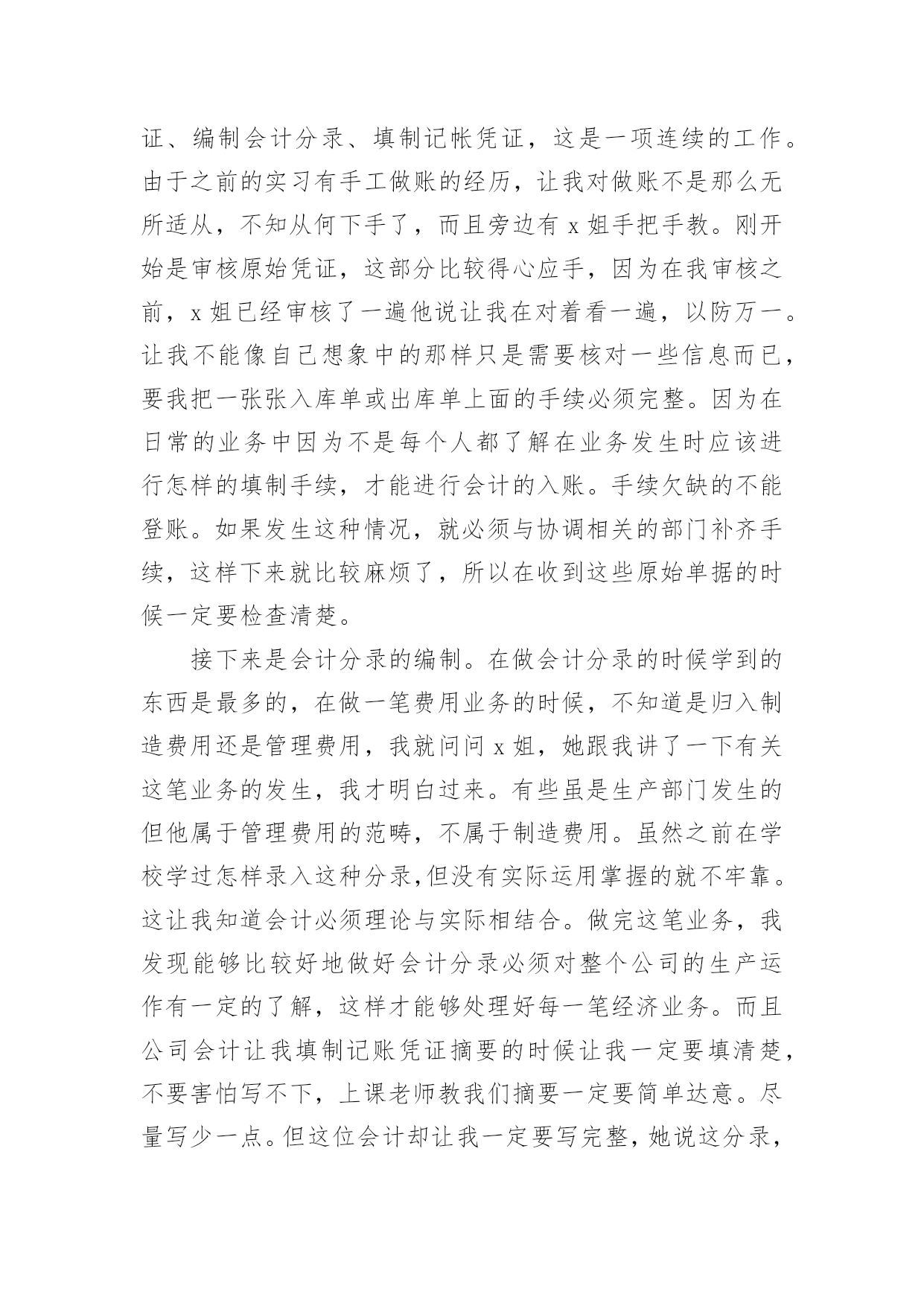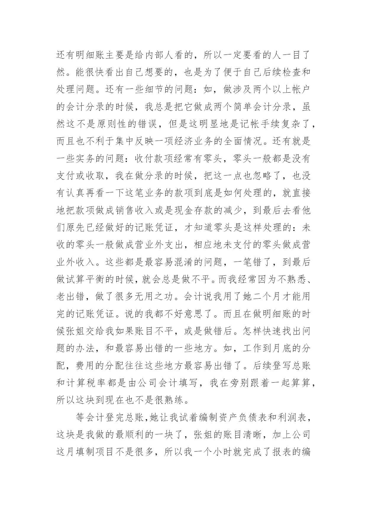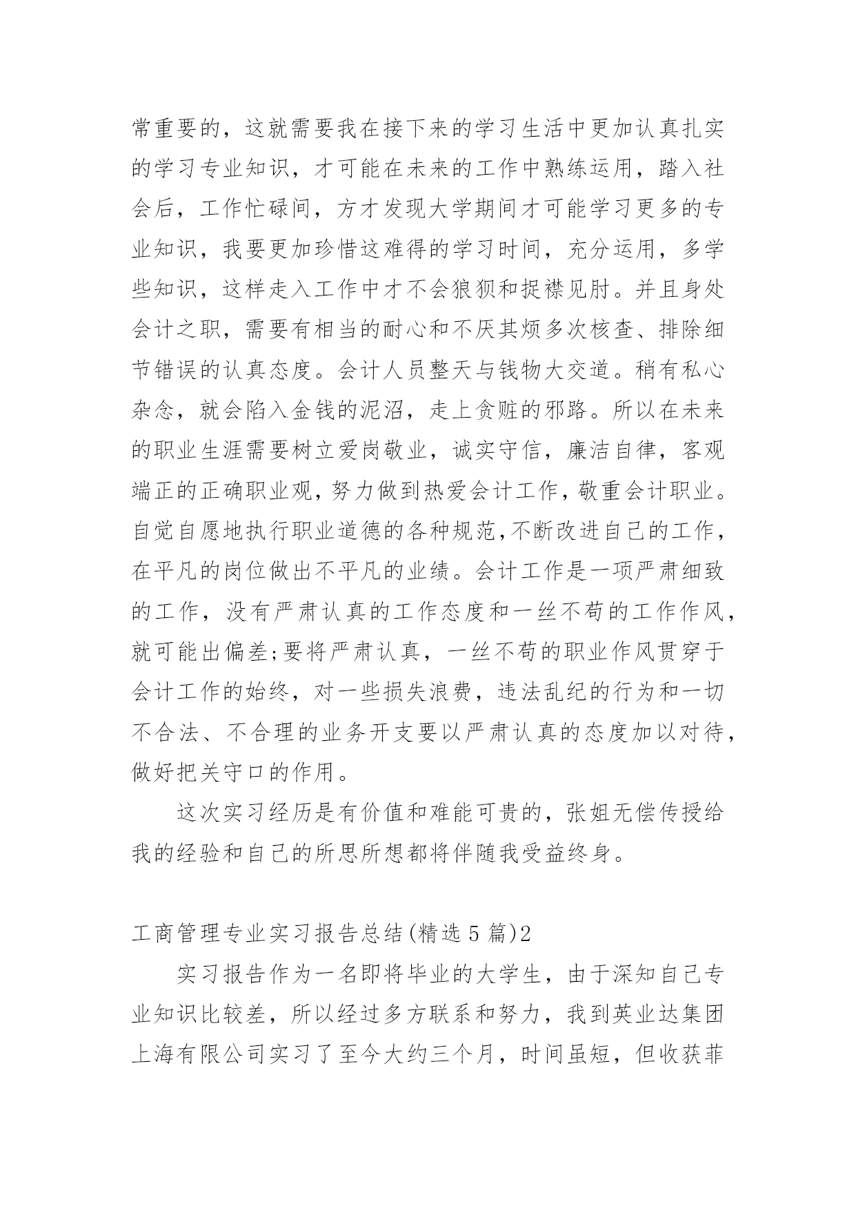 工商管理专业实习报告总结工商管理专业实习报告总结(精选5篇)总结是在某一时期、某一项目或某些工作告一段落或者全部完成后进行回顾检查、分析评价,从而得出教训和一些规律性认识的一种书面材料,通过它可以全面地、系统地了解以往的学习和工作情况,我想我们需要写一份总结了吧。我们该怎么写总结呢?以下是小编整理的工商管理专业实习报告总结(精选5篇),供大家参考借鉴,希望可以帮助到有需要的朋友。工商管理专业实习报告总结(精选5篇)1一、单位介绍xx矿业有限公司是一家煤炭公司,主要经营煤炭及其伴生资源开采;原煤洗选;煤炭产品经营和销售。公司库里火沙免煤矿位于xx市xx西北部距棋盘井镇40公里,东邻矿产资源富集的千里山和xx—拉萨高速公路;西距包兰铁路和110国道1公里;南距乌海机场6公里,毗邻西部煤城乌海市。公司坚持“服务为本,顾客至上”的宗旨。拥有“勤奋、务实、诚信、创新”的企业精神和“勤业、敬业、精业、创业”的员工精神,创造良好的企业环境,以全新的管理模式,完善的技术,周到的服务,卓越的品质为生存根本。二、实习过程与内容我在xx矿业公司进行了为期x月x号到x月x号共x天的实习。由于对公司有些许的了解,这次实习我很快就进入了状态,刚去公司x姐就给我安排了工作,让我跟着她一起做账。闲时,也会给我讲讲实际会计工作中遇到的各种问题,国家每年颁发的各项有关会计的新条文,新的税收政策和这些政策的应用等等。这次的实习让我真正地进入了专业的会计领域。我主要负责的是公司的材料业务工作,这方面接触的成本会计方面就很多。这就与我们在学校学习的成本会计有很大的关系。于是我回到家又把会计基础,成本会计的基础知识粗略的看了一遍。我感觉理论和实际还有一定的差距,有些成本会计讲到的成本计算方法和分析方法在实践中也没遇到。但是常规的会计分录都遇到了。在月末的时候,遇到了月末整理库存资料和结账的好时候,这正是让我好好加强会计实践经验的好时候啊。刚去,x姐就让我将近一个月来的材料以及经手人员、日期等有关的信息进行整理誊抄出来,做好这项工作是很需要耐心、而且要细心,不然很容易就可能输入错误的信息。这一部分不仅涉及以后的产品销售收入核算,也涉及工人工资的计算,影响成本的计算。之前x姐还不敢让我做,但学了一段时间后她说可以让我试试,要让我自己一个人独立完成。所以这一次在她的指导监督下我在一个人做完了这份信息表。等整理完后这一部分的时候,我虽然觉得比较枯燥,但是也不敢懈怠,害怕出错,体会到会计工作所需要的细心和耐心。完成了有关产品资料的整理,接下来做的是审核原始凭证、编制会计分录、填制记帐凭证,这是一项连续的工作。由于之前的实习有手工做账的经历,让我对做账不是那么无所适从,不知从何下手了,而且旁边有x姐手把手教。刚开始是审核原始凭证,这部分比较得心应手,因为在我审核之前,x姐已经审核了一遍他说让我在对着看一遍,以防万一。让我不能像自己想象中的那样只是需要核对一些信息而已,要我把一张张入库单或出库单上面的手续必须完整。因为在日常的业务中因为不是每个人都了解在业务发生时应该进行怎样的填制手续,才能进行会计的入账。手续欠缺的不能登账。如果发生这种情况,就必须与协调相关的部门补齐手续,这样下来就比较麻烦了,所以在收到这些原始单据的时候一定要检查清楚。接下来是会计分录的编制。在做会计分录的时候学到的东西是最多的,在做一笔费用业务的时候,不知道是归入制造费用还是管理费用,我就问问x姐,她跟我讲了一下有关这笔业务的发生,我才明白过来。有些虽是生产部门发生的但他属于管理费用的范畴,不属于制造费用。虽然之前在学校学过怎样录入这种分录,但没有实际运用掌握的就不牢靠。这让我知道会计必须理论与实际相结合。做完这笔业务,我发现能够比较好地做好会计分录必须对整个公司的生产运作有一定的了解,这样才能够处理好每一笔经济业务。而且公司会计让我填制记账凭证摘要的时候让我一定要填清楚,不要害怕写不下,上课老师教我们摘要一定要简单达意。尽量写少一点。但这位会计却让我一定要写完整,她说这分录,还有明细账主要是给内部人看的,所以一定要看的人一目了然。能很快看出自己想要的,也是为了便于自己后续检查和处理问题。还有一些细节的问题:如,做涉及两个以上帐户的会计分录的时候,我总是把它做成两个简单会计分录,虽然这不是原则性的错误,但是这明显地是记帐手续复杂了,而且也不利于集中反映一项经济业务的全面情况。还有就是一些实务的问题:收付款项经常有零头,零头一般都是没有支付或收取,我在做分录的时候,把这一点也忽略了,也没有认真再看一下这笔业务的款项到底是如何处理的,就直接地把款项做成销售收入或是现金存款的减少,到最后去看他们原先已经做好的记账凭证,才知道零头是这样处理的:未收的零头一般做成营业外支出,相应地未支付的零头做成营业外收入。这些都是