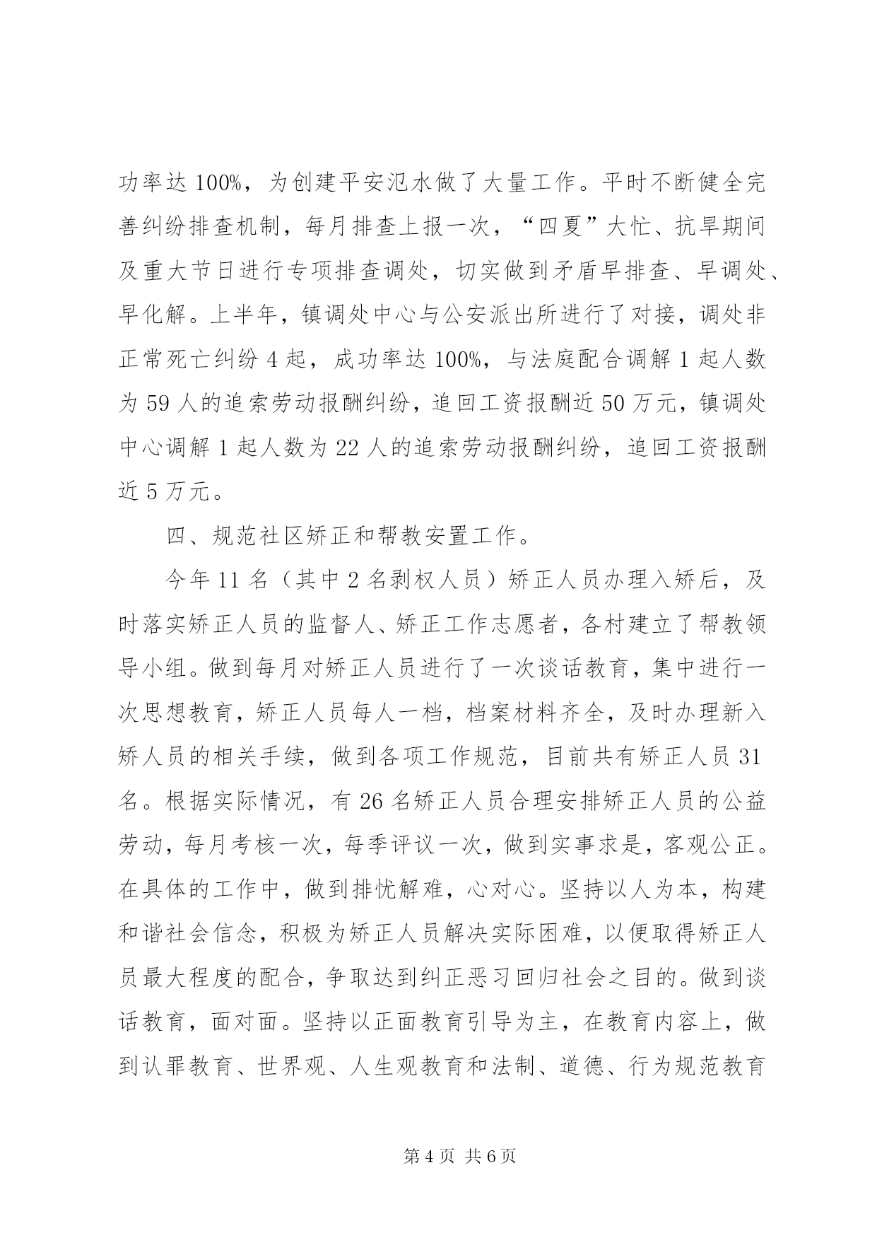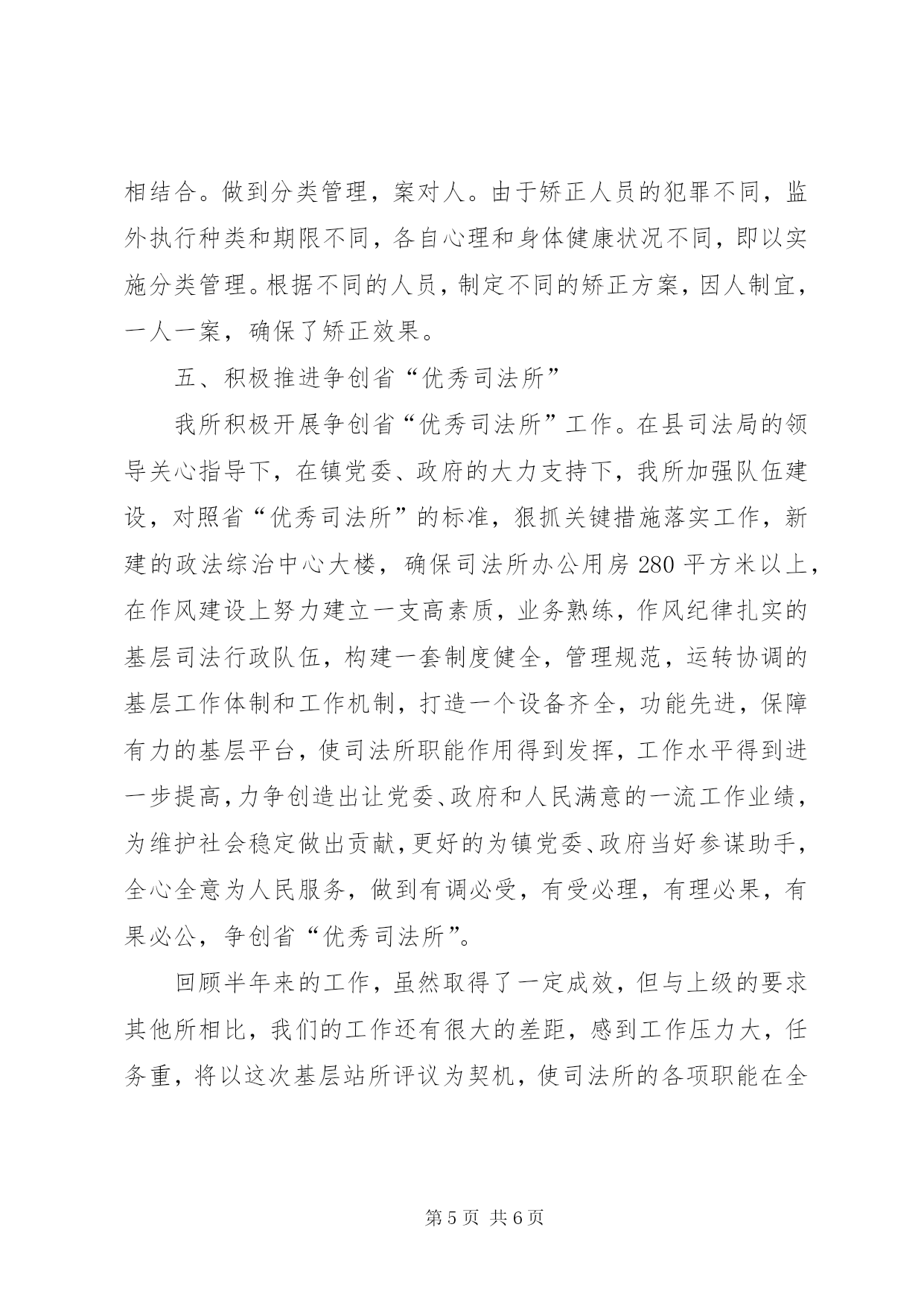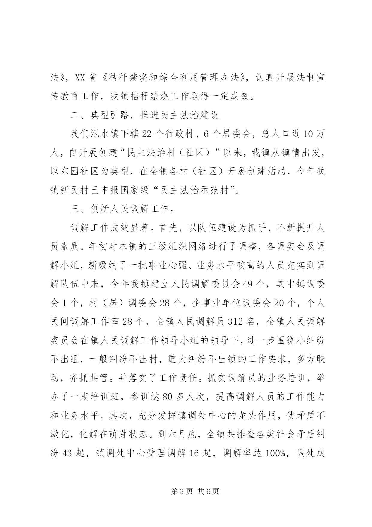 第PAGE\*Arabic\*MERGEFORMAT6页共NUMPAGES\*MERGEFORMAT6页乡镇司法所行风评议述职报告上半年,镇司法所在党委、政府xx县司法局的正确领导下,认真做好司法行政工作,在工作中加强自身的政风、行风建设,提高自身的服务能力和水平,现将司法行政工作情况汇报如下:一、突出重点对象,坚持点面结合,深入开展法制宣传教育工作突出重点对象,坚持点面结合,深入开展法制宣传教育。我们紧紧抓住普法重点,突出普法对象开展“先试点、后推行”的工作方法,多方式,多层次的广泛开展“六五”普法宣传教育。突出抓好以领导干部、行政执法人员、企业经营管理者、青少年、特别是农民为重点对象的普法教育。一是领导干部带头学法。把普法知识学习列入镇党委、政府学习中心组学习计划,按照“一季度学一法”的要求,做到了学法有计划、有内容、有时间,今年以来镇党委中心组除按照学习计划外,还结合分管分工的工作,学习了针对性、适用性、指导性的法律法规。二是一般干部认真学法。一般干部除参加县镇举办的专门法制培训班外,还充分利用机关例会,主要会议定期不定期的学习相关法律法规,对所学知识进行考试。三是行政执法人员重点学法。行政执法人员处在执法的前沿阵地,他们的言行对最终实现依法治镇有着重要的影响,除县法制局举办培训班以外,我们还进行了有关法律知识培训学习,做到“持证上岗,亮证执法,公正执法,文明执法”有力的促进了司法公正和依法执政。四是青少年学生预防性学法。继续加大了对青少年的法制教育,十分注重抓好在校生和青年教职工的普法教育,制定了普法依法治校规划,保证学法有计划、有课时、有内容,将“六五”普法始终贯穿于教学之中,充分发挥课堂主渠道作用,还积极聘请派出所乐树龙等7名同志任中小学法制副校长和法制班主任。定期举办专题讲座,宣传法律知识,进行法制教育,通过主题班会、橱窗、黑板报、小广播等宣传阵地加强在校生的普法教育,特别是利用课间操开设法制小广播节目,以上种种措施取得了很好效果,今年以来,氾水镇校园环境安全平和,无一中小学生违法犯罪,加强青少年教育,特别是开展社会青少年“催优”工程工作。今年我镇对有特殊情况25周岁以下的社会青少年进行排查摸底,共排查7名“催优“对象,分别有相应镇、村干部进行一对一帮教,帮教效果明显。五是突出重点,加强对农民的普法宣传教育。围绕社会主义新农村建设,加大与“三农”有关的法律法规的宣传教育,提高农民的法律素质,促进农业发展,针对农村特点,在农民中深入开展“学法律、讲权利、讲义务、讲责任”活动,努力营造新农村建设以群教群。今年我镇围绕《中华人民共和国大气污染防治法》,XX省《秸秆禁烧和综合利用管理办法》,认真开展法制宣传教育工作,我镇秸秆禁烧工作取得一定成效。二、典型引路,推进民主法治建设我们氾水镇下辖22个行政村、6个居委会,总人口近10万人,自开展创建“民主法治村(社区)”以来,我镇从镇情出发,以东园社区为典型,在全镇各村(社区)开展创建活动,今年我镇新民村已申报国家级“民主法治示范村”。三、创新人民调解工作。调解工作成效显著。首先,以队伍建设为抓手,不断提升人员素质。年初对本镇的三级组织网络进行了调整,各调委会及调解小组,新吸纳了一批事业心强、业务水平较高的人员充实到调解队伍中来,今年我镇建立人民调解委员会49个,其中镇调委会1个,村(居)调委会28个,企事业单位调委会20个,个人民间调解工作室28个,全镇人民调解员312名,全镇人民调解委员会在镇人民调解工作领导小组的领导下,进一步围绕小纠纷不出组,一般纠纷不出村,重大纠纷不出镇的工作要求,多方联动,齐抓共管。并落实了工作责任。抓实调解员的业务培训,举办了一期培训班,参训达80多人次,提高调解人员的工作能力和业务水平。其次,充分发挥镇调处中心的龙头作用,使矛盾不激化,化解在萌芽状态。到六月底,全镇共排查各类社会矛盾纠纷43起,镇调处中心受理调解16起,调解率达100%,调处成功率达100%,为创建平安氾水做了大量工作。平时不断健全完善纠纷排查机制,每月排查上报一次,“四夏”大忙、抗旱期间及重大节日进行专项排查调处,切实做到矛盾早排查、早调处、早化解。上半年,镇调处中心与公安派出所进行了对接,调处非正常死亡纠纷4起,成功率达100%,与法庭配合调解1起人数为59人的追索劳动报酬纠纷,追回工资报酬近50万元,镇调处中心调解1起人数为22人的追索劳动报酬纠纷,追回工资报酬近5万元。四、规范社区矫正和帮教安置工作。今年11名(其中2名剥权人员)矫正人员办理入矫后,及时落实矫正人员的监督人、矫正工作志愿者,各村建立了帮教领导小组。做到每月对矫正人员进行了一次谈话教育,集中进行一次思想教育,矫正人员每人一档,档案材料齐全,及时办理新入矫人员的相关手续,做到各项工作