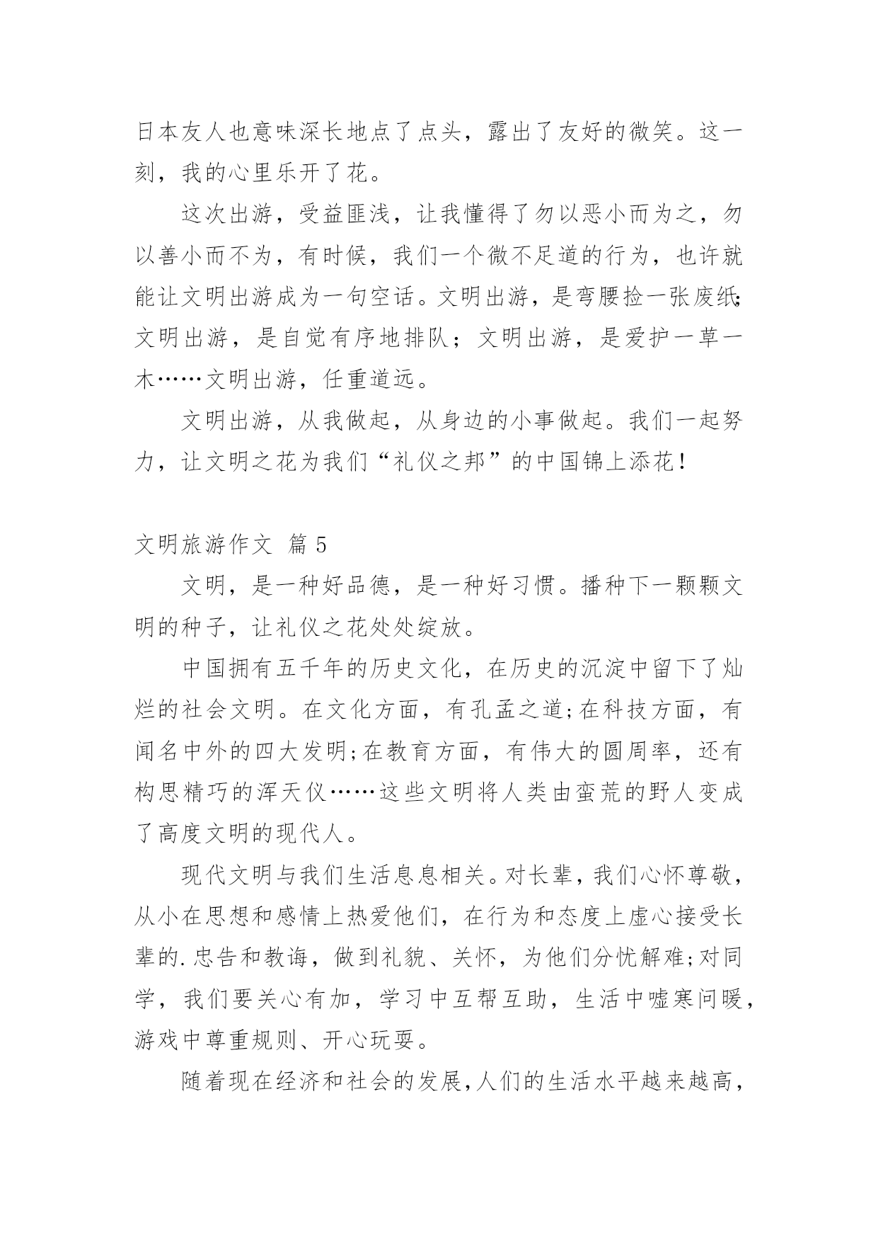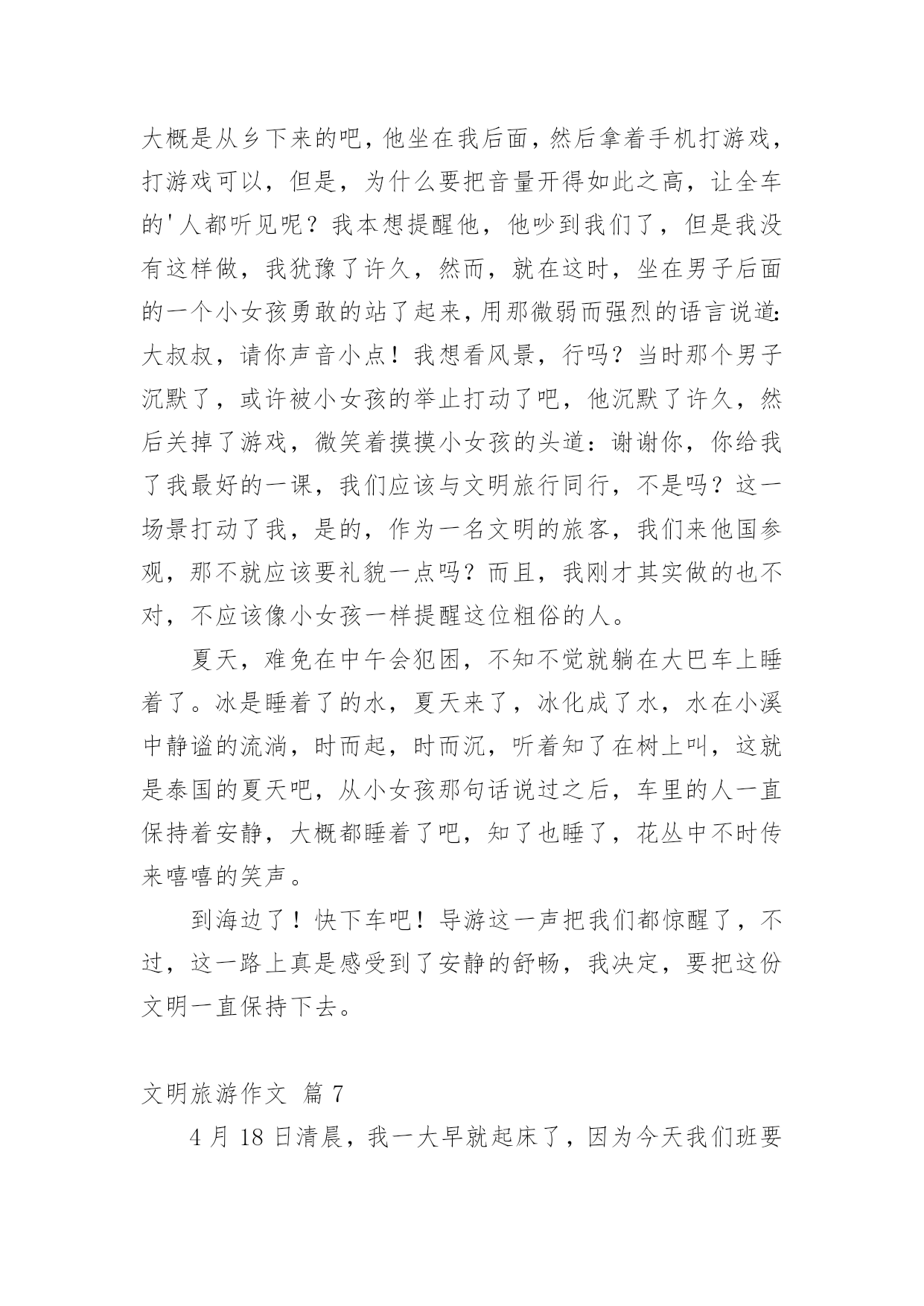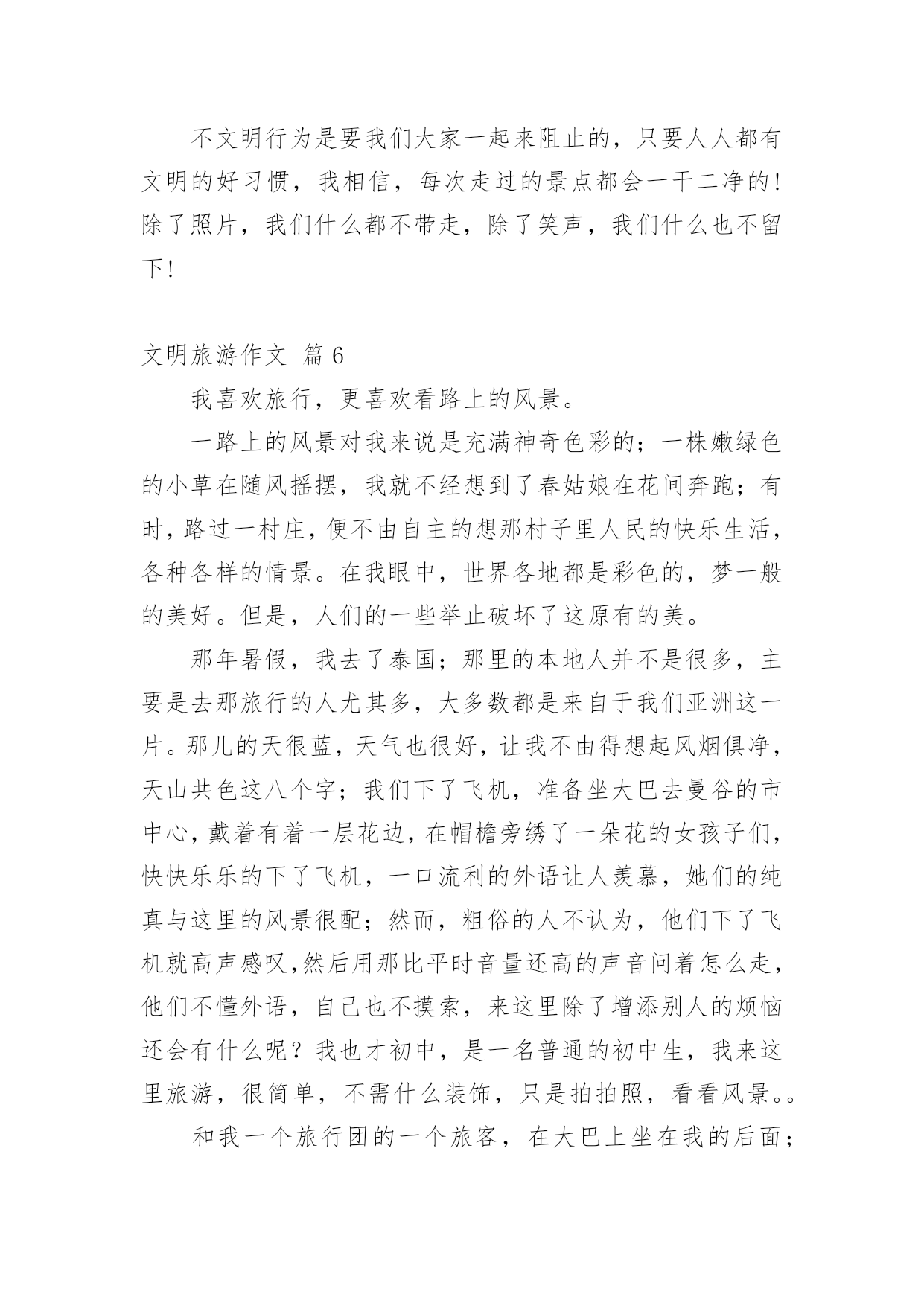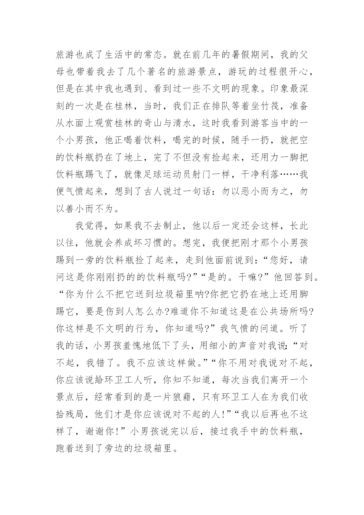 文明旅游作文文明旅游作文集合七篇在日常学习、工作抑或是生活中,大家对作文都不陌生吧,借助作文人们可以实现文化交流的目的。那么,怎么去写作文呢?以下是小编收集整理的文明旅游作文7篇,仅供参考,欢迎大家阅读。文明旅游作文篇1过年了,我们全家去了佛山的梁园玩。佛山梁园是岭南四大名园之首,占地面积为21260平方米,梁园主要由“十二石斋”、“汾江草庐”、“寒香馆”等多个群体组成,秀水、名帖、奇石堪称梁园三宝。我们在此游历觉得神清气朗。我们走着走着,看见了一间别致清雅的竹屋,这间屋子全部都是由竹子建成的,走进去是一条长廊,走廊过去就是屋的主体部分。长廊两边是漂亮的竹子,我觉得很舒服便走过去细细观赏,走近一看,心都凉了。清秀美丽的竹竿上全是游客们刻下留念的字体,原本赏竹的雅兴荡然无全了。竹子天性坚韧不屈,姿态优雅而清秀,我很是喜欢。但今天看到自己最喜欢的竹子被不文明的.游客们糟蹋,我很是心疼和惋惜:这虽然是一些普通的竹子,但他也是有生命的,他也知道疼,但是一些人为了一个毫无意义的纪念,却狠心伤害这些可爱坚强的竹子!我轻轻抚摩这些受过伤害的竹子,他让我感受到了“千磨万击还坚劲”的精神,虽然他在生命中受到过痛彻心扉的伤痛,但是他还是坚强的活了下来。正在我思考的时候,旁边有个可爱的小男孩,也看到了这些伤痕累累的竹子,并没有感到深深的惋惜,而是他拿出了一把小刀……我竟然情不自禁的走了上去拦住了他,我说:“竹子也是一种生灵,他一样也有生命,古人云:‘咬定青山不放松,立根原在破岩中’,他是一种灵性的生物,请不要伤害它。我们要主张文明旅行,文明参观,不能随意破坏景物、乱扔垃圾、随意触摸物品等等。所以请不要刻这些竹子……”当我努力的劝导时,小男孩爸爸也走过来了,他听说了这件事之后,对我竖起了大拇指,他对小男孩说:“我们是文明人是吗?”小男孩点点头。小男孩爸爸:“我们要文明的旅游,不能破坏景物。看着小男孩远去的背影,我呼吁:我们要文明旅行,不要破坏景物、设施,哪怕是一棵小小的竹子,并督促身边的人也做到文明,这样,文明将会成为最美的风景线!文明旅游作文篇2文明与旅游同行,就是要向路途中不文明的行为说不。文明就表现在我们生活中的点点滴滴,就如乱扔垃圾,你所扔掉的不仅仅只是垃圾,还有公德心;乱涂乱画,你画上的不只是笔迹,还有羞和耻……对于这些行为,众人就要敢于起身对其说不,当不文明行为成为过街老鼠,文明行为才更有可能遍地开花。文明,是个简单不过的词语,人人会说人人知道,可是有多少人能够做到呢?答案必定是少之又少,寥寥无几。人们的个人的.方便、利益远远地超过了文明所在地位。常常,人们会为了一时之快、一时之便,就把污染留在了宽敞的大街、芬芳的花丛、嫩绿的草丛等等的公共场所,实为不雅。文明,是个十分重要的词语,可是它却经常被人们忽视,抛之于脑后,让我们重视起这个不可缺少的词语吧!只有文明才能让我们的城市不是金玉其外、败絮其中,使我们的城市不仅是工业发展得迅速,并且人们的素质也是芝麻开花——节节高;城市也如同人类一样,要内外兼得,就必须人人将“文明”一词牢记在心上。有时,一条小溪的梦想就是希望人们不要再往它的肚子里倒垃圾;一只小鸟的梦想就是希望人们不要再砍伐森林毁了他们的家了,等等等等,为什么我们就不能实现他们的梦想呢?我认为大家讲文明,不就圆了他们的梦了吗?文明是什么?文明是路上相遇时的微笑,是同学有难时的热情帮助,是平时与人相处时的亲切,是见到师长时的问早问好,是不小心撞到对方时的一声“对不起”,是自觉将垃圾放入垃圾箱的举动,是看到有人随地吐痰时的主动制止……文明是一种品质,文明是一种修养,文明是一种受人尊敬并被大家广泛推崇的行为。一次,我在汽车站里,人们都在排队等候上车,可是有4个男子却站在了“母子候车处”的位置等车。而一位抱着孩子的妈妈却被他们挤到了路边。眼里流露出无奈。他们是文盲吗?不认得上面的字吗?很显然,他们不是,只是文明盲而已。所以,同学们,文明不是说在嘴里,而是见于行动,旅游行业从业者要不忘自我约束,游客在背起背包时也要记得带上文明和公德心,每一个人都从点滴和自我做起,与文明同行的旅游定然会美不胜。文明旅游作文篇3小时候,爸爸妈妈一直教导我:要做一名讲文明的好孩子。我认为,文明不需要刻意的去完成,是在生活中最最渺小而简单的一个习惯。文明就是在路上相遇时的亲切微笑;是别人有困难时伸出的援助之手;是对帮助过自己的人心存感恩;是与人相处时的谦让和睦;是自觉将垃圾放入垃圾箱的随手举动……。清明小长假,爸爸妈妈带我去云黄山玩,在山脚下便能看到山顶上云雾缭绕、云海茫茫,美如仙境,真是不枉此名啊!我想山上一定非常美丽,就迫不及待的和爸爸向山上进军。当我们走到一条羊肠小道时,我小心翼翼的抓着木头扶手慢慢往前走,忽然发现扶手上竟被刻满了字,有“某某到此一游”,有刻的