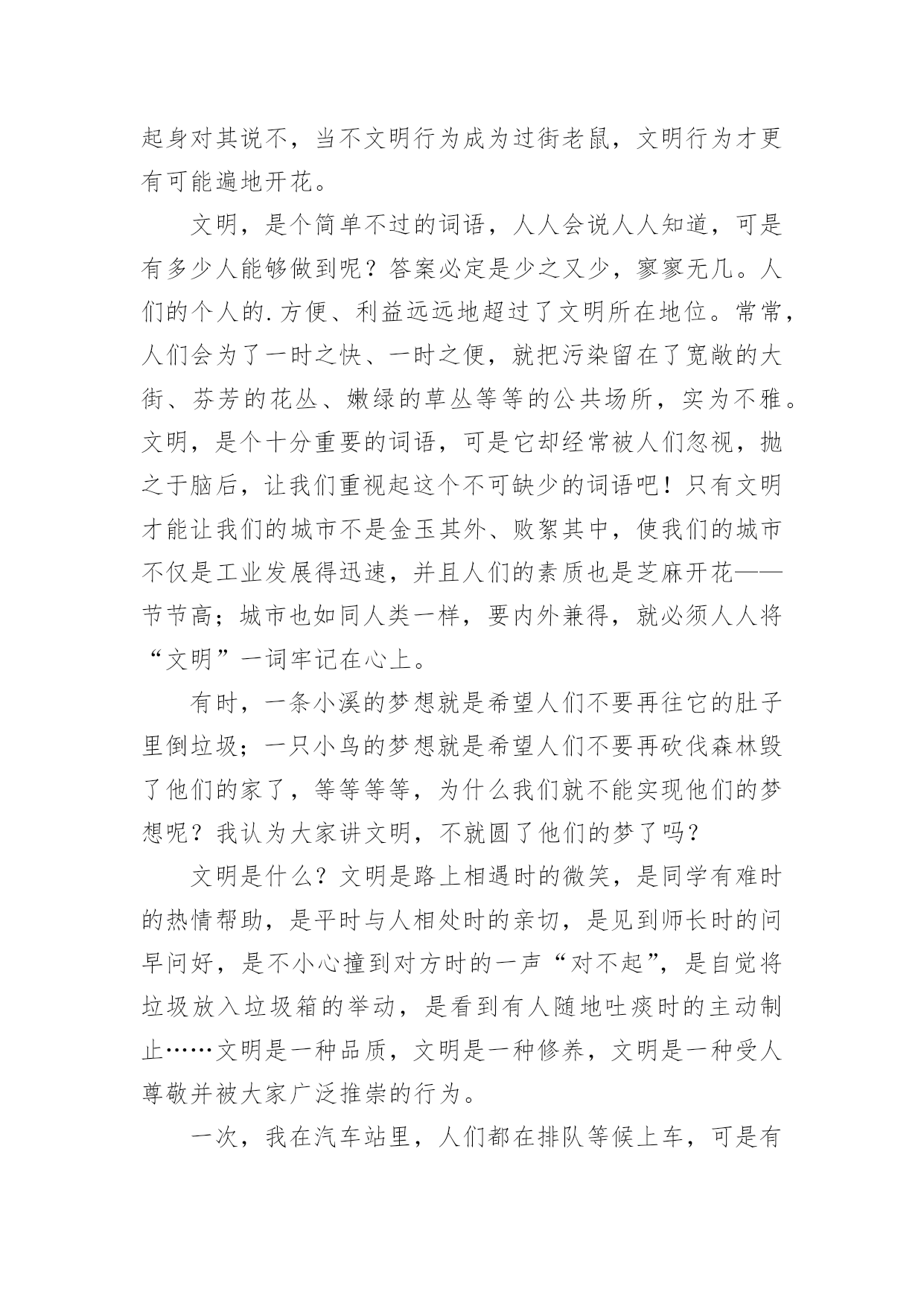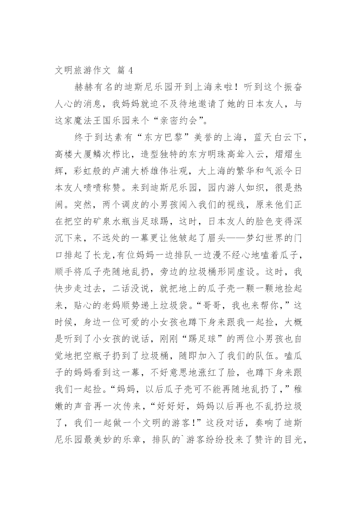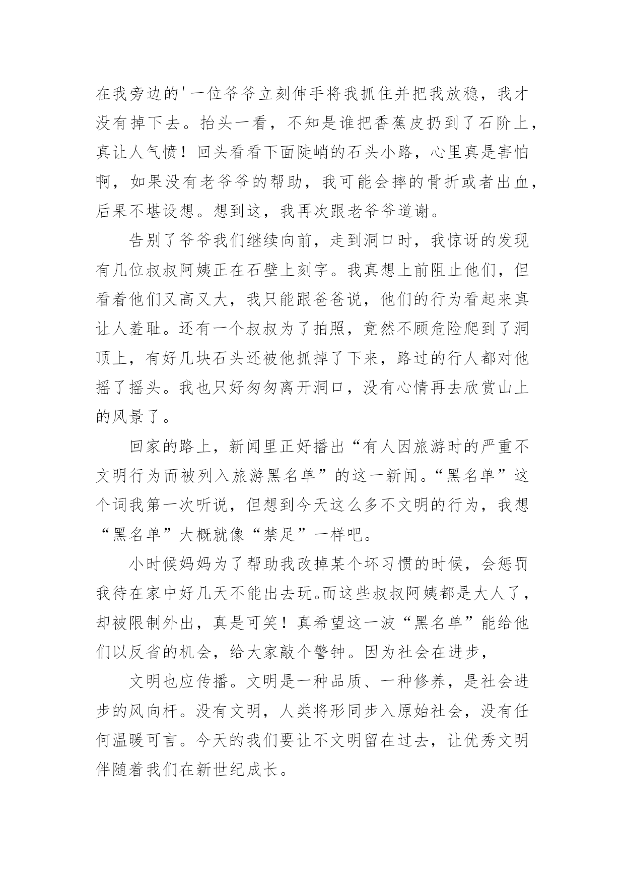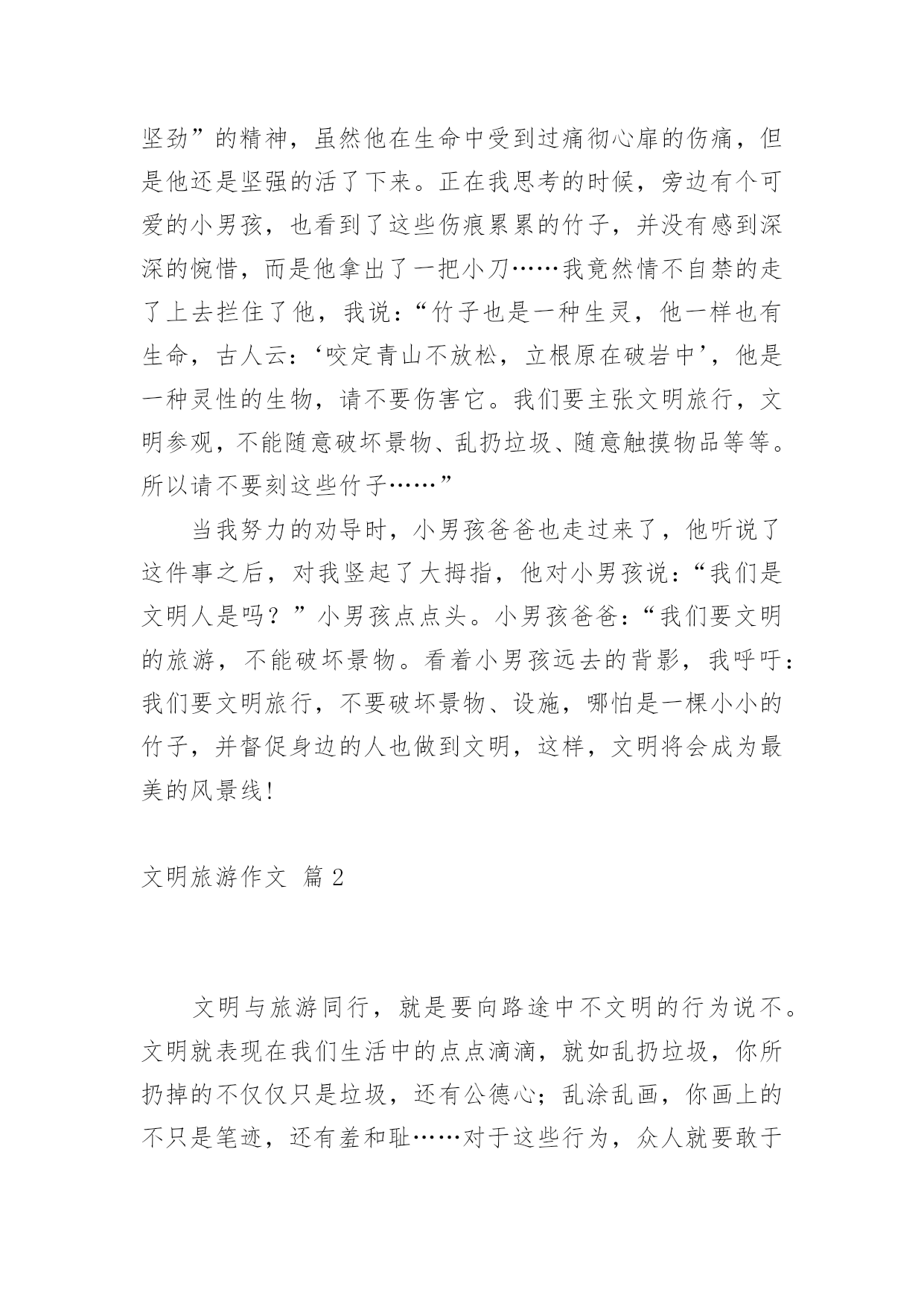 文明旅游作文文明旅游作文集合七篇在日常学习、工作抑或是生活中,大家对作文都不陌生吧,借助作文人们可以实现文化交流的目的。那么,怎么去写作文呢?以下是小编收集整理的文明旅游作文7篇,仅供参考,欢迎大家阅读。文明旅游作文篇1过年了,我们全家去了佛山的梁园玩。佛山梁园是岭南四大名园之首,占地面积为21260平方米,梁园主要由“十二石斋”、“汾江草庐”、“寒香馆”等多个群体组成,秀水、名帖、奇石堪称梁园三宝。我们在此游历觉得神清气朗。我们走着走着,看见了一间别致清雅的竹屋,这间屋子全部都是由竹子建成的,走进去是一条长廊,走廊过去就是屋的主体部分。长廊两边是漂亮的竹子,我觉得很舒服便走过去细细观赏,走近一看,心都凉了。清秀美丽的竹竿上全是游客们刻下留念的字体,原本赏竹的雅兴荡然无全了。竹子天性坚韧不屈,姿态优雅而清秀,我很是喜欢。但今天看到自己最喜欢的竹子被不文明的.游客们糟蹋,我很是心疼和惋惜:这虽然是一些普通的竹子,但他也是有生命的,他也知道疼,但是一些人为了一个毫无意义的纪念,却狠心伤害这些可爱坚强的竹子!我轻轻抚摩这些受过伤害的竹子,他让我感受到了“千磨万击还坚劲”的精神,虽然他在生命中受到过痛彻心扉的伤痛,但是他还是坚强的活了下来。正在我思考的时候,旁边有个可爱的小男孩,也看到了这些伤痕累累的竹子,并没有感到深深的惋惜,而是他拿出了一把小刀……我竟然情不自禁的走了上去拦住了他,我说:“竹子也是一种生灵,他一样也有生命,古人云:‘咬定青山不放松,立根原在破岩中’,他是一种灵性的生物,请不要伤害它。我们要主张文明旅行,文明参观,不能随意破坏景物、乱扔垃圾、随意触摸物品等等。所以请不要刻这些竹子……”当我努力的劝导时,小男孩爸爸也走过来了,他听说了这件事之后,对我竖起了大拇指,他对小男孩说:“我们是文明人是吗?”小男孩点点头。小男孩爸爸:“我们要文明的旅游,不能破坏景物。看着小男孩远去的背影,我呼吁:我们要文明旅行,不要破坏景物、设施,哪怕是一棵小小的竹子,并督促身边的人也做到文明,这样,文明将会成为最美的风景线!文明旅游作文篇2文明与旅游同行,就是要向路途中不文明的行为说不。文明就表现在我们生活中的点点滴滴,就如乱扔垃圾,你所扔掉的不仅仅只是垃圾,还有公德心;乱涂乱画,你画上的不只是笔迹,还有羞和耻……对于这些行为,众人就要敢于起身对其说不,当不文明行为成为过街老鼠,文明行为才更有可能遍地开花。文明,是个简单不过的词语,人人会说人人知道,可是有多少人能够做到呢?答案必定是少之又少,寥寥无几。人们的个人的.方便、利益远远地超过了文明所在地位。常常,人们会为了一时之快、一时之便,就把污染留在了宽敞的大街、芬芳的花丛、嫩绿的草丛等等的公共场所,实为不雅。文明,是个十分重要的词语,可是它却经常被人们忽视,抛之于脑后,让我们重视起这个不可缺少的词语吧!只有文明才能让我们的城市不是金玉其外、败絮其中,使我们的城市不仅是工业发展得迅速,并且人们的素质也是芝麻开花——节节高;城市也如同人类一样,要内外兼得,就必须人人将“文明”一词牢记在心上。有时,一条小溪的梦想就是希望人们不要再往它的肚子里倒垃圾;一只小鸟的梦想就是希望人们不要再砍伐森林毁了他们的家了,等等等等,为什么我们就不能实现他们的梦想呢?我认为大家讲文明,不就圆了他们的梦了吗?文明是什么?文明是路上相遇时的微笑,是同学有难时的热情帮助,是平时与人相处时的亲切,是见到师长时的问早问好,是不小心撞到对方时的一声“对不起”,是自觉将垃圾放入垃圾箱的举动,是看到有人随地吐痰时的主动制止……文明是一种品质,文明是一种修养,文明是一种受人尊敬并被大家广泛推崇的行为。一次,我在汽车站里,人们都在排队等候上车,可是有4个男子却站在了“母子候车处”的位置等车。而一位抱着孩子的妈妈却被他们挤到了路边。眼里流露出无奈。他们是文盲吗?不认得上面的字吗?很显然,他们不是,只是文明盲而已。所以,同学们,文明不是说在嘴里,而是见于行动,旅游行业从业者要不忘自我约束,游客在背起背包时也要记得带上文明和公德心,每一个人都从点滴和自我做起,与文明同行的旅游定然会美不胜。文明旅游作文篇3小时候,爸爸妈妈一直教导我:要做一名讲文明的好孩子。我认为,文明不需要刻意的去完成,是在生活中最最渺小而简单的一个习惯。文明就是在路上相遇时的亲切微笑;是别人有困难时伸出的援助之手;是对帮助过自己的人心存感恩;是与人相处时的谦让和睦;是自觉将垃圾放入垃圾箱的随手举动……。清明小长假,爸爸妈妈带我去云黄山玩,在山脚下便能看到山顶上云雾缭绕、云海茫茫,美如仙境,真是不枉此名啊!我想山上一定非常美丽,就迫不及待的和爸爸向山上进军。当我们走到一条羊肠小道时,我小心翼翼的抓着木头扶手慢慢往前走,忽然发现扶手上竟被刻满了字,有“某某到此一游”,有刻的