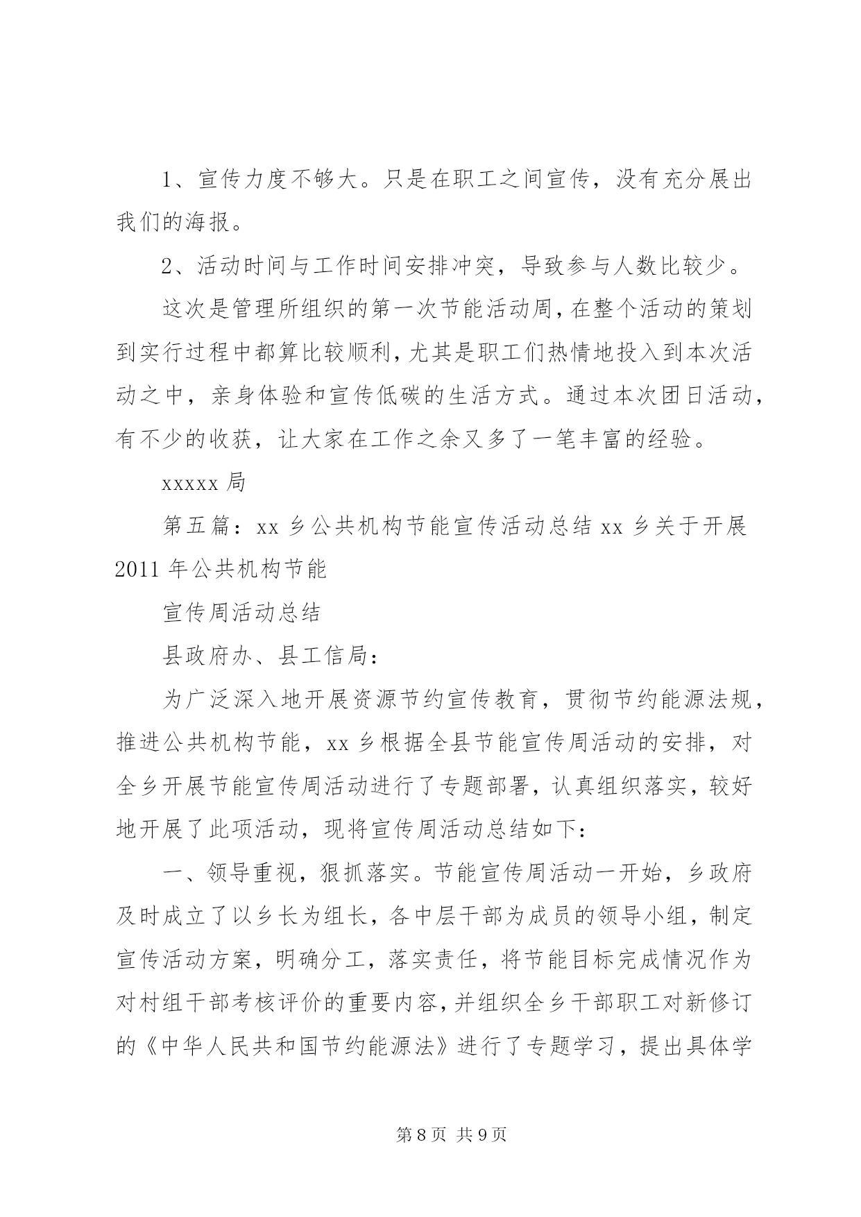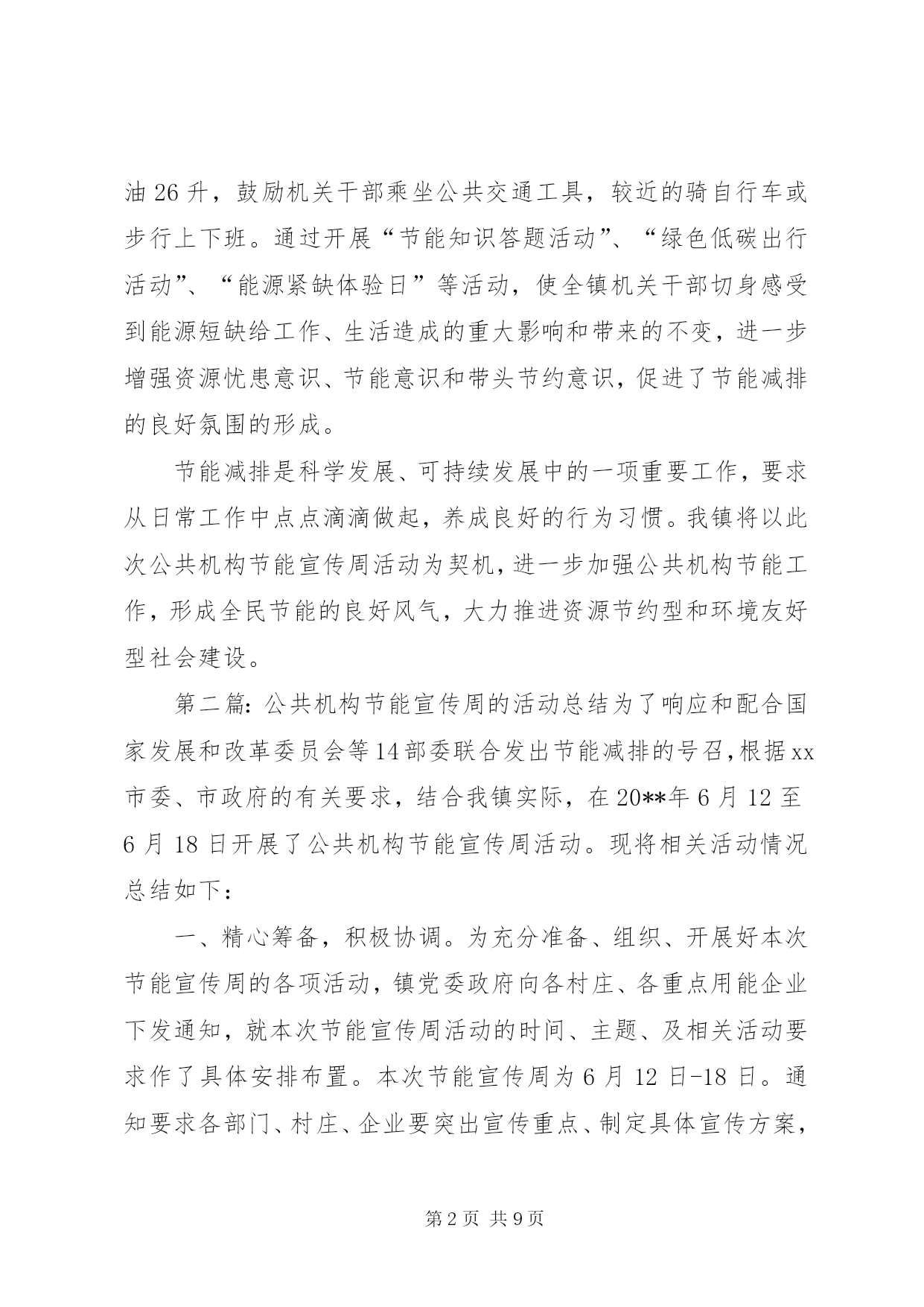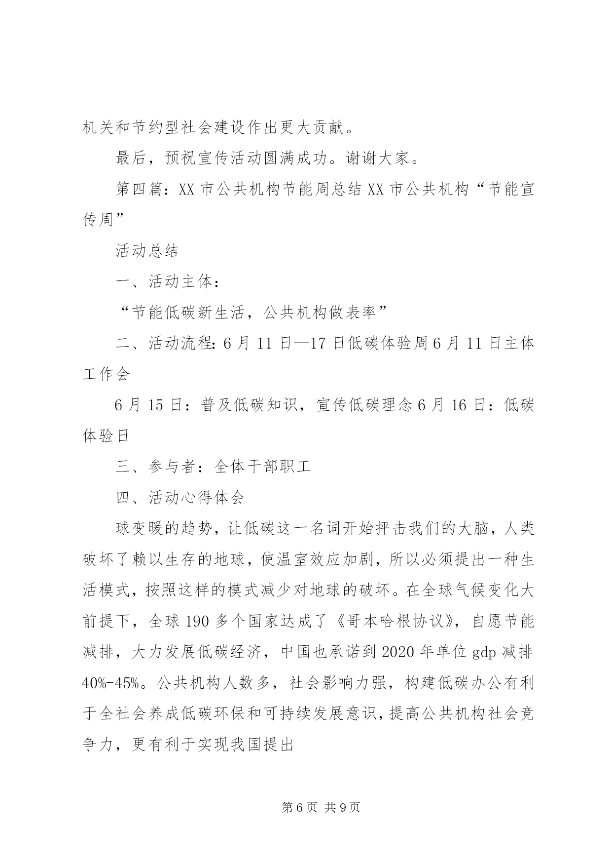 第PAGE\*Arabic\*MERGEFORMAT9页共NUMPAGES\*MERGEFORMAT9页开展公共机构节能宣传周的活动总结一、领导重视、狠抓落实。节能工作是一项重要工作任务,也是需要长抓不懈的细微工作。我镇在活动开始就结合贯彻落实《关于开展20xx年公共机构节能宣传周活动的通知》的各项工作。把开展节能宣传周活动提上重要日程,统一安排,周密部署,确保取得良好宣传效果。接到通知后,我镇领导高度重视,成立领导小组,加强组织领导,并以身作则,积极参加低碳体验等宣传活动,充分发挥模范带头作用。二、广泛宣传、增强意识。为增强全镇干部职工责任意识、节能意识,养成良好的节能习惯,形成浓厚的节能氛围,我镇以贯彻《党政机关厉行节约反对浪费条例》精神为重点,通过张贴宣传标语,挂宣传横额、做宣传展板等形式,广泛宣传节能形式以及加强公共机构节能工作的重要性、必要性。宣传活动周期间,在政府大院内摆出宣传展板1幅。三、围绕主题、组织活动。我镇围绕xx这个主题组织开展了一系列形式多样的宣传活动。xx月xx日,组织全体机关干部学习节能知识,加强节能意识,并开展节能知识答题活动。xx月xx日“全国低碳日”当天我镇政府停开空调15台,节电120度,停开公务用车2辆,节油26升,鼓励机关干部乘坐公共交通工具,较近的骑自行车或步行上下班。通过开展“节能知识答题活动”、“绿色低碳出行活动”、“能源紧缺体验日”等活动,使全镇机关干部切身感受到能源短缺给工作、生活造成的重大影响和带来的不变,进一步增强资源忧患意识、节能意识和带头节约意识,促进了节能减排的良好氛围的形成。节能减排是科学发展、可持续发展中的一项重要工作,要求从日常工作中点点滴滴做起,养成良好的行为习惯。我镇将以此次公共机构节能宣传周活动为契机,进一步加强公共机构节能工作,形成全民节能的良好风气,大力推进资源节约型和环境友好型社会建设。第二篇:公共机构节能宣传周的活动总结为了响应和配合国家发展和改革委员会等14部委联合发出节能减排的号召,根据xx市委、市政府的有关要求,结合我镇实际,在20**年6月12至6月18日开展了公共机构节能宣传周活动。现将相关活动情况总结如下:一、精心筹备,积极协调。为充分准备、组织、开展好本次节能宣传周的各项活动,镇党委政府向各村庄、各重点用能企业下发通知,就本次节能宣传周活动的时间、主题、及相关活动要求作了具体安排布置。本次节能宣传周为6月12日-18日。通知要求各部门、村庄、企业要突出宣传重点、制定具体宣传方案,广泛通过报纸、网络等媒体,开展宣传。要以本次节能宣传周为契机,在全社会营造声势浩大和良好的节能氛围,使广大民众了解、认识、接受节能环保观念,自觉参与到节能环保行列中来。为切实搞好本次节能宣传周活动,镇党委政府高度重视,相关工作人员积极与相关部门单位协调、衔接,作了大量的工作,务求各项准备工作充分、到位、有序。二、活动成功,规模空前。开展了节能宣传手册和节能产品发放活动,本次节能活动周活动,共挂了近50条横幅,镇党委、各企业门口立放着节能宣传图板、图片,有序摆放着商品展台,身披彩带的礼仪人员,向过往群众发放节能宣传手册,活动现场秩序井然,各界群众积极涌跃。节能活动周期间,共向广大居民共发放了15000份节能环保手册及资料,10000条象征环保、健康的绿丝带,2000个环保袋,受到了广泛欢迎。三、各村庄、企业参与。节能宣传周期间,各村庄、企业也开展了相关节能宣传活动。他们专门安排布置,组织节能宣传,在各自的宣传栏张贴节能宣传图片,以图文并茂、通俗易懂、贴近生活的形式,多方面宣传节能知识,大力开展节能宣传活动。四、活动卓有成效,影响深远。不论是活动规模、宣传力度、展示的节能产品种类及品种数量、参观人数、社会影响,本次节能宣传周都超过以往历届。之所以取得如此成效,主要因为方面领导高度重视,另一方面各村庄、企业精心筹备、积极协调。第三篇:“公共机构节能宣传活动”讲话稿“公共机构节能宣传活动”讲话稿尊敬的徐毅局长,各位领导、同志们:根据国务院的统一部署,6月11日—17日,开展全国“公共机构节能宣传周”活动。今天,我们在这里举办XX市暨XX县区公共机构节能宣传活动,是我市“节能宣传周”活动的重要组成部分,目的是宣传节能法规,增强节能意识,推广节能新产品,倡导节能新风尚,深入推进公共机构节能工作,切实发挥公共机构在建设节约型社会中表率作用。在此,我代表县委、县政府,对这次活动的成功举办,表示最热烈的祝贺。对市机关事务管理局多年来给予商河工作的支持和关心,表示最衷心的感谢。深入推进公共机构节能工作,是贯彻落实科学发展观,加快建设节约型社会的重要举措,也是加强政府自身建设,推动全社会节能工作的必然要求,意义重大,任务艰巨,使命光荣。近几年来,我县大力推