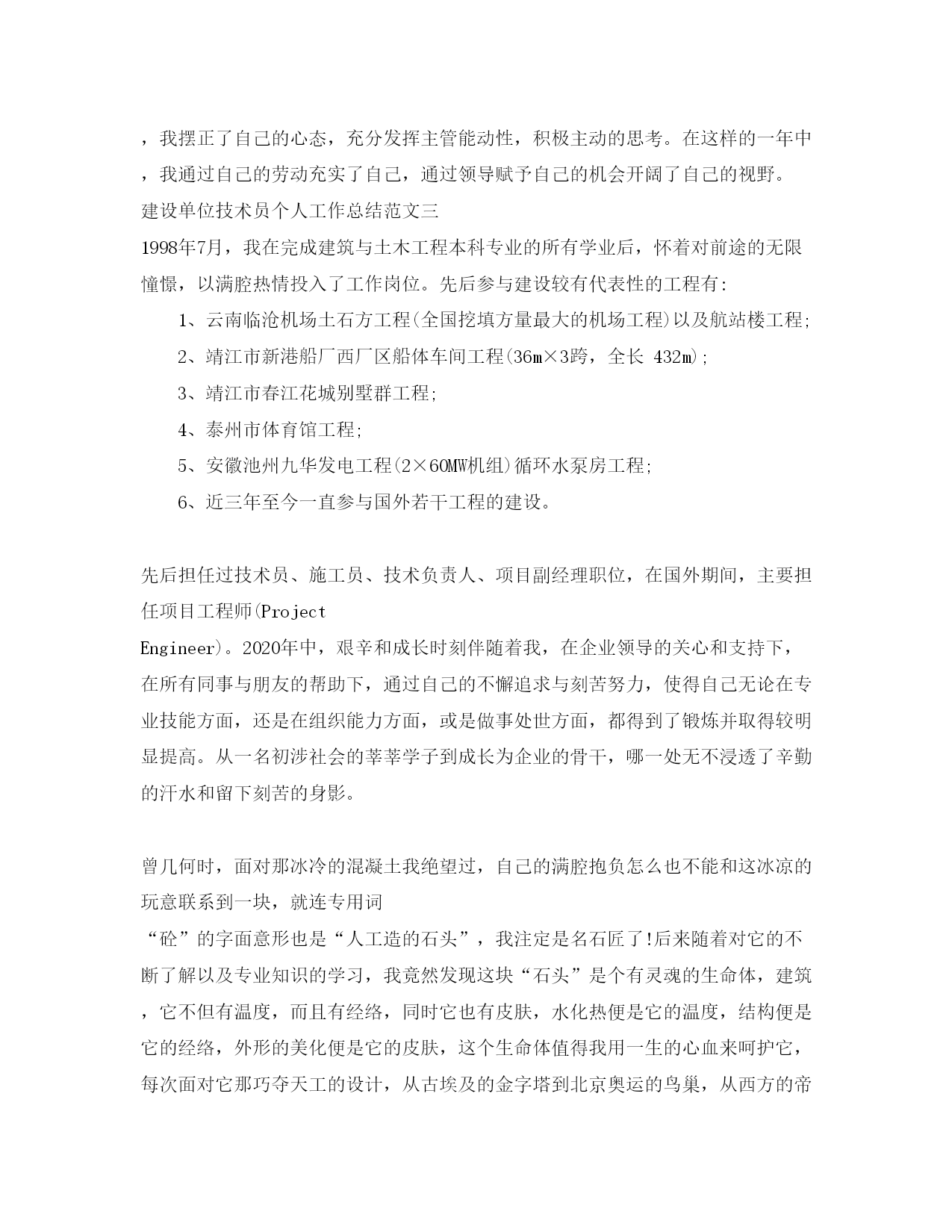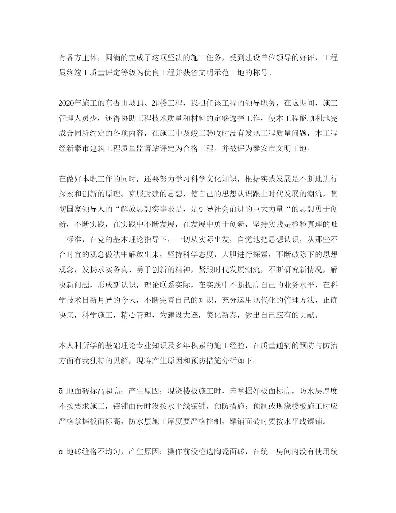 此资料由网络收集而来,如有侵权请告知上传者立即删除。资料共分享,我们负责传递知识。建设单位技术员个人工作总结在每个阶段工作完成后,认真总结自己的不足之处,吸取教训,及时纠正。为成为一名优秀的建筑技术人员而努力。今天小编给大家为您整理了建设单位技术员个人工作总结,希望对大家有所帮助。建设单位技术员个人工作总结范文一从学校毕业后,在新泰市市中二建公司工程公司工作,我从事建筑行业管理工作至今十八年了,在这十八年中,自己将在实践中所学到的各项专业理论知识与施工生产实践相结合,充分发挥自己的作用,为新泰建设与发展贡献了很大的力量,我现在是新泰市市中二建公司技术科工作,任科长。自参加建筑施工工作以来,学习了大量有关书籍,例如《现行建筑施工规范大全》、《工程建设质量检验评定标准》《中华人民共和国建筑法》《中华人民共和国建筑质量管理条例》《建筑安全法》《劳动法》《建筑行业强制性标准条文》等等。2020年参加山东省建设厅干部培训中心举办的“全国建设施工企业二级建造师培训,系统地学习有关施工方面的知识,主要有《施工项目管理概论》《工程招投标与合同管理》《施工组织设计与进度管理》《计算机辅助施工项目管理》等。通过学习,使自己的专业理论和专业技术知识水平达到了工程师的标准,并通过了全国统一二级建造师考试获,注册二级建造师资格。近几年主要负责公司工程质量、安全管理工作,工程管理必须从技术质量、安全、施工人力、物力管理入手,制定并实施公司内部安全生产规章制度、安全操作规程;内部施工质量管理标准、制度。2020年施工的山东泰丰矿业集团综合办公楼,本工程框架结构、6层6204平方米,我在此工程中任领导职务,本工程为独立基础,高差比较大,基础很深,使作业难度大,本人在工程技术质量安全施工管理中,运用了所学的知识,该工程基础施工使用了横向交叉、纵向作业的科学管理方法来指导施工,顺利的完成了本工程的所有各方主体,圆满的完成了这项坚决的施工任务,受到建设单位领导的好评,工程最终竣工质量评定等级为优良工程并获省文明示范工地的称号。2020年施工的东杏山坡1#、2#楼工程,我担任该工程的领导职务,在这期间,施工管理人员少,还得协助工程技术质量和材料的定够选择工作,使本工程能顺利地完成合同所约定的各项内容,在施工中及竣工验收时没有发现工程质量问题,本工程经新泰市建筑工程质量监督站评定为合格工程。并被评为泰安市文明工地。在做好本职工作的同时,还要努力学习科学文化知识,根据实践发展是不断地进行探索和创新的原理。克服封建的思想,使自己的思想认识跟上时代发展的潮流,贯彻国家领导人的“解放思想实事求是,是引导社会前进的巨大力量“的思想勇于创新,不断实践,在实践中不断发展,在发展中勇于创新,坚持实践是检验真理的唯一标准,在党的基本理论指导下,一切从实际出发,自觉地把思想认识,从那些不合时宜的观念做法中解放出来,坚持科学态度,大胆进行探索,不断破除下的思想观念,发扬求实务真、勇于创新的精神,紧跟时代发展潮流,不断研究新情况,解决新问题,形成新认识,理论联系实际,在实践中不断提高自己的业务水平,在科学技术日新月异的今天,不断完善自己的知识,充分运用现代化的管理方法,正确决策,科学施工,精心管理,为建设大连,美化新泰,做出自己应有的贡献。本人利所学的基础理论专业知识及多年积累的施工经验,在质量通病的预防与防治方面有我独特的见解,现将产生原因和预防措施分析如下:地面砖标高超高:产生原因:现浇楼板施工时,未掌握好板面标高,防水层厚度不按要求施工,镶铺面砖时没按水平线镶铺。预防措施:预制或现浇楼板施工时应严格掌握板面标高,防水层施工厚度要严格控制,镶铺面砖时要按水平线镶铺。地砖缝格不均匀,产生原因:操作前没检选陶瓷面砖,在统一房间内没有使用统一宽度的整箱陶瓷面砖,预防措施:在镶铺地面前应挑选规格相同的陶瓷面砖,在统一房间使用宽度相同的整箱陶瓷面砖。面层空鼓,产生原因:找平层做完之后,没跟着做面层,影响与面层的粘结。预防措施:找平层做完之后,应跟着做面层,防止污染,面砖铺前刮的水泥浆应防止风吹干,厚薄要均匀。建筑工程师工作总结地面渗漏,产生原因:厕浴间地面防水层施工时,没保护好,穿楼板的管洞没堵好,与防水层连接不严密,预防措施:厕浴间地面防水层施工时应注意保护,穿楼板的管洞应堵实并加套管,与防水层连接严密,以防止造成渗漏。地漏处面砖修补不规矩,产生原因:做找平层时没有找好地漏坡度,没有根据地漏直径预先计算好块数,没有试铺合适就贴铺,预防措施:做找平层时先找好地漏坡度,当大面积铺完后,再铺地漏周围的面砖,根据地漏直径预先计算好块数,试铺合适后再正式粘铺。本人在今后的工程管理当中,要以“三个代表”的重要思想做为自己的行为准则,成为一名建筑行业里的骨干人员,把在大连理