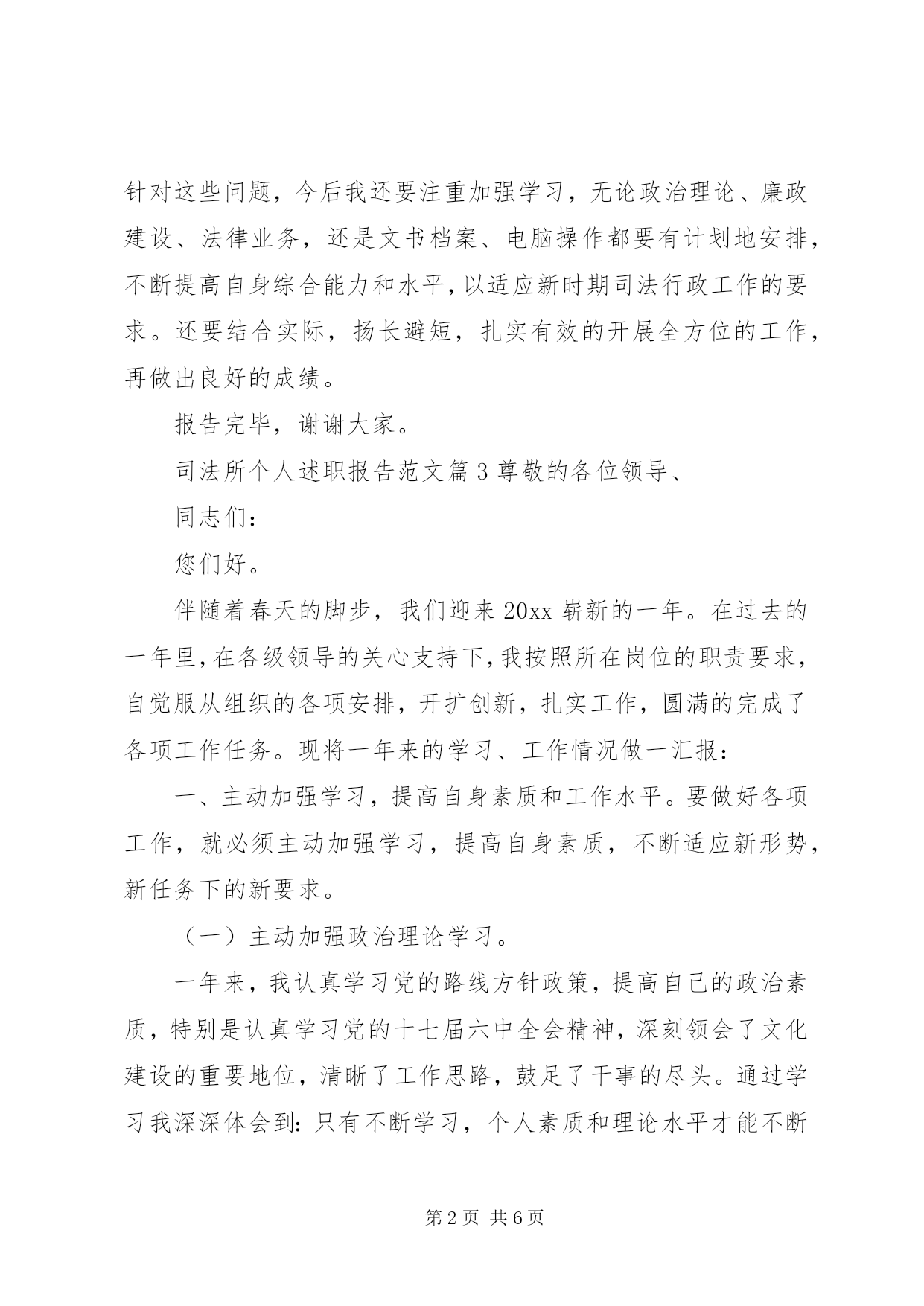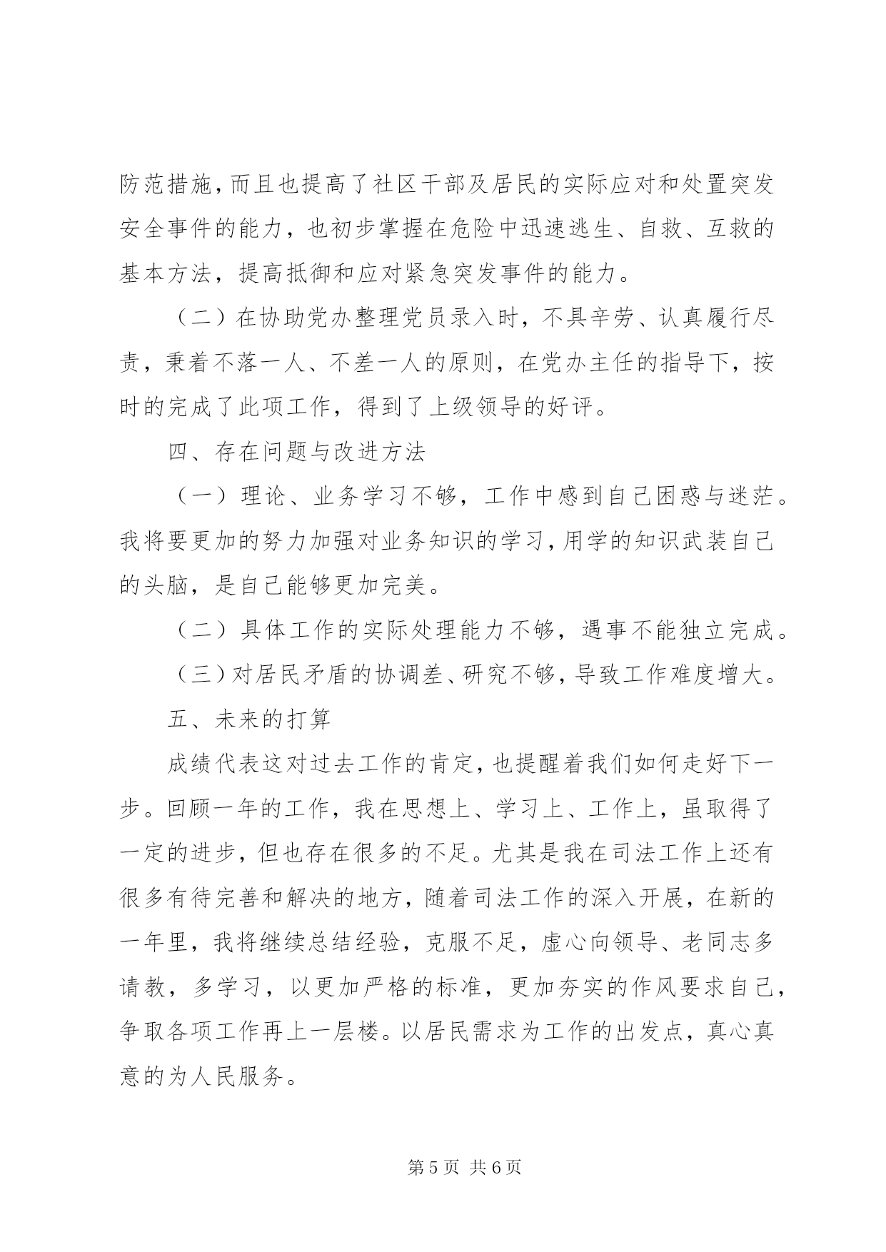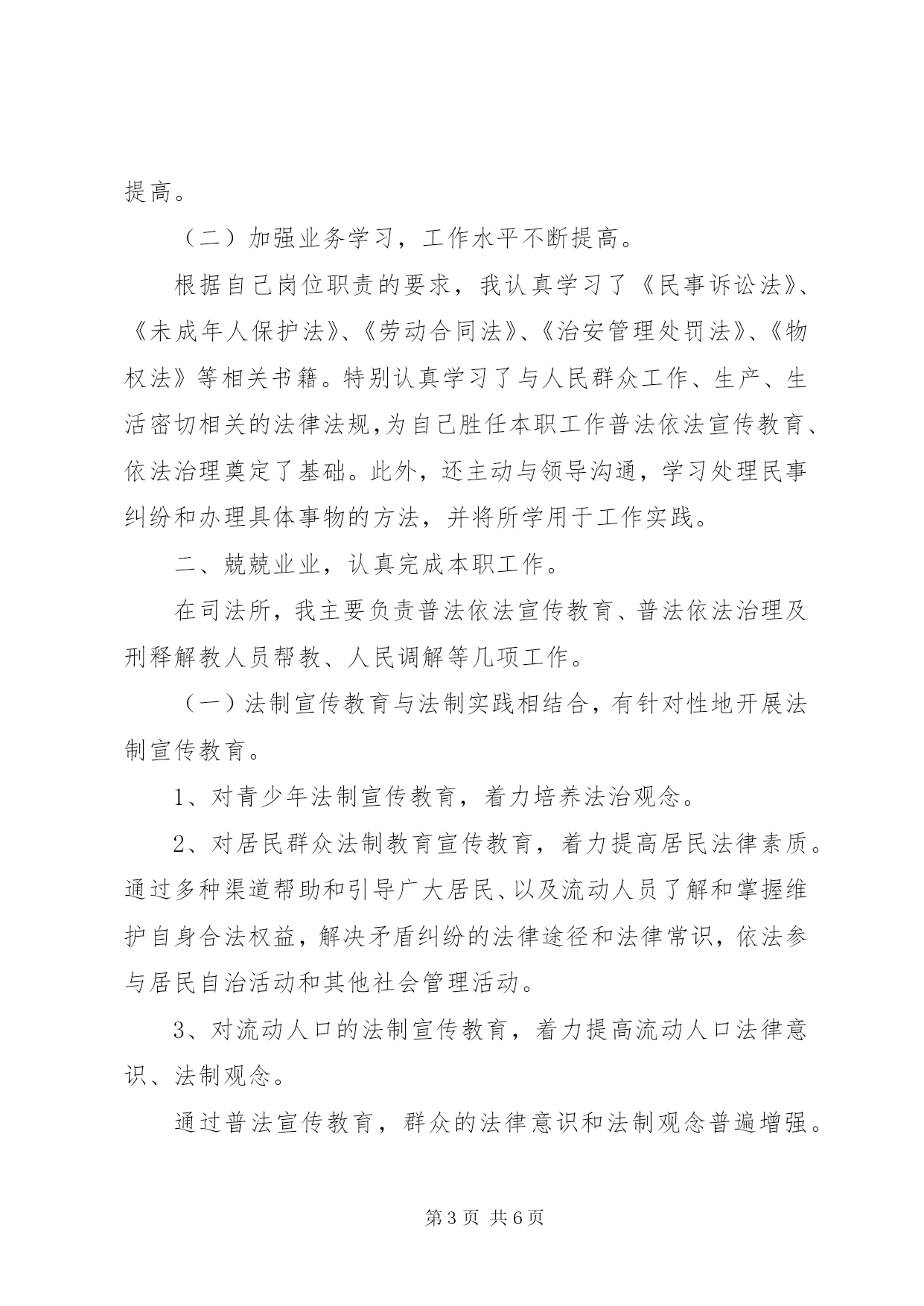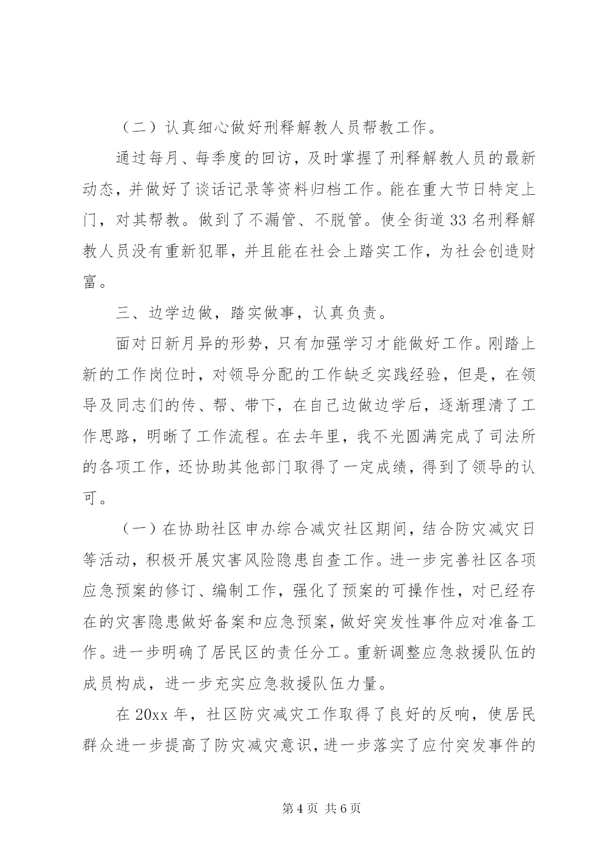 第PAGE\*Arabic\*MERGEFORMAT6页共NUMPAGES\*MERGEFORMAT6页司法所个人述职报告(2)七、勤政廉政严要求。司法行政队伍建设是做好各项工作的基础和关键。一年来,自己能以身作则,先后制定上墙司法所8项制度,按照党风廉政建设责任制的要求,规范自己的言行。接待工作,做到热情大方,热心一杯水,耐心解释,多渠道疏通,得到群众的好评。清清白白做事,堂堂正正做人。在调解工作上,经常分析本所党风廉政建设状况,对调解纠纷,依法以理,公道正直,从不偏袒,对当事人提出的无理要求,迅速制止。及时开展警示教育,加强廉政监督,抓好党风廉政建设责任制的落实,一年来,所内人员没有出现过不给好处不调解的现象。在坚持勤政廉政方面,加强队伍建设的同时,牢固树立以人为本,服务群众的为民思想,努力树造公正、务实、勤学、宽容的文化氛围和团结和谐、有所作为的工作作风,队伍建设有了新进展。目前主动到司法所申请调解的纠纷案子逐渐增多,法律咨询、代拟文书等法律服务工作取得了群众信任,社会好评,反映良好,真正为党委政府筑牢农村维护基层社会稳定第一道防线。一年来所取得的工作成绩,是党委政府正确领导、县局同志和所内司法人员共同努力的结果。回顾一年的工作,自身也存在一些问题和不足,一是对司法行政业务工作还需进一步学习。二是充分调动每一名同志的积极性还有需要注意的地方,放手不够,胆子不大。三是加强所务建设的方法不多,作风还需进一步改进。针对这些问题,今后我还要注重加强学习,无论政治理论、廉政建设、法律业务,还是文书档案、电脑操作都要有计划地安排,不断提高自身综合能力和水平,以适应新时期司法行政工作的要求。还要结合实际,扬长避短,扎实有效的开展全方位的工作,再做出良好的成绩。报告完毕,谢谢大家。司法所个人述职报告范文篇3尊敬的各位领导、同志们:您们好。伴随着春天的脚步,我们迎来20xx崭新的一年。在过去的一年里,在各级领导的关心支持下,我按照所在岗位的职责要求,自觉服从组织的各项安排,开扩创新,扎实工作,圆满的完成了各项工作任务。现将一年来的学习、工作情况做一汇报:一、主动加强学习,提高自身素质和工作水平。要做好各项工作,就必须主动加强学习,提高自身素质,不断适应新形势,新任务下的新要求。(一)主动加强政治理论学习。一年来,我认真学习党的路线方针政策,提高自己的政治素质,特别是认真学习党的十七届六中全会精神,深刻领会了文化建设的重要地位,清晰了工作思路,鼓足了干事的尽头。通过学习我深深体会到:只有不断学习,个人素质和理论水平才能不断提高。(二)加强业务学习,工作水平不断提高。根据自己岗位职责的要求,我认真学习了《民事诉讼法》、《未成年人保护法》、《劳动合同法》、《治安管理处罚法》、《物权法》等相关书籍。特别认真学习了与人民群众工作、生产、生活密切相关的法律法规,为自己胜任本职工作普法依法宣传教育、依法治理奠定了基础。此外,还主动与领导沟通,学习处理民事纠纷和办理具体事物的方法,并将所学用于工作实践。二、兢兢业业,认真完成本职工作。在司法所,我主要负责普法依法宣传教育、普法依法治理及刑释解教人员帮教、人民调解等几项工作。(一)法制宣传教育与法制实践相结合,有针对性地开展法制宣传教育。1、对青少年法制宣传教育,着力培养法治观念。2、对居民群众法制教育宣传教育,着力提高居民法律素质。通过多种渠道帮助和引导广大居民、以及流动人员了解和掌握维护自身合法权益,解决矛盾纠纷的法律途径和法律常识,依法参与居民自治活动和其他社会管理活动。3、对流动人口的法制宣传教育,着力提高流动人口法律意识、法制观念。通过普法宣传教育,群众的法律意识和法制观念普遍增强。(二)认真细心做好刑释解教人员帮教工作。通过每月、每季度的回访,及时掌握了刑释解教人员的最新动态,并做好了谈话记录等资料归档工作。能在重大节日特定上门,对其帮教。做到了不漏管、不脱管。使全街道33名刑释解教人员没有重新犯罪,并且能在社会上踏实工作,为社会创造财富。三、边学边做,踏实做事,认真负责。面对日新月异的形势,只有加强学习才能做好工作。刚踏上新的工作岗位时,对领导分配的工作缺乏实践经验,但是,在领导及同志们的传、帮、带下,在自己边做边学后,逐渐理清了工作思路,明晰了工作流程。在去年里,我不光圆满完成了司法所的各项工作,还协助其他部门取得了一定成绩,得到了领导的认可。(一)在协助社区申办综合减灾社区期间,结合防灾减灾日等活动,积极开展灾害风险隐患自查工作。进一步完善社区各项应急预案的修订、编制工作,强化了预案的可操作性,对已经存在的灾害隐患做好备案和应急预案,做好突发性事件应对准备工作。进一步明确了居民区的责任分工。重新调整应急救援队伍的成员构成,进一步充实应急救援队伍力量。在20xx年,
