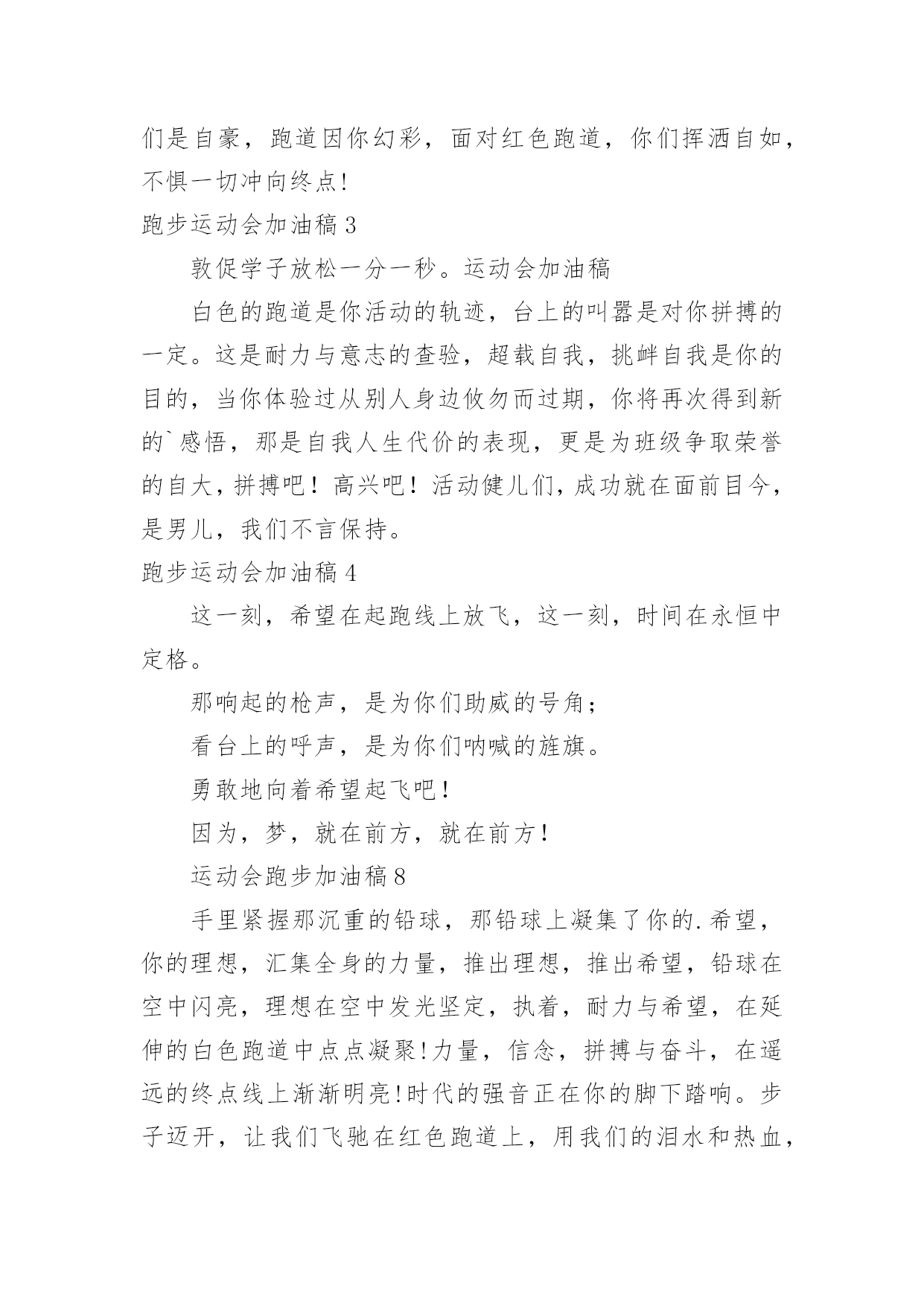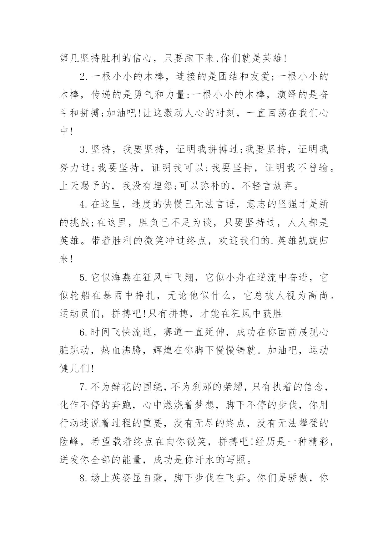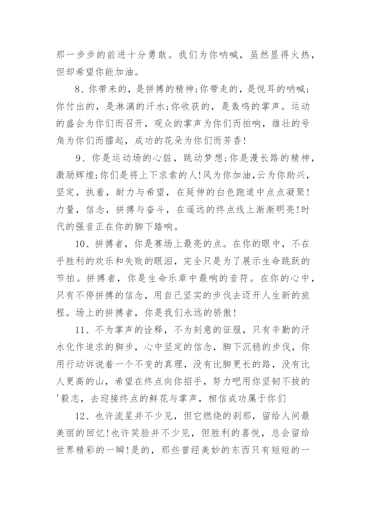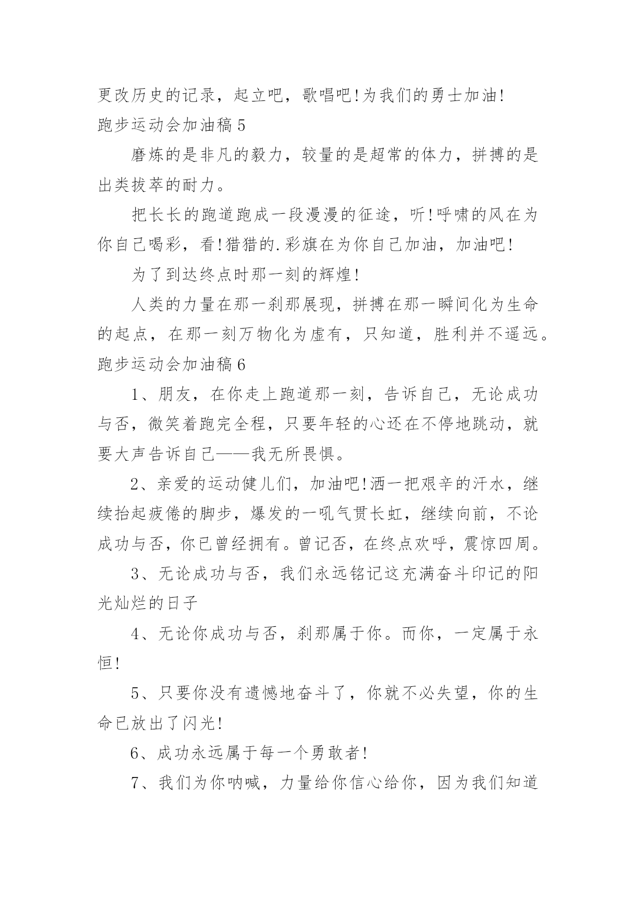 跑步运动会加油稿跑步运动会加油稿在社会发展不断提速的今天,很多情况下我们需要用到加油稿,加油稿可以激励对方更好地参加活动。你写加油稿时总是无从下笔?下面是小编为大家收集的跑步运动会加油稿,欢迎阅读,希望大家能够喜欢。跑步运动会加油稿1倘若力量来自呼吸,呼吸来自生命生命的真谛注释力量的永恒呼吸的瞬间注释生命的价值南无呼吸的艰难,力量的渐逝在此刻都可得到最美的解释将这美坚持到底,即使失败,也觉得无怨无悔将这美永驻心底,即使深锁,也永不会退色所有的这一切,都将在心灵的空中,如彩虹一般留下美的而永恒的瞬间此生无悔枪声响了,你们冲向前,不为别的,就为班级一马当先,没有昔日的汗水,怎见今天的胜利?相信自己,鼓励自己,超越自己。为太阳的光辉在添上永恒的一笔!要的就是坚持到底,不是华丽。冲吧!向着那未来,进行到底。今天的你们英姿飒爽,今天的你们朝气蓬勃,今天的你们一马当先。相信自己,你是最棒的!不要放弃,不要气馁。成功永远属于你们。100米运动员啊!加油啊运动场上有你们的'飒爽英姿,运动场上有你们拼搏的身影,面对漫漫的征程,你没有畏惧和退缩,任汗水打湿脊背,任疲惫爬满全身,依然分离追赶,只有一个目标,只有一个信念,为班级赢得荣誉,拼搏吧,我为你们呐喊,加油,7场上英姿显自豪,脚下步伐在飞奔。你们是骄傲。你们是自豪,跑道因你幻彩,面对红色跑道,你们挥洒自如,不惧一切冲向重点。一条跑道,要四个人去打造一个信念,要四个人去拼搏每次交接都是信任的传递每次交接都是永恒的支持前世的五百次回眸,才能够换来今天的相遇,冲吧!向着终点,向着个四个人的共同目标,前进!每一份辛劳都有一份收获,每一次的痛苦都是快乐的开始,没一声呐喊都是力量的呼唤。我们有着大浪拍岸的豪迈,所以你不必在乎小荷初露的恬静,我们有着春日的阳光明媚,所以不用去羡慕冬日乱玉碎琼,我们是雨天的一把伞,是寒冷冬日里的一盆碳火,温暖的不只是你我,而是大家的心。运动场上的健儿,掌声属于你们,鲜花属于你们,成功也是属于你们!跑步运动会加油稿21.不长不短的距离,需要的是全身心全程投入,自始至终你们都在拼全力此时此刻,你们处在最风光的一刻,无论第几坚持胜利的信心,只要跑下来,你们就是英雄!2.一根小小的木棒,连接的是团结和友爱;一根小小的木棒,传递的是勇气和力量;一根小小的木棒,演绎的是奋斗和拼搏;加油吧!让这激动人心的时刻,一直回荡在我们心中!3.坚持,我要坚持,证明我拼搏过;我要坚持,证明我努力过;我要坚持,证明我可以;我要坚持,证明我不曾输。上天赐予的,我没有埋怨;可以弥补的,不轻言放弃。4.在这里,速度的快慢已无法言语,意志的坚强才是新的挑战;在这里,胜负已不足为谈,只要坚持过,人人都是英雄。带着胜利的微笑冲过终点,欢迎我们的.英雄凯旋归来!5.它似海燕在狂风中飞翔,它似小舟在逆流中奋进,它似轮船在暴雨中挣扎,无论他似什么,它总被人视为高尚。运动员们,拼搏吧!只有拼搏,才能在狂风中获胜6.时间飞快流逝,赛道一直延伸,成功在你面前展现心脏跳动,热血沸腾,辉煌在你脚下慢慢铸就。加油吧,运动健儿们!7.不为鲜花的围绕,不为刹那的荣耀,只有执着的信念,化作不停的奔跑,心中燃烧着梦想,脚下不停的步伐,你用行动述说着过程的重要,没有无尽的终点,没有无法攀登的险峰,希望载着终点在向你微笑,拼搏吧!经历是一种精彩,迸发你全部的能量,成功是你汗水的写照。8.场上英姿显自豪,脚下步伐在飞奔。你们是骄傲,你们是自豪,跑道因你幻彩,面对红色跑道,你们挥洒自如,不惧一切冲向终点!跑步运动会加油稿3敦促学子放松一分一秒。运动会加油稿白色的跑道是你活动的轨迹,台上的叫嚣是对你拼搏的一定。这是耐力与意志的查验,超载自我,挑衅自我是你的目的,当你体验过从别人身边攸勿而过期,你将再次得到新的`感悟,那是自我人生代价的表现,更是为班级争取荣誉的自大,拼搏吧!高兴吧!活动健儿们,成功就在面前目今,是男儿,我们不言保持。跑步运动会加油稿4这一刻,希望在起跑线上放飞,这一刻,时间在永恒中定格。那响起的枪声,是为你们助威的号角;看台上的呼声,是为你们呐喊的旌旗。勇敢地向着希望起飞吧!因为,梦,就在前方,就在前方!运动会跑步加油稿8手里紧握那沉重的铅球,那铅球上凝集了你的.希望,你的理想,汇集全身的力量,推出理想,推出希望,铅球在空中闪亮,理想在空中发光坚定,执着,耐力与希望,在延伸的白色跑道中点点凝聚!力量,信念,拼搏与奋斗,在遥远的终点线上渐渐明亮!时代的强音正在你的脚下踏响。步子迈开,让我们飞驰在红色跑道上,用我们的泪水和热血,更改历史的记录,起立吧,歌唱吧!为我们的勇士加油!跑步运动会加油稿5磨炼的是非凡的毅力,较量的是超常的体力,拼搏的是出类拔萃的耐力。把长长的跑道跑成一段漫漫的征途,听!呼啸的风在为你自己喝彩,看!猎猎的.彩旗在
