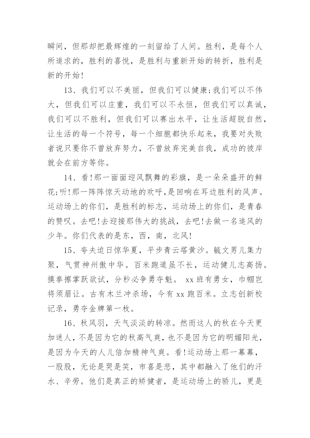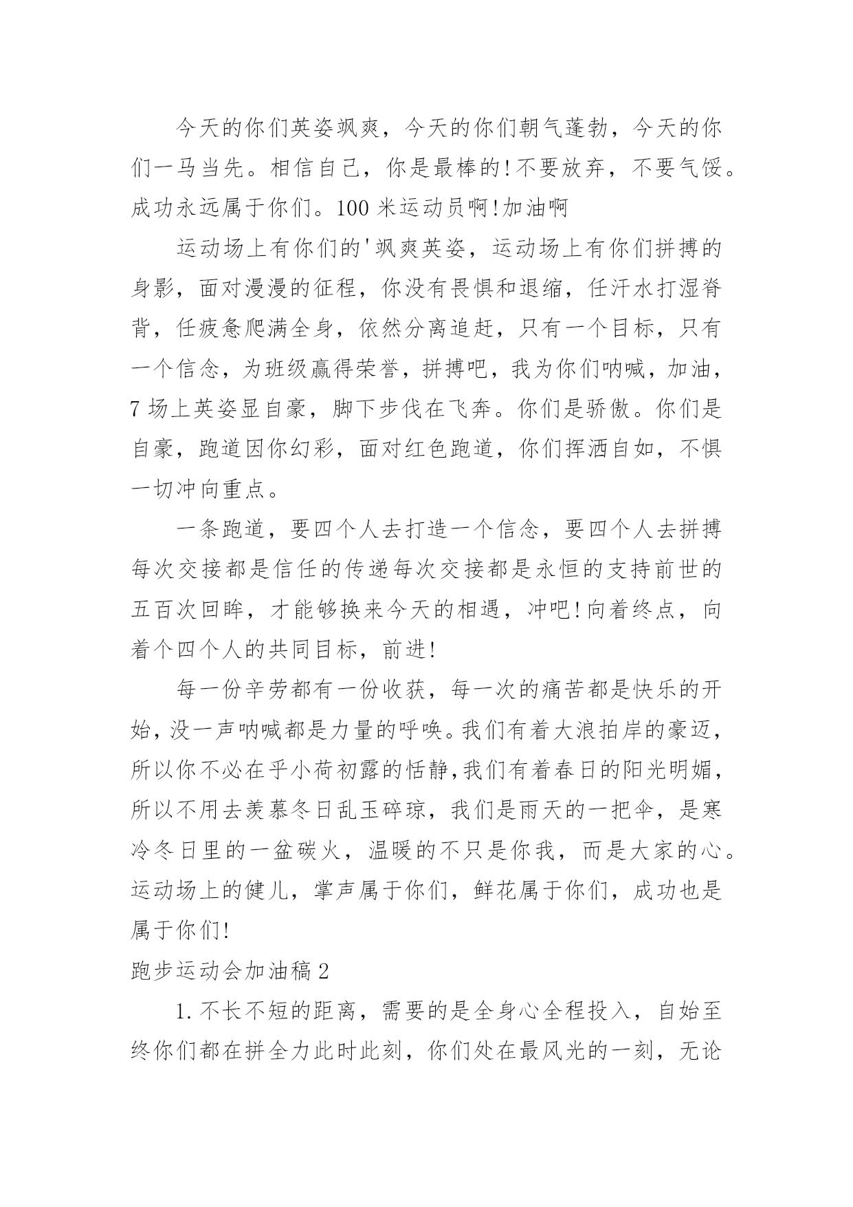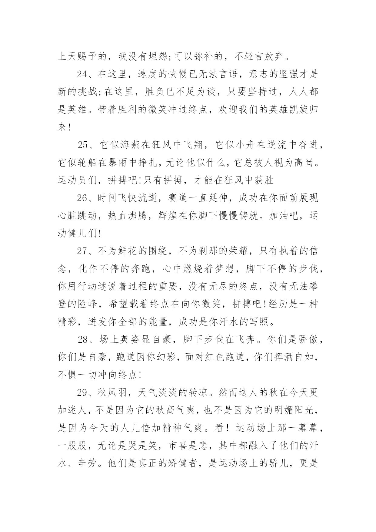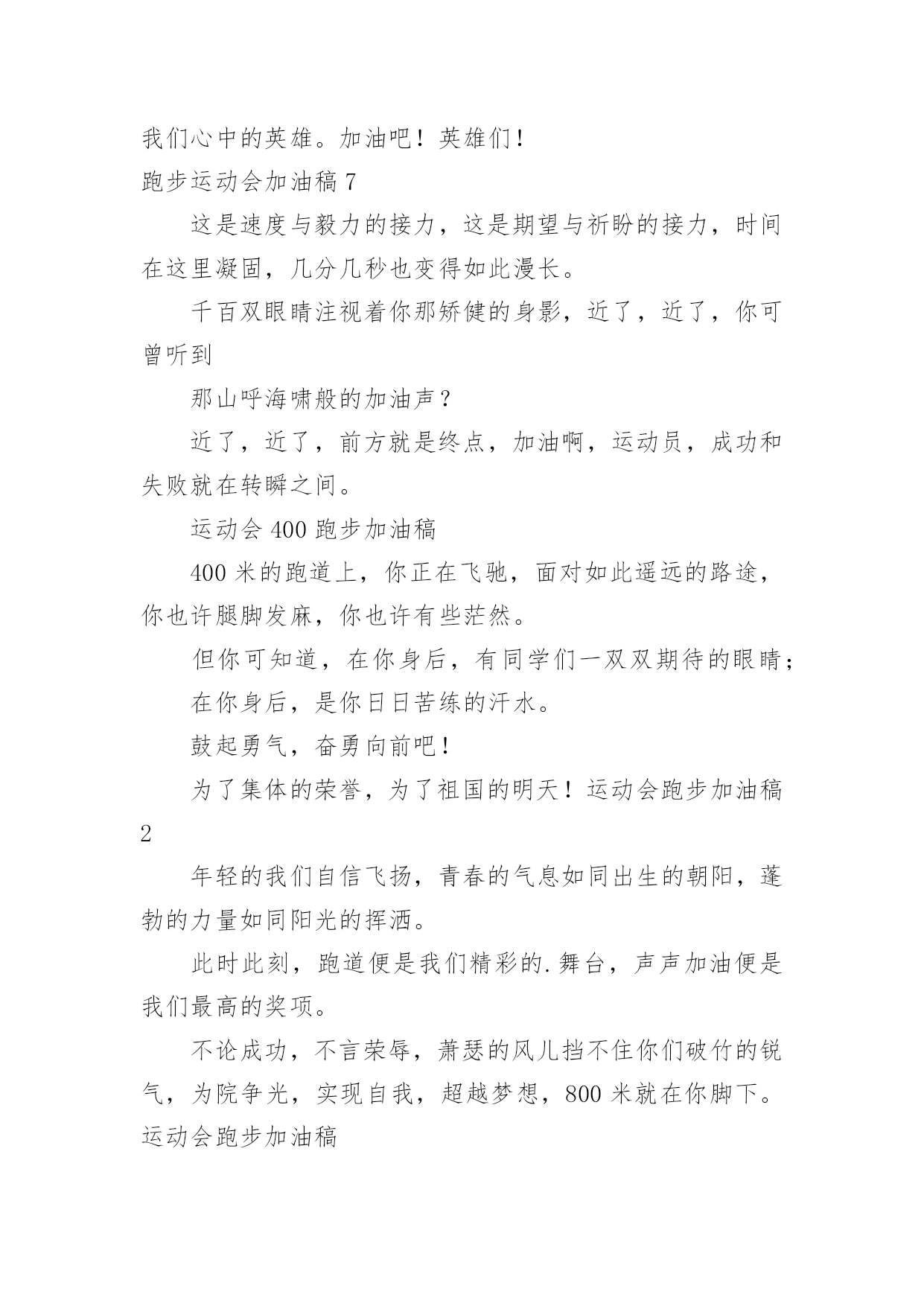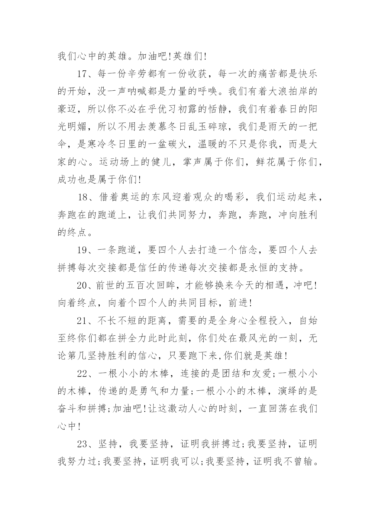 跑步运动会加油稿跑步运动会加油稿在社会发展不断提速的今天,很多情况下我们需要用到加油稿,加油稿可以激励对方更好地参加活动。你写加油稿时总是无从下笔?下面是小编为大家收集的跑步运动会加油稿,欢迎阅读,希望大家能够喜欢。跑步运动会加油稿1倘若力量来自呼吸,呼吸来自生命生命的真谛注释力量的永恒呼吸的瞬间注释生命的价值南无呼吸的艰难,力量的渐逝在此刻都可得到最美的解释将这美坚持到底,即使失败,也觉得无怨无悔将这美永驻心底,即使深锁,也永不会退色所有的这一切,都将在心灵的空中,如彩虹一般留下美的而永恒的瞬间此生无悔枪声响了,你们冲向前,不为别的,就为班级一马当先,没有昔日的汗水,怎见今天的胜利?相信自己,鼓励自己,超越自己。为太阳的光辉在添上永恒的一笔!要的就是坚持到底,不是华丽。冲吧!向着那未来,进行到底。今天的你们英姿飒爽,今天的你们朝气蓬勃,今天的你们一马当先。相信自己,你是最棒的!不要放弃,不要气馁。成功永远属于你们。100米运动员啊!加油啊运动场上有你们的'飒爽英姿,运动场上有你们拼搏的身影,面对漫漫的征程,你没有畏惧和退缩,任汗水打湿脊背,任疲惫爬满全身,依然分离追赶,只有一个目标,只有一个信念,为班级赢得荣誉,拼搏吧,我为你们呐喊,加油,7场上英姿显自豪,脚下步伐在飞奔。你们是骄傲。你们是自豪,跑道因你幻彩,面对红色跑道,你们挥洒自如,不惧一切冲向重点。一条跑道,要四个人去打造一个信念,要四个人去拼搏每次交接都是信任的传递每次交接都是永恒的支持前世的五百次回眸,才能够换来今天的相遇,冲吧!向着终点,向着个四个人的共同目标,前进!每一份辛劳都有一份收获,每一次的痛苦都是快乐的开始,没一声呐喊都是力量的呼唤。我们有着大浪拍岸的豪迈,所以你不必在乎小荷初露的恬静,我们有着春日的阳光明媚,所以不用去羡慕冬日乱玉碎琼,我们是雨天的一把伞,是寒冷冬日里的一盆碳火,温暖的不只是你我,而是大家的心。运动场上的健儿,掌声属于你们,鲜花属于你们,成功也是属于你们!跑步运动会加油稿21.不长不短的距离,需要的是全身心全程投入,自始至终你们都在拼全力此时此刻,你们处在最风光的一刻,无论第几坚持胜利的信心,只要跑下来,你们就是英雄!2.一根小小的木棒,连接的是团结和友爱;一根小小的木棒,传递的是勇气和力量;一根小小的木棒,演绎的是奋斗和拼搏;加油吧!让这激动人心的时刻,一直回荡在我们心中!3.坚持,我要坚持,证明我拼搏过;我要坚持,证明我努力过;我要坚持,证明我可以;我要坚持,证明我不曾输。上天赐予的,我没有埋怨;可以弥补的,不轻言放弃。4.在这里,速度的快慢已无法言语,意志的坚强才是新的挑战;在这里,胜负已不足为谈,只要坚持过,人人都是英雄。带着胜利的微笑冲过终点,欢迎我们的.英雄凯旋归来!5.它似海燕在狂风中飞翔,它似小舟在逆流中奋进,它似轮船在暴雨中挣扎,无论他似什么,它总被人视为高尚。运动员们,拼搏吧!只有拼搏,才能在狂风中获胜6.时间飞快流逝,赛道一直延伸,成功在你面前展现心脏跳动,热血沸腾,辉煌在你脚下慢慢铸就。加油吧,运动健儿们!7.不为鲜花的围绕,不为刹那的荣耀,只有执着的信念,化作不停的奔跑,心中燃烧着梦想,脚下不停的步伐,你用行动述说着过程的重要,没有无尽的终点,没有无法攀登的险峰,希望载着终点在向你微笑,拼搏吧!经历是一种精彩,迸发你全部的能量,成功是你汗水的写照。8.场上英姿显自豪,脚下步伐在飞奔。你们是骄傲,你们是自豪,跑道因你幻彩,面对红色跑道,你们挥洒自如,不惧一切冲向终点!跑步运动会加油稿3敦促学子放松一分一秒。运动会加油稿白色的跑道是你活动的轨迹,台上的叫嚣是对你拼搏的一定。这是耐力与意志的查验,超载自我,挑衅自我是你的目的,当你体验过从别人身边攸勿而过期,你将再次得到新的`感悟,那是自我人生代价的表现,更是为班级争取荣誉的自大,拼搏吧!高兴吧!活动健儿们,成功就在面前目今,是男儿,我们不言保持。跑步运动会加油稿4这一刻,希望在起跑线上放飞,这一刻,时间在永恒中定格。那响起的枪声,是为你们助威的号角;看台上的呼声,是为你们呐喊的旌旗。勇敢地向着希望起飞吧!因为,梦,就在前方,就在前方!运动会跑步加油稿8手里紧握那沉重的铅球,那铅球上凝集了你的.希望,你的理想,汇集全身的力量,推出理想,推出希望,铅球在空中闪亮,理想在空中发光坚定,执着,耐力与希望,在延伸的白色跑道中点点凝聚!力量,信念,拼搏与奋斗,在遥远的终点线上渐渐明亮!时代的强音正在你的脚下踏响。步子迈开,让我们飞驰在红色跑道上,用我们的泪水和热血,更改历史的记录,起立吧,歌唱吧!为我们的勇士加油!跑步运动会加油稿5磨炼的是非凡的毅力,较量的是超常的体力,拼搏的是出类拔萃的耐力。把长长的跑道跑成一段漫漫的征途,听!呼啸的风在为你自己喝彩,看!猎猎的.彩旗在