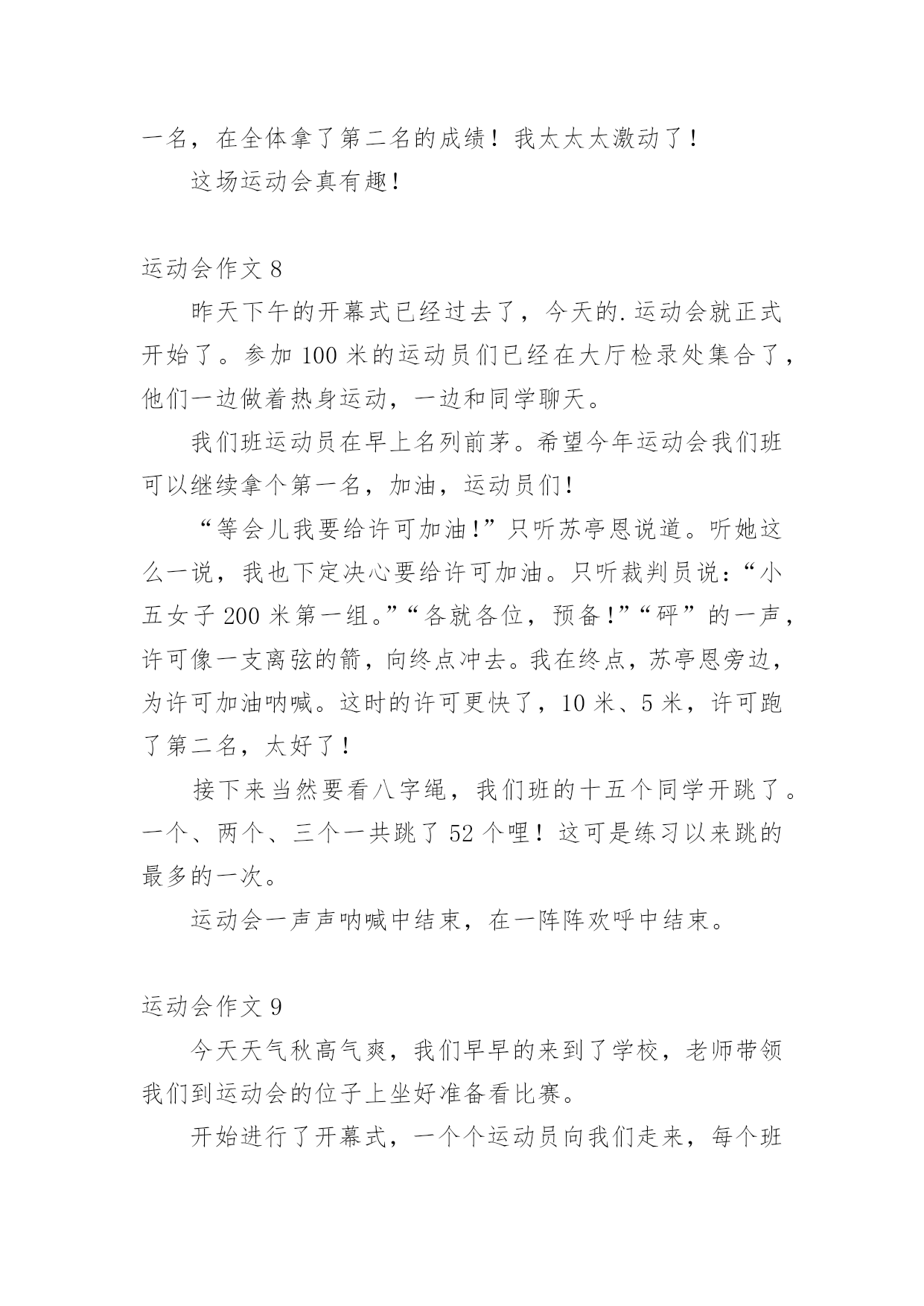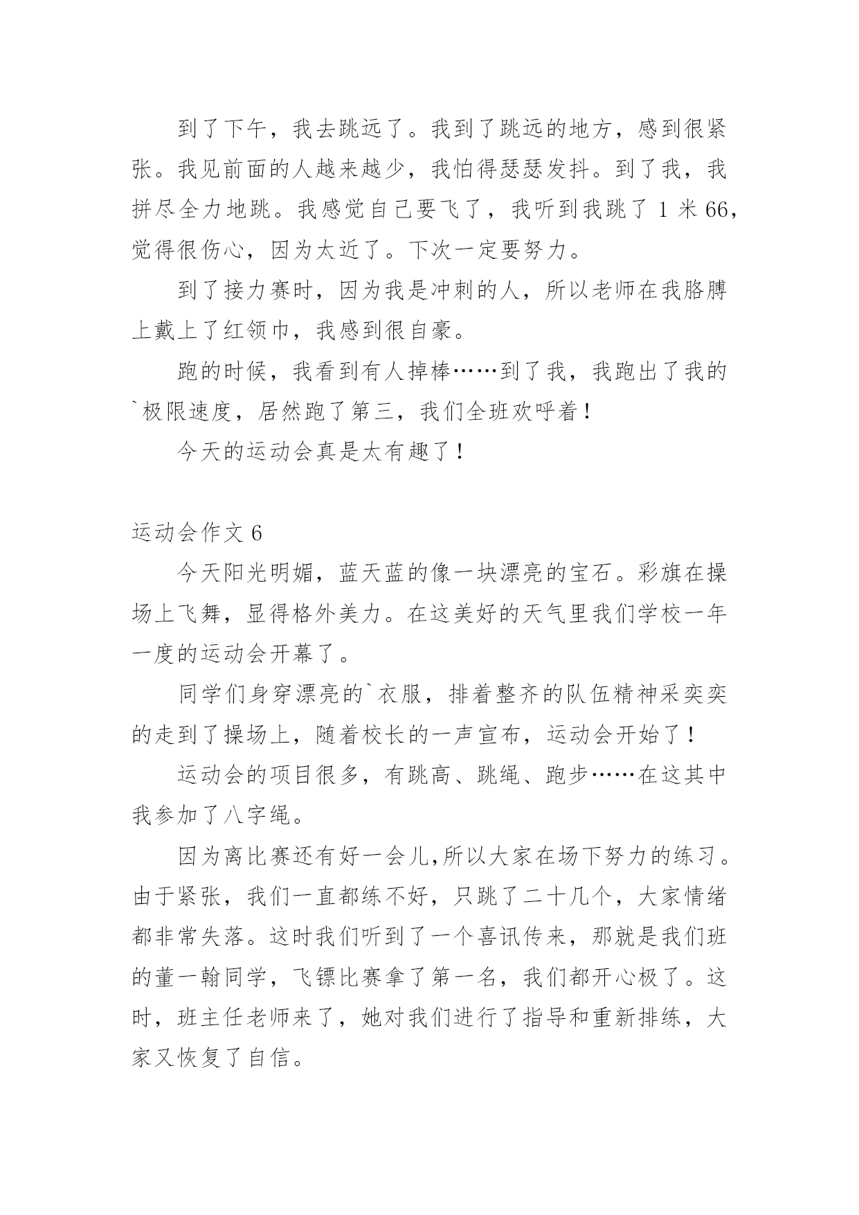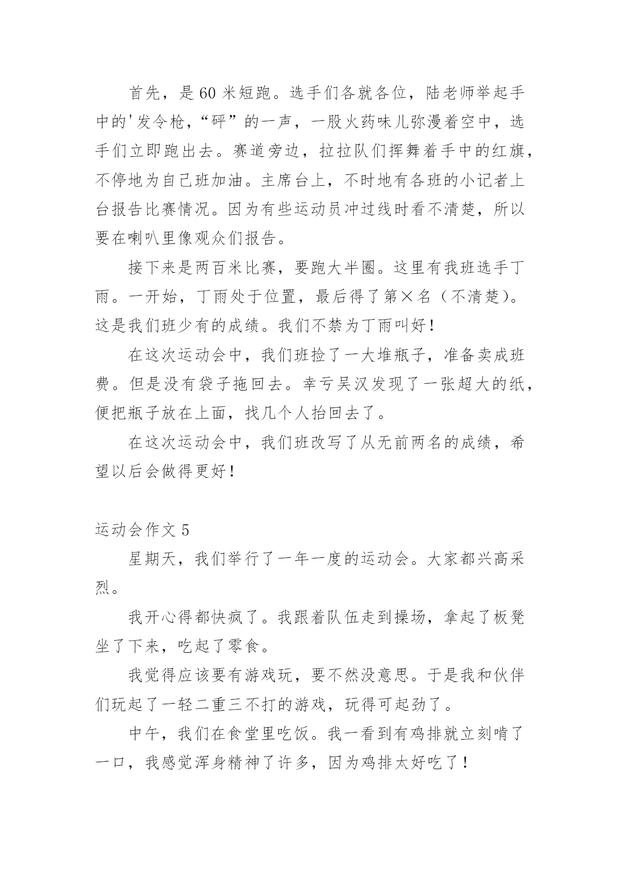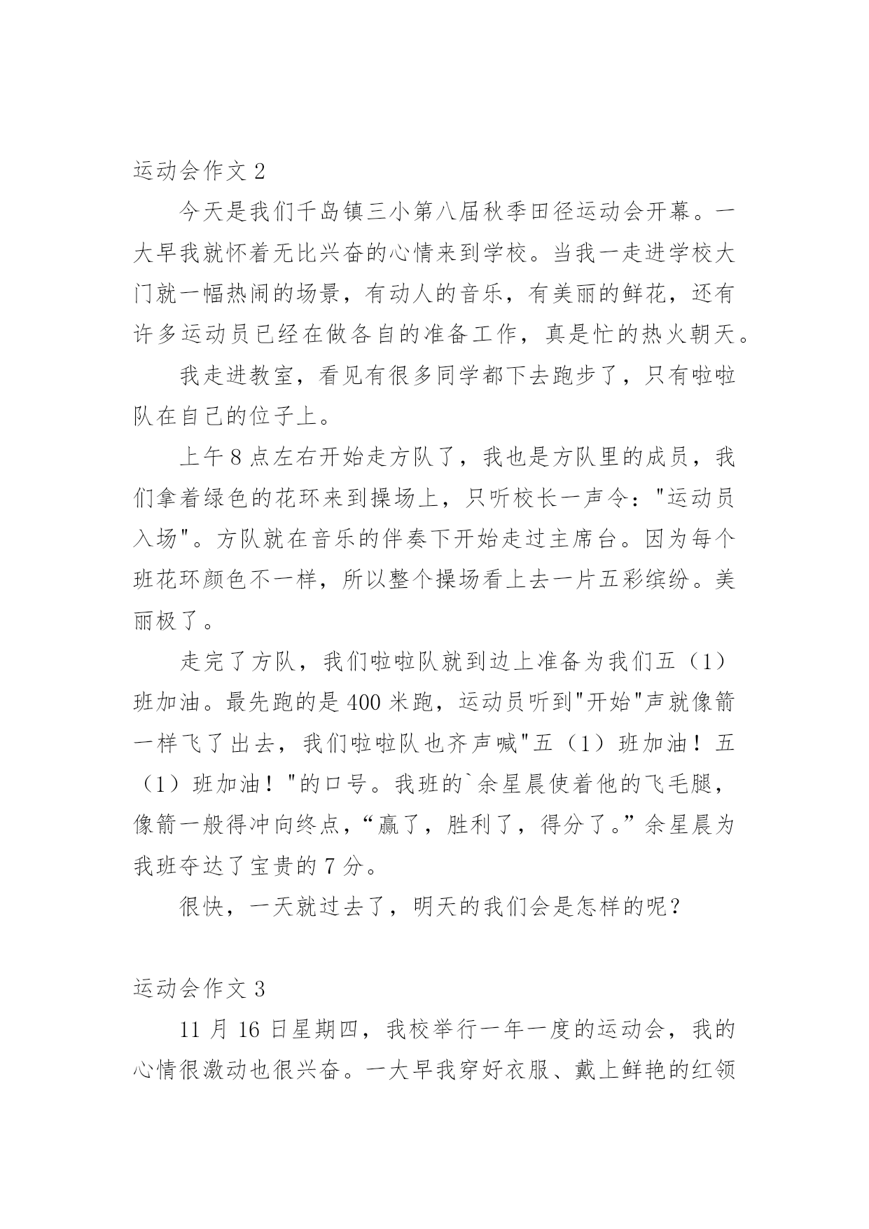 运动会作文在我们平凡的日常里,大家都尝试过写作文吧,写作文是培养人们的观察力、联想力、想象力、思考力和记忆力的重要手段。那要怎么写好作文呢?下面是小编整理的运动会作文,欢迎大家分享。运动会作文1等啊,盼啊。一年一度的田径运动会总算开始了。为了这场运动会,我可是刻苦练习了好久呢!这不,我们来到了运动场上。那里人声鼎沸,像咋开了锅一样。我们班的同学在地上坐好,准备观看比赛。裁判员一声令下,我们班的飞毛腿朱珉毅就像一根离弦的箭一样冲了出去,得了小组第一。我们班的同学都拍手叫好。轮到我上场了,我摩拳擦掌。站到起跑线上的那一刻,我激动万分。裁判员一声令下,我冲出起跑线,跑到我们班面前时,我听到同学们的呐喊声,我咬紧牙关,飞快的`冲过了终点线,得了小组第一。爸爸跑过来迎接我。我急忙问:“爸爸,我得了第几名呀?”爸爸说:“名次不重要,重在参与,你尽力就好!”比赛成绩终于出来了,我得了第二名,拿着奖状和银牌站在颁奖台上,好不威风啊!广播声中不断传来了303班的获奖名次。最后,我们以优异的成绩,获得了团体第一名。正如我们的口号:秋风吹,战鼓擂,我们三班怕过谁!运动会作文2今天是我们千岛镇三小第八届秋季田径运动会开幕。一大早我就怀着无比兴奋的心情来到学校。当我一走进学校大门就一幅热闹的场景,有动人的音乐,有美丽的鲜花,还有许多运动员已经在做各自的准备工作,真是忙的热火朝天。我走进教室,看见有很多同学都下去跑步了,只有啦啦队在自己的位子上。上午8点左右开始走方队了,我也是方队里的成员,我们拿着绿色的花环来到操场上,只听校长一声令:"运动员入场"。方队就在音乐的伴奏下开始走过主席台。因为每个班花环颜色不一样,所以整个操场看上去一片五彩缤纷。美丽极了。走完了方队,我们啦啦队就到边上准备为我们五(1)班加油。最先跑的是400米跑,运动员听到"开始"声就像箭一样飞了出去,我们啦啦队也齐声喊"五(1)班加油!五(1)班加油!"的口号。我班的`余星晨使着他的飞毛腿,像箭一般得冲向终点,“赢了,胜利了,得分了。”余星晨为我班夺达了宝贵的7分。很快,一天就过去了,明天的我们会是怎样的呢?运动会作文311月16日星期四,我校举行一年一度的运动会,我的心情很激动也很兴奋。一大早我穿好衣服、戴上鲜艳的红领巾,吃完早餐向学校飞奔。到了学校,每个班都穿上了自己班独特的服装,美丽极了。一走进教室,我看见同学们手上戴上了铃铛,头上戴上了有个性的发箍,上面写着“二班最棒、最强、最牛、无敌”。这时林老师走过来说,同学们排好队要举行开幕仪式了,我们排起了整齐的队伍向操场出发了,轮到我们班时,同学们精神抖擞地走向主席台,大家响亮的'喊着口号:“二班二班非同一般”,“二班二班永远最棒”。这次运动会我参加了三个项目,有趣味接力、跳远、还有接力赛,接力赛马上就要开始了,我和同学们站在起跑线上屏住呼吸等待裁判发令,只听“ju”的一声张景桓飞快地往前冲,在这次接力赛中男生取得了第二名,女生队取得了第一名的好成绩。我们和林老师开心地跳了起来。这次运动会让我懂得了团结就是力量,付出就会有收获,绿叶中队是最棒的。运动会作文4今天早上,我们学校举行了一年一度的秋季运动会,比赛场地位于职高的操场。早上七点半,我急切地来到操场上集合。全校同学已经汇集在操场上,我们整齐了队伍,出了学校大门走向职高。我们聚集在职高操场上,一、二、三年级也从小门进来,参加开幕式。不一会儿,校长的声音就从高音喇叭里传了出来。经过一大段发言后,运动会正式开始!首先,是60米短跑。选手们各就各位,陆老师举起手中的'发令枪,“砰”的一声,一股火药味儿弥漫着空中,选手们立即跑出去。赛道旁边,拉拉队们挥舞着手中的红旗,不停地为自己班加油。主席台上,不时地有各班的小记者上台报告比赛情况。因为有些运动员冲过线时看不清楚,所以要在喇叭里像观众们报告。接下来是两百米比赛,要跑大半圈。这里有我班选手丁雨。一开始,丁雨处于位置,最后得了第×名(不清楚)。这是我们班少有的成绩。我们不禁为丁雨叫好!在这次运动会中,我们班捡了一大堆瓶子,准备卖成班费。但是没有袋子拖回去。幸亏吴汉发现了一张超大的纸,便把瓶子放在上面,找几个人抬回去了。在这次运动会中,我们班改写了从无前两名的成绩,希望以后会做得更好!运动会作文5星期天,我们举行了一年一度的运动会。大家都兴高采烈。我开心得都快疯了。我跟着队伍走到操场,拿起了板凳坐了下来,吃起了零食。我觉得应该要有游戏玩,要不然没意思。于是我和伙伴们玩起了一轻二重三不打的游戏,玩得可起劲了。中午,我们在食堂里吃饭。我一看到有鸡排就立刻啃了一口,我感觉浑身精神了许多,因为鸡排太好吃了!到了下午,我去跳远了。我到了跳远的地方,感到很紧张。我见前面的人越来越少,我怕得瑟瑟发抖。到了我,我拼尽全力地跳。我感觉自己要飞了,我听到我跳了