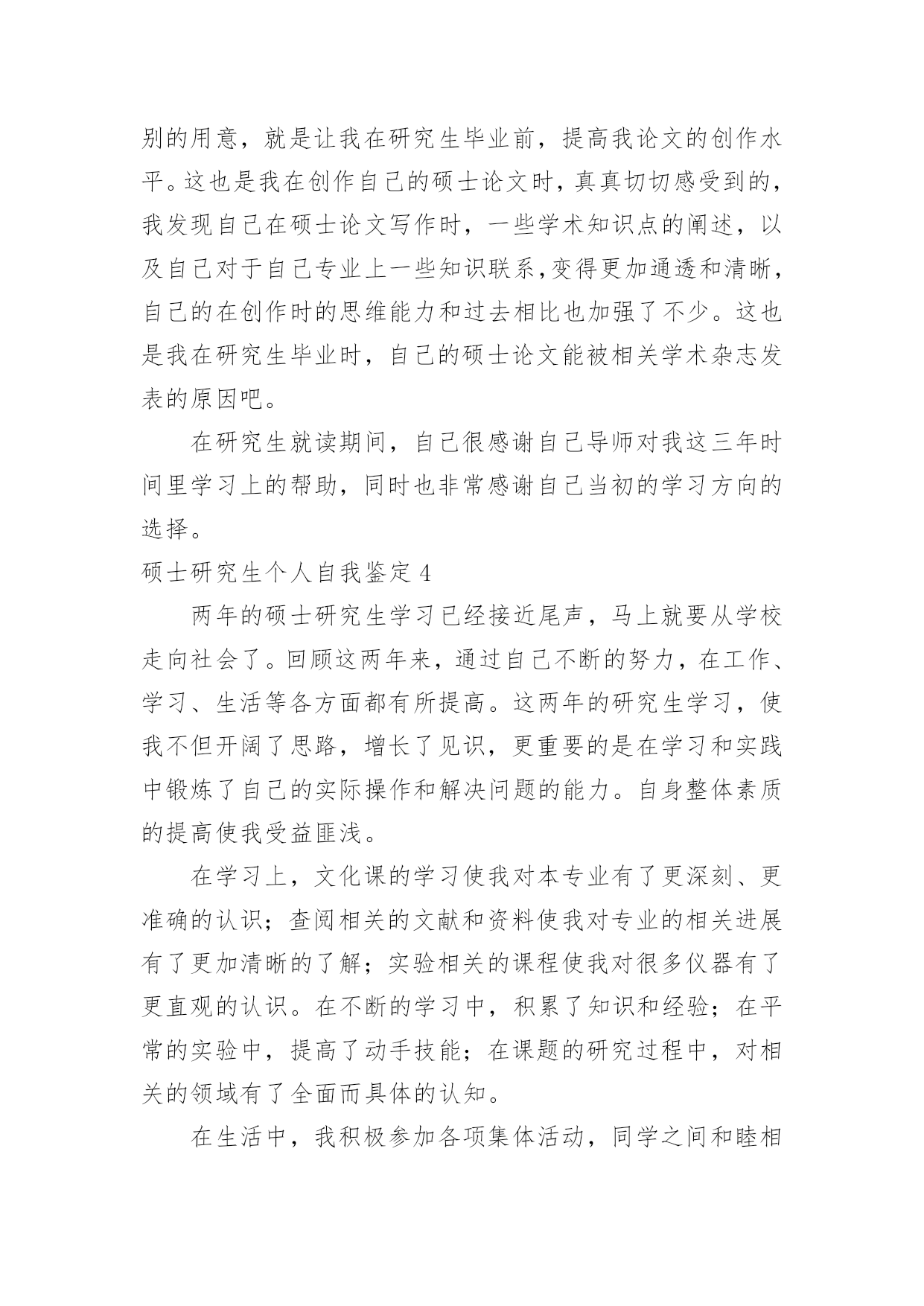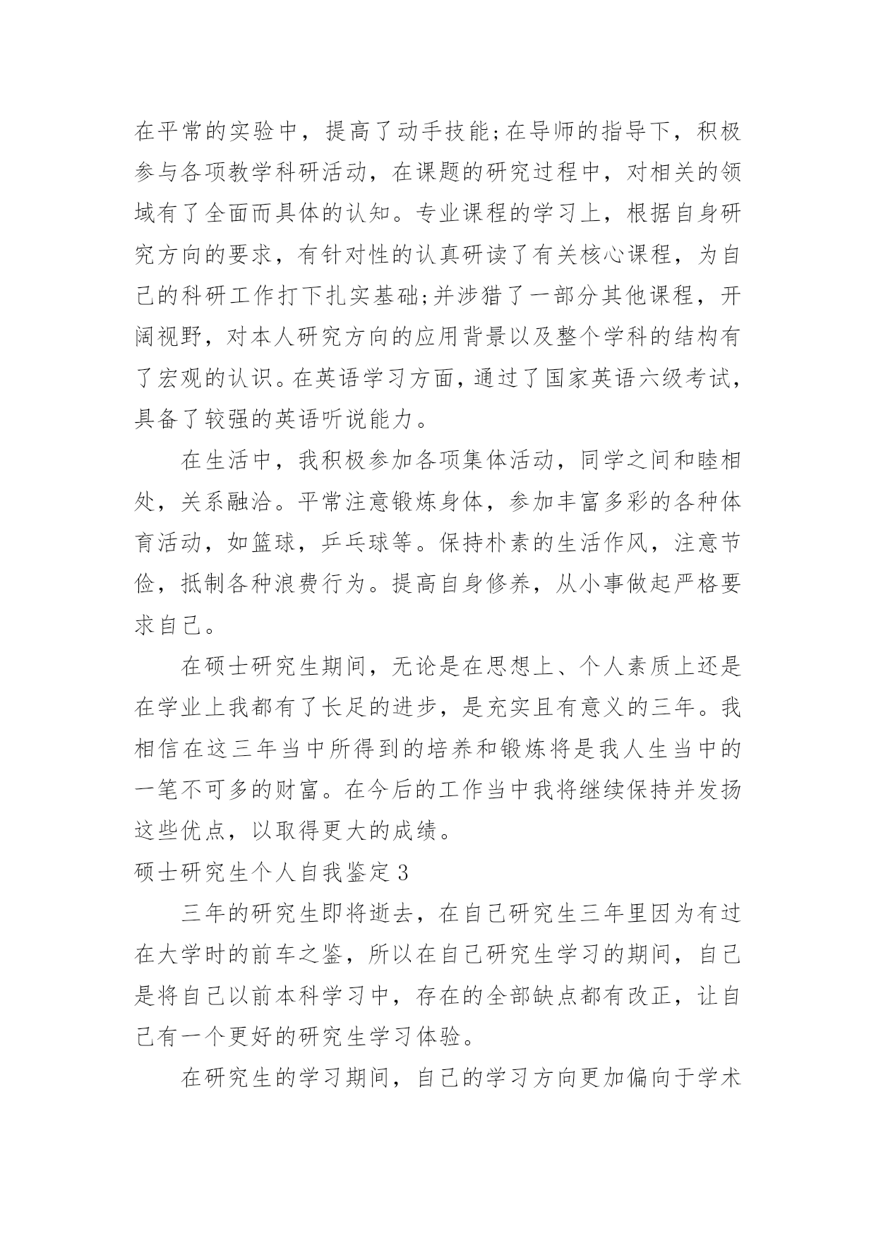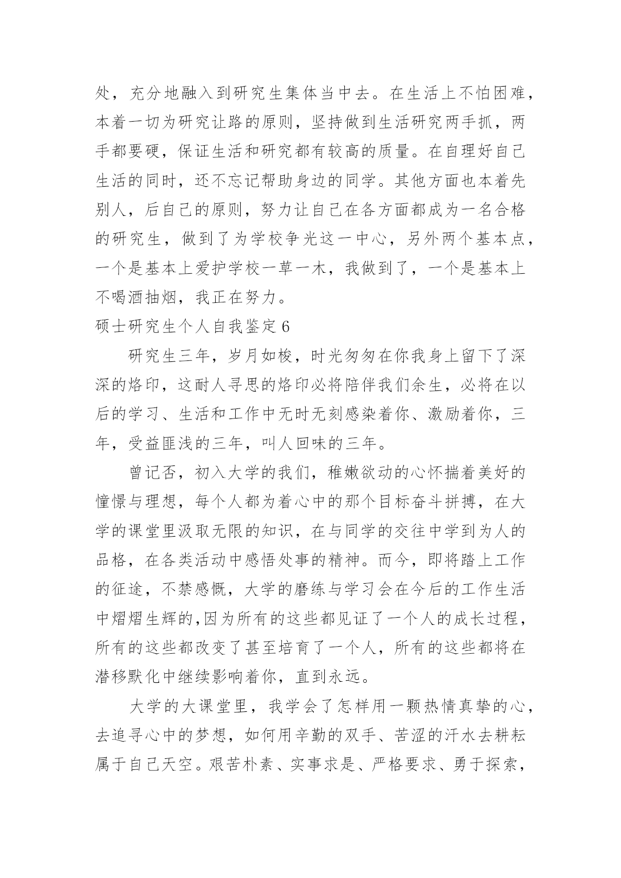硕士研究生个人自我鉴定硕士研究生个人自我鉴定正常来说,自我鉴定也是总结的一种,写自我鉴定有利于我们工作能力的提高,让我们一起认真地写一份自我鉴定吧。那么你真的懂得怎么写自我鉴定吗?以下是小编收集整理的硕士研究生个人自我鉴定,欢迎大家分享。硕士研究生个人自我鉴定1本人在硕士研究生学习阶段,思想上要求上进,认真学习,努力钻研专业知识,毕业之际,回顾三年来的学习、工作以及生活,做个人的人生理想和发展目标,有了相对成熟的认识和定位。在专业课程的学习上,根据自身研究方向的要求,有针对性的认真研读了有关核心课程,为自己的科研工作打下扎实基础;并涉猎了一部分其他课程,开阔视野,对本人研究方向的应用背景以及整个学科的结构有了宏观的认识。在英语学习方面,通过了大学英语六级考试,具备了较强的英语听说能力,在撰写论文期间,查阅了大量的英文资料。在导师的指导下,积极参与各项教学科研活动,在教学实践的过程中,认真阅读教材、查阅学术资料和参考书籍,在课堂上在快乐中吸收各个知识点。同时自己具有较强的实践动手能力,参与了导师多项课题的研究,使自己的理论知识与实践水平得到了进一步的增强和提高,同时顺利完成了硕士毕业论文。本人在研究生阶段所获颇丰,从学业、科研工作,到个人素质,都得到了充分的培养和锻炼,是充实且有意义的三年。相信这些经历和积累都将成为本人人生道路上的宝贵财富。在以后的工作和学习中,本人将继续保持并发扬严谨治学的作风,兢兢业业,争取取得更大的成绩。硕士研究生个人自我鉴定2时间如白驹过隙,三年的研究生生活转迅即失。在毕业之际,回首这三年走过的路,收获颇多,总的说起来有以下几点:在政治上、思想上我一直积极要求进步。我是在XX年5月光荣地成为了一名预备党员,在进入华南农业大学后,通过本党支部同志的影响,带动,帮助,思想上有了更大的进步,并加深了我对建设有中国特色的社会主义理论和党的基本路线深刻的认识,进一步的树立了坚定的共产主义信念。经过党组织1年预备期的考察,于20xx年5月如期转为正式党员。在成为一名党员后我时刻牢记自己是一名党员,处处以身作则,以一名合格党员的要求严格规范自己的言行举止。在这次汶川大地震后能积极捐款,自愿缴纳特殊党费,贡献出自己的一份绵薄之力。在学习上,文化课的学习使我对本专业有了更深刻、更准确的认识;查阅相关的文献和资料使我对专业的相关进展有了更加清晰的了解;在不断的学习中,积累了知识和经验;在平常的实验中,提高了动手技能;在导师的指导下,积极参与各项教学科研活动,在课题的研究过程中,对相关的领域有了全面而具体的认知。专业课程的学习上,根据自身研究方向的要求,有针对性的认真研读了有关核心课程,为自己的科研工作打下扎实基础;并涉猎了一部分其他课程,开阔视野,对本人研究方向的应用背景以及整个学科的结构有了宏观的认识。在英语学习方面,通过了国家英语六级考试,具备了较强的英语听说能力。在生活中,我积极参加各项集体活动,同学之间和睦相处,关系融洽。平常注意锻炼身体,参加丰富多彩的各种体育活动,如篮球,乒乓球等。保持朴素的生活作风,注意节俭,抵制各种浪费行为。提高自身修养,从小事做起严格要求自己。在硕士研究生期间,无论是在思想上、个人素质上还是在学业上我都有了长足的进步,是充实且有意义的三年。我相信在这三年当中所得到的培养和锻炼将是我人生当中的一笔不可多的财富。在今后的工作当中我将继续保持并发扬这些优点,以取得更大的成绩。硕士研究生个人自我鉴定3三年的研究生即将逝去,在自己研究生三年里因为有过在大学时的前车之鉴,所以在自己研究生学习的期间,自己是将自己以前本科学习中,存在的全部缺点都有改正,让自己有一个更好的研究生学习体验。在研究生的学习期间,自己的学习方向更加偏向于学术研究上的学习,这个学习方向是我们研究生学习中,比较困难的一个方向。但是我认为学术研究才可以更好的锻炼我们的学习成果,同时学术研究方向的学习,也可能给我们的社会做出更大的奉献,我也想要在这个期间里,让自己的学术价值得到更好的实现。所以在知道学术道路的艰辛,自己还是毅然决然的踏上了这条不知道是否有结果的道路。但是自己这种选择好像给了自己一点点回报,在我研究生期间,我在跟着我导师的学习下,完成了很多学术上的实验,并取得了一些非常有价值的专业研究成果,这也不算辜负自己每天扎身于学术研究的学习上。同时在此期间,我与导师还接了一些企业上的项目,与导师和其他同学一起完成这些项目中的任务。我们在项目中遇到过困难,同时在困难的研究过程中也遇到了一些珍贵的机遇。接受这些企业的项目,不仅在工作过程中,让自己学术知识上的能力有很大的长进,同时也让自己挣取了更多的外快,缓解了自己在研究生学习期间的学费、生活费等相关费用的压力。在我研究生的第二年,我们导师对我在研究生期间表现也还算满意的,不仅对我的