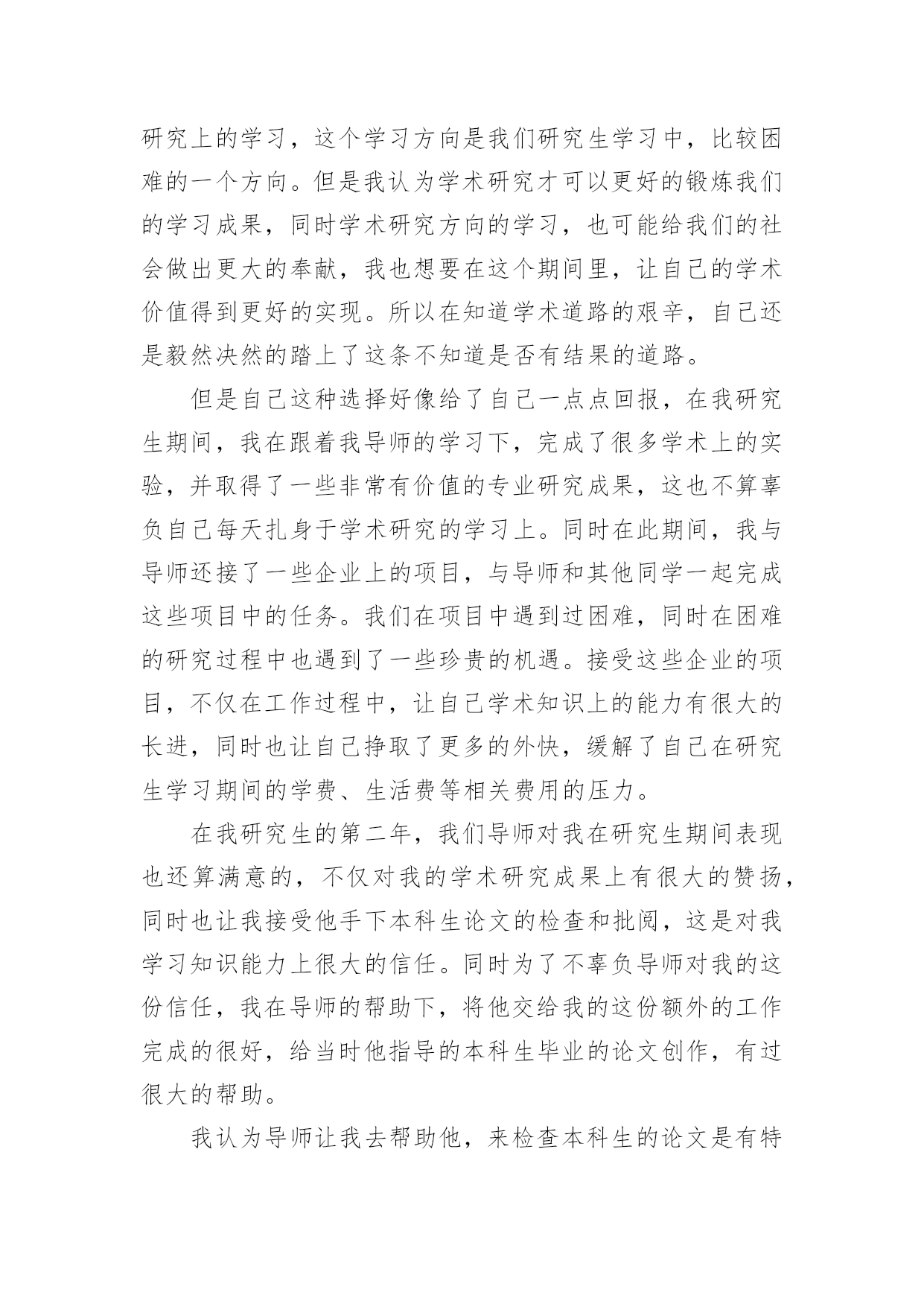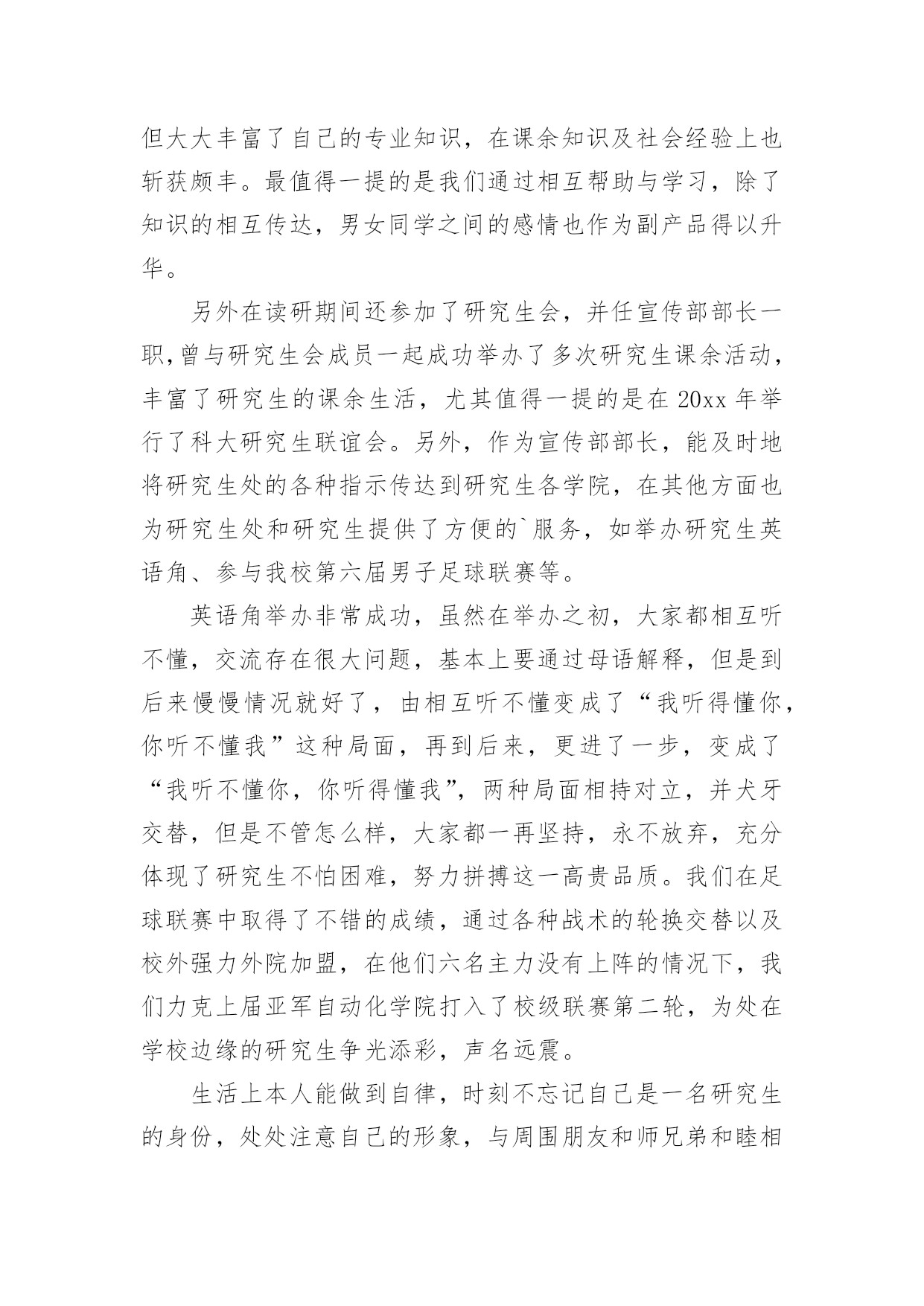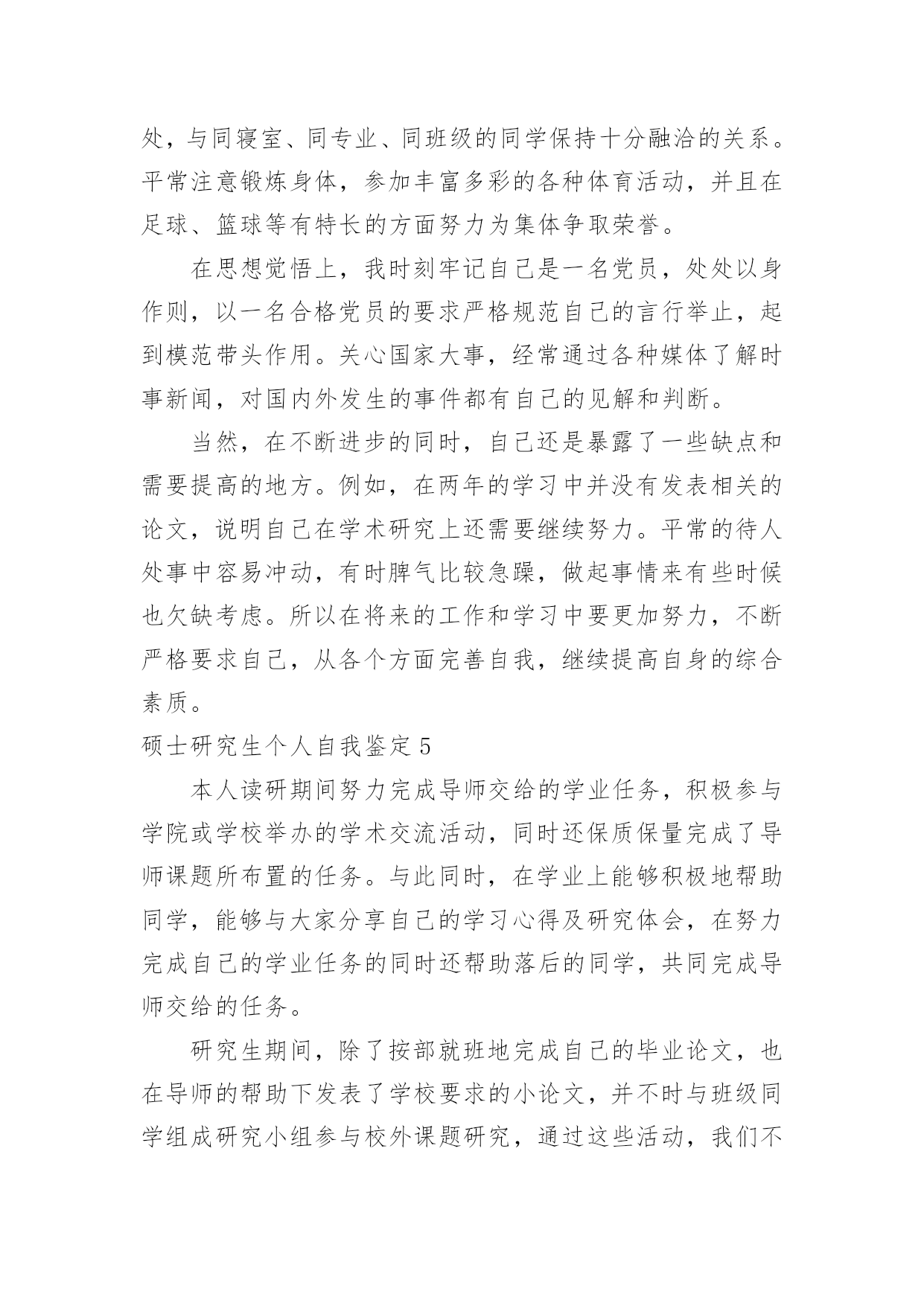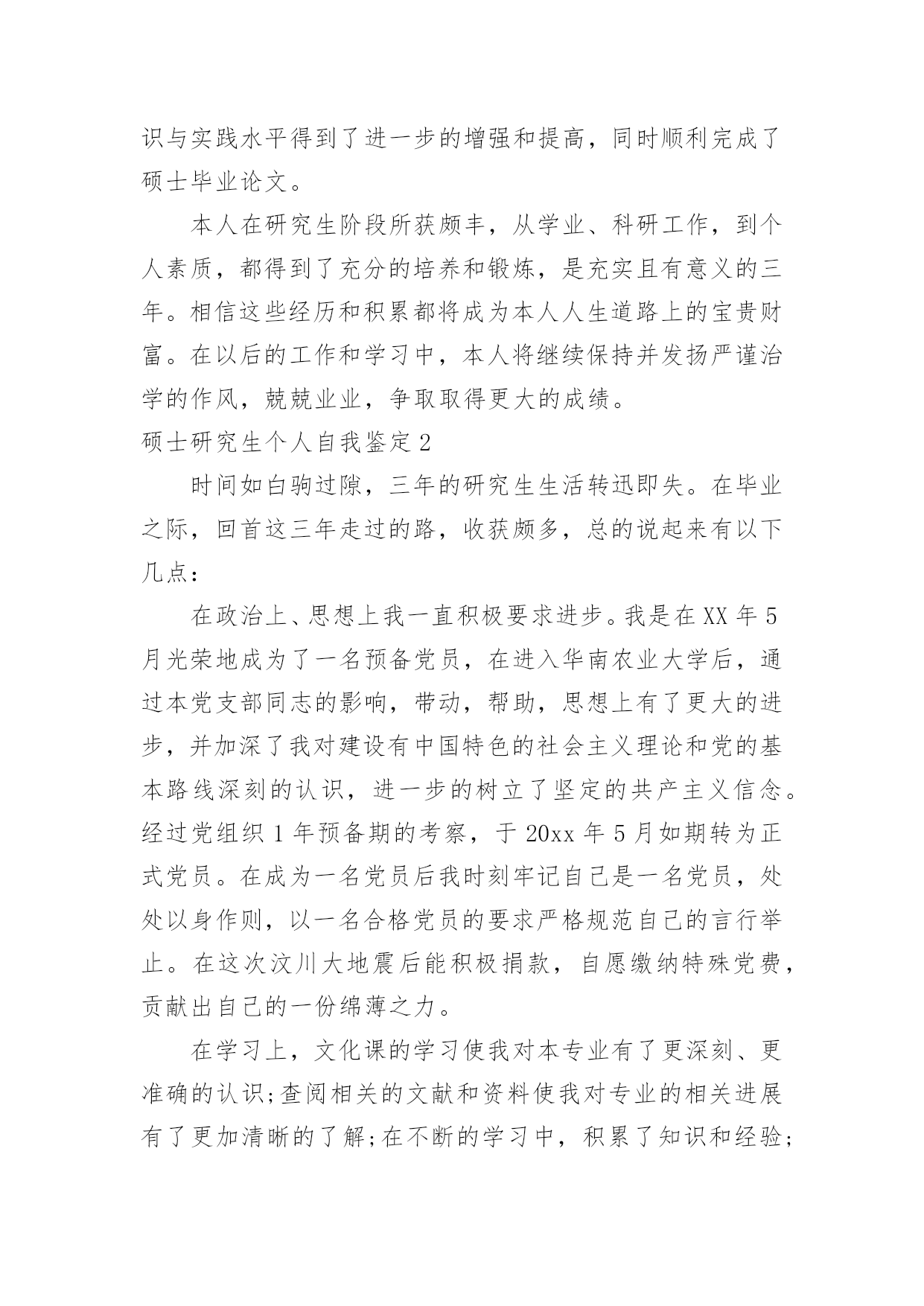 硕士研究生个人自我鉴定硕士研究生个人自我鉴定正常来说,自我鉴定也是总结的一种,写自我鉴定有利于我们工作能力的提高,让我们一起认真地写一份自我鉴定吧。那么你真的懂得怎么写自我鉴定吗?以下是小编收集整理的硕士研究生个人自我鉴定,欢迎大家分享。硕士研究生个人自我鉴定1本人在硕士研究生学习阶段,思想上要求上进,认真学习,努力钻研专业知识,毕业之际,回顾三年来的学习、工作以及生活,做个人的人生理想和发展目标,有了相对成熟的认识和定位。在专业课程的学习上,根据自身研究方向的要求,有针对性的认真研读了有关核心课程,为自己的科研工作打下扎实基础;并涉猎了一部分其他课程,开阔视野,对本人研究方向的应用背景以及整个学科的结构有了宏观的认识。在英语学习方面,通过了大学英语六级考试,具备了较强的英语听说能力,在撰写论文期间,查阅了大量的英文资料。在导师的指导下,积极参与各项教学科研活动,在教学实践的过程中,认真阅读教材、查阅学术资料和参考书籍,在课堂上在快乐中吸收各个知识点。同时自己具有较强的实践动手能力,参与了导师多项课题的研究,使自己的理论知识与实践水平得到了进一步的增强和提高,同时顺利完成了硕士毕业论文。本人在研究生阶段所获颇丰,从学业、科研工作,到个人素质,都得到了充分的培养和锻炼,是充实且有意义的三年。相信这些经历和积累都将成为本人人生道路上的宝贵财富。在以后的工作和学习中,本人将继续保持并发扬严谨治学的作风,兢兢业业,争取取得更大的成绩。硕士研究生个人自我鉴定2时间如白驹过隙,三年的研究生生活转迅即失。在毕业之际,回首这三年走过的路,收获颇多,总的说起来有以下几点:在政治上、思想上我一直积极要求进步。我是在XX年5月光荣地成为了一名预备党员,在进入华南农业大学后,通过本党支部同志的影响,带动,帮助,思想上有了更大的进步,并加深了我对建设有中国特色的社会主义理论和党的基本路线深刻的认识,进一步的树立了坚定的共产主义信念。经过党组织1年预备期的考察,于20xx年5月如期转为正式党员。在成为一名党员后我时刻牢记自己是一名党员,处处以身作则,以一名合格党员的要求严格规范自己的言行举止。在这次汶川大地震后能积极捐款,自愿缴纳特殊党费,贡献出自己的一份绵薄之力。在学习上,文化课的学习使我对本专业有了更深刻、更准确的认识;查阅相关的文献和资料使我对专业的相关进展有了更加清晰的了解;在不断的学习中,积累了知识和经验;在平常的实验中,提高了动手技能;在导师的指导下,积极参与各项教学科研活动,在课题的研究过程中,对相关的领域有了全面而具体的认知。专业课程的学习上,根据自身研究方向的要求,有针对性的认真研读了有关核心课程,为自己的科研工作打下扎实基础;并涉猎了一部分其他课程,开阔视野,对本人研究方向的应用背景以及整个学科的结构有了宏观的认识。在英语学习方面,通过了国家英语六级考试,具备了较强的英语听说能力。在生活中,我积极参加各项集体活动,同学之间和睦相处,关系融洽。平常注意锻炼身体,参加丰富多彩的各种体育活动,如篮球,乒乓球等。保持朴素的生活作风,注意节俭,抵制各种浪费行为。提高自身修养,从小事做起严格要求自己。在硕士研究生期间,无论是在思想上、个人素质上还是在学业上我都有了长足的进步,是充实且有意义的三年。我相信在这三年当中所得到的培养和锻炼将是我人生当中的一笔不可多的财富。在今后的工作当中我将继续保持并发扬这些优点,以取得更大的成绩。硕士研究生个人自我鉴定3三年的研究生即将逝去,在自己研究生三年里因为有过在大学时的前车之鉴,所以在自己研究生学习的期间,自己是将自己以前本科学习中,存在的全部缺点都有改正,让自己有一个更好的研究生学习体验。在研究生的学习期间,自己的学习方向更加偏向于学术研究上的学习,这个学习方向是我们研究生学习中,比较困难的一个方向。但是我认为学术研究才可以更好的锻炼我们的学习成果,同时学术研究方向的学习,也可能给我们的社会做出更大的奉献,我也想要在这个期间里,让自己的学术价值得到更好的实现。所以在知道学术道路的艰辛,自己还是毅然决然的踏上了这条不知道是否有结果的道路。但是自己这种选择好像给了自己一点点回报,在我研究生期间,我在跟着我导师的学习下,完成了很多学术上的实验,并取得了一些非常有价值的专业研究成果,这也不算辜负自己每天扎身于学术研究的学习上。同时在此期间,我与导师还接了一些企业上的项目,与导师和其他同学一起完成这些项目中的任务。我们在项目中遇到过困难,同时在困难的研究过程中也遇到了一些珍贵的机遇。接受这些企业的项目,不仅在工作过程中,让自己学术知识上的能力有很大的长进,同时也让自己挣取了更多的外快,缓解了自己在研究生学习期间的学费、生活费等相关费用的压力。在我研究生的第二年,我们导师对我在研究生期间表现也还算满意的,不仅对我的