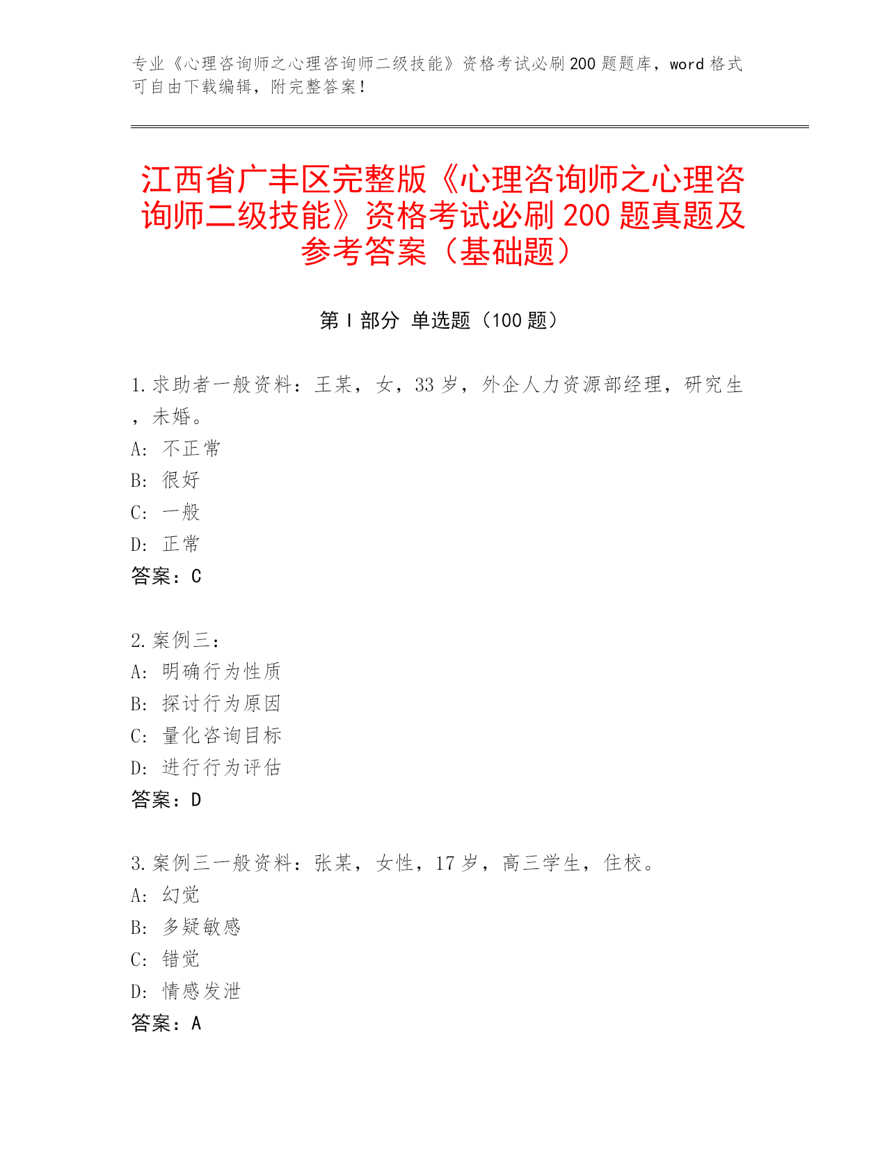 2024年江西省广丰区《心理咨询师之心理咨询师二级技能》资格考试必刷200题附答案(基础题)