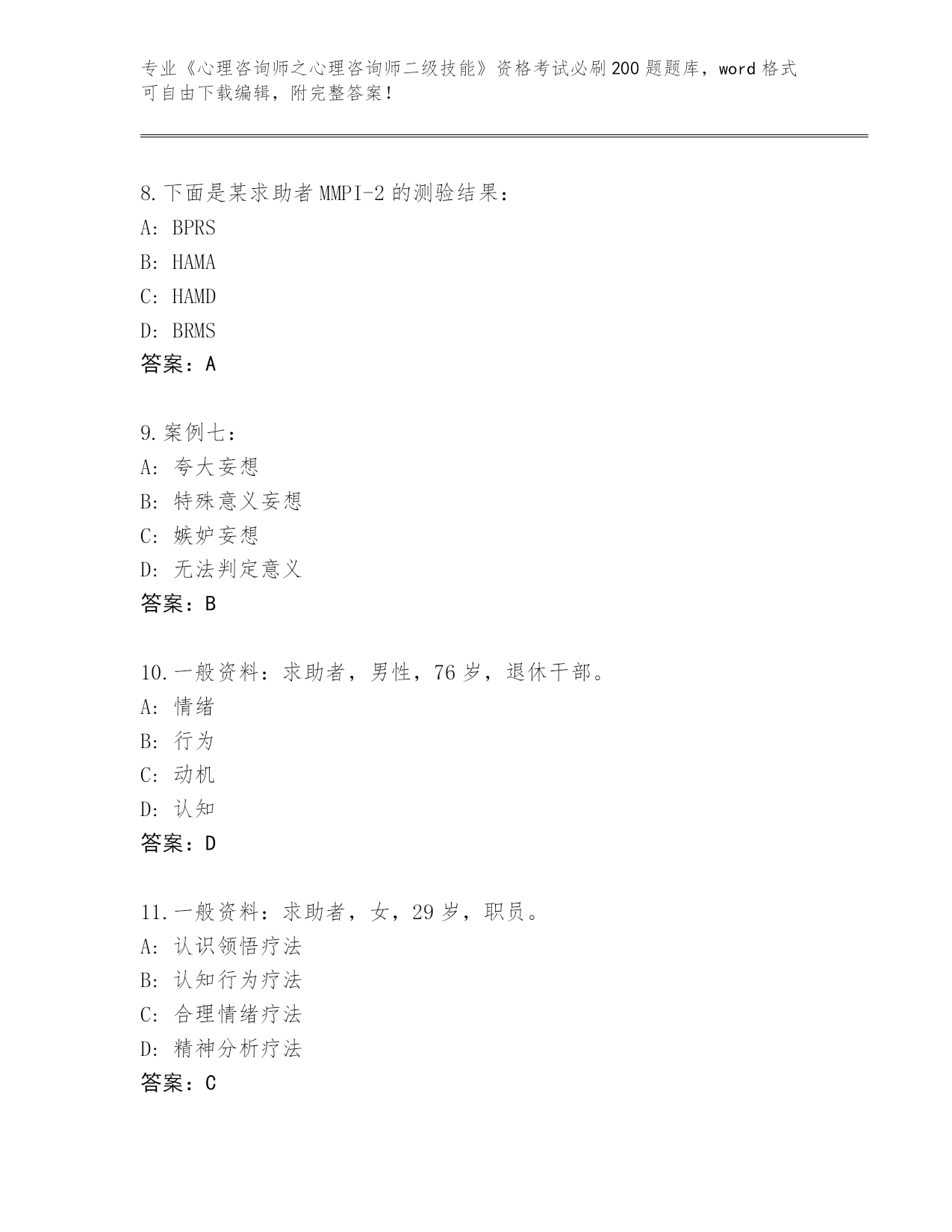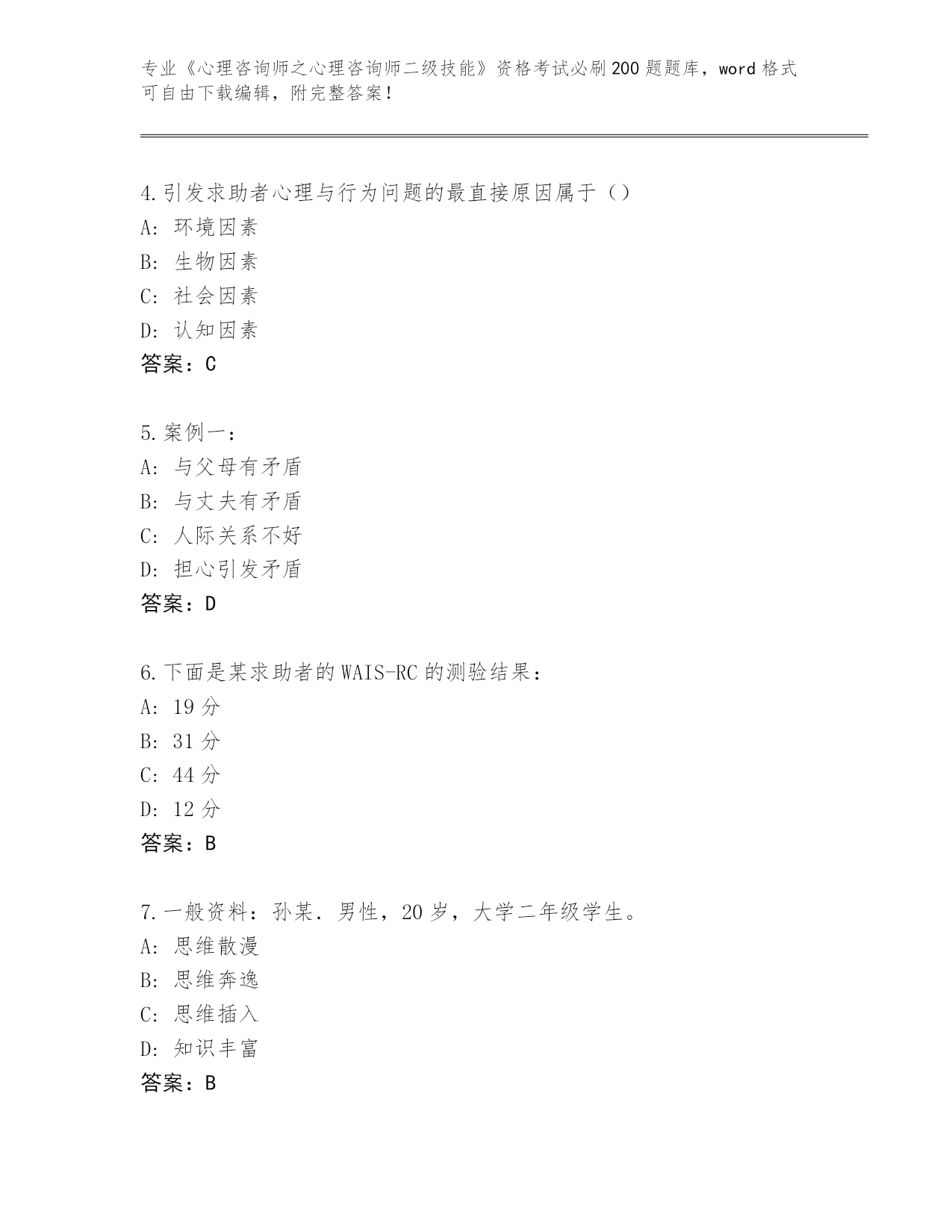 江西省修水县历年《心理咨询师之心理咨询师二级技能》考试必刷200题真题(基础题)