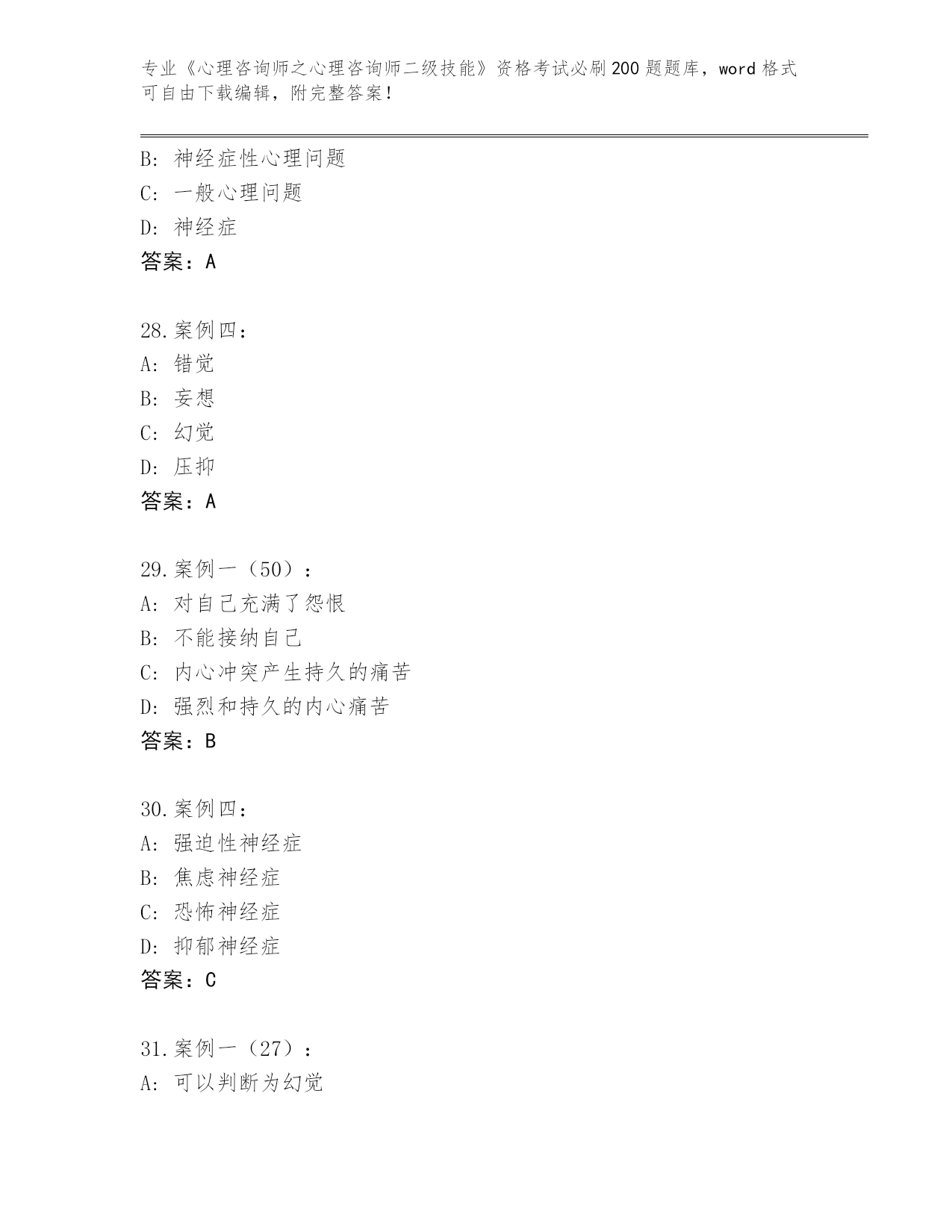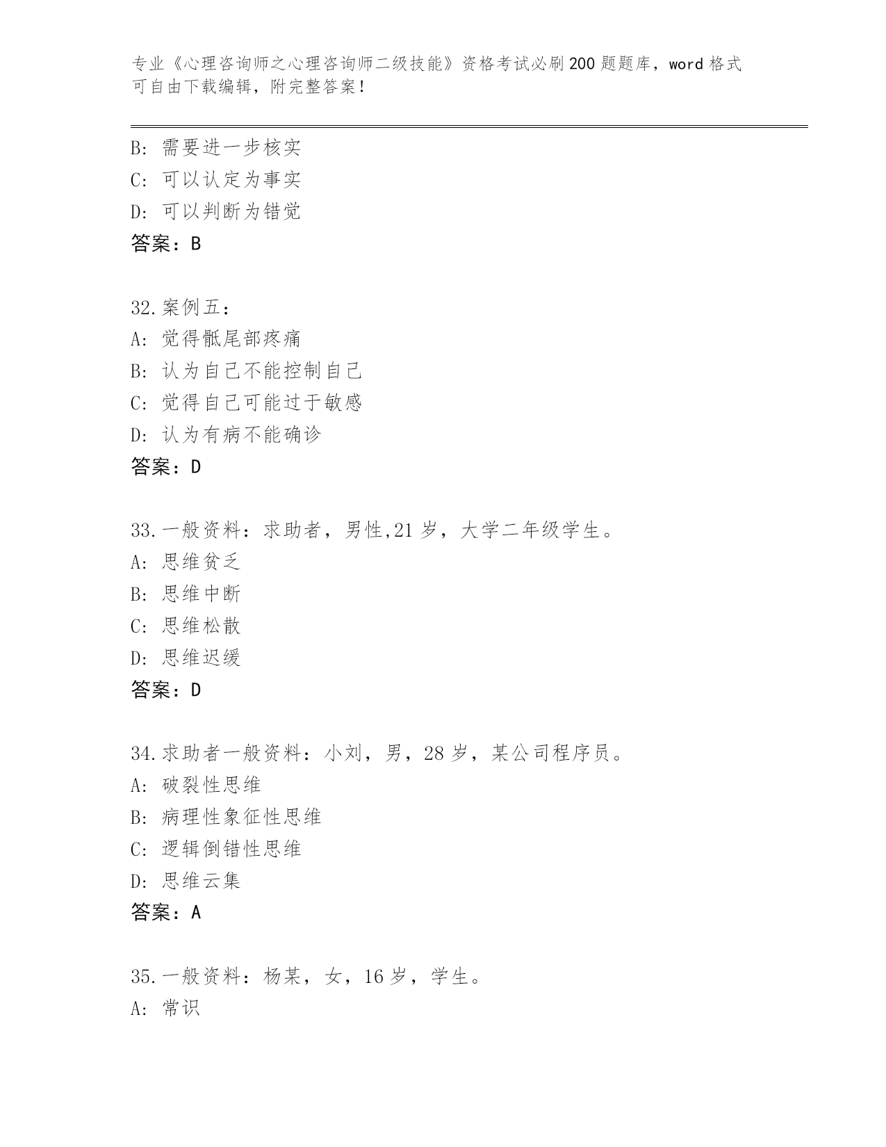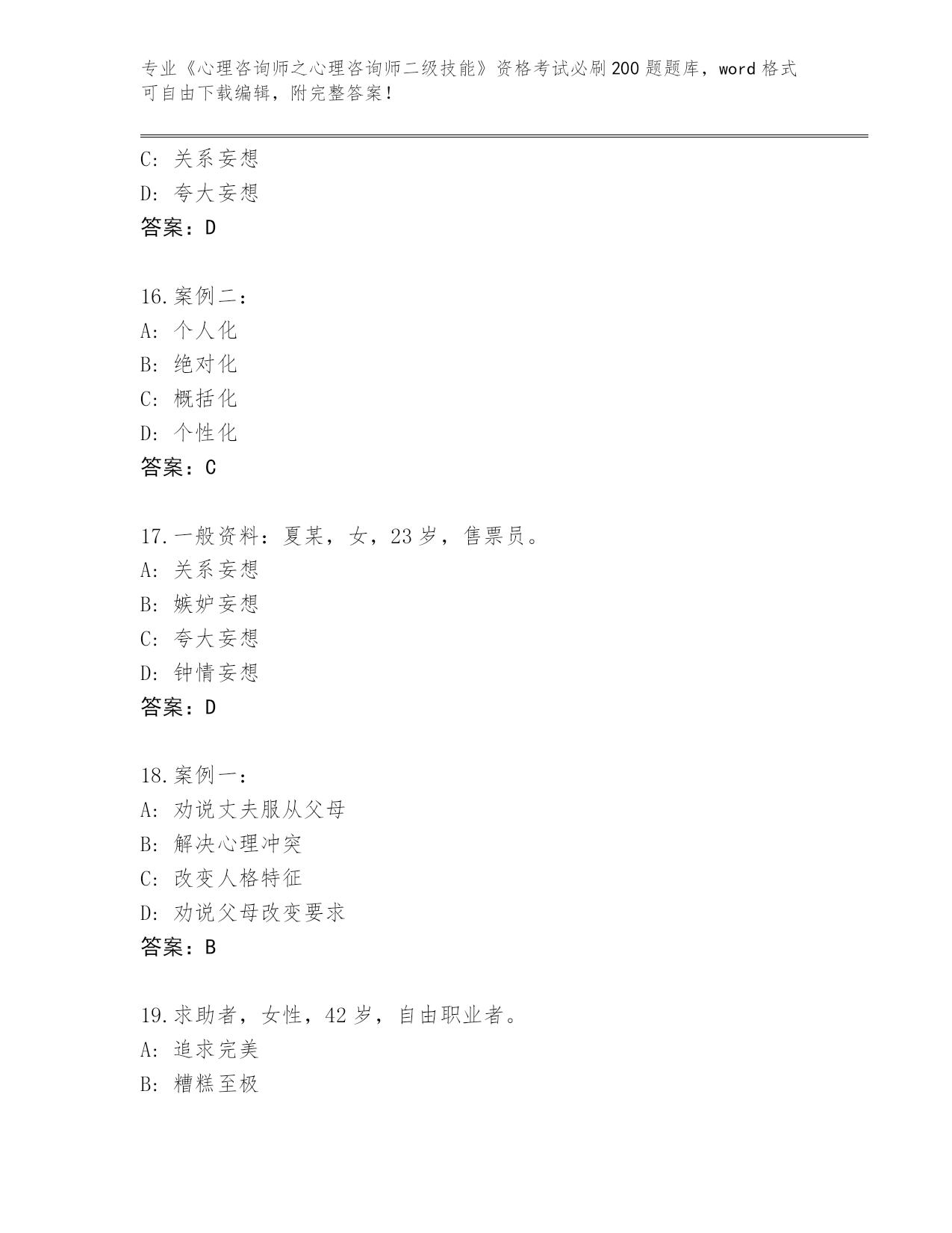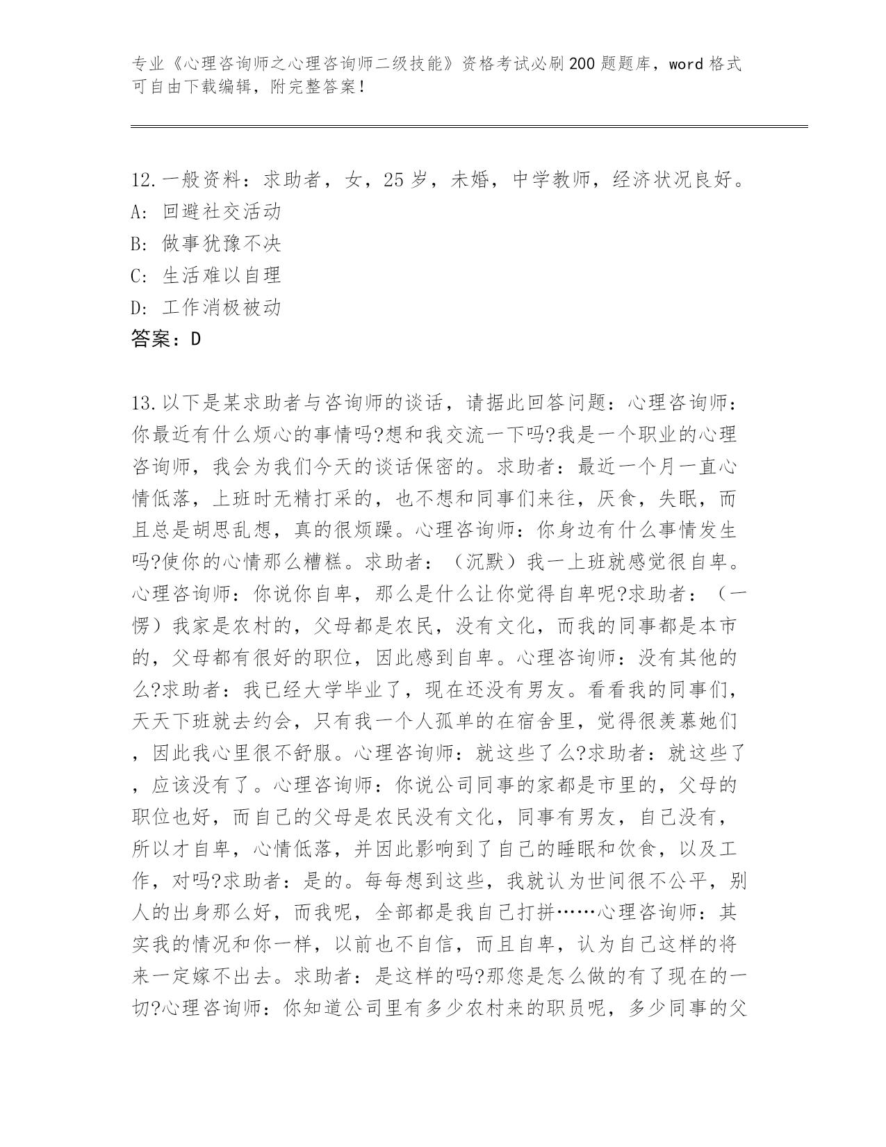江西省广丰区完整版《心理咨询师之心理咨询师二级技能》资格考试必刷200题真题及参考答案(基础题)