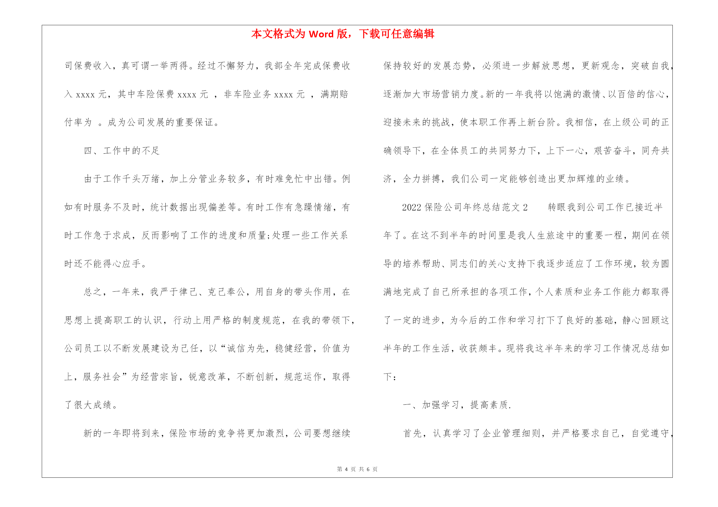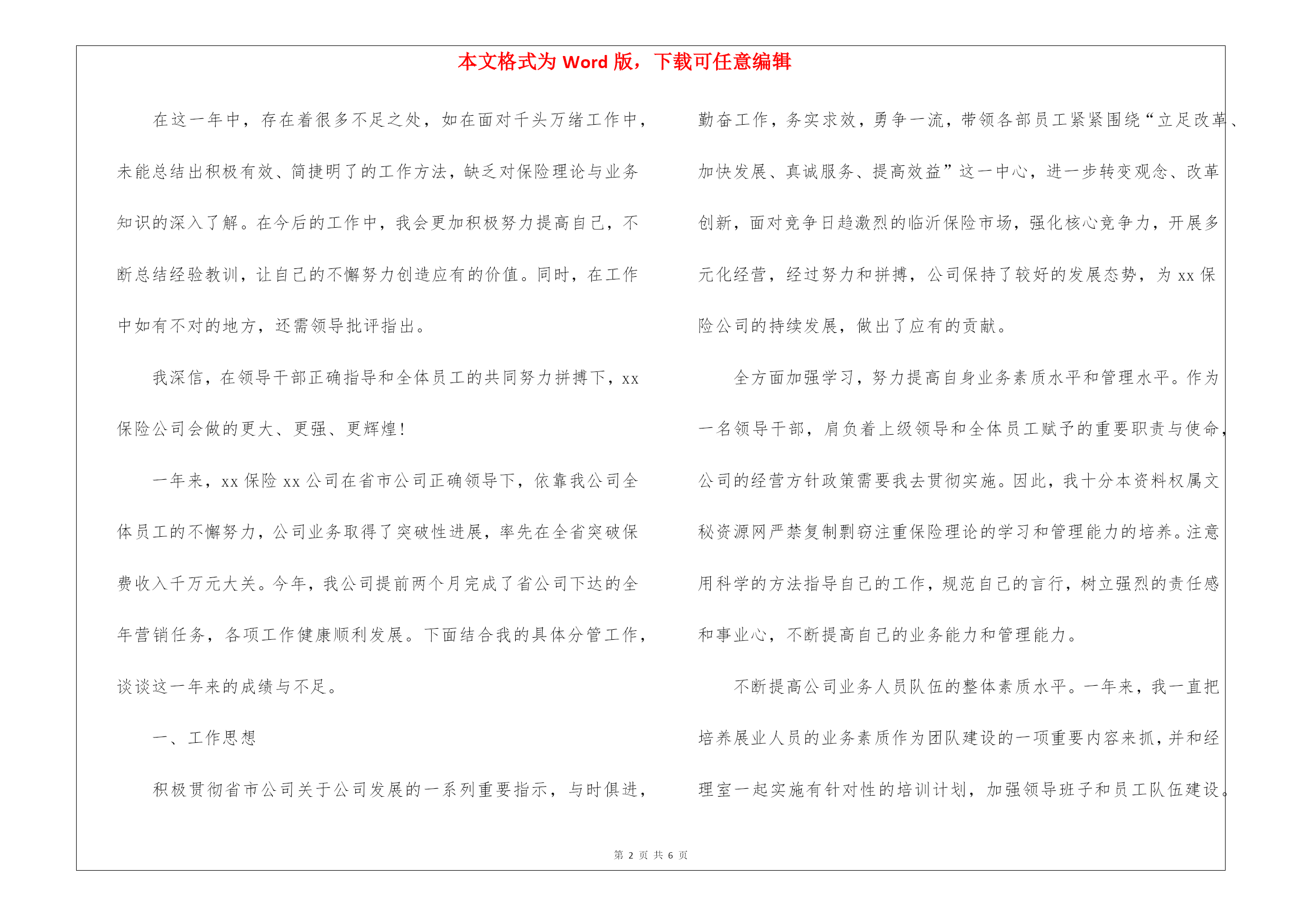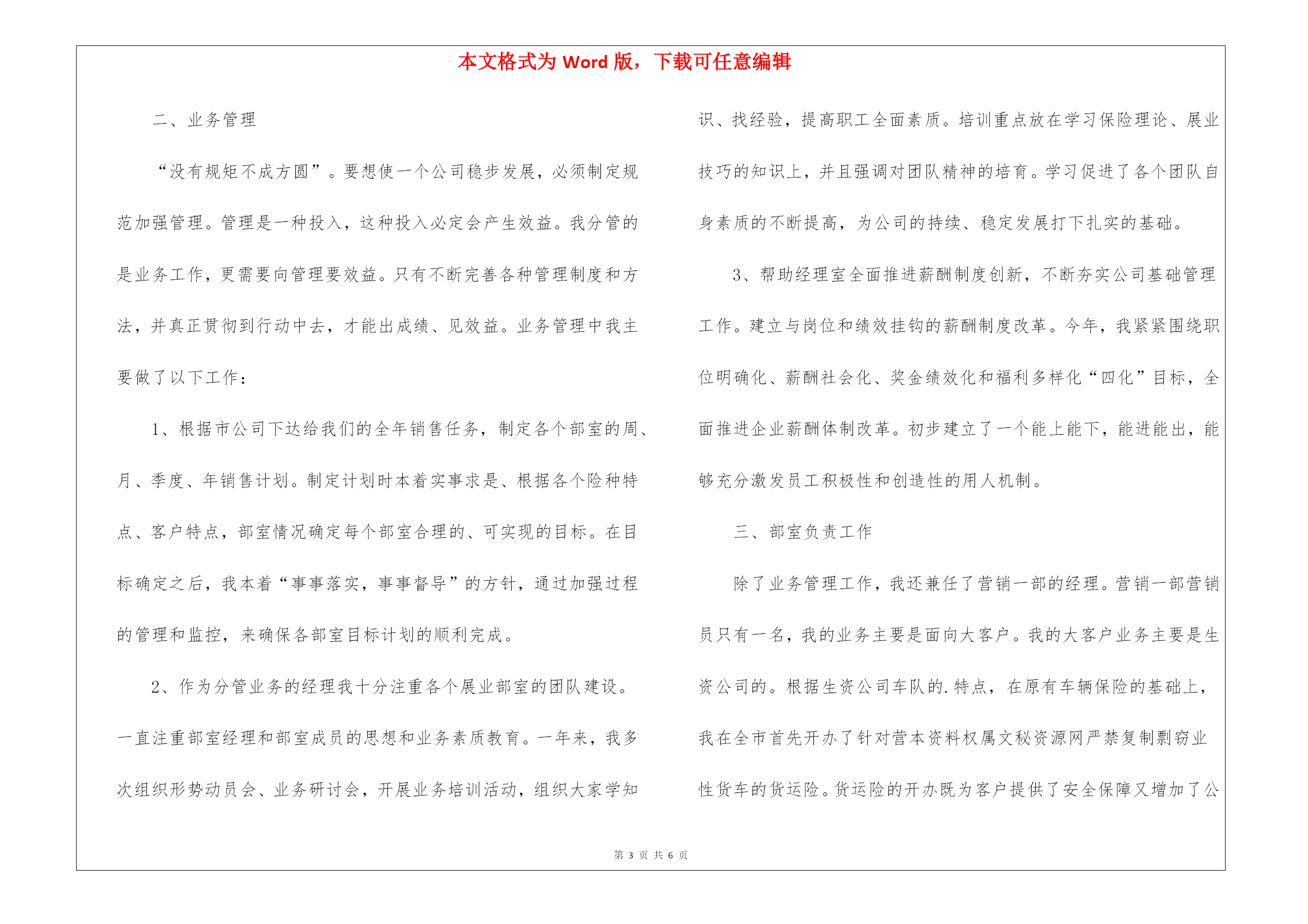 本文格式为Word版,下载可任意编辑第PAGE\*MERGEFORMAT6页共NUMPAGES\*MERGEFORMAT6页2022保险公司年终总结2022保险公司年终总结范文转眼间2022年即将过去,回首往事需要把这一年的工作进行总结。下面是我搜集整理的2022保险公司年终总结范文,欢迎阅读。2022保险公司年终总结范文1光阴似箭,转眼间xxx年即将进入尾声!作为保险公司一份子来说,首先感谢领导在这即将一年的工作中,对我的帮助支持与指导。同时,在这工作期间,有得也有失,现就将xxx年工作结如下:1、提高自身素质,履行自己的职责。今年2月份我步入到xx保险公司,从事保险这个陌生的行业。对于一个刚走出校门从事新型行业的毕业生来说,将会面临更大程度上新的挑战和考验。为了适应当前工作的需要,应该时刻把学习放在第一位,提高自身综合素质,特别是增强保险方面的知识,做一个真正的保险人。做为办公室一名机要员来说,主要工作就是上传下达、文件管理、档案管理以及零碎的事情,这些看似简单的事情,做起来却需要有足够的耐心,记得第一次拿出文件给领导看时,文件是一遍又一遍修改,一遍又一遍打印,甚至让自身泄气烦燥,可是后来将心比心,公司领导都可以不厌其烦认真对待每一个文件,乃至每一个字,而做为我显然是微不足道的,达到了培养耐心的良好目的。态度决定一切,在工作中我会继续竭尽全力做好自己的事情。2、执行做好领导交办的任务。做为自身来说,除了做好自己份内的事以外,执行领导交办的事情当然也是理所当然的。同时我积极配合领导安排的工作,做到腿勤,手勤,嘴勤,不怕苦,不怕累,对工作尽职尽责,尽量替领导分忧,提高了办事效率。3、在工作中存在的问题。在这一年中,存在着很多不足之处,如在面对千头万绪工作中,未能总结出积极有效、简捷明了的工作方法,缺乏对保险理论与业务知识的深入了解。在今后的工作中,我会更加积极努力提高自己,不断总结经验教训,让自己的不懈努力创造应有的价值。同时,在工作中如有不对的地方,还需领导批评指出。我深信,在领导干部正确指导和全体员工的共同努力拼搏下,xx保险公司会做的更大、更强、更辉煌!一年来,xx保险xx公司在省市公司正确领导下,依靠我公司全体员工的不懈努力,公司业务取得了突破性进展,率先在全省突破保费收入千万元大关。今年,我公司提前两个月完成了省公司下达的全年营销任务,各项工作健康顺利发展。下面结合我的具体分管工作,谈谈这一年来的成绩与不足。一、工作思想积极贯彻省市公司关于公司发展的一系列重要指示,与时俱进,勤奋工作,务实求效,勇争一流,带领各部员工紧紧围绕“立足改革、加快发展、真诚服务、提高效益”这一中心,进一步转变观念、改革创新,面对竞争日趋激烈的临沂保险市场,强化核心竞争力,开展多元化经营,经过努力和拼搏,公司保持了较好的发展态势,为xx保险公司的持续发展,做出了应有的贡献。全方面加强学习,努力提高自身业务素质水平和管理水平。作为一名领导干部,肩负着上级领导和全体员工赋予的重要职责与使命,公司的经营方针政策需要我去贯彻实施。因此,我十分本资料权属文秘资源网严禁复制剽窃注重保险理论的学习和管理能力的培养。注意用科学的方法指导自己的工作,规范自己的言行,树立强烈的责任感和事业心,不断提高自己的业务能力和管理能力。不断提高公司业务人员队伍的整体素质水平。一年来,我一直把培养展业人员的业务素质作为团队建设的一项重要内容来抓,并和经理室一起实施有针对性的培训计划,加强领导班子和员工队伍建设。二、业务管理“没有规矩不成方圆”。要想使一个公司稳步发展,必须制定规范加强管理。管理是一种投入,这种投入必定会产生效益。我分管的是业务工作,更需要向管理要效益。只有不断完善各种管理制度和方法,并真正贯彻到行动中去,才能出成绩、见效益。业务管理中我主要做了以下工作:1、根据市公司下达给我们的全年销售任务,制定各个部室的周、月、季度、年销售计划。制定计划时本着实事求是、根据各个险种特点、客户特点,部室情况确定每个部室合理的、可实现的目标。在目标确定之后,我本着“事事落实,事事督导”的方针,通过加强过程的管理和监控,来确保各部室目标计划的顺利完成。2、作为分管业务的经理我十分注重各个展业部室的团队建设。一直注重部室经理和部室成员的思想和业务素质教育。一年来,我多次组织形势动员会、业务研讨会,开展业务培训活动,组织大家学知识、找经验,提高职工全面素质。培训重点放在学习保险理论、展业技巧的知识上,并且强调对团队精神的培育。学习促进了各个团队自身素质的不断提高,为公司的持续、稳定发展打下扎实的基础。3、帮助经理室全面推进薪酬制度创新,不断夯实公司基础管理工作。建立与岗位和绩效挂钩的薪酬制度改革。今年,我紧紧围绕职位明确化、薪酬社会化、奖金绩效化和福利多样化“四