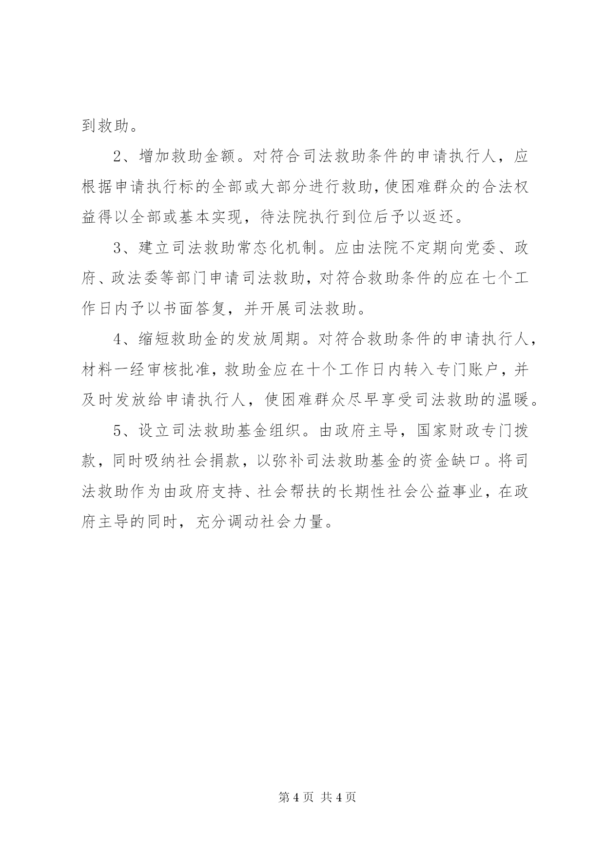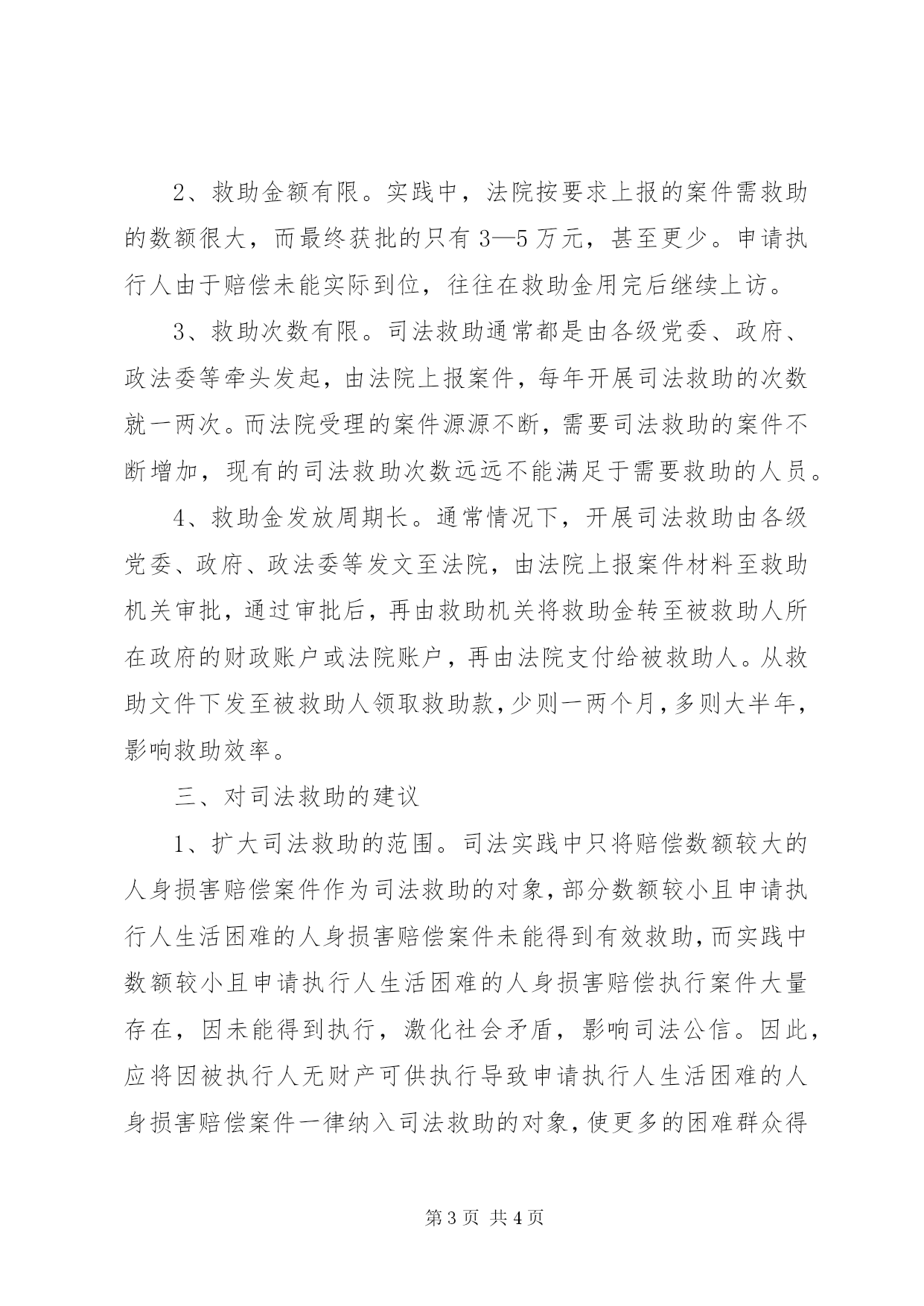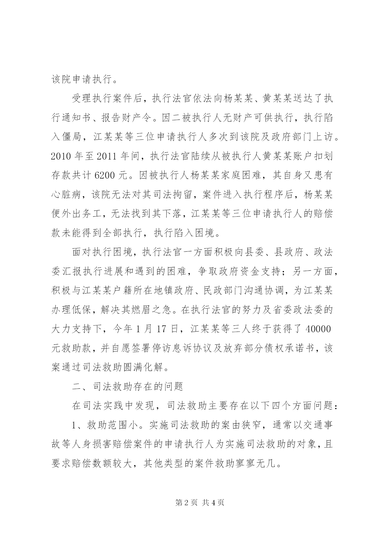 第PAGE\*Arabic\*MERGEFORMAT4页共NUMPAGES\*MERGEFORMAT4页司法救助存在问题调研报告范文为了切实解决涉诉信访案件申请执行人迫切需要解决的基本生活困难,维护社会公平与正义,体现为民司法的宗旨,针对已进入执行程序,而被执行人确无履行能力的涉民生案件申请执行人,xxxx省XX县区人民法院积极依靠各级党委领导和政府支持,通过司法救助,缓解当事人燃眉之急。自2013年12月份以来,该院共对7案12人进行司法救助,救助金额28.3万元,执结案件7件,取得良好的法律效果与社会效果。但是,实践中,一部分申请执行人因被执行人无财产可供执行而又未得到司法救助生活陷入困顿,时常到法院及政府部门上访、缠访,降低执行效率,损害司法公信。笔者现从一案例简要分析目前司法救助存在的问题,并提出相关建议。一、案件执行经过(江某某、徐某华、徐某风申请执行杨某某、黄某某雇员受害赔偿纠纷一案)2008年12月,被执行人黄某某将其自建房屋的墙体粉刷发包给被执行人杨某某承建,杨某某雇请徐某某与其一起粉刷墙体。同年12月11日,徐某某在从事雇佣工作中,不慎从脚手架上踩空摔跌至地上,经抢救无效于次日死亡。同年12月16日,徐某某亲属江某某等三人向XX县区人民法院起诉,2009年3月2日,该院判决杨某某、黄某某分别赔偿江某某等三人各项损失66091.5元、15530.5元。2009年4月28日,江某某等三人向该院申请执行。受理执行案件后,执行法官依法向杨某某、黄某某送达了执行通知书、报告财产令。因二被执行人无财产可供执行,执行陷入僵局,江某某等三位申请执行人多次到该院及政府部门上访。2010年至2011年间,执行法官陆续从被执行人黄某某账户扣划存款共计6200元。因被执行人杨某某家庭困难,其自身又患有心脏病,该院无法对其司法拘留,案件进入执行程序后,杨某某便外出务工,无法找到其下落,江某某等三位申请执行人的赔偿款未能得到全部执行,执行陷入困境。面对执行困境,执行法官一方面积极向县委、县政府、政法委汇报执行进展和遇到的困难,争取政府资金支持;另一方面,积极与江某某户籍所在地镇政府、民政部门沟通协调,为江某某办理低保,解决其燃眉之急。在执行法官的努力及省委政法委的大力支持下,今年1月17日,江某某等三人终于获得了40000元救助款,并自愿签署停访息诉协议及放弃部分债权承诺书,该案通过司法救助圆满化解。二、司法救助存在的问题在司法实践中发现,司法救助主要存在以下四个方面问题:1、救助范围小。实施司法救助的案由狭窄,通常以交通事故等人身损害赔偿案件的申请执行人为实施司法救助的对象,且要求赔偿数额较大,其他类型的案件救助寥寥无几。2、救助金额有限。实践中,法院按要求上报的案件需救助的数额很大,而最终获批的只有3—5万元,甚至更少。申请执行人由于赔偿未能实际到位,往往在救助金用完后继续上访。3、救助次数有限。司法救助通常都是由各级党委、政府、政法委等牵头发起,由法院上报案件,每年开展司法救助的次数就一两次。而法院受理的案件源源不断,需要司法救助的案件不断增加,现有的司法救助次数远远不能满足于需要救助的人员。4、救助金发放周期长。通常情况下,开展司法救助由各级党委、政府、政法委等发文至法院,由法院上报案件材料至救助机关审批,通过审批后,再由救助机关将救助金转至被救助人所在政府的财政账户或法院账户,再由法院支付给被救助人。从救助文件下发至被救助人领取救助款,少则一两个月,多则大半年,影响救助效率。三、对司法救助的建议1、扩大司法救助的范围。司法实践中只将赔偿数额较大的人身损害赔偿案件作为司法救助的对象,部分数额较小且申请执行人生活困难的人身损害赔偿案件未能得到有效救助,而实践中数额较小且申请执行人生活困难的人身损害赔偿执行案件大量存在,因未能得到执行,激化社会矛盾,影响司法公信。因此,应将因被执行人无财产可供执行导致申请执行人生活困难的人身损害赔偿案件一律纳入司法救助的对象,使更多的困难群众得到救助。2、增加救助金额。对符合司法救助条件的申请执行人,应根据申请执行标的全部或大部分进行救助,使困难群众的合法权益得以全部或基本实现,待法院执行到位后予以返还。3、建立司法救助常态化机制。应由法院不定期向党委、政府、政法委等部门申请司法救助,对符合救助条件的应在七个工作日内予以书面答复,并开展司法救助。4、缩短救助金的发放周期。对符合救助条件的申请执行人,材料一经审核批准,救助金应在十个工作日内转入专门账户,并及时发放给申请执行人,使困难群众尽早享受司法救助的温暖。5、设立司法救助基金组织。由政府主导,国家财政专门拨款,同时吸纳社会捐款,以弥补司法救助基金的资金缺口。将司法救助作为由政府支持、社会帮扶的长期性社会公益事业,在政府主