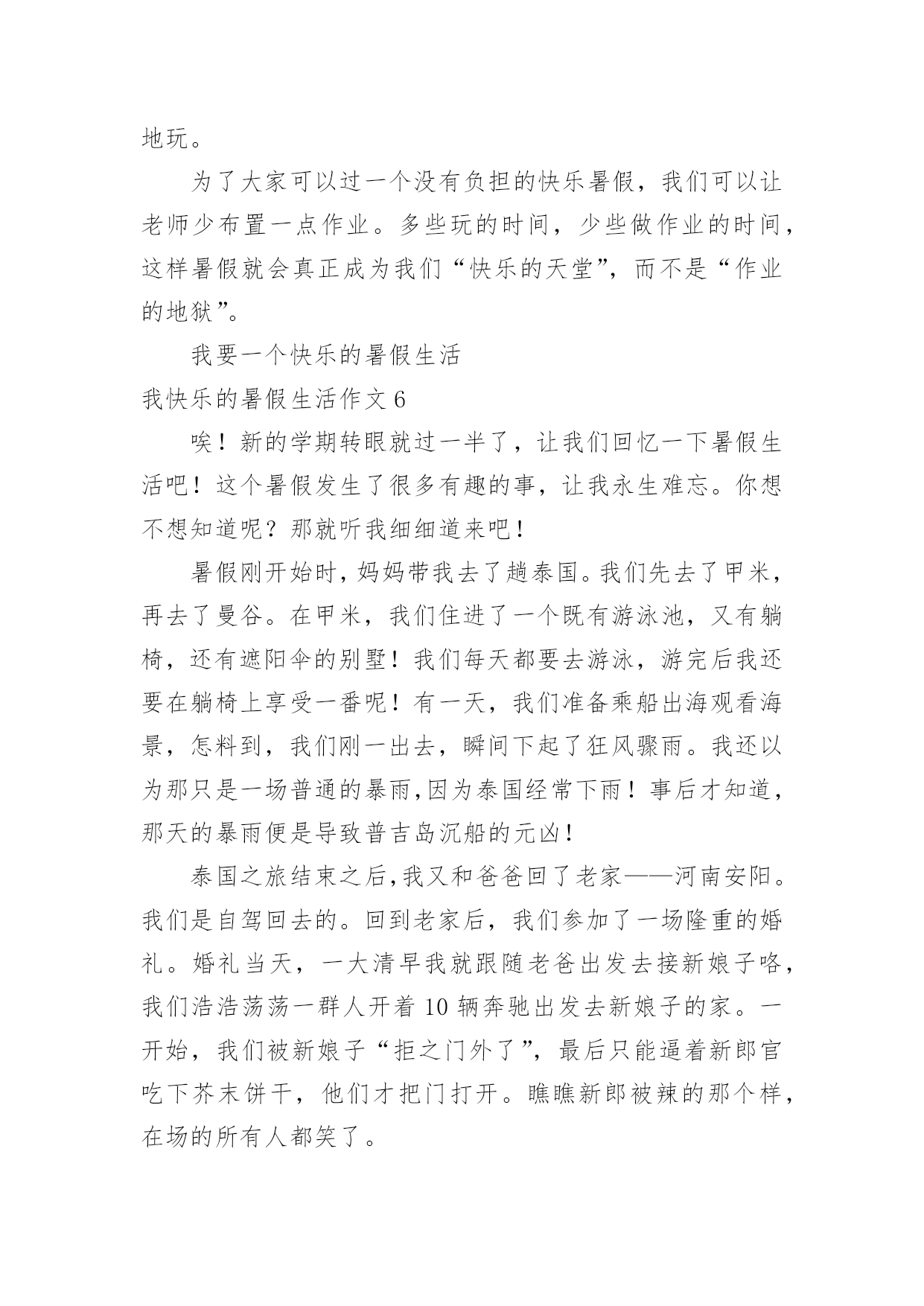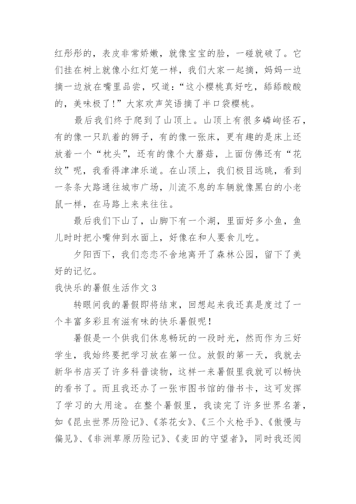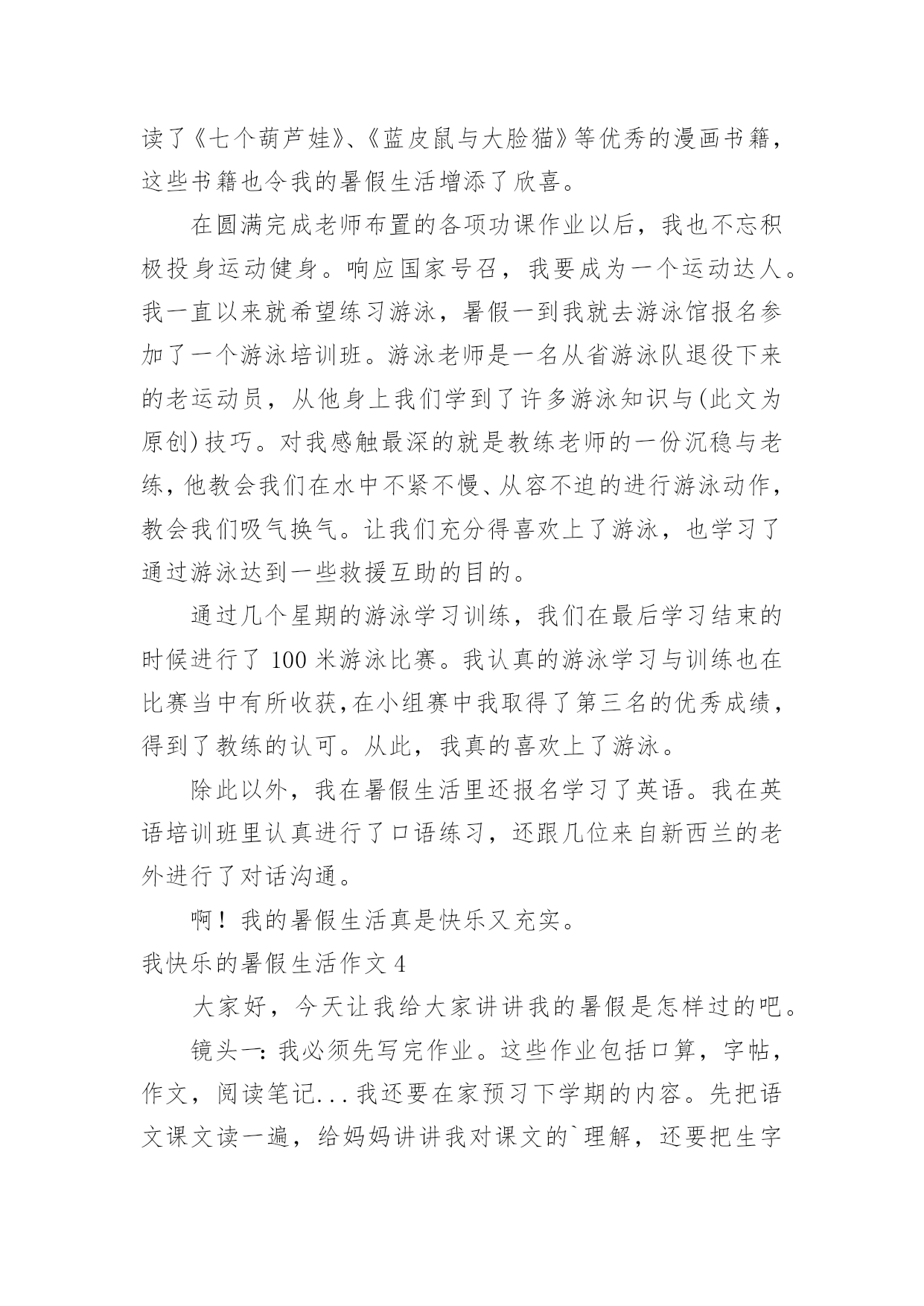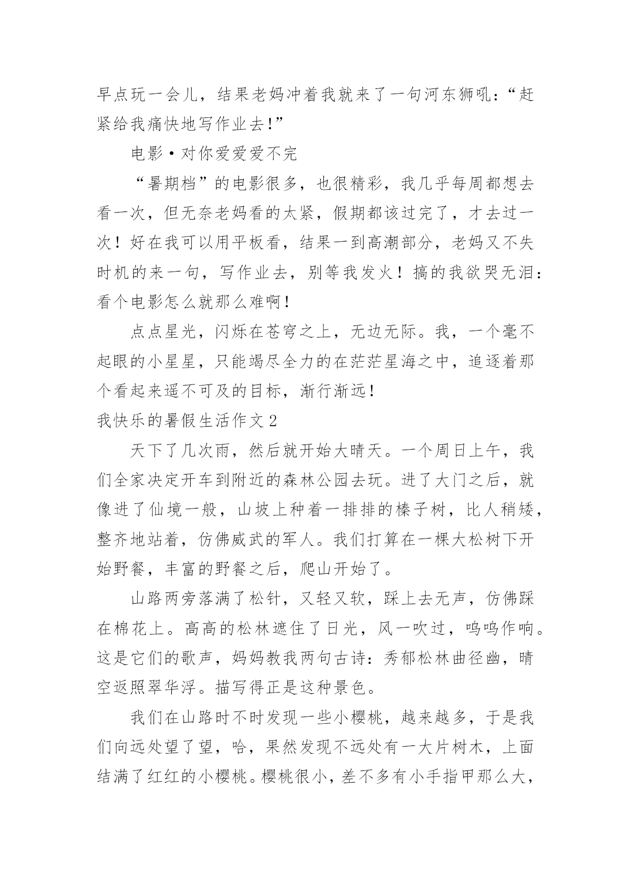 我快乐的暑假生活作文我快乐的暑假生活作文在日常生活或是工作学习中,许多人都有过写作文的经历,对作文都不陌生吧,作文是由文字组成,经过人的思想考虑,通过语言组织来表达一个主题意义的文体。那么,怎么去写作文呢?下面是小编帮大家整理的我快乐的暑假生活作文,欢迎大家借鉴与参考,希望对大家有所帮助。我快乐的暑假生活作文1我就是茫茫星海之中的一颗星,追逐的目标,渐行渐远!——题记作业·让我欢喜让我忧每天早上,我刚刚睡醒,睁开双眼,耳边就传来一声咆哮:还不快点儿起来写作业,你看看人家,都比你更用功!我总是心里有一万个不情愿,也只能满肚子委屈地爬起来写作业,心想:天天上课外班,课外班还有作业,我容易么我!当然也只能心里想想罢了,不然免不了又遭一通唠叨。我只能心不甘情不愿的写完作业去上课,一天又一天,周而复始。游戏·想说爱你不容易等我下课回来,心想:总算能玩会儿游戏了,开黑、打王者、充段位……脑子里满是游戏,正在这时老妈有不失时机的来一句:“写作业!”一写就写到了12点,还玩个屁呀,抱着作业就睡着了,只能在睡梦里玩。第二天早上,本想起早点玩一会儿,结果老妈冲着我就来了一句河东狮吼:“赶紧给我痛快地写作业去!”电影·对你爱爱爱不完“暑期档”的电影很多,也很精彩,我几乎每周都想去看一次,但无奈老妈看的太紧,假期都该过完了,才去过一次!好在我可以用平板看,结果一到高潮部分,老妈又不失时机的来一句,写作业去,别等我发火!搞的我欲哭无泪:看个电影怎么就那么难啊!点点星光,闪烁在苍穹之上,无边无际。我,一个毫不起眼的小星星,只能竭尽全力的在茫茫星海之中,追逐着那个看起来遥不可及的目标,渐行渐远!我快乐的暑假生活作文2天下了几次雨,然后就开始大晴天。一个周日上午,我们全家决定开车到附近的森林公园去玩。进了大门之后,就像进了仙境一般,山坡上种着一排排的榛子树,比人稍矮,整齐地站着,仿佛威武的军人。我们打算在一棵大松树下开始野餐,丰富的野餐之后,爬山开始了。山路两旁落满了松针,又轻又软,踩上去无声,仿佛踩在棉花上。高高的松林遮住了日光,风一吹过,呜呜作响。这是它们的歌声,妈妈教我两句古诗:秀郁松林曲径幽,晴空返照翠华浮。描写得正是这种景色。我们在山路时不时发现一些小樱桃,越来越多,于是我们向远处望了望,哈,果然发现不远处有一大片树木,上面结满了红红的小樱桃。樱桃很小,差不多有小手指甲那么大,红彤彤的,表皮非常娇嫩,就像宝宝的脸,一碰就破了。它们挂在树上就像小红灯笼一样,我们大家一起摘,妈妈一边摘一边放在嘴里品尝,叹道:“这小樱桃真好吃,舔舔酸酸的,美味极了!”大家欢声笑语摘了半口袋樱桃。最后我们终于爬到了山顶上。山顶上有很多嶙峋怪石,有的像一只趴着的狮子,有的像一张床,更有趣的是床上还放着一个“枕头”,还有的像个大蘑菇,上面仿佛还有“花纹”呢,我看得津津乐道。在山顶上,我们极目远眺,看到一条条大路通往城市广场,川流不息的车辆就像黑白的小老鼠一样,在马路上来来往往。最后我们下山了,山脚下有一个湖,里面好多小鱼,鱼儿时时把小嘴伸到水面上,好像在和人要食儿吃。夕阳西下,我们恋恋不舍地离开了森林公园,留下了美好的记忆。我快乐的暑假生活作文3转眼间我的暑假即将结束,回想起来我还真是度过了一个丰富多彩且有滋有味的快乐暑假呢!暑假是一个供我们休息畅玩的一段时光,然而作为三好学生,我始终要把学习放在第一位。放假的第一天,我就去新华书店买了许多科普读物,这样一来暑假里我就可以畅快的看书了。而且我还办了一张市图书馆的借书卡,这可发挥了学习的大用途。在整个暑假里,我读完了许多世界名著,如《昆虫世界历险记》、《茶花女》、《三个火枪手》、《傲慢与偏见》、《非洲草原历险记》、《麦田的守望者》,同时我还阅读了《七个葫芦娃》、《蓝皮鼠与大脸猫》等优秀的漫画书籍,这些书籍也令我的暑假生活增添了欣喜。在圆满完成老师布置的各项功课作业以后,我也不忘积极投身运动健身。响应国家号召,我要成为一个运动达人。我一直以来就希望练习游泳,暑假一到我就去游泳馆报名参加了一个游泳培训班。游泳老师是一名从省游泳队退役下来的老运动员,从他身上我们学到了许多游泳知识与(此文为原创)技巧。对我感触最深的就是教练老师的一份沉稳与老练,他教会我们在水中不紧不慢、从容不迫的进行游泳动作,教会我们吸气换气。让我们充分得喜欢上了游泳,也学习了通过游泳达到一些救援互助的目的。通过几个星期的游泳学习训练,我们在最后学习结束的时候进行了100米游泳比赛。我认真的游泳学习与训练也在比赛当中有所收获,在小组赛中我取得了第三名的优秀成绩,得到了教练的认可。从此,我真的喜欢上了游泳。除此以外,我在暑假生活里还报名学习了英语。我在英语培训班里认真进行了口语练习,还跟几位来自新西兰的老外进行了对话沟通。啊!我的暑假生活真是快乐又充实。我快乐的暑假