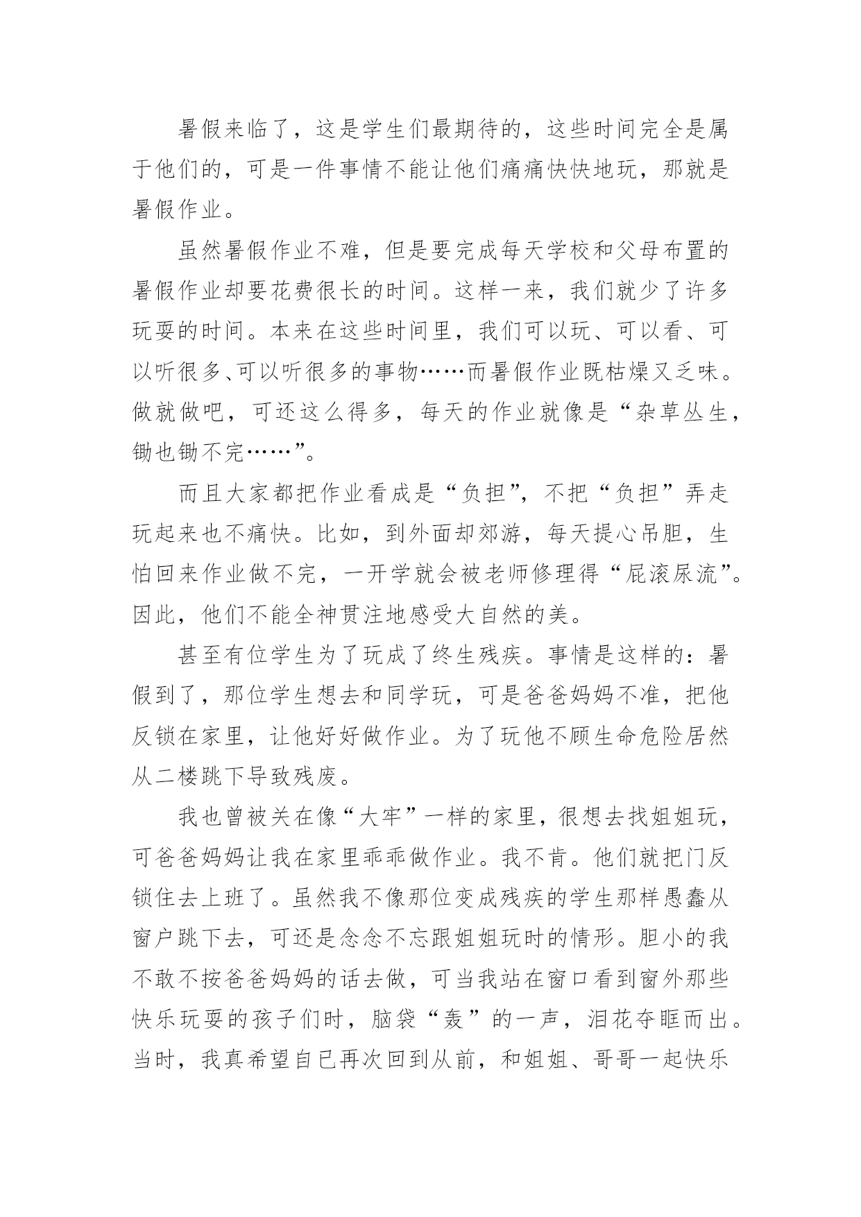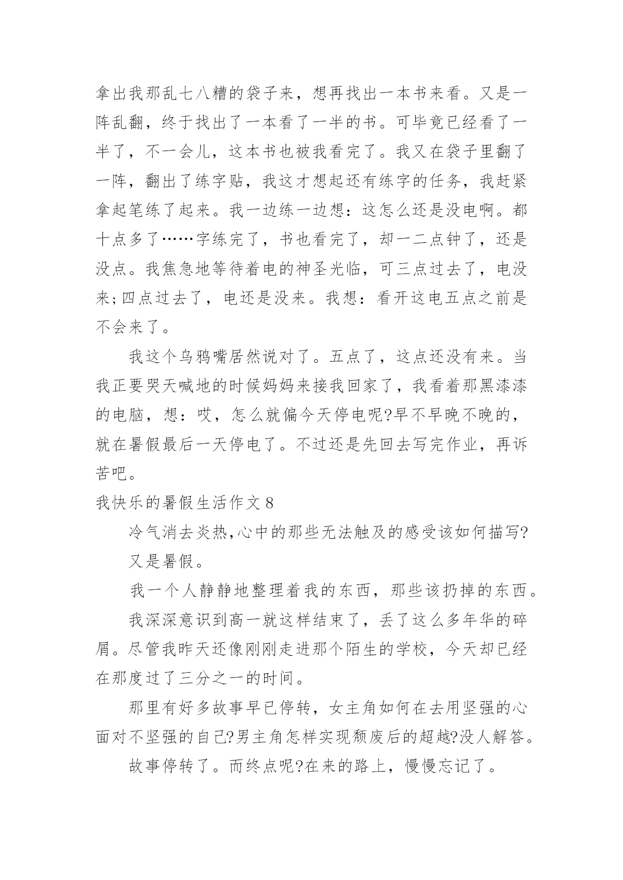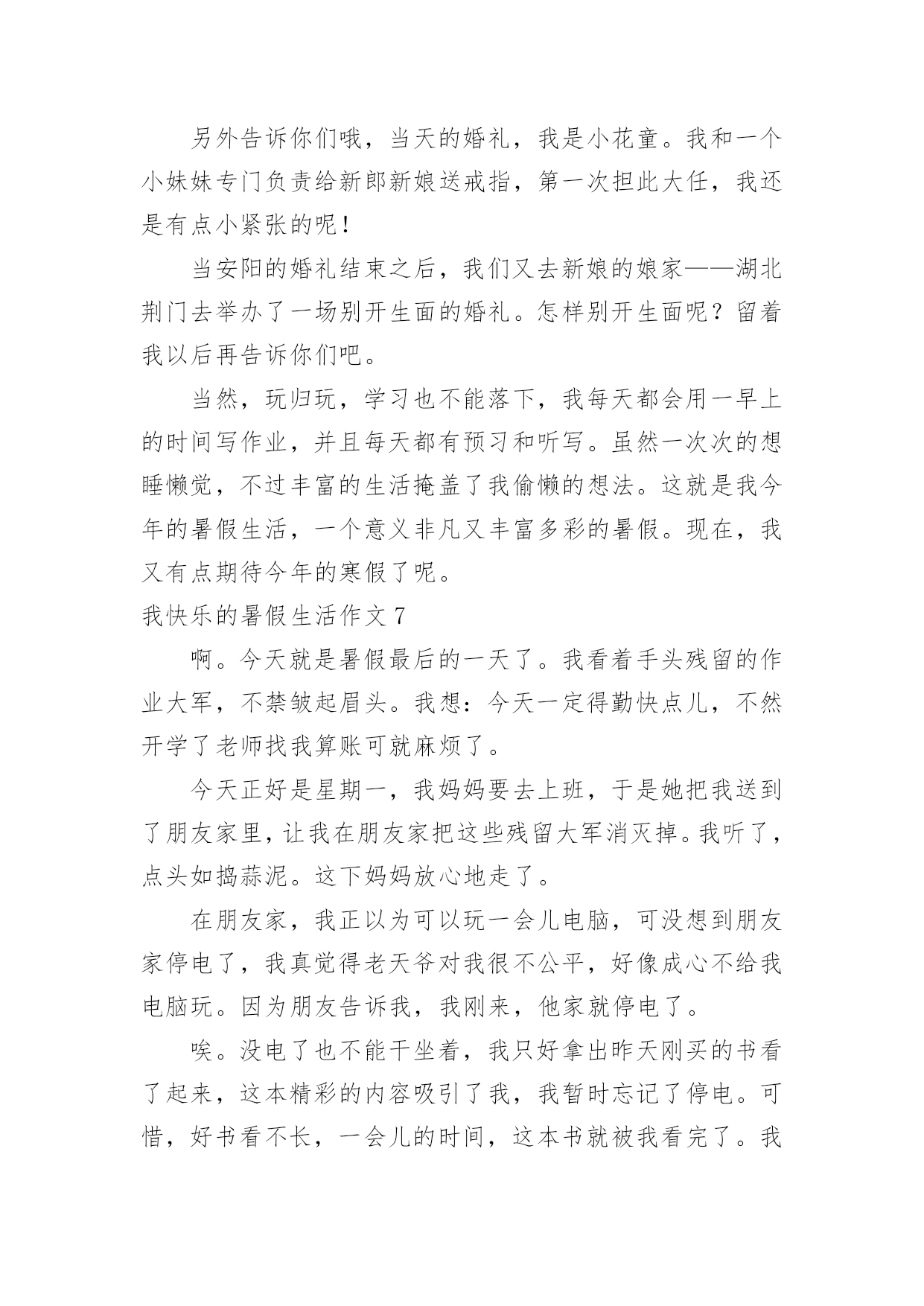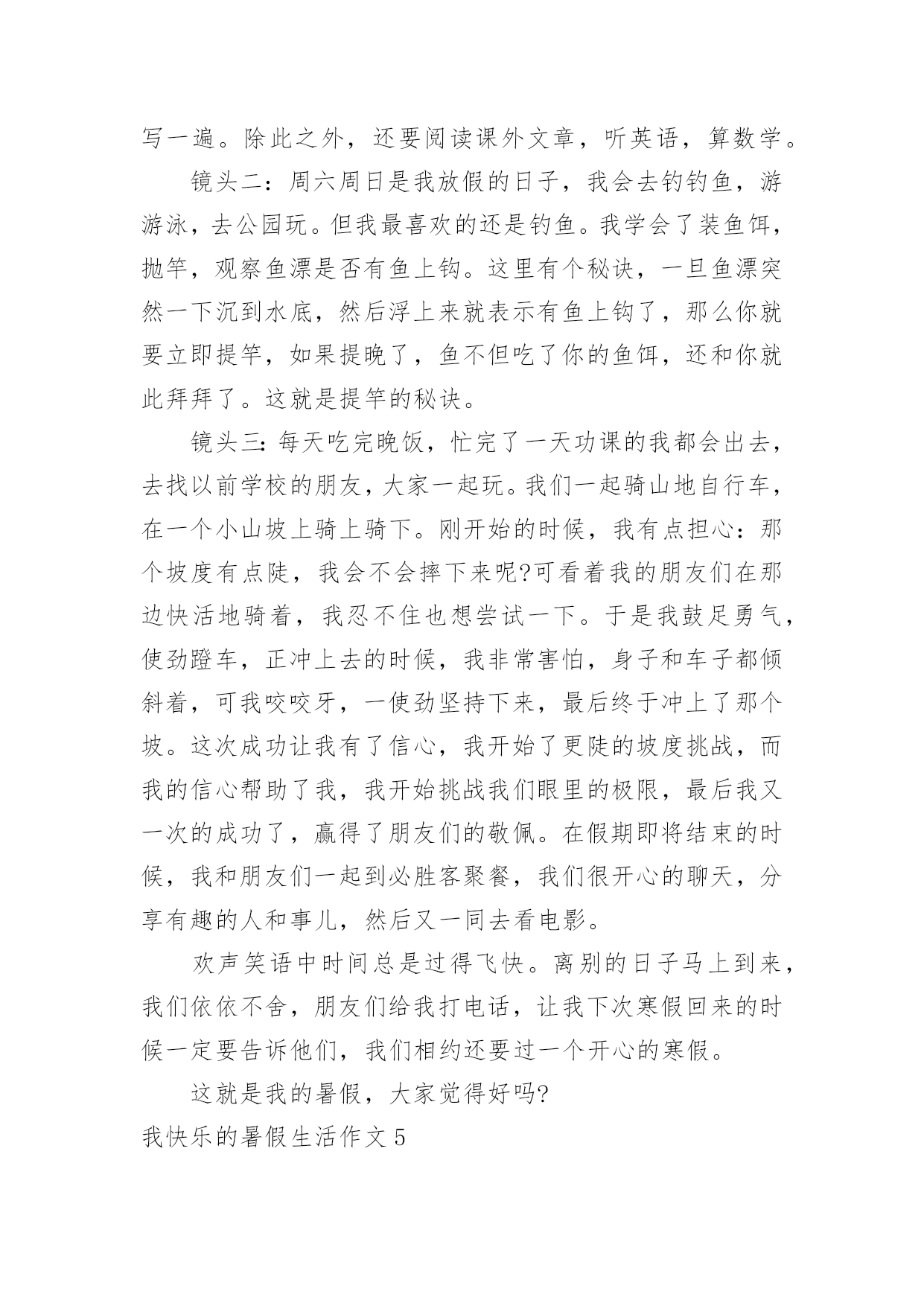 我快乐的暑假生活作文我快乐的暑假生活作文在日常生活或是工作学习中,许多人都有过写作文的经历,对作文都不陌生吧,作文是由文字组成,经过人的思想考虑,通过语言组织来表达一个主题意义的文体。那么,怎么去写作文呢?下面是小编帮大家整理的我快乐的暑假生活作文,欢迎大家借鉴与参考,希望对大家有所帮助。我快乐的暑假生活作文1我就是茫茫星海之中的一颗星,追逐的目标,渐行渐远!——题记作业·让我欢喜让我忧每天早上,我刚刚睡醒,睁开双眼,耳边就传来一声咆哮:还不快点儿起来写作业,你看看人家,都比你更用功!我总是心里有一万个不情愿,也只能满肚子委屈地爬起来写作业,心想:天天上课外班,课外班还有作业,我容易么我!当然也只能心里想想罢了,不然免不了又遭一通唠叨。我只能心不甘情不愿的写完作业去上课,一天又一天,周而复始。游戏·想说爱你不容易等我下课回来,心想:总算能玩会儿游戏了,开黑、打王者、充段位……脑子里满是游戏,正在这时老妈有不失时机的来一句:“写作业!”一写就写到了12点,还玩个屁呀,抱着作业就睡着了,只能在睡梦里玩。第二天早上,本想起早点玩一会儿,结果老妈冲着我就来了一句河东狮吼:“赶紧给我痛快地写作业去!”电影·对你爱爱爱不完“暑期档”的电影很多,也很精彩,我几乎每周都想去看一次,但无奈老妈看的太紧,假期都该过完了,才去过一次!好在我可以用平板看,结果一到高潮部分,老妈又不失时机的来一句,写作业去,别等我发火!搞的我欲哭无泪:看个电影怎么就那么难啊!点点星光,闪烁在苍穹之上,无边无际。我,一个毫不起眼的小星星,只能竭尽全力的在茫茫星海之中,追逐着那个看起来遥不可及的目标,渐行渐远!我快乐的暑假生活作文2天下了几次雨,然后就开始大晴天。一个周日上午,我们全家决定开车到附近的森林公园去玩。进了大门之后,就像进了仙境一般,山坡上种着一排排的榛子树,比人稍矮,整齐地站着,仿佛威武的军人。我们打算在一棵大松树下开始野餐,丰富的野餐之后,爬山开始了。山路两旁落满了松针,又轻又软,踩上去无声,仿佛踩在棉花上。高高的松林遮住了日光,风一吹过,呜呜作响。这是它们的歌声,妈妈教我两句古诗:秀郁松林曲径幽,晴空返照翠华浮。描写得正是这种景色。我们在山路时不时发现一些小樱桃,越来越多,于是我们向远处望了望,哈,果然发现不远处有一大片树木,上面结满了红红的小樱桃。樱桃很小,差不多有小手指甲那么大,红彤彤的,表皮非常娇嫩,就像宝宝的脸,一碰就破了。它们挂在树上就像小红灯笼一样,我们大家一起摘,妈妈一边摘一边放在嘴里品尝,叹道:“这小樱桃真好吃,舔舔酸酸的,美味极了!”大家欢声笑语摘了半口袋樱桃。最后我们终于爬到了山顶上。山顶上有很多嶙峋怪石,有的像一只趴着的狮子,有的像一张床,更有趣的是床上还放着一个“枕头”,还有的像个大蘑菇,上面仿佛还有“花纹”呢,我看得津津乐道。在山顶上,我们极目远眺,看到一条条大路通往城市广场,川流不息的车辆就像黑白的小老鼠一样,在马路上来来往往。最后我们下山了,山脚下有一个湖,里面好多小鱼,鱼儿时时把小嘴伸到水面上,好像在和人要食儿吃。夕阳西下,我们恋恋不舍地离开了森林公园,留下了美好的记忆。我快乐的暑假生活作文3转眼间我的暑假即将结束,回想起来我还真是度过了一个丰富多彩且有滋有味的快乐暑假呢!暑假是一个供我们休息畅玩的一段时光,然而作为三好学生,我始终要把学习放在第一位。放假的第一天,我就去新华书店买了许多科普读物,这样一来暑假里我就可以畅快的看书了。而且我还办了一张市图书馆的借书卡,这可发挥了学习的大用途。在整个暑假里,我读完了许多世界名著,如《昆虫世界历险记》、《茶花女》、《三个火枪手》、《傲慢与偏见》、《非洲草原历险记》、《麦田的守望者》,同时我还阅读了《七个葫芦娃》、《蓝皮鼠与大脸猫》等优秀的漫画书籍,这些书籍也令我的暑假生活增添了欣喜。在圆满完成老师布置的各项功课作业以后,我也不忘积极投身运动健身。响应国家号召,我要成为一个运动达人。我一直以来就希望练习游泳,暑假一到我就去游泳馆报名参加了一个游泳培训班。游泳老师是一名从省游泳队退役下来的老运动员,从他身上我们学到了许多游泳知识与(此文为原创)技巧。对我感触最深的就是教练老师的一份沉稳与老练,他教会我们在水中不紧不慢、从容不迫的进行游泳动作,教会我们吸气换气。让我们充分得喜欢上了游泳,也学习了通过游泳达到一些救援互助的目的。通过几个星期的游泳学习训练,我们在最后学习结束的时候进行了100米游泳比赛。我认真的游泳学习与训练也在比赛当中有所收获,在小组赛中我取得了第三名的优秀成绩,得到了教练的认可。从此,我真的喜欢上了游泳。除此以外,我在暑假生活里还报名学习了英语。我在英语培训班里认真进行了口语练习,还跟几位来自新西兰的老外进行了对话沟通。啊!我的暑假生活真是快乐又充实。我快乐的暑假