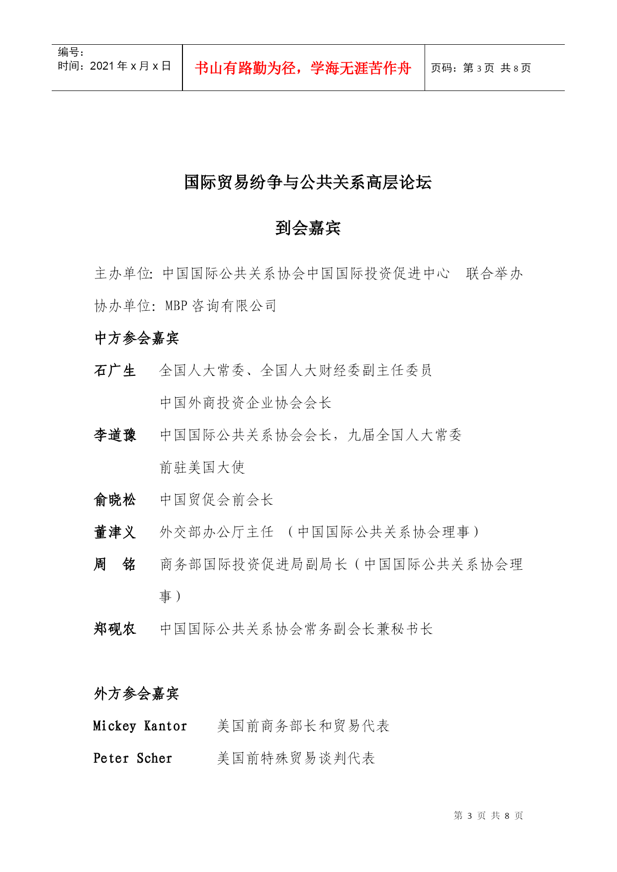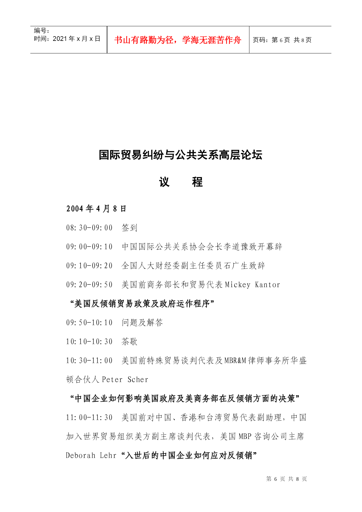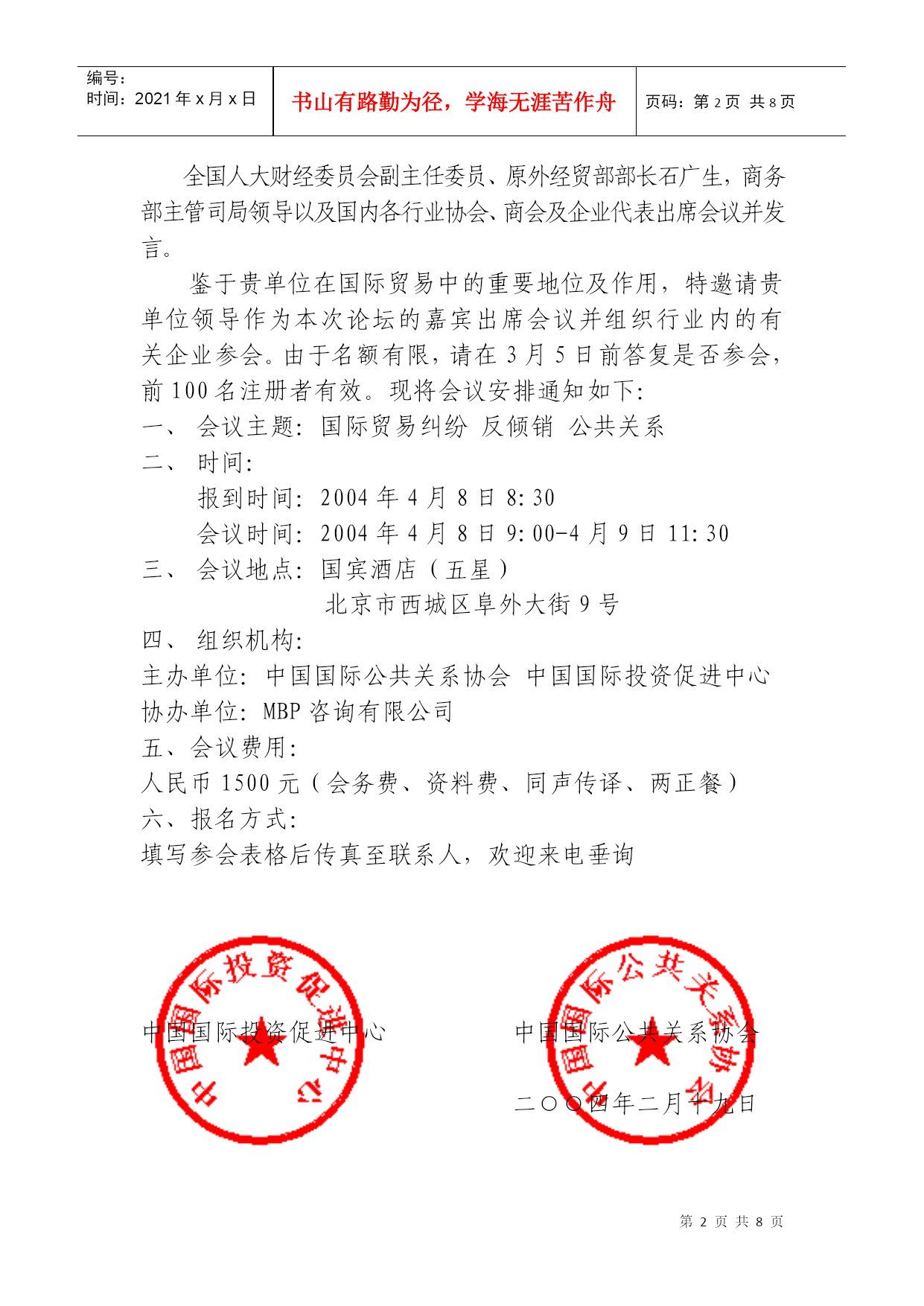 编号:时间:2021年x月x日书山有路勤为径,学海无涯苦作舟页码:第PAGE8页共NUMPAGES8页第PAGE\*MERGEFORMAT8页共NUMPAGES\*MERGEFORMAT8页附件1文件中国国际公共关系协会中国国际投资促进中心国公协[2004]第1号关于举办国际贸易纷争与公共关系高层论坛的通知各有关单位:随着改革开放的不断深入和社会主义市场经济的建立,中国的出口贸易得到快速发展,尤其是加入世贸组织后。在世界市场保持低迷的情况下,中国出口仍保持了高速增长的势头,为国家总体经济发展发挥了重要作用。但与此同时,贸易保护主义在美、欧一些国家有越演越烈的趋势,频繁的贸易摩擦阻碍了我国企业的国际化进程。为帮助中国企业更好地面对未来的国际贸易摩擦,尤其是应对反倾销的压力,中国国际公共关系协会与中国国际投资促进中心将共同举办“国际贸易纷争与公共关系高层论坛”,邀请美欧资深专家讲解美欧在反倾销方面的政府决策程序、法律环境及运用公关手段解决贸易争端的成功案例,提高中国企业面对反倾销的应对能力。此次论坛将邀请美国前商务部长和贸易代表MickeyKantor、美国前特殊贸易谈判代表PeterScher、美国对中国、香港和台湾贸易代表副助理及中国加入世界贸易组织美方副主席谈判代表DeborahLehr、欧洲优秀的反倾销专家CliffStevenson及美国福莱国际传播咨询公司和美国伟达中联公共关系顾问有限公司中国区总裁等作为演讲嘉宾。全国人大财经委员会副主任委员、原外经贸部部长石广生,商务部主管司局领导以及国内各行业协会、商会及企业代表出席会议并发言。鉴于贵单位在国际贸易中的重要地位及作用,特邀请贵单位领导作为本次论坛的嘉宾出席会议并组织行业内的有关企业参会。由于名额有限,请在3月5日前答复是否参会,前100名注册者有效。现将会议安排通知如下:会议主题:国际贸易纠纷反倾销公共关系时间:报到时间:2004年4月8日8:30会议时间:2004年4月8日9:00-4月9日11:30会议地点:国宾酒店(五星)北京市西城区阜外大街9号组织机构:主办单位:中国国际公共关系协会中国国际投资促进中心协办单位:MBP咨询有限公司五、会议费用:人民币1500元(会务费、资料费、同声传译、两正餐)六、报名方式:填写参会表格后传真至联系人,欢迎来电垂询中国国际投资促进中心中国国际公共关系协会二○○四年二月十九日国际贸易纷争与公共关系高层论坛到会嘉宾主办单位:中国国际公共关系协会中国国际投资促进中心联合举办协办单位:MBP咨询有限公司中方参会嘉宾石广生全国人大常委、全国人大财经委副主任委员中国外商投资企业协会会长李道豫中国国际公共关系协会会长,九届全国人大常委前驻美国大使俞晓松中国贸促会前会长董津义外交部办公厅主任(中国国际公共关系协会理事)周铭商务部国际投资促进局副局长(中国国际公共关系协会理事)郑砚农中国国际公共关系协会常务副会长兼秘书长外方参会嘉宾MickeyKantor美国前商务部长和贸易代表PeterScher美国前特殊贸易谈判代表DeborahLehr美国前对中国、香港和台湾贸易代表副助理、中国加入世界贸易组织美方副主席谈判代表Dr.Johann-ChristophGaedertzMBR&M律师事务所法兰克福合伙人CliffStevenson欧洲优秀的反倾销专家演讲嘉宾MickeyKantor美国前商务部长和贸易代表PeterScher美国前特殊贸易谈判代表DeborahLehr美国MBP咨询公司主席Dr.Johann-ChristophGaedertzMBR&M律师事务所法兰克福合伙人CliffStevenson欧洲优秀的反倾销专家李宏美国福莱公关公司全球副总裁及中国区董事总经理JeffSmith美国伟达中联公共关系顾问有限公司中国区董事总经理黄发静温州日丰打火机有限公司董事长商务部公平贸易局、条法司有关领导特邀嘉宾高勇中国纺织工业协会副会长王沈阳中国纺织品商会会长姜枫中国家电协会会长陈卫中国工业经济联合会副秘书长王文哲中国食品工业协会会长.(黄圣明中国食品工业协会秘书长)陈士能中国轻工业联合会会长王广德中国煤炭工业协会秘书长郝为民中国通信企业协会副会长、秘书长王锦霞中国医药商业协会秘书长延华四川省企业家协会秘书长中国外商投资企业协会国际贸易纠纷与公共关系高层论坛议程2004年4月8日08:30-09:00签到09:00-09:10中国国际公共关系协会会长李道豫致开幕辞09:10-09:20全国人大财经委副主任委员石