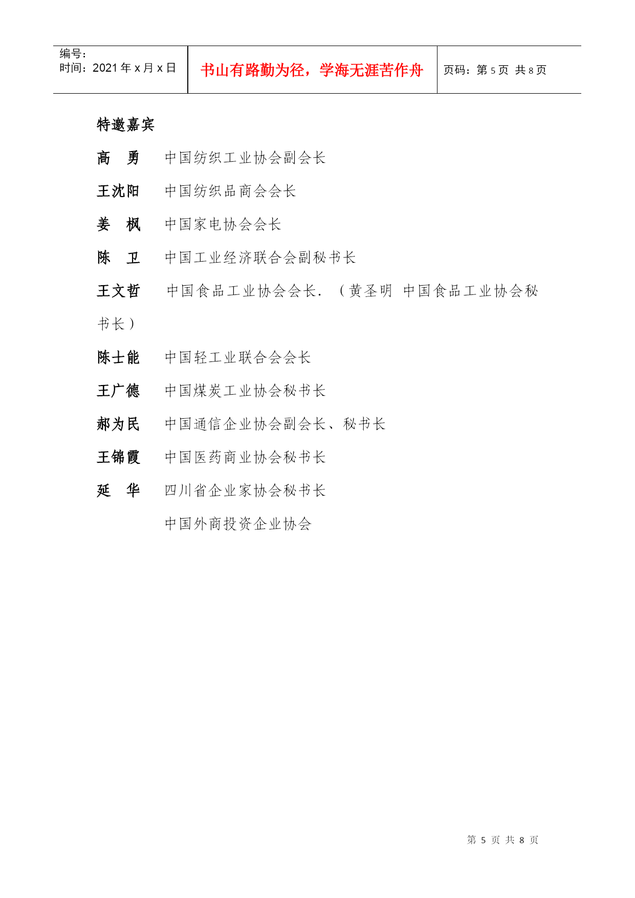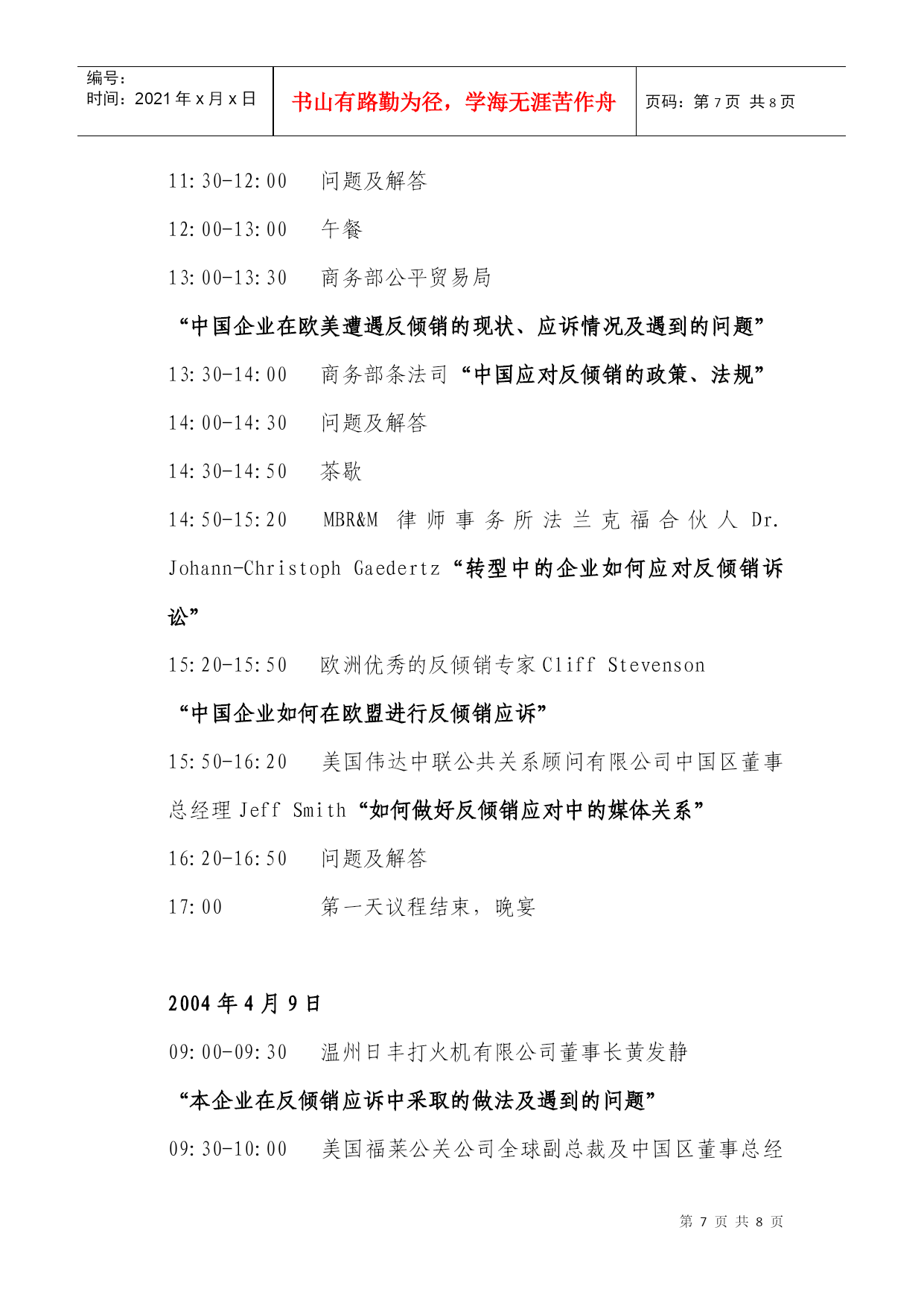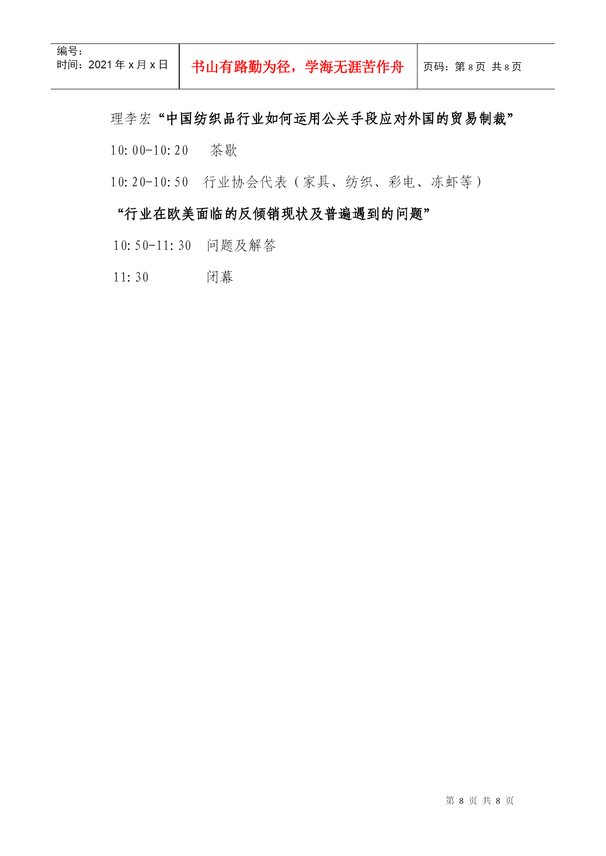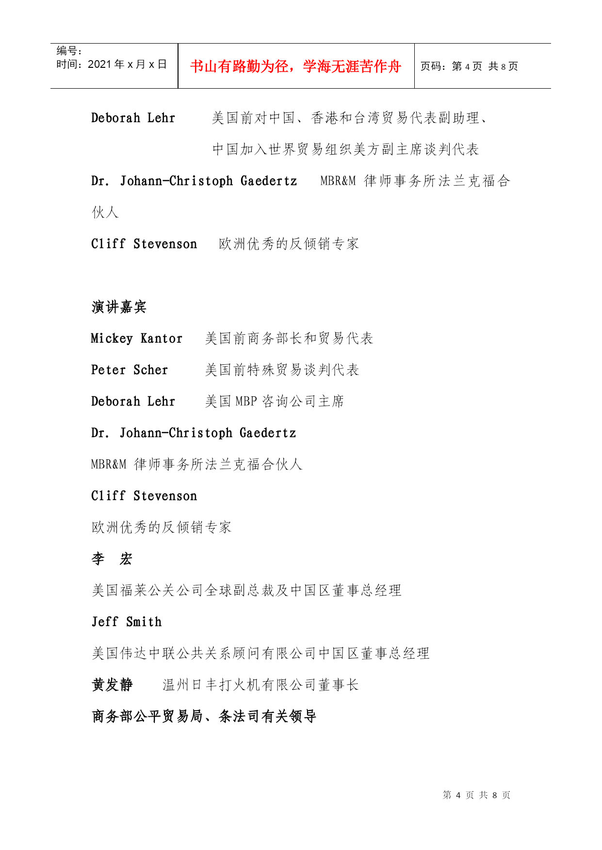 编号:时间:2021年x月x日书山有路勤为径,学海无涯苦作舟页码:第PAGE8页共NUMPAGES8页第PAGE\*MERGEFORMAT8页共NUMPAGES\*MERGEFORMAT8页附件1文件中国国际公共关系协会中国国际投资促进中心国公协[2004]第1号关于举办国际贸易纷争与公共关系高层论坛的通知各有关单位:随着改革开放的不断深入和社会主义市场经济的建立,中国的出口贸易得到快速发展,尤其是加入世贸组织后。在世界市场保持低迷的情况下,中国出口仍保持了高速增长的势头,为国家总体经济发展发挥了重要作用。但与此同时,贸易保护主义在美、欧一些国家有越演越烈的趋势,频繁的贸易摩擦阻碍了我国企业的国际化进程。为帮助中国企业更好地面对未来的国际贸易摩擦,尤其是应对反倾销的压力,中国国际公共关系协会与中国国际投资促进中心将共同举办“国际贸易纷争与公共关系高层论坛”,邀请美欧资深专家讲解美欧在反倾销方面的政府决策程序、法律环境及运用公关手段解决贸易争端的成功案例,提高中国企业面对反倾销的应对能力。此次论坛将邀请美国前商务部长和贸易代表MickeyKantor、美国前特殊贸易谈判代表PeterScher、美国对中国、香港和台湾贸易代表副助理及中国加入世界贸易组织美方副主席谈判代表DeborahLehr、欧洲优秀的反倾销专家CliffStevenson及美国福莱国际传播咨询公司和美国伟达中联公共关系顾问有限公司中国区总裁等作为演讲嘉宾。全国人大财经委员会副主任委员、原外经贸部部长石广生,商务部主管司局领导以及国内各行业协会、商会及企业代表出席会议并发言。鉴于贵单位在国际贸易中的重要地位及作用,特邀请贵单位领导作为本次论坛的嘉宾出席会议并组织行业内的有关企业参会。由于名额有限,请在3月5日前答复是否参会,前100名注册者有效。现将会议安排通知如下:会议主题:国际贸易纠纷反倾销公共关系时间:报到时间:2004年4月8日8:30会议时间:2004年4月8日9:00-4月9日11:30会议地点:国宾酒店(五星)北京市西城区阜外大街9号组织机构:主办单位:中国国际公共关系协会中国国际投资促进中心协办单位:MBP咨询有限公司五、会议费用:人民币1500元(会务费、资料费、同声传译、两正餐)六、报名方式:填写参会表格后传真至联系人,欢迎来电垂询中国国际投资促进中心中国国际公共关系协会二○○四年二月十九日国际贸易纷争与公共关系高层论坛到会嘉宾主办单位:中国国际公共关系协会中国国际投资促进中心联合举办协办单位:MBP咨询有限公司中方参会嘉宾石广生全国人大常委、全国人大财经委副主任委员中国外商投资企业协会会长李道豫中国国际公共关系协会会长,九届全国人大常委前驻美国大使俞晓松中国贸促会前会长董津义外交部办公厅主任(中国国际公共关系协会理事)周铭商务部国际投资促进局副局长(中国国际公共关系协会理事)郑砚农中国国际公共关系协会常务副会长兼秘书长外方参会嘉宾MickeyKantor美国前商务部长和贸易代表PeterScher美国前特殊贸易谈判代表DeborahLehr美国前对中国、香港和台湾贸易代表副助理、中国加入世界贸易组织美方副主席谈判代表Dr.Johann-ChristophGaedertzMBR&M律师事务所法兰克福合伙人CliffStevenson欧洲优秀的反倾销专家演讲嘉宾MickeyKantor美国前商务部长和贸易代表PeterScher美国前特殊贸易谈判代表DeborahLehr美国MBP咨询公司主席Dr.Johann-ChristophGaedertzMBR&M律师事务所法兰克福合伙人CliffStevenson欧洲优秀的反倾销专家李宏美国福莱公关公司全球副总裁及中国区董事总经理JeffSmith美国伟达中联公共关系顾问有限公司中国区董事总经理黄发静温州日丰打火机有限公司董事长商务部公平贸易局、条法司有关领导特邀嘉宾高勇中国纺织工业协会副会长王沈阳中国纺织品商会会长姜枫中国家电协会会长陈卫中国工业经济联合会副秘书长王文哲中国食品工业协会会长.(黄圣明中国食品工业协会秘书长)陈士能中国轻工业联合会会长王广德中国煤炭工业协会秘书长郝为民中国通信企业协会副会长、秘书长王锦霞中国医药商业协会秘书长延华四川省企业家协会秘书长中国外商投资企业协会国际贸易纠纷与公共关系高层论坛议程2004年4月8日08:30-09:00签到09:00-09:10中国国际公共关系协会会长李道豫致开幕辞09:10-09:20全国人大财经委副主任委员石