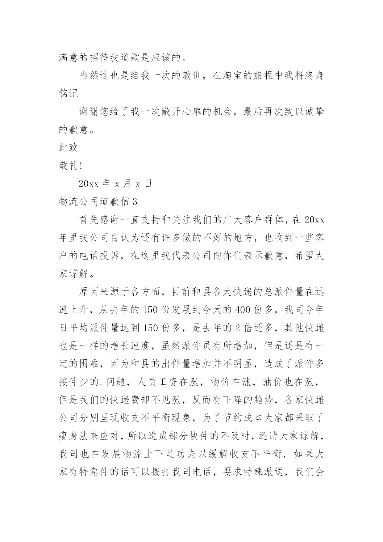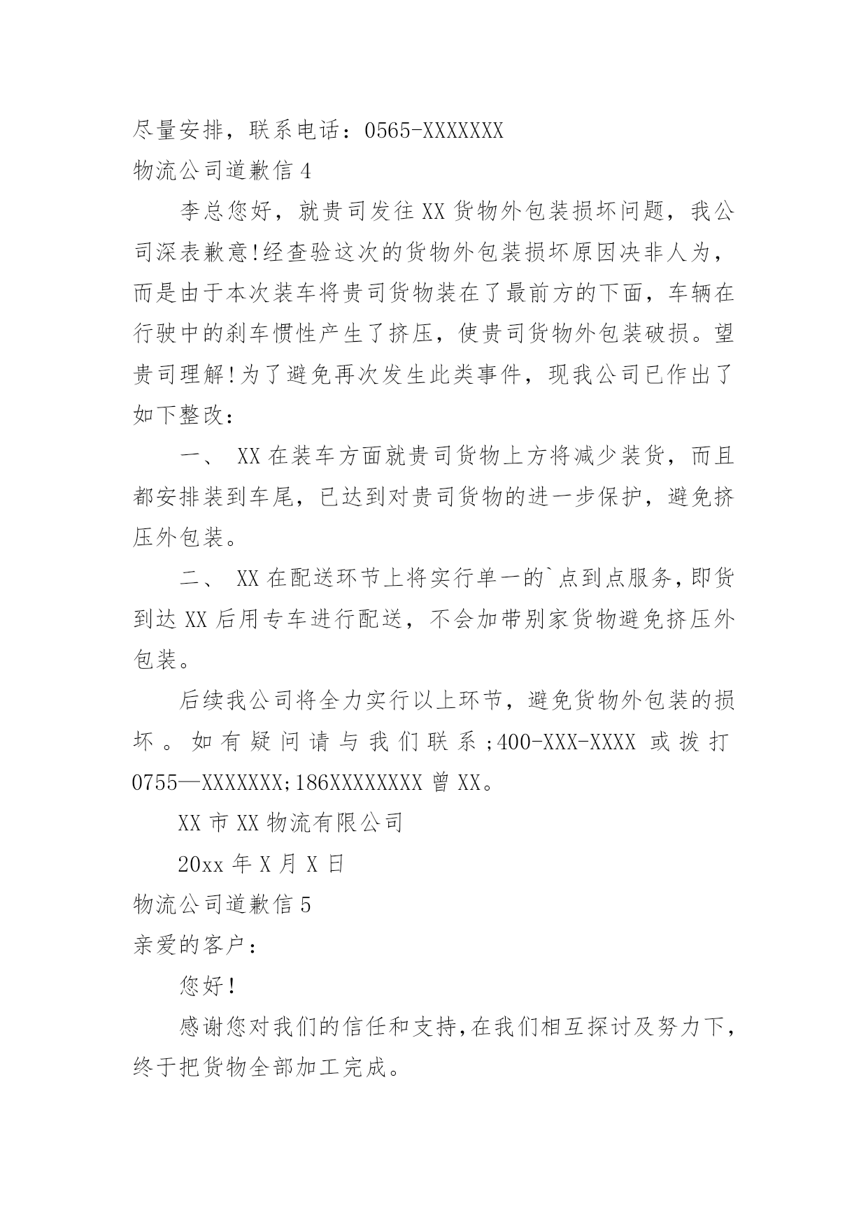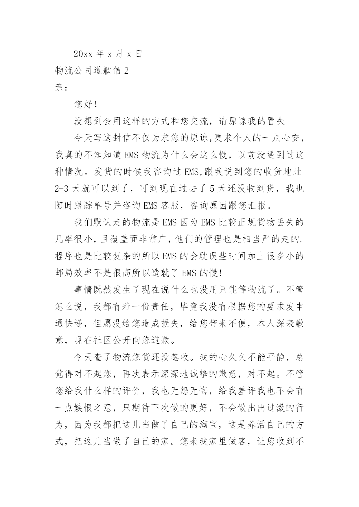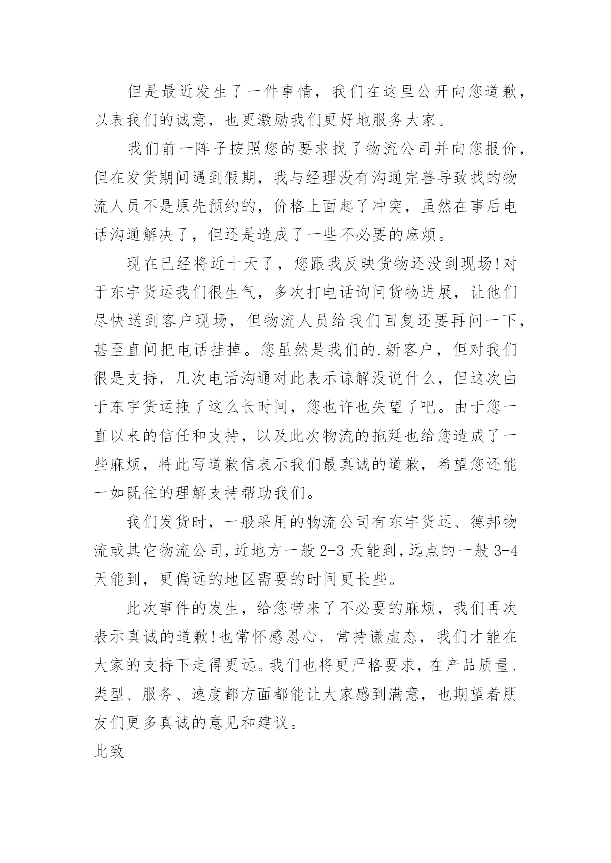 物流公司道歉信物流公司道歉信在生活中,需要使用道歉信的事情愈发增多,在写作上,道歉信有一定的书写规范。你写道歉信时总是没有文字可写?下面是小编整理的物流公司道歉信,欢迎阅读与收藏。物流公司道歉信1我方于本月18日配送贵司产品,但由于我方没有按贵司的计划安排配送,给贵司带来了很多麻烦,非常抱歉!对本次配送造成的负影响,我首先以我个人的名义向你致以最诚挚的歉意,如果不是因为我的工作疏忽,是不会导致这样的后果,我心存愧疚。如果还有机会的.话,也非常希望你再给我机会,我们一定保证以后提供的服务绝不会再有类似的情况发生,并郑重立下此承诺。针对本次配送质量方面存在的问题,我们从全方位反思并在内部讨论协商,以杜绝类似情况再发生!其它方面希望贵司能再提宝贵意见,对我方存在的不足,请及时指正,我方愿全力合作,争取最大程度的满足客户的要求,达到双赢,也让我方提高更快。我相信在贵司和骏鸿物流的监督下,我们会做得越来越好!谢谢!此致敬礼!20xx年x月x日物流公司道歉信2亲:您好!没想到会用这样的方式和您交流,请原谅我的冒失今天写这封信不仅为求您的原谅,更求个人的一点心安,我真的不知知道EMS物流为什么会这么慢,以前没遇到过这种情况。发货的时候我咨询过EMS,跟我说到您的收货地址2-3天就可以到了,可到现在过去了5天还没收到货,我也随时跟踪单号并咨询EMS客服,咨询原因跟您汇报。我们默认走的物流是EMS因为EMS比较正规货物丢失的几率很小,且覆盖面非常广,他们的管理也是相当严的走的.程序也是比较复杂的所以EMS的会耽误些时间加上很多小的邮局效率不是很高所以造就了EMS的慢!事情既然发生了现在说什么也没用只能等物流了。不管怎么说,我都有着一份责任,毕竟我没有根据您的要求发申通快递,但愿没给您造成损失,给您带来不便,本人深表歉意,现在社区公开向您道歉。今天查了物流您货还没签收。我的心久久不能平静,总觉得对不起您,再次表示深深地诚挚的歉意,对不起。不管您给我什么样的评价,我也无怨无悔,给我差评我也不会有一点嫉恨之意,只期待下次做的更好,不会做出出过激的行为,因为我都把这儿当做了自己的淘宝,这是养活自己的方式,把这儿当做了自己的家。您来我家里做客,让您收到不满意的招待我道歉是应该的。当然这也是给我一次的教训,在淘宝的旅程中我将终身铭记谢谢您给了我一次敞开心扉的机会,最后再次致以诚挚的歉意。此致敬礼!20xx年x月x日物流公司道歉信3首先感谢一直支持和关注我们的广大客户群体,在20xx年里我公司自认为还有许多做的不好的地方,也收到一些客户的电话投诉,在这里我代表公司向你们表示歉意,希望大家谅解。原因来源于各方面,目前和县各大快递的总派件量在迅速上升,从去年的150份发展到今天的400份多,我司今年日平均派件量达到150份多,是去年的2倍还多,其他快递也是一样的增长速度,虽然派件员有所增加,但是还是有一定的困难,因为和县的出件量增加并不明显,造成了派件多接件少的.问题,人员工资在涨,物价在涨,油价也在涨,但是我们的快递费却不见涨,反而有下降的趋势,各家快递公司分别呈现收支不平衡现象,为了节约成本大家都采取了瘦身法来应对,所以造成部分快件的不及时,还请大家谅解,我司也在发展物流上下足功夫以缓解收支不平衡,如果大家有特急件的话可以拨打我司电话,要求特殊派送,我们会尽量安排,联系电话:0565-XXXXXXX物流公司道歉信4李总您好,就贵司发往XX货物外包装损坏问题,我公司深表歉意!经查验这次的货物外包装损坏原因决非人为,而是由于本次装车将贵司货物装在了最前方的下面,车辆在行驶中的刹车惯性产生了挤压,使贵司货物外包装破损。望贵司理解!为了避免再次发生此类事件,现我公司已作出了如下整改:一、XX在装车方面就贵司货物上方将减少装货,而且都安排装到车尾,已达到对贵司货物的进一步保护,避免挤压外包装。二、XX在配送环节上将实行单一的`点到点服务,即货到达XX后用专车进行配送,不会加带别家货物避免挤压外包装。后续我公司将全力实行以上环节,避免货物外包装的损坏。如有疑问请与我们联系;400-XXX-XXXX或拨打0755—XXXXXXX;186XXXXXXXX曾XX。XX市XX物流有限公司20xx年X月X日物流公司道歉信5亲爱的客户:您好!感谢您对我们的信任和支持,在我们相互探讨及努力下,终于把货物全部加工完成。但是最近发生了一件事情,我们在这里公开向您道歉,以表我们的诚意,也更激励我们更好地服务大家。我们前一阵子按照您的要求找了物流公司并向您报价,但在发货期间遇到假期,我与经理没有沟通完善导致找的物流人员不是原先预约的,价格上面起了冲突,虽然在事后电话沟通解决了,但还是造成了一些不必要的麻烦。现在已经将近十天了,您跟我反映货物还没到现场!对于东宇货运我们很生气,多次打电话询