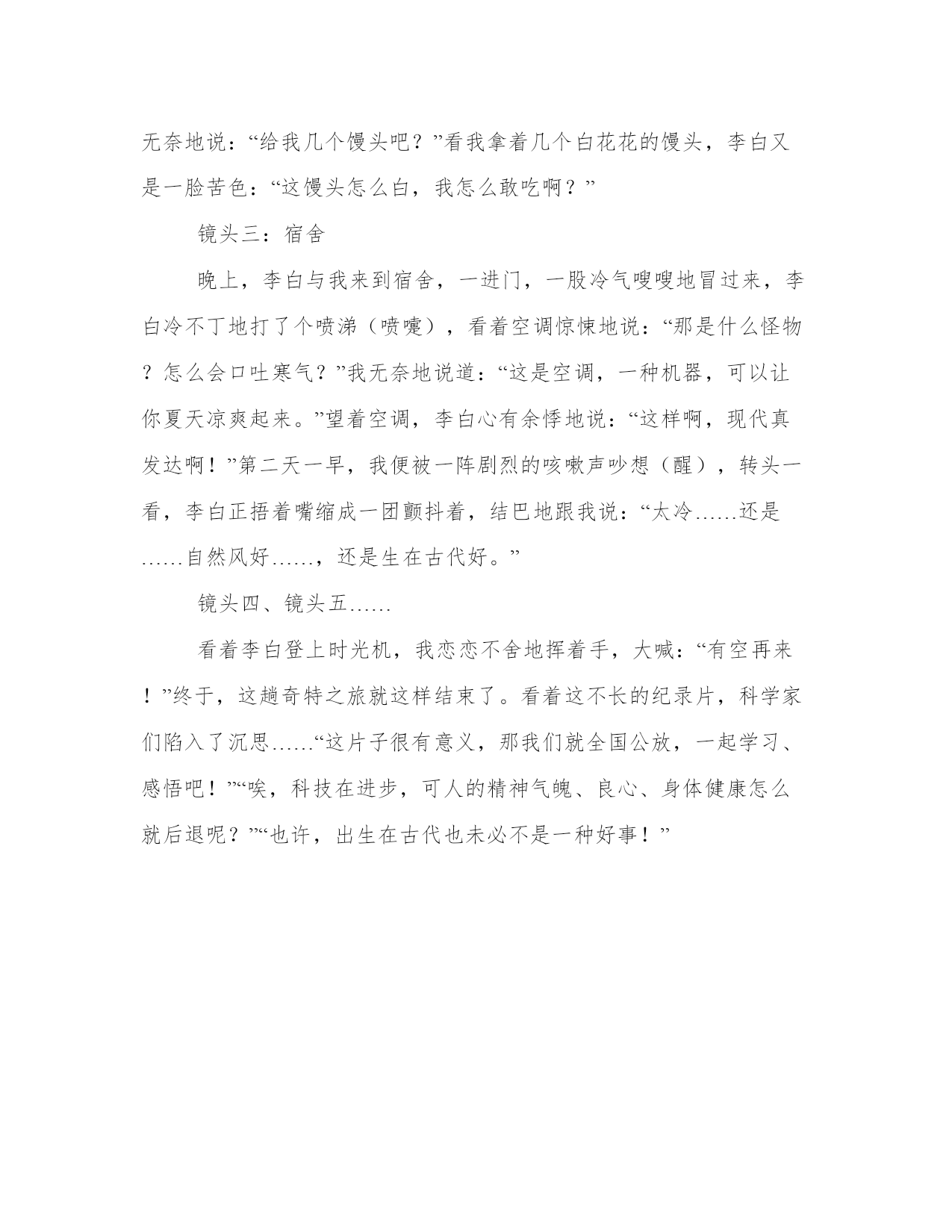 关于李白的高考作文镜头一:教学楼清晨,一缕阳光透过露珠铺洒在大地上,我陪李白漫步在走道上。“学而…时习之…”,听着这读书声,李先生诧异地忘(望)着我问道:“怎么?这是在读书吗?唉,中气不足,没有意蕴。”我慌忙解释道:“是这样的,先生,同学们积极奋考,晚上学得太累,所以精神不佳。”李先生一眼望去,同学们趴的趴着,就几个撑着脑袋在摇头晃脑地念叨着。李白一步冲入教室,拿着直尺就“啪、啪”几下,同学们一脑狐疑地望着他。李白清了清嗓子:“你们看看,这哪有一点读书人的样?一日之际(计)在于晨,早晨就应该大声地朗读出来,就是我,也不敢不每天坚持晨读。孩子们,学习是一个循序渐进的过程,急不得,早晨再累也必须打起精神,不然一天就毁了!”“学而时习之……”,响亮的声音飘满在校园,李白也露出了满意的笑容。镜头二:食堂中午,我陪李白来到食堂,望着着宽敞整洁的食堂,李白一脸羡慕地道:“现代真好,连吃饭的地方都比我们好了不知多少倍,看着我端上的一盘盘流光溢彩的菜,李白一直迟疑着不动,他指着菜一脸怪异的问道:“这肉怎么是红的?这青菜怎么这么绿?这鸡腿怎么这么大……”我哑口以对,难道要告诉他这些加了苏丹红、各种激素吗?李白无奈地说:“给我几个馒头吧?”看我拿着几个白花花的馒头,李白又是一脸苦色:“这馒头怎么白,我怎么敢吃啊?”镜头三:宿舍晚上,李白与我来到宿舍,一进门,一股冷气嗖嗖地冒过来,李白冷不丁地打了个喷涕(喷嚏),看着空调惊悚地说:“那是什么怪物?怎么会口吐寒气?”我无奈地说道:“这是空调,一种机器,可以让你夏天凉爽起来。”望着空调,李白心有余悸地说:“这样啊,现代真发达啊!”第二天一早,我便被一阵剧烈的咳嗽声吵想(醒),转头一看,李白正捂着嘴缩成一团颤抖着,结巴地跟我说:“太冷……还是……自然风好……,还是生在古代好。”镜头四、镜头五……看着李白登上时光机,我恋恋不舍地挥着手,大喊:“有空再来!”终于,这趟奇特之旅就这样结束了。看着这不长的纪录片,科学家们陷入了沉思……“这片子很有意义,那我们就全国公放,一起学习、感悟吧!”“唉,科技在进步,可人的精神气魄、良心、身体健康怎么就后退呢?”“也许,出生在古代也未必不是一种好事!”