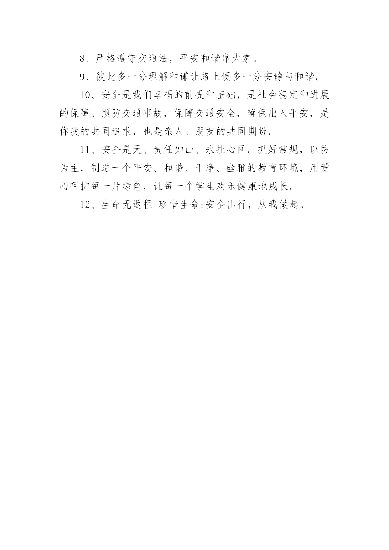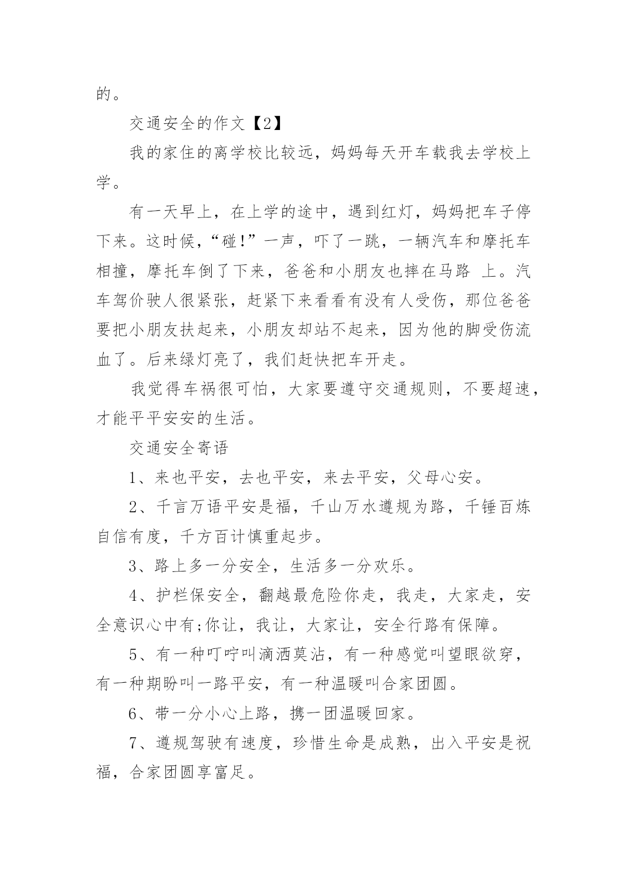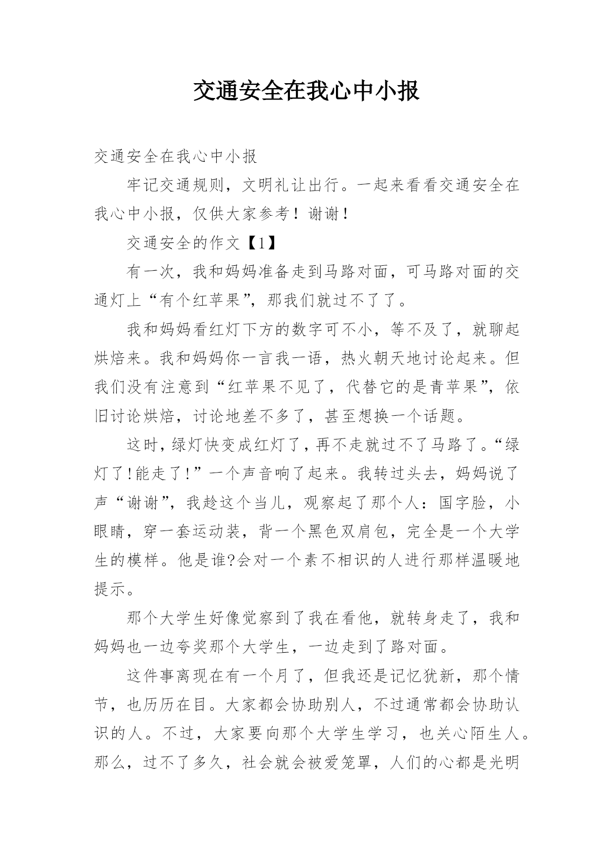 交通安全在我心中小报交通安全在我心中小报牢记交通规则,文明礼让出行。一起来看看交通安全在我心中小报,仅供大家参考!谢谢!交通安全的作文【1】有一次,我和妈妈准备走到马路对面,可马路对面的交通灯上“有个红苹果”,那我们就过不了了。我和妈妈看红灯下方的数字可不小,等不及了,就聊起烘焙来。我和妈妈你一言我一语,热火朝天地讨论起来。但我们没有注意到“红苹果不见了,代替它的是青苹果”,依旧讨论烘焙,讨论地差不多了,甚至想换一个话题。这时,绿灯快变成红灯了,再不走就过不了马路了。“绿灯了!能走了!”一个声音响了起来。我转过头去,妈妈说了声“谢谢”,我趁这个当儿,观察起了那个人:国字脸,小眼睛,穿一套运动装,背一个黑色双肩包,完全是一个大学生的模样。他是谁?会对一个素不相识的人进行那样温暖地提示。那个大学生好像觉察到了我在看他,就转身走了,我和妈妈也一边夸奖那个大学生,一边走到了路对面。这件事离现在有一个月了,但我还是记忆犹新,那个情节,也历历在目。大家都会协助别人,不过通常都会协助认识的人。不过,大家要向那个大学生学习,也关心陌生人。那么,过不了多久,社会就会被爱笼罩,人们的心都是光明的。交通安全的作文【2】我的家住的离学校比较远,妈妈每天开车载我去学校上学。有一天早上,在上学的途中,遇到红灯,妈妈把车子停下来。这时候,“碰!”一声,吓了一跳,一辆汽车和摩托车相撞,摩托车倒了下来,爸爸和小朋友也摔在马路上。汽车驾价驶人很紧张,赶紧下来看看有没有人受伤,那位爸爸要把小朋友扶起来,小朋友却站不起来,因为他的脚受伤流血了。后来绿灯亮了,我们赶快把车开走。我觉得车祸很可怕,大家要遵守交通规则,不要超速,才能平平安安的生活。交通安全寄语1、来也平安,去也平安,来去平安,父母心安。2、千言万语平安是福,千山万水遵规为路,千锤百炼自信有度,千方百计慎重起步。3、路上多一分安全,生活多一分欢乐。4、护栏保安全,翻越最危险你走,我走,大家走,安全意识心中有;你让,我让,大家让,安全行路有保障。5、有一种叮咛叫滴洒莫沾,有一种感觉叫望眼欲穿,有一种期盼叫一路平安,有一种温暖叫合家团圆。6、带一分小心上路,携一团温暖回家。7、遵规驾驶有速度,珍惜生命是成熟,出入平安是祝福,合家团圆享富足。8、严格遵守交通法,平安和谐靠大家。9、彼此多一分理解和谦让路上便多一分安静与和谐。10、安全是我们幸福的前提和基础,是社会稳定和进展的保障。预防交通事故,保障交通安全,确保出入平安,是你我的共同追求,也是亲人、朋友的共同期盼。11、安全是天、责任如山、永挂心间。抓好常规,以防为主,制造一个平安、和谐、干净、幽雅的教育环境,用爱心呵护每一片绿色,让每一个学生欢乐健康地成长。12、生命无返程-珍惜生命;安全出行,从我做起。