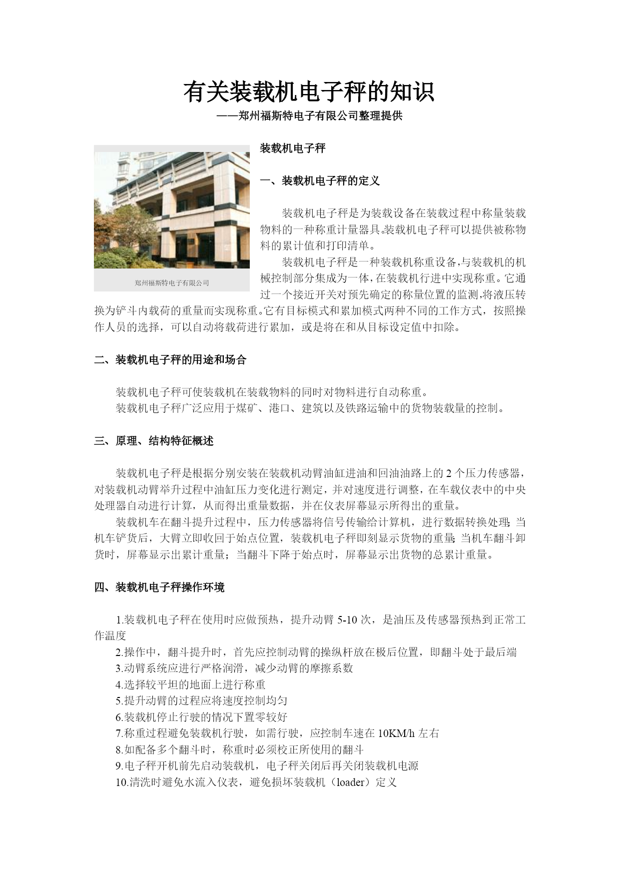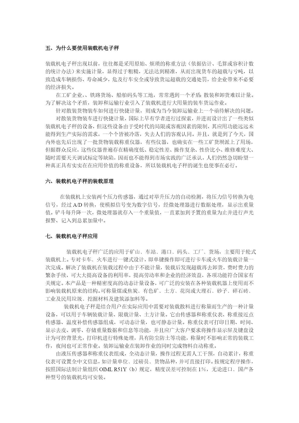 有关装载机电子秤的知识——郑州福斯特电子有限公司整理提供郑州福斯特电子有限公司装载机电子秤一、装载机电子秤的定义装载机电子秤是为装载设备在装载过程中称量装载物料的一种称重计量器具。装载机电子秤可以提供被称物料的累计值和打印清单。装载机电子秤是一种装载机称重设备,与装载机的机械控制部分集成为一体,在装载机行进中实现称重。它通过一个接近开关对预先确定的称量位置的监测,将液压转换为铲斗内载荷的重量而实现称重。它有目标模式和累加模式两种不同的工作方式,按照操作人员的选择,可以自动将载荷进行累加,或是将在和从目标设定值中扣除。二、装载机电子秤的用途和场合装载机电子秤可使装载机在装载物料的同时对物料进行自动称重。装载机电子秤广泛应用于煤矿、港口、建筑以及铁路运输中的货物装载量的控制。三、原理、结构特征概述装载机电子秤是根据分别安装在装载机动臂油缸进油和回油油路上的2个压力传感器,对装载机动臂举升过程中油缸压力变化进行测定,并对速度进行调整,在车载仪表中的中央处理器自动进行计算,从而得出重量数据,并在仪表屏幕显示所得出的重量。装载机车在翻斗提升过程中,压力传感器将信号传输给计算机,进行数据转换处理;当机车铲货后,大臂立即收回于始点位置,装载机电子秤即刻显示货物的重量;当机车翻斗卸货时,屏幕显示出累计重量;当翻斗下降于始点时,屏幕显示出货物的总累计重量。四、装载机电子秤操作环境1.装载机电子秤在使用时应做预热,提升动臂5-10次,是油压及传感器预热到正常工作温度2.操作中,翻斗提升时,首先应控制动臂的操纵杆放在极后位置,即翻斗处于最后端3.动臂系统应进行严格润滑,减少动臂的摩擦系数4.选择较平坦的地面上进行称重5.提升动臂的过程应将速度控制均匀6.装载机停止行驶的情况下置零较好7.称重过程避免装载机行驶,如需行驶,应控制车速在10KM/h左右8.如配备多个翻斗时,称重时必须校正所使用的翻斗9.电子秤开机前先启动装载机,电子秤关闭后再关闭装载机电源10.清洗时避免水流入仪表,避免损坏装载机(loader)定义五、为什么要使用装载机电子秤装载机电子秤出现以前,往往都是采用原始、烦琐的称重方法(依据估计、毛算或容积计数的统计办法)来实施计量,显得过于粗糙,无法达到精准,从而出现货车的超载与亏吨,以致造成车辆损伤、寿命减少,危及行车安全或导致货运超载的交通处罚,给企业带来不必要的经济损失。在工矿企业,、铁路货场、船舶码头等工地,常常遇到一个矛盾:散装和卸货难以计量。为了解决这个矛盾,装卸和运输行业引入了装载机进行大用量的装车货运作业。针对散装货物装车如何进行快捷计量,则成为当今装卸运输业上一个亟待解决的问题。对散装货物装车进行快捷计量,国际上早有学者进行过探索,并进而设计出了一些类似装载机电子秤的设备,但这些设备由于受时代的局限或客观因素的限制,其应用功能远远未能得到生产实际的需求,一个个皆被冷落,失去人们的客观认同。并且,就是到了今天,国内外也先后出现了一批货物装载称重仪器,有些仪器,也确实在一些工矿货坝派上了用场,但据群众反应,这些仪器普遍存在精确度低、稳定性差、操作复杂、性价比小、维修难度大、随时需要天天调试标定等缺陷,因而也不能得到市场实践的广泛承认,人们仍然急切盼望一种真正具有实实在在应用价值的称重设备,所以装载机电子秤的诞生也使事在必行。六、装载机电子秤的装载原理在装载机上安装两个压力传感器,通过对举升压力的自动检测,将压力信号转换为电信号,经过A/D转换,使模拟信号变为数字信号,经微处理器进行数据处理,显示出重量值。铲斗每升降一次,微处理器就存入一个重量值,一直累加到予置的重量为止并进行声光报警、记入到总累加量中。七、装载机电子秤应用装载机电子秤广泛的应用于矿山﹑车站﹑港口﹑码头﹑工厂﹑货场,主要用于轮式装载机上。专对卡车﹑火车进行一键式设计,即单键操作即可进行卡车或火车的装载计量一次完成。解决了装载机在装载过程中由于不能计量,装载后发现超载再去卸货,费时费力的繁杂手续,可大大提高设备的利用率,提高劳动率和企业的经济效益,各项功能符合国家有关规定。本产品是一种精密度高的动态计量设备,可广泛的安装在各种装载机器上使用而不影响装载机原来的结构。可称量煤或焦炭﹑有色矿﹑土方﹑花岗或大理石﹑砂子﹑碎石砖﹑工业及民用垃圾﹑挖掘材料及建筑添加料等。装载机电子秤是结合用户在实际应用中需要对装载散料进行称量而生产的一种计量设备,可以用于车辆装载计量、限载计量、土方计量。它由传感器和称重仪表、称重接近点传感器、温度补偿传感器组成,可动态计量,也可静态计量。称重仪表可打印日期、时间、显示去皮、调零、存储重量数据和信息等功能,并且应广大客户要求将操作显示